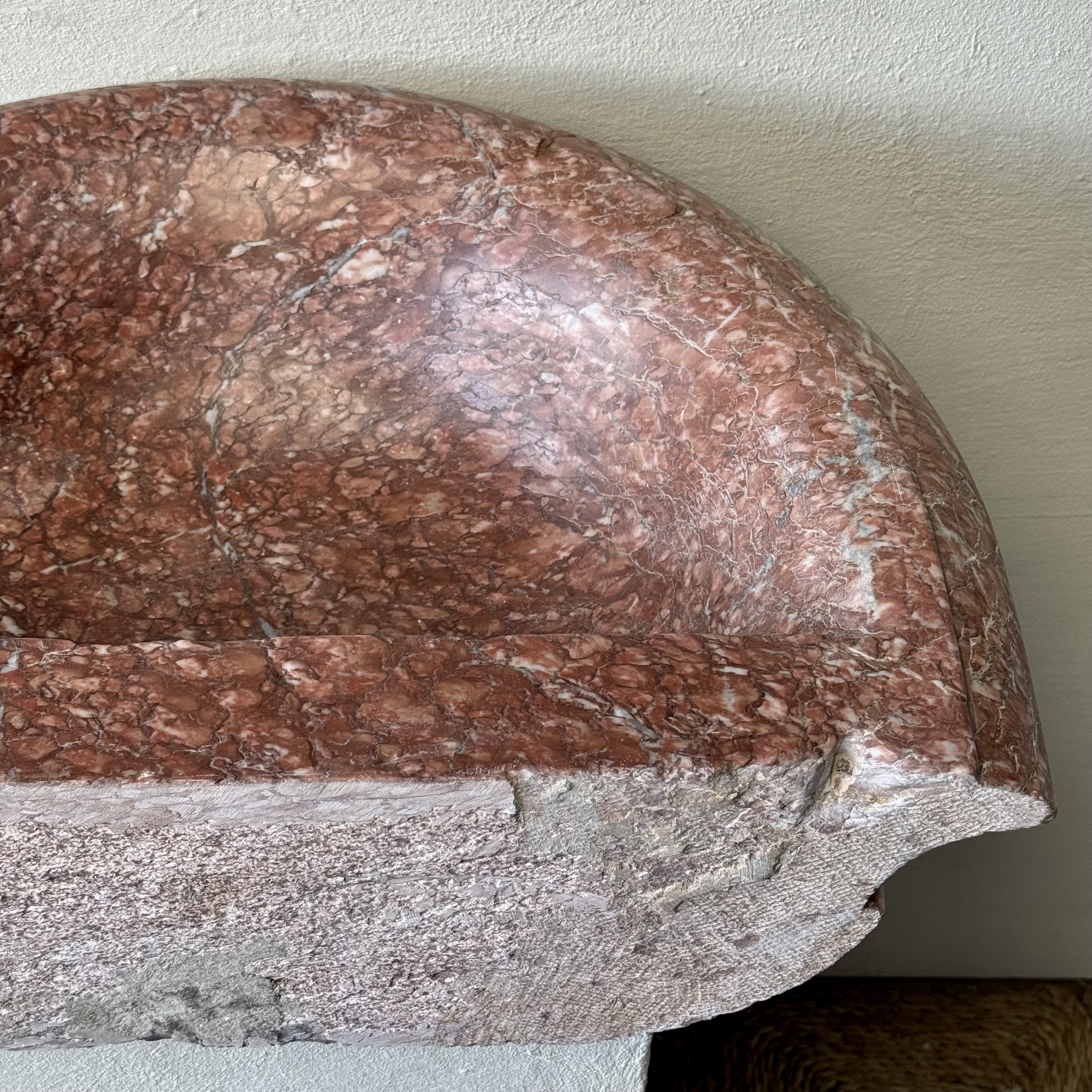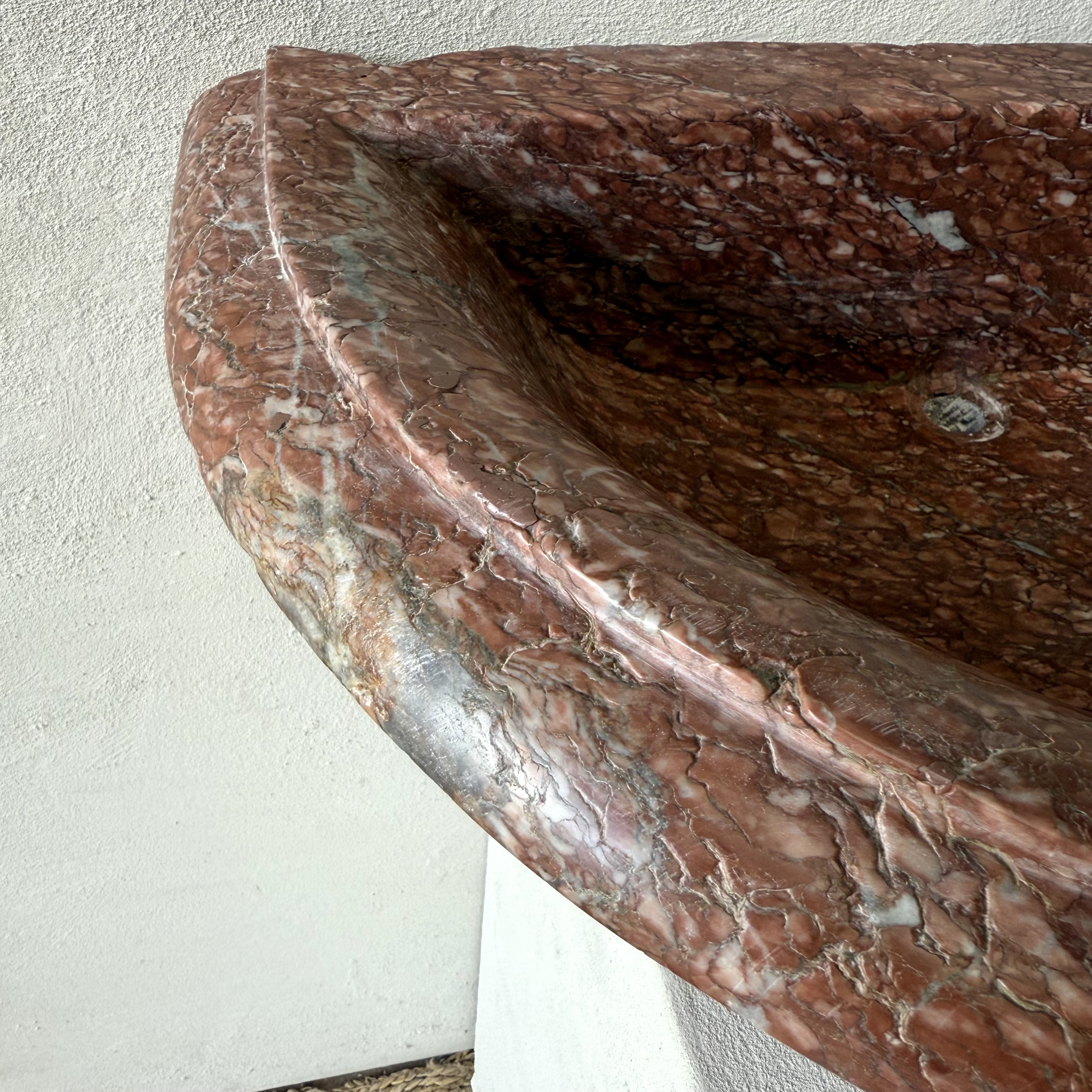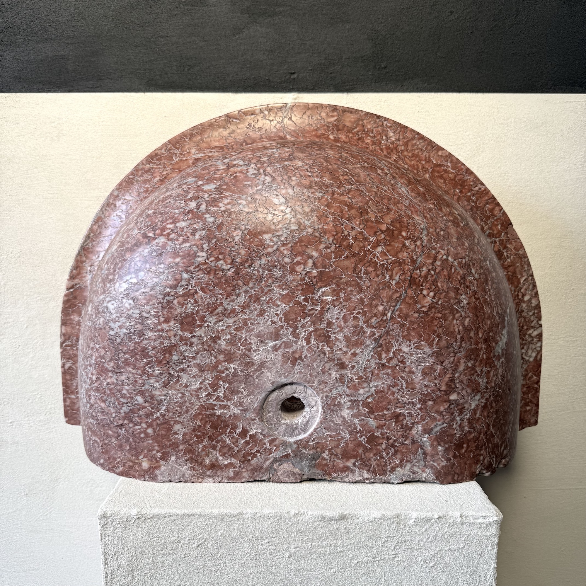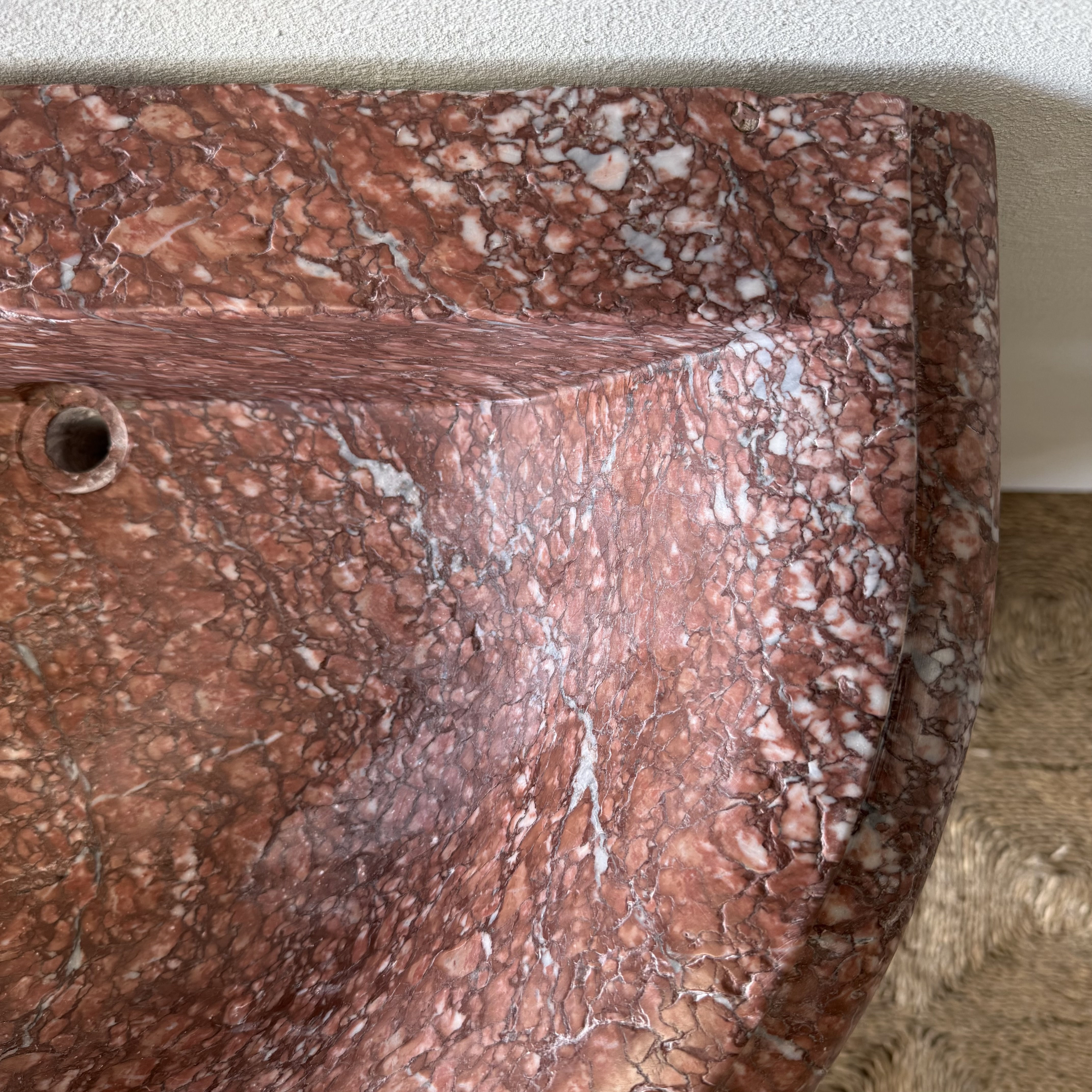 A rare, mid 18th century semi circular font, carved from richly coloured Rouge Griotte marble. The font features a moulded body with elegant curvature and fine proportions. The marble displays its characteristic deep red ground with lighter veining.