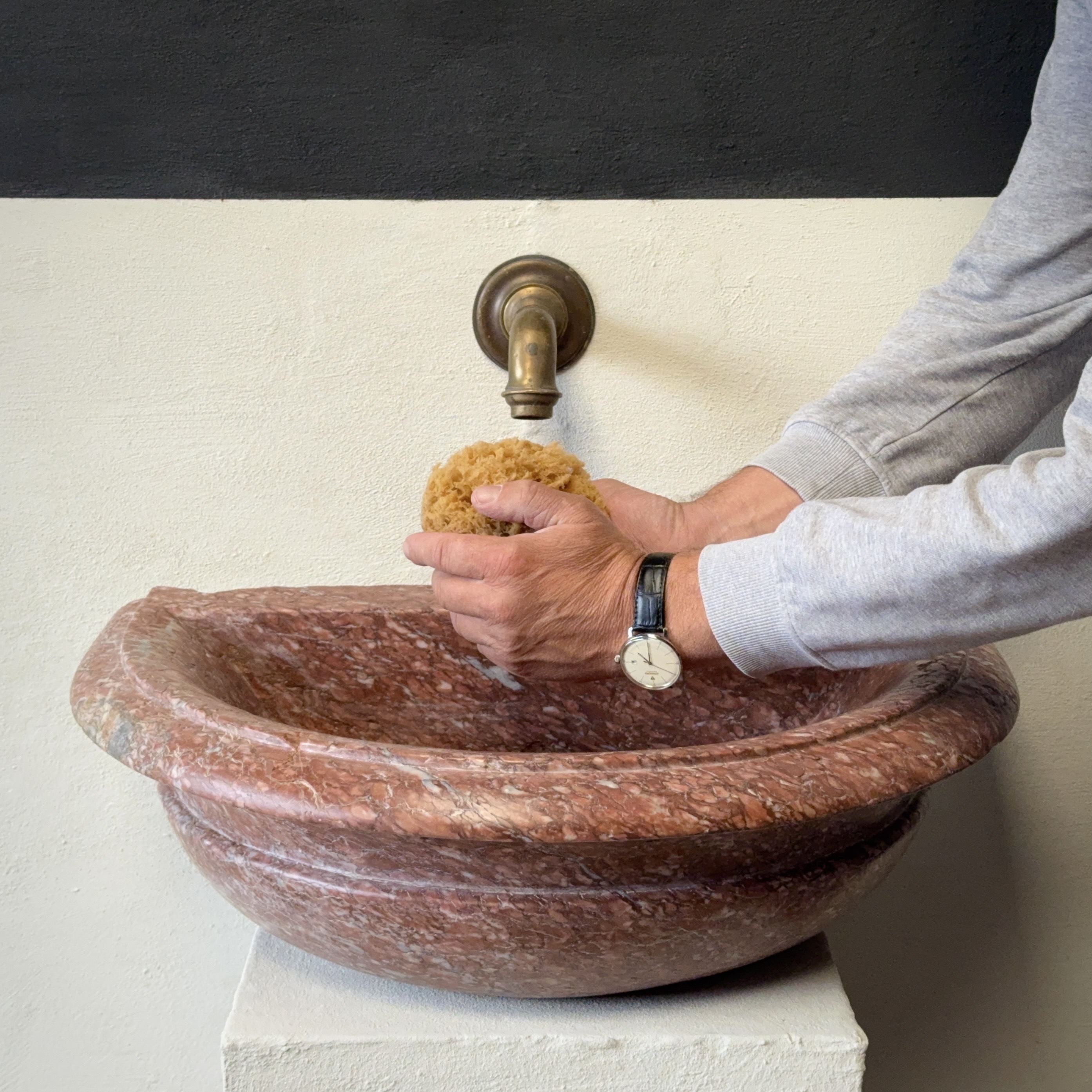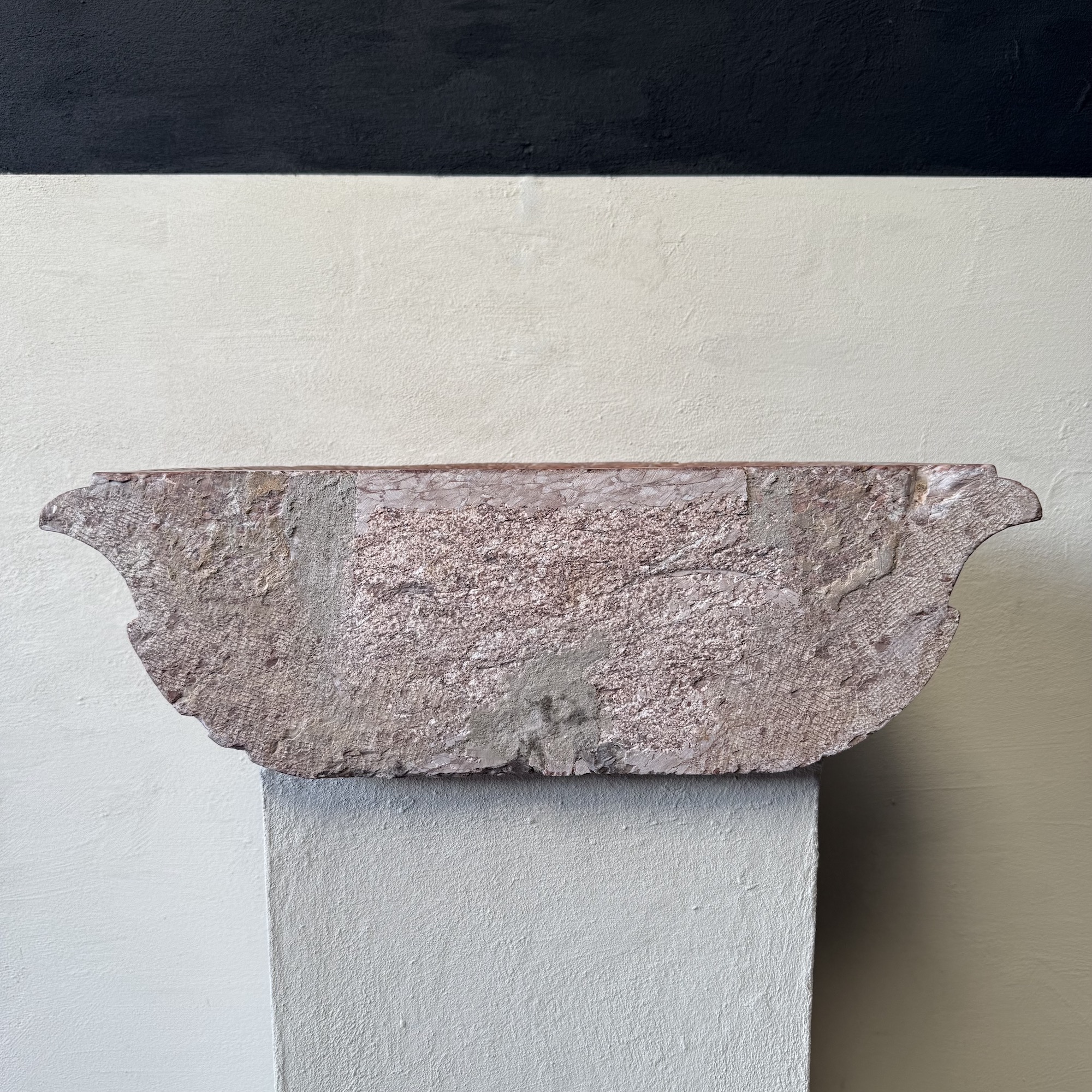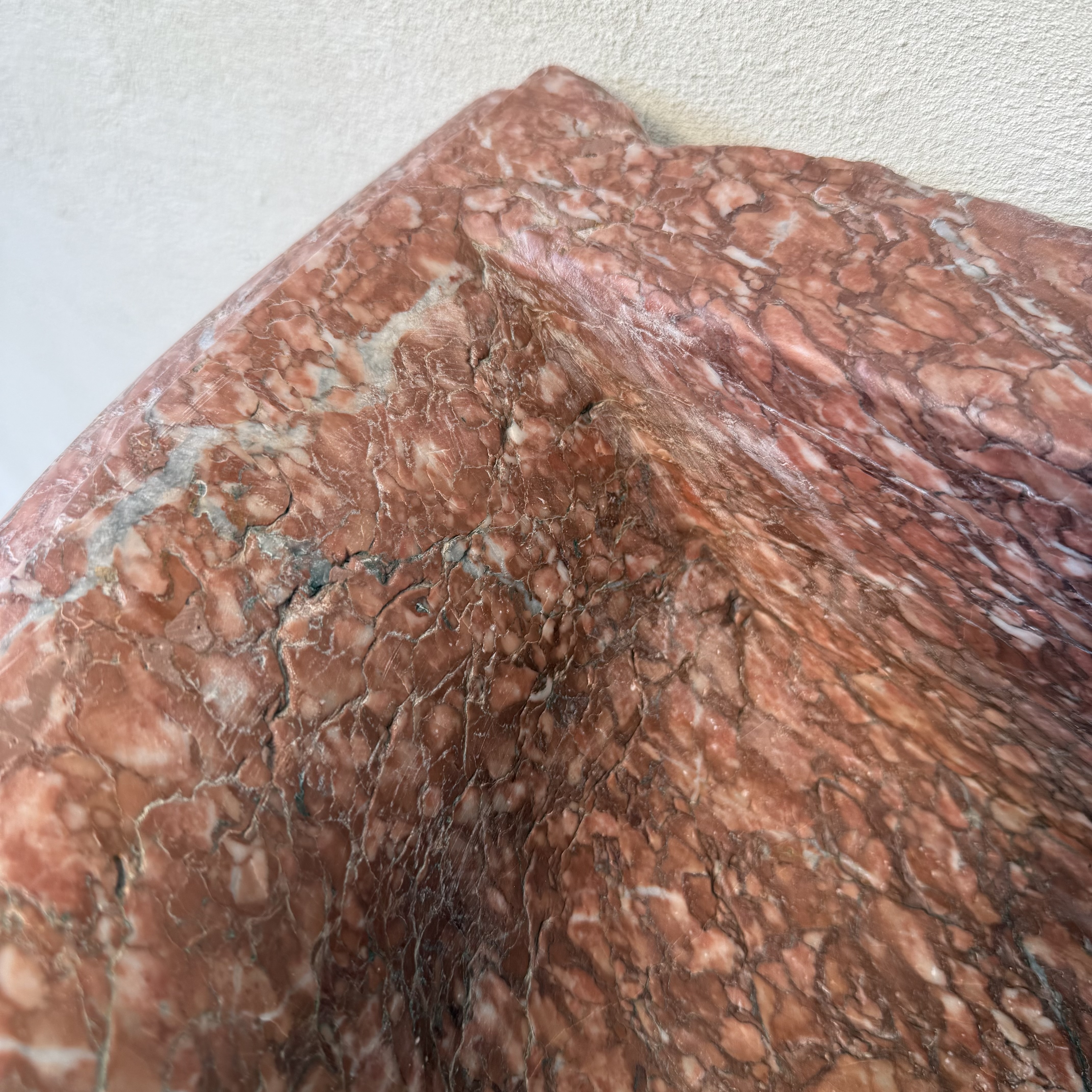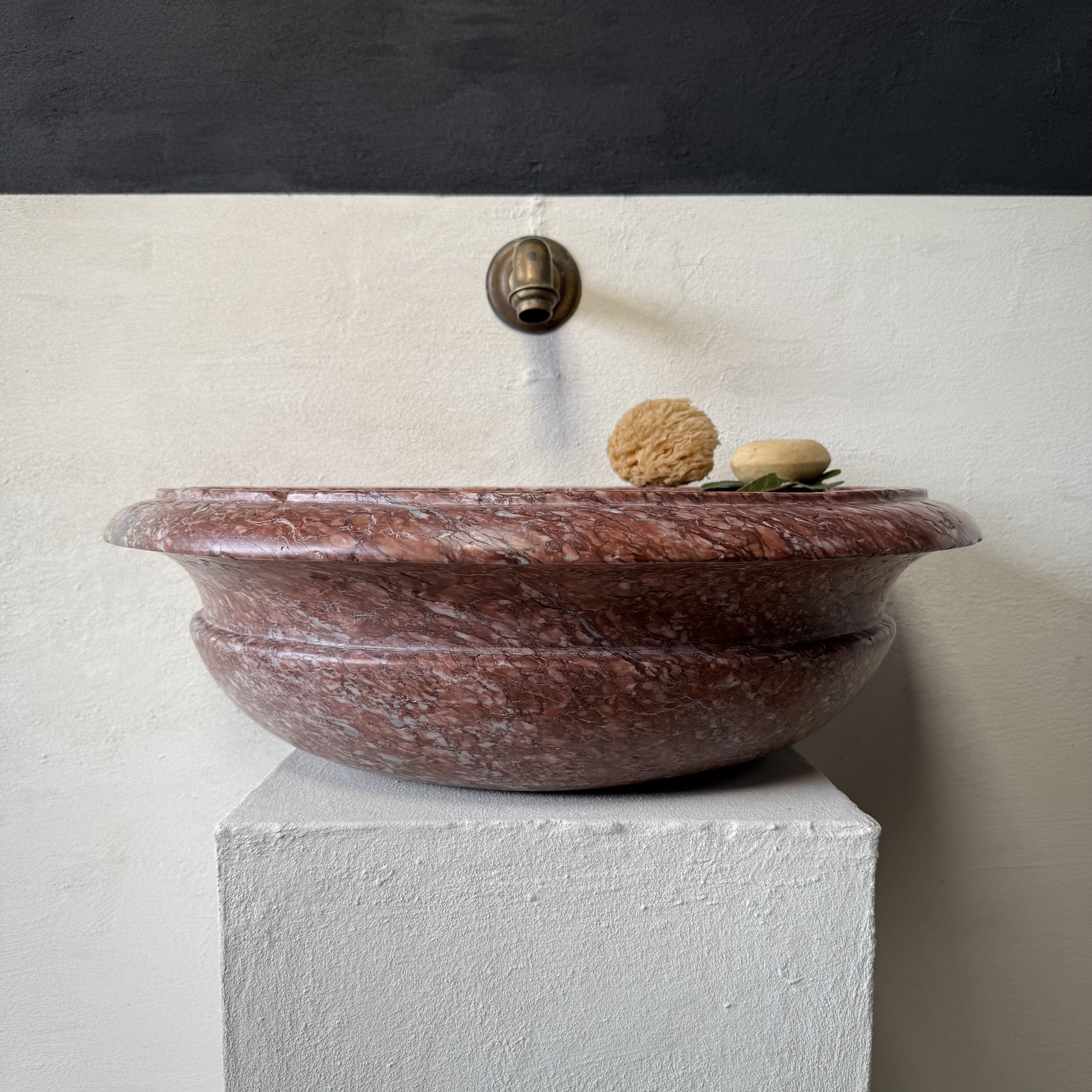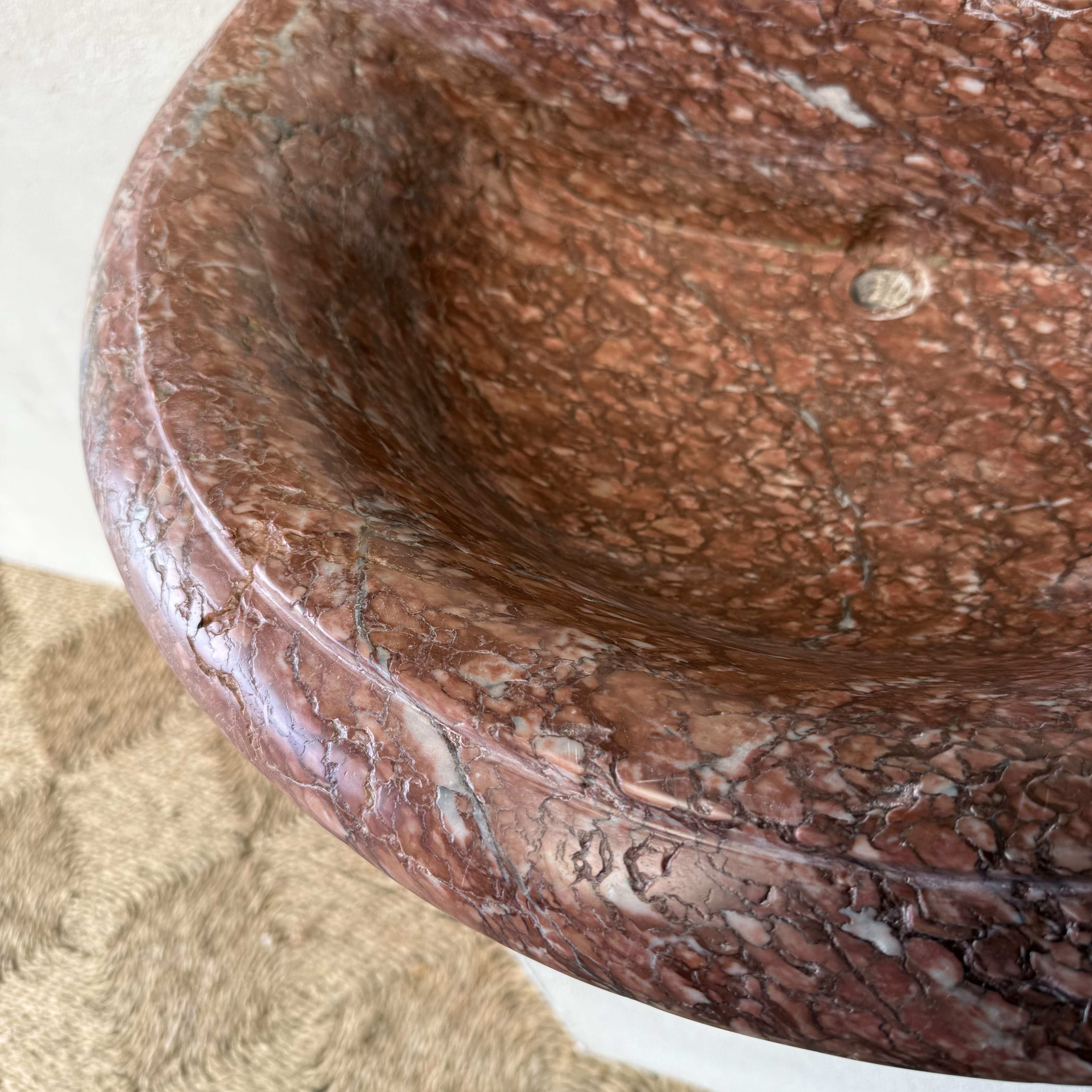 A rare, mid 18th century semi circular font, carved from richly coloured Rouge Griotte marble. The font features a moulded body with elegant curvature and fine proportions. The marble displays its characteristic deep red ground with lighter veining.