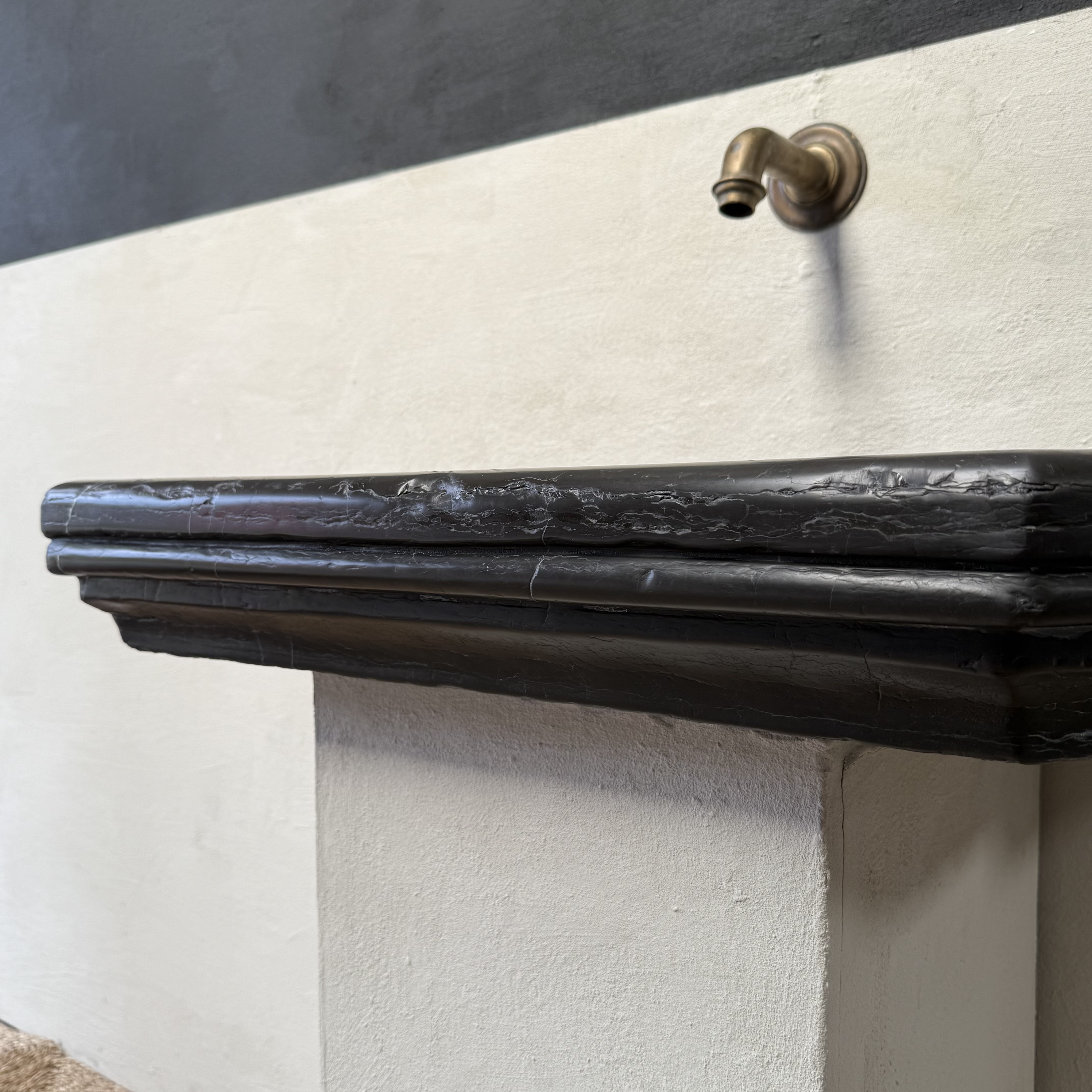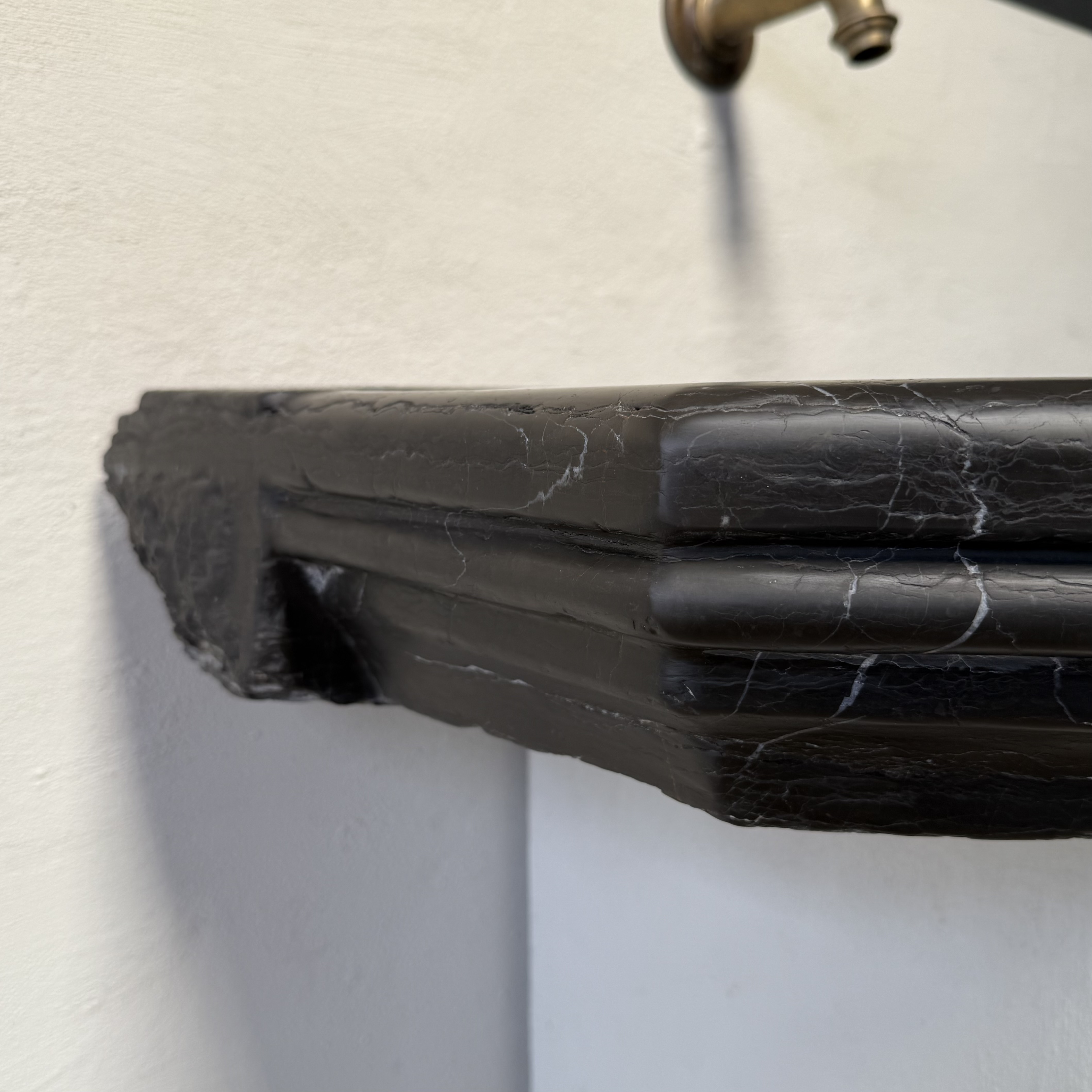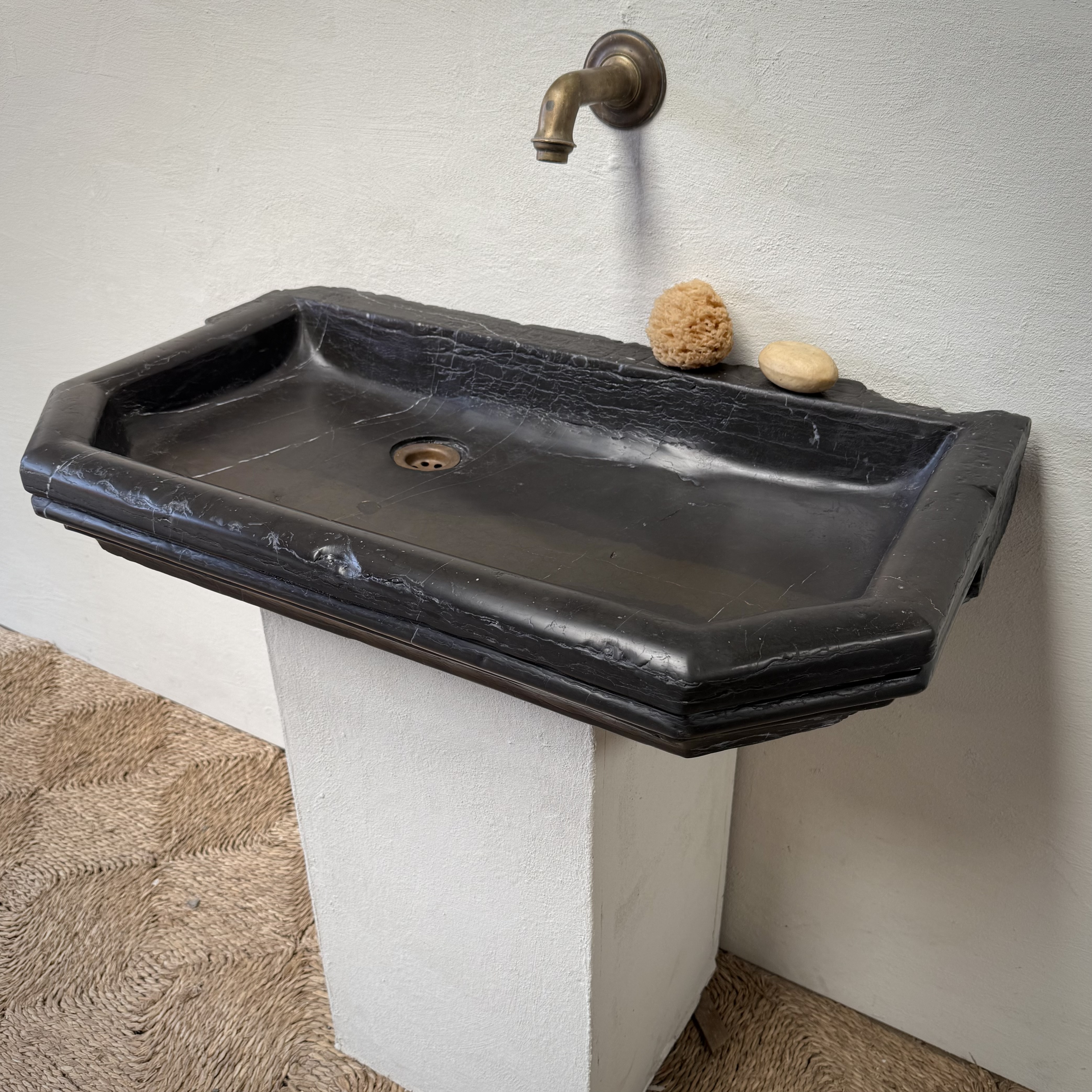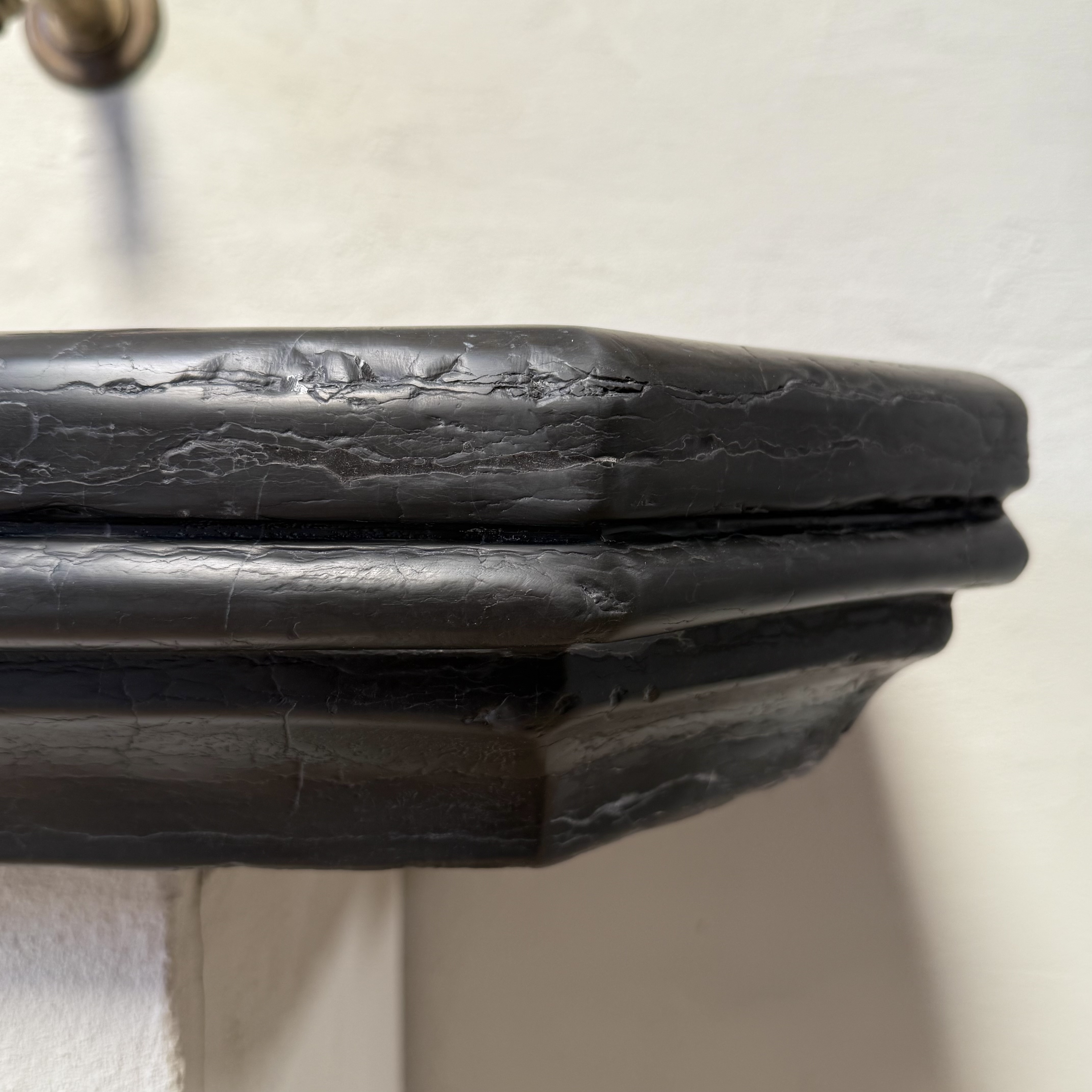 A finely carved French marble sink, mid-18th century, featuring cut front corners and elegant moulded edges to the front and sides. The dark marble shows age-appropriate wear with small surface losses along the body and upper edge, and minor losses to the back corners. A small cavity at the bottom has been skilfully repaired. (please refer to pictures) The interior surface is smoothly finished, ensuring excellent water drainage.