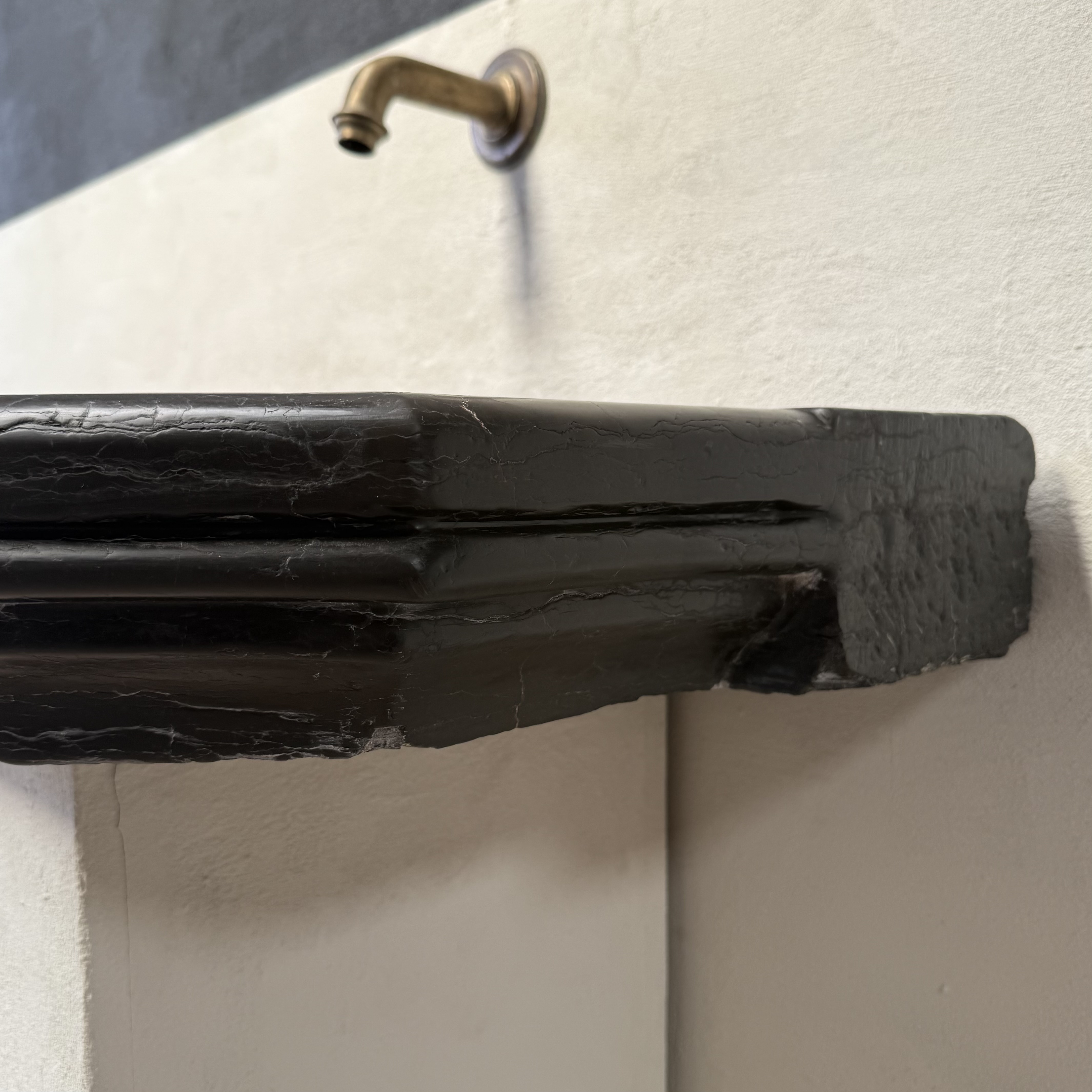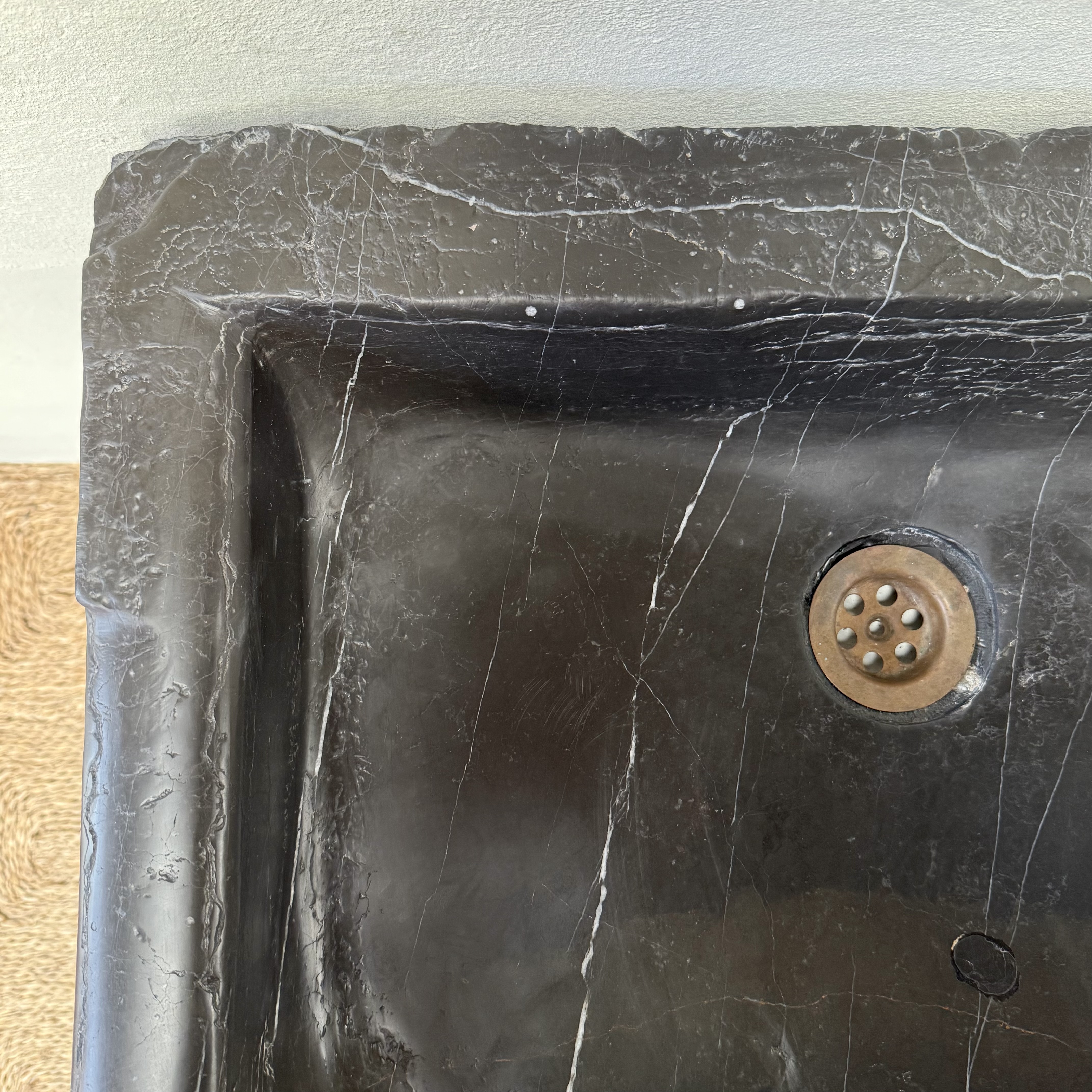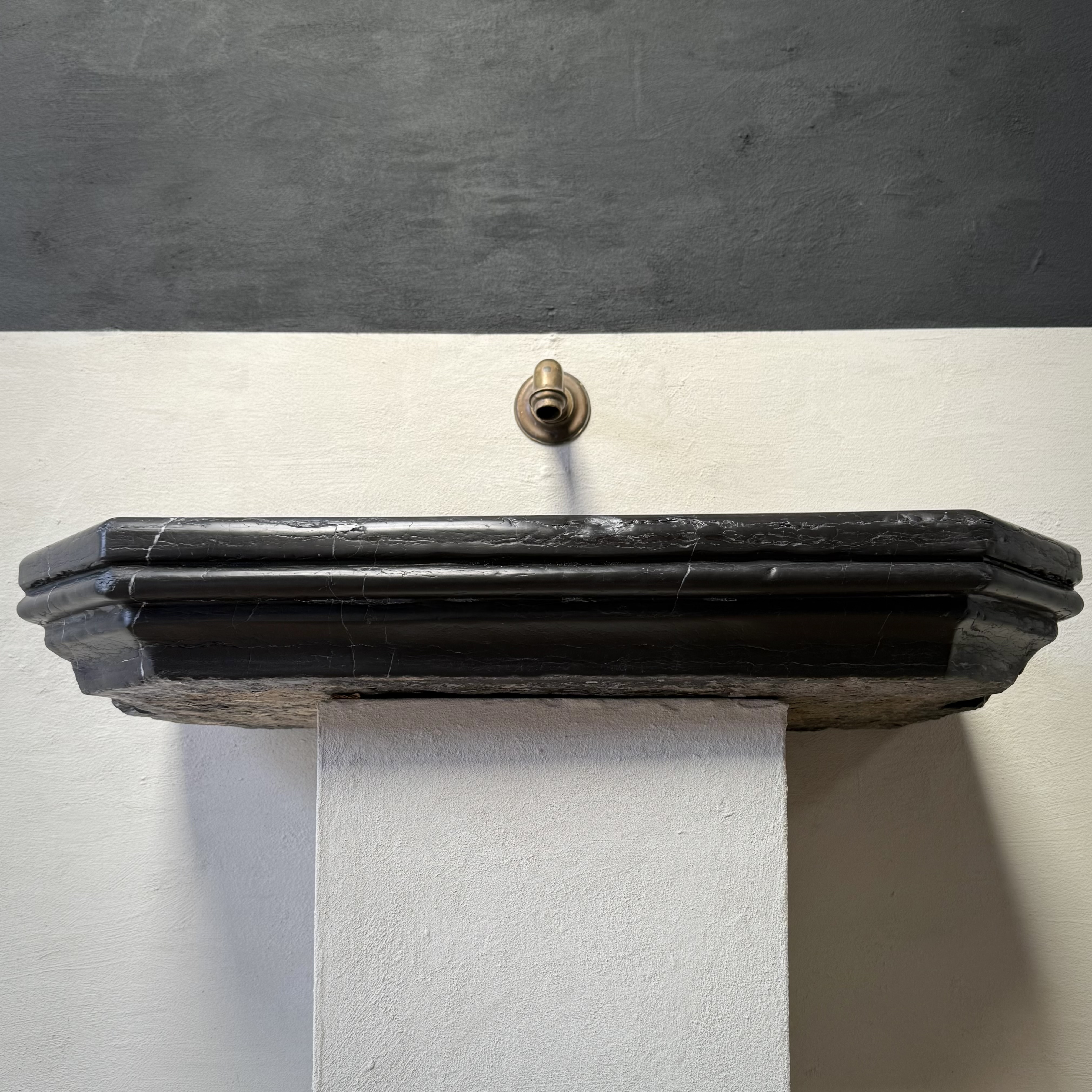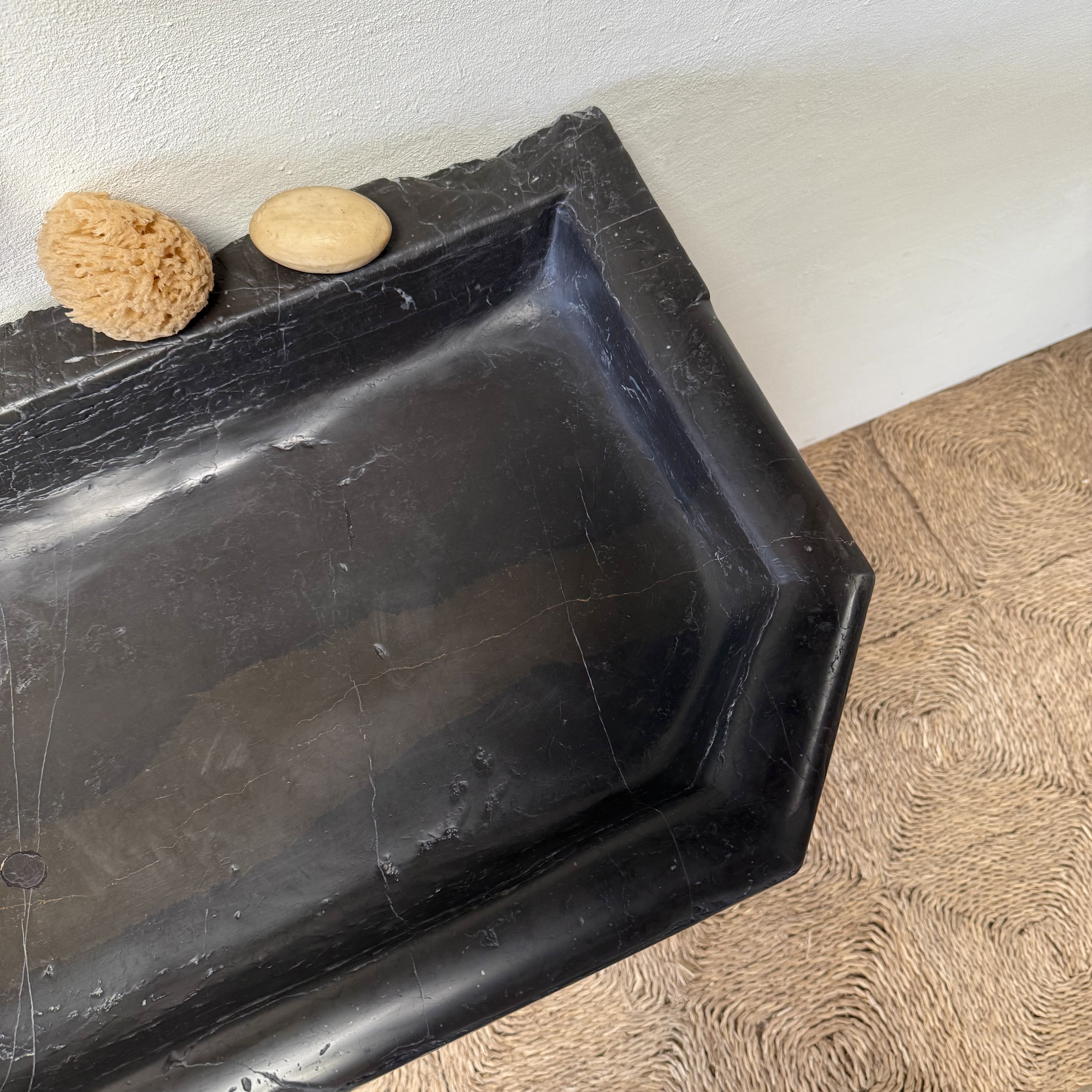 A finely carved French marble sink, mid-18th century, featuring cut front corners and elegant moulded edges to the front and sides. The dark marble shows age-appropriate wear with small surface losses along the body and upper edge, and minor losses to the back corners. A small cavity at the bottom has been skilfully repaired. (please refer to pictures) The interior surface is smoothly finished, ensuring excellent water drainage.