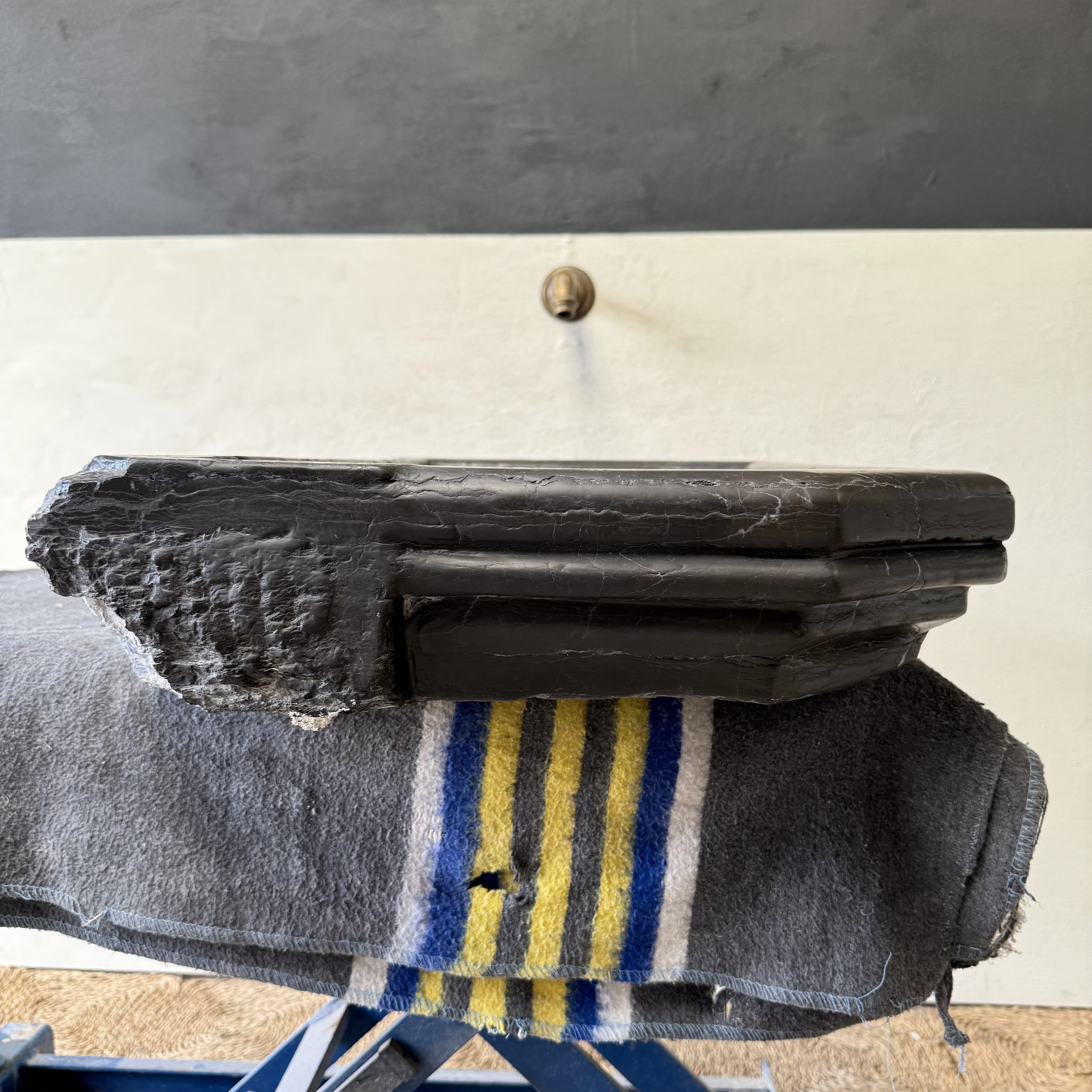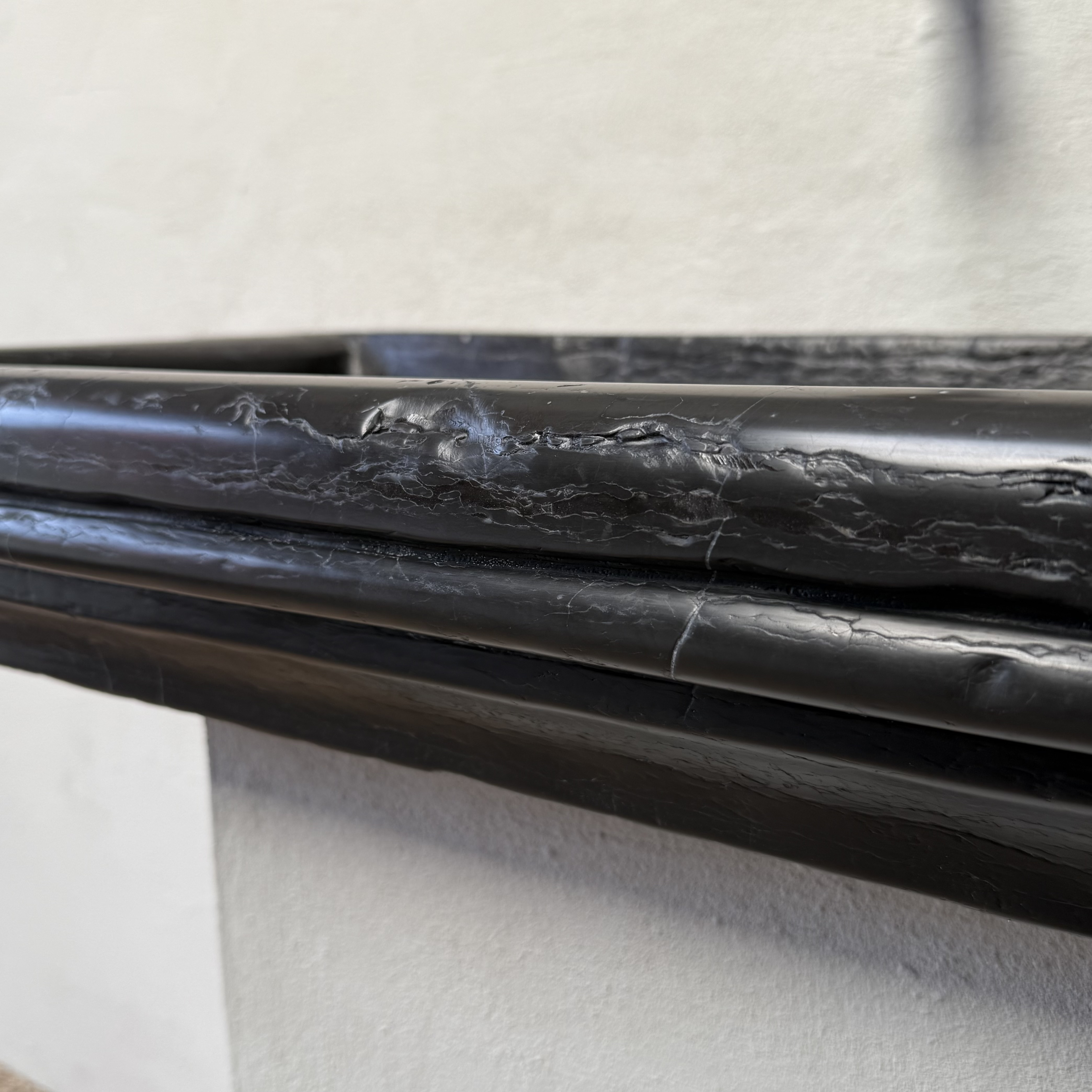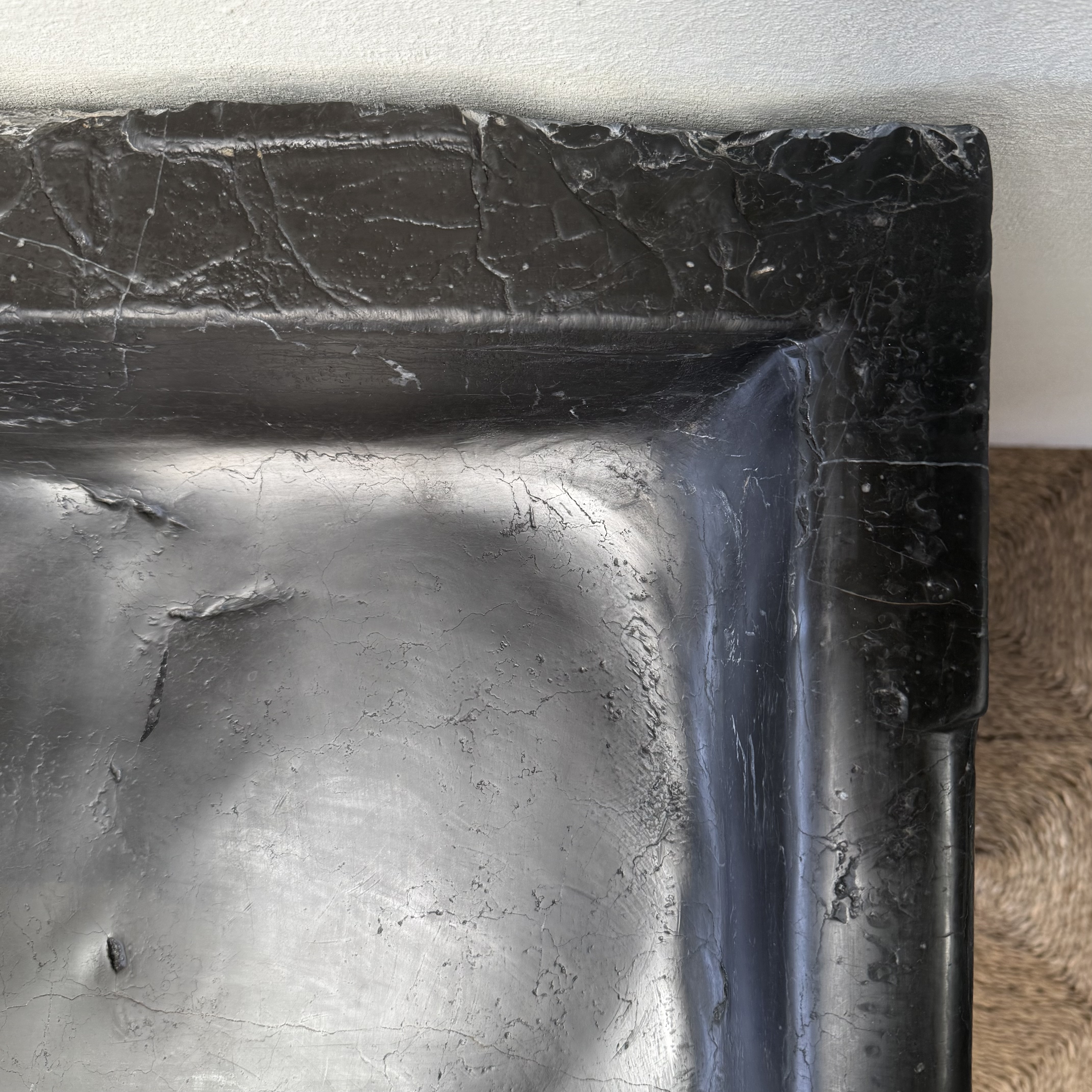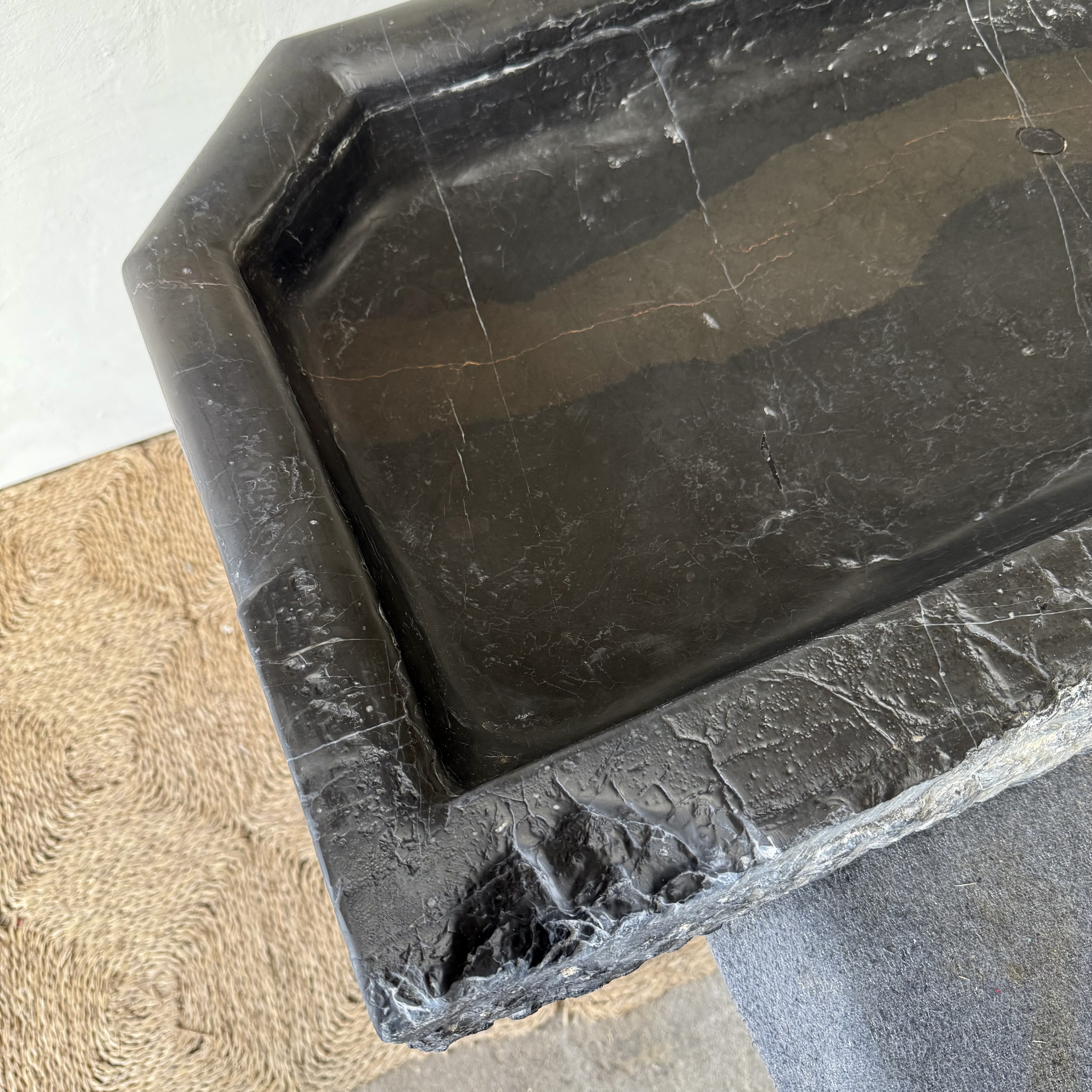 A finely carved French marble sink, mid-18th century, featuring cut front corners and elegant moulded edges to the front and sides. The dark marble shows age-appropriate wear with small surface losses along the body and upper edge, and minor losses to the back corners. A small cavity at the bottom has been skilfully repaired. (please refer to pictures) The interior surface is smoothly finished, ensuring excellent water drainage.