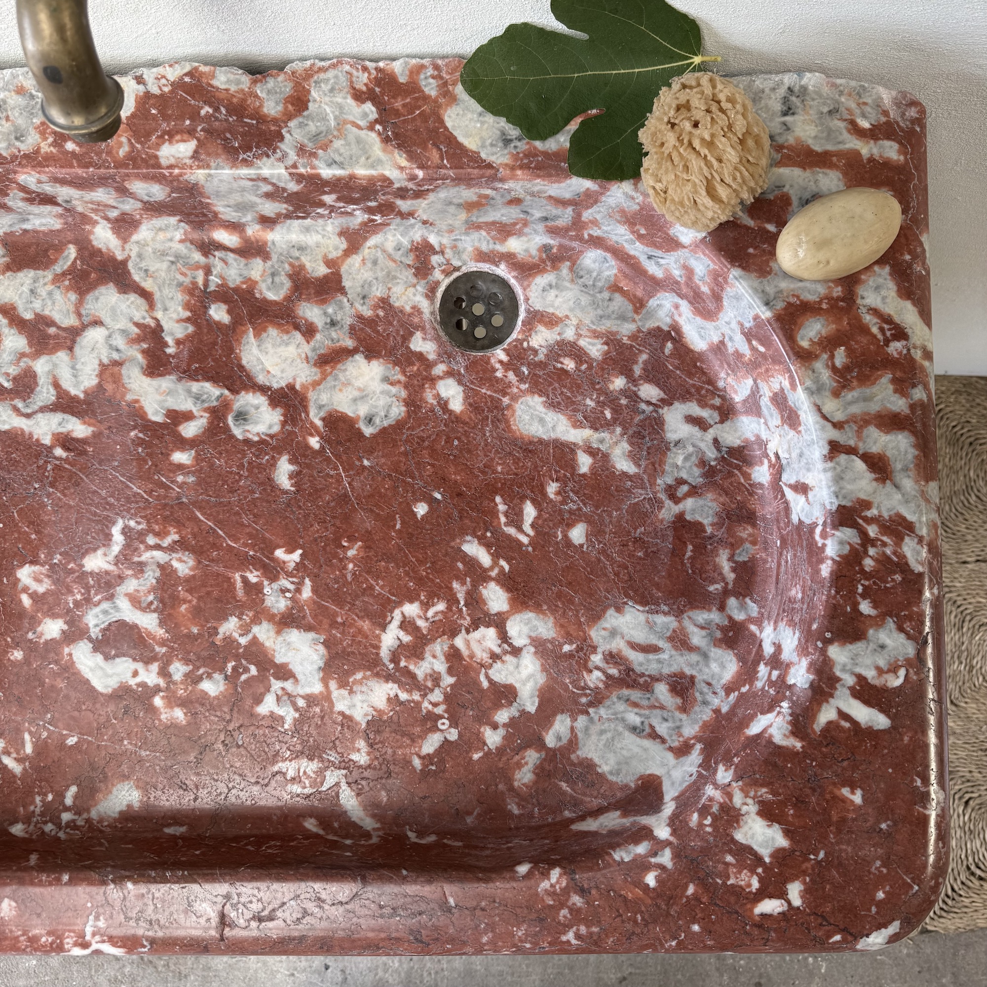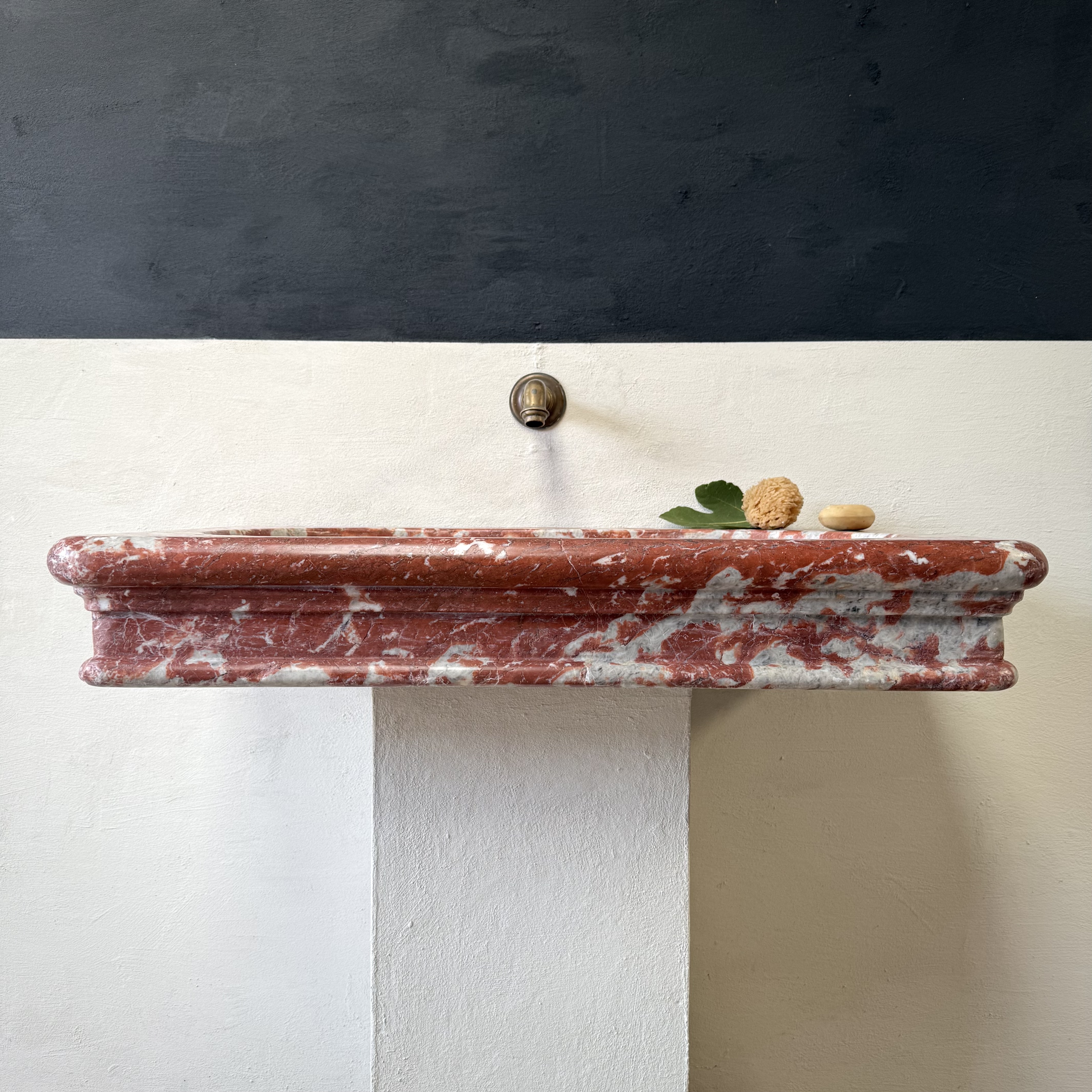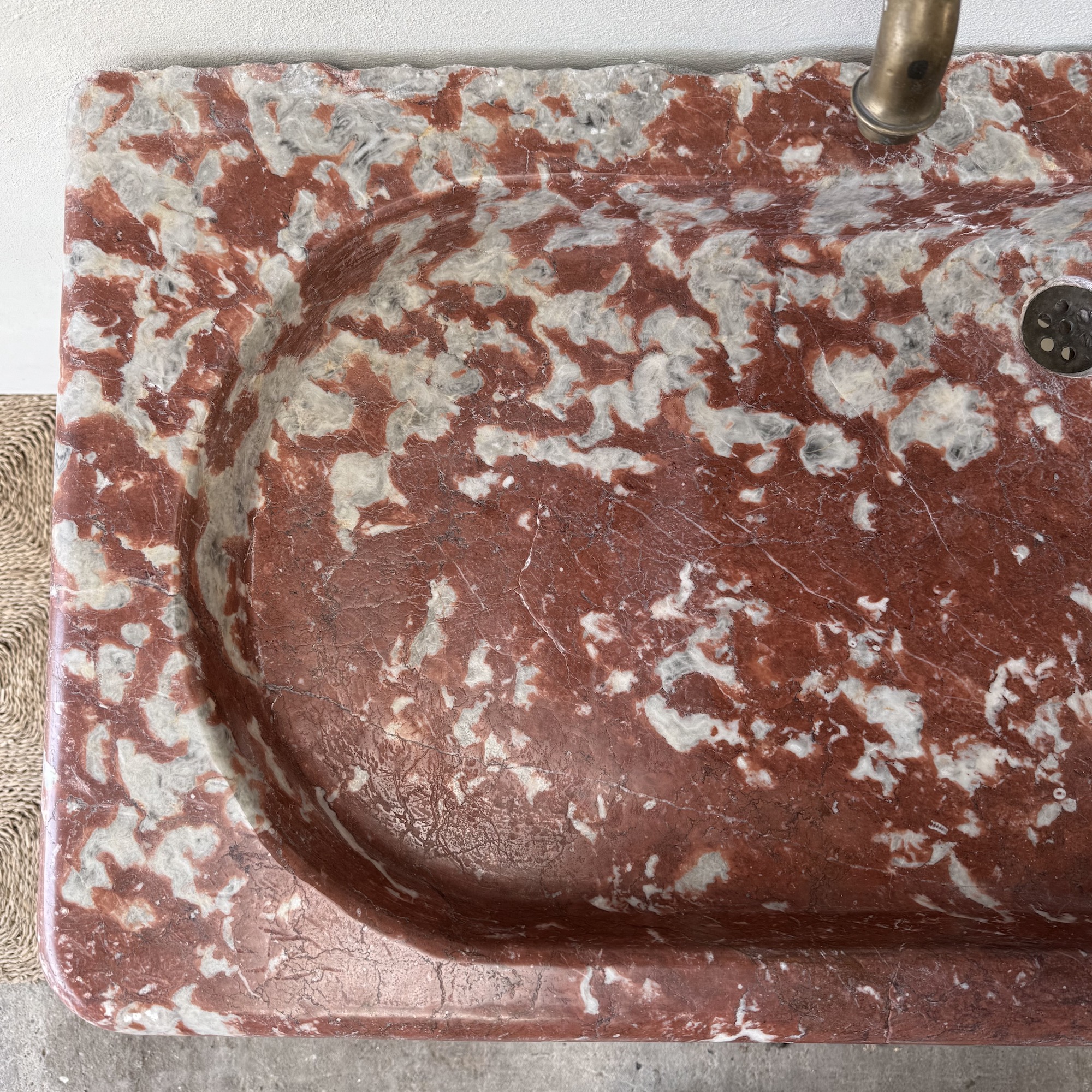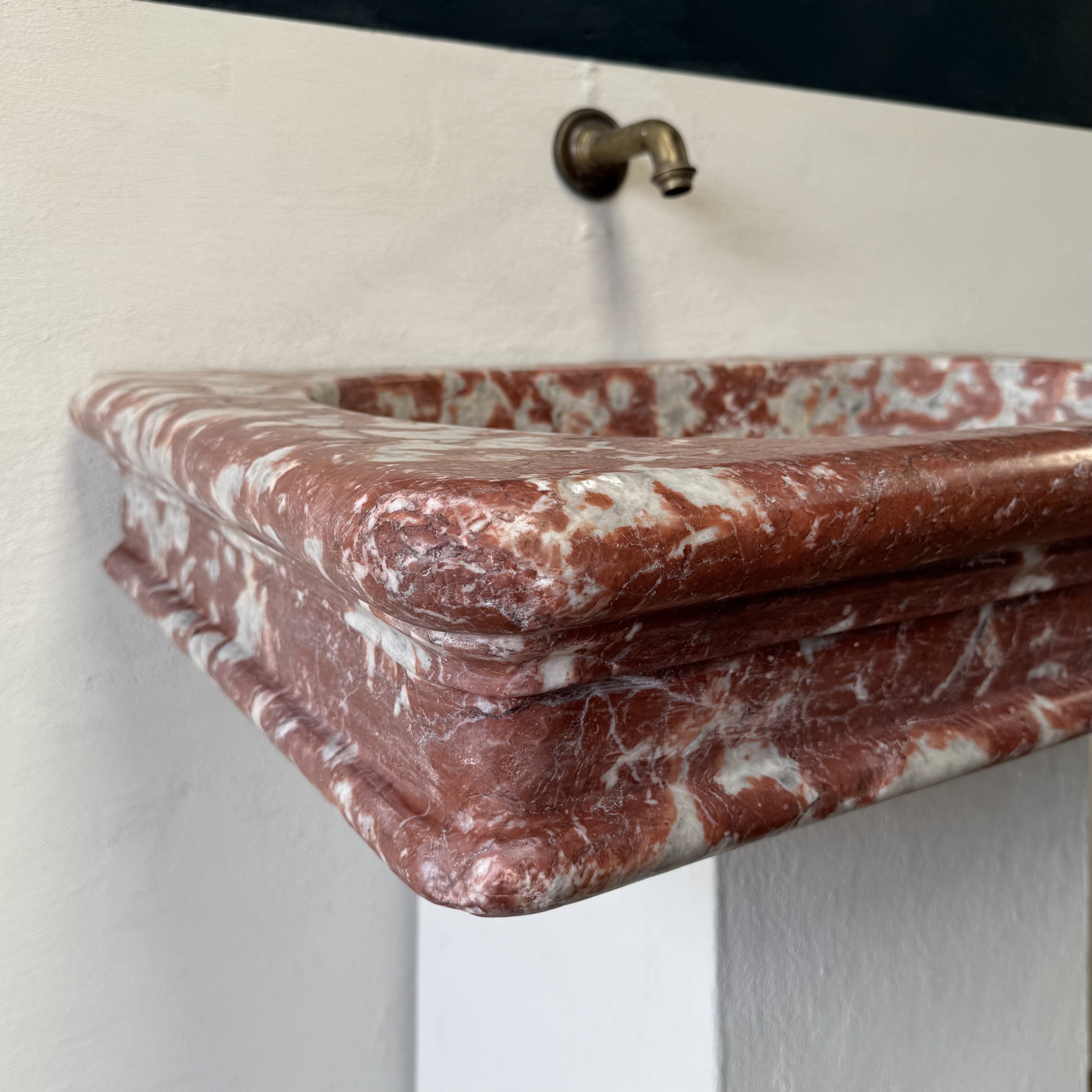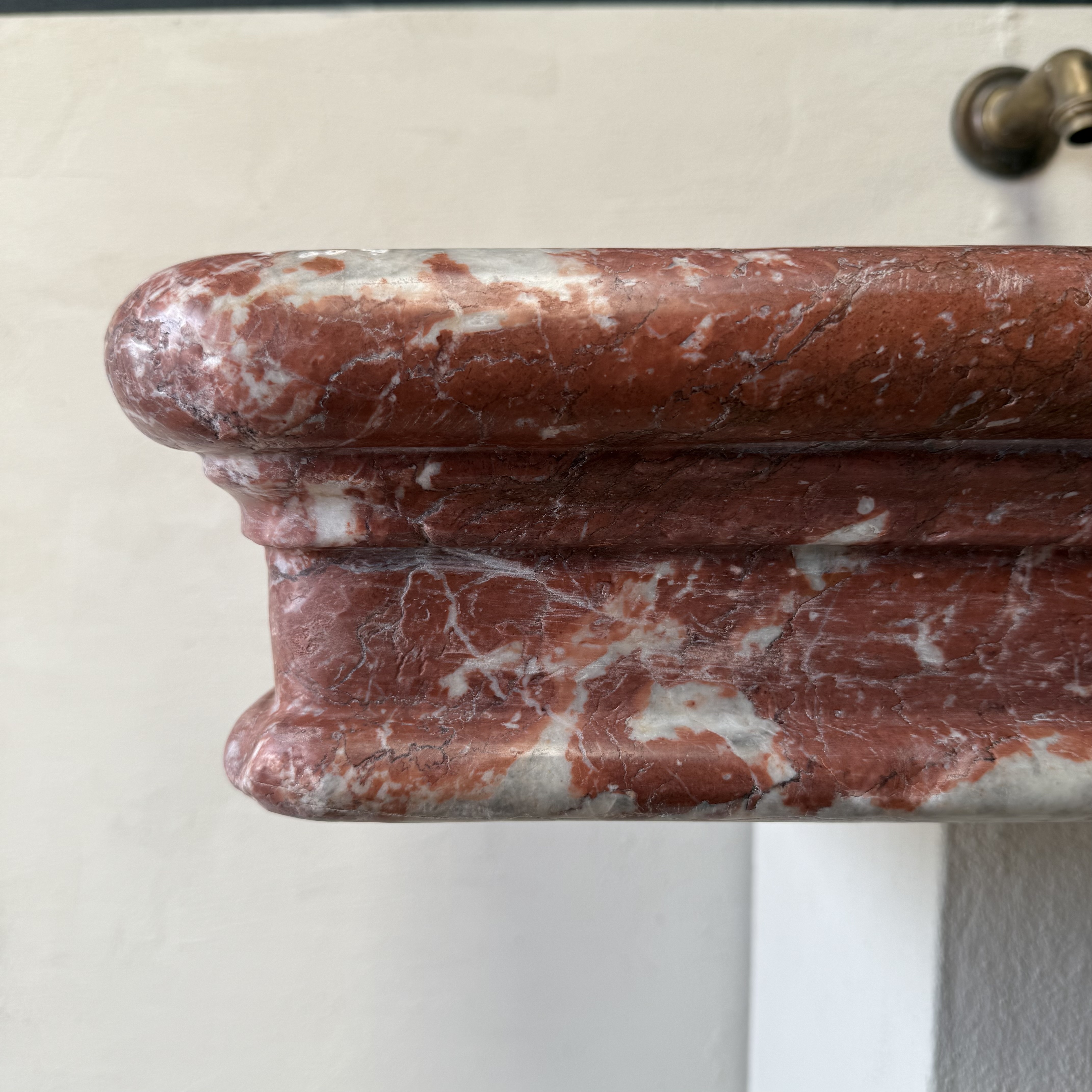 A rare, 18th century marble sink of rectangular form with elaborately moulded body, carved from richly veined Rouge Incarnat marble. The surface with natural wear