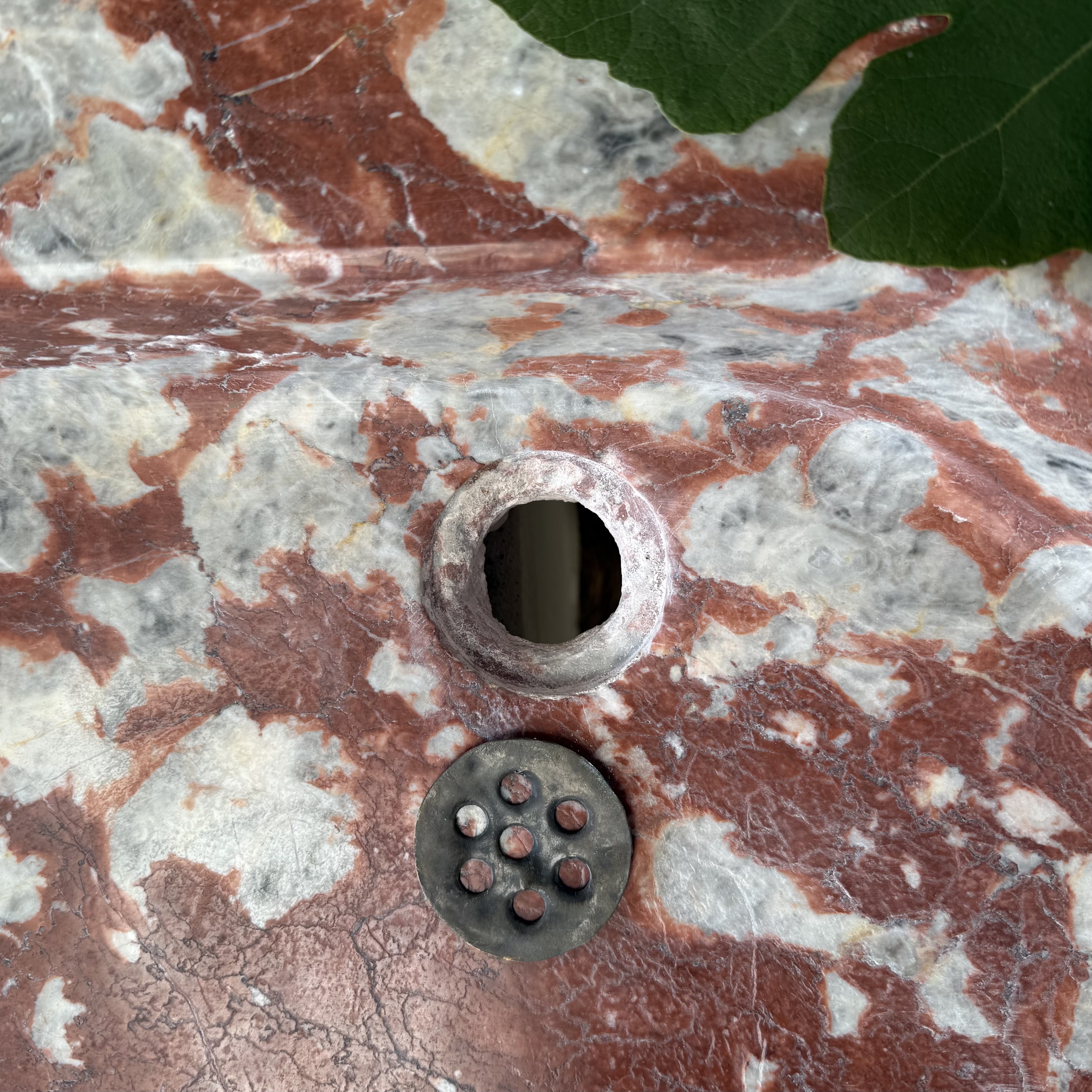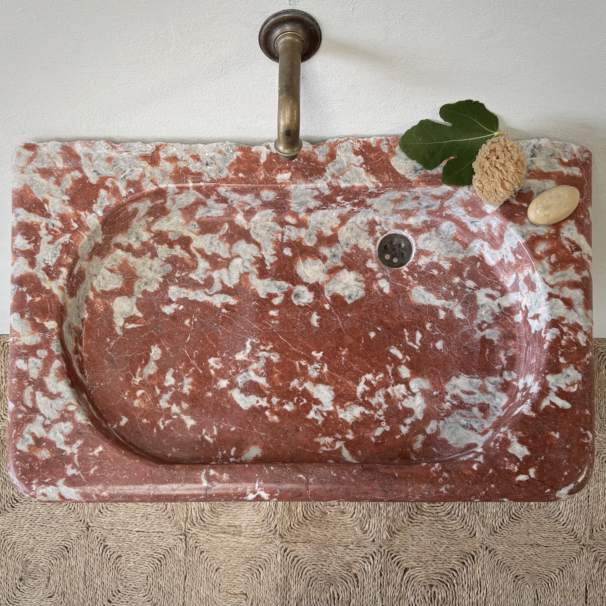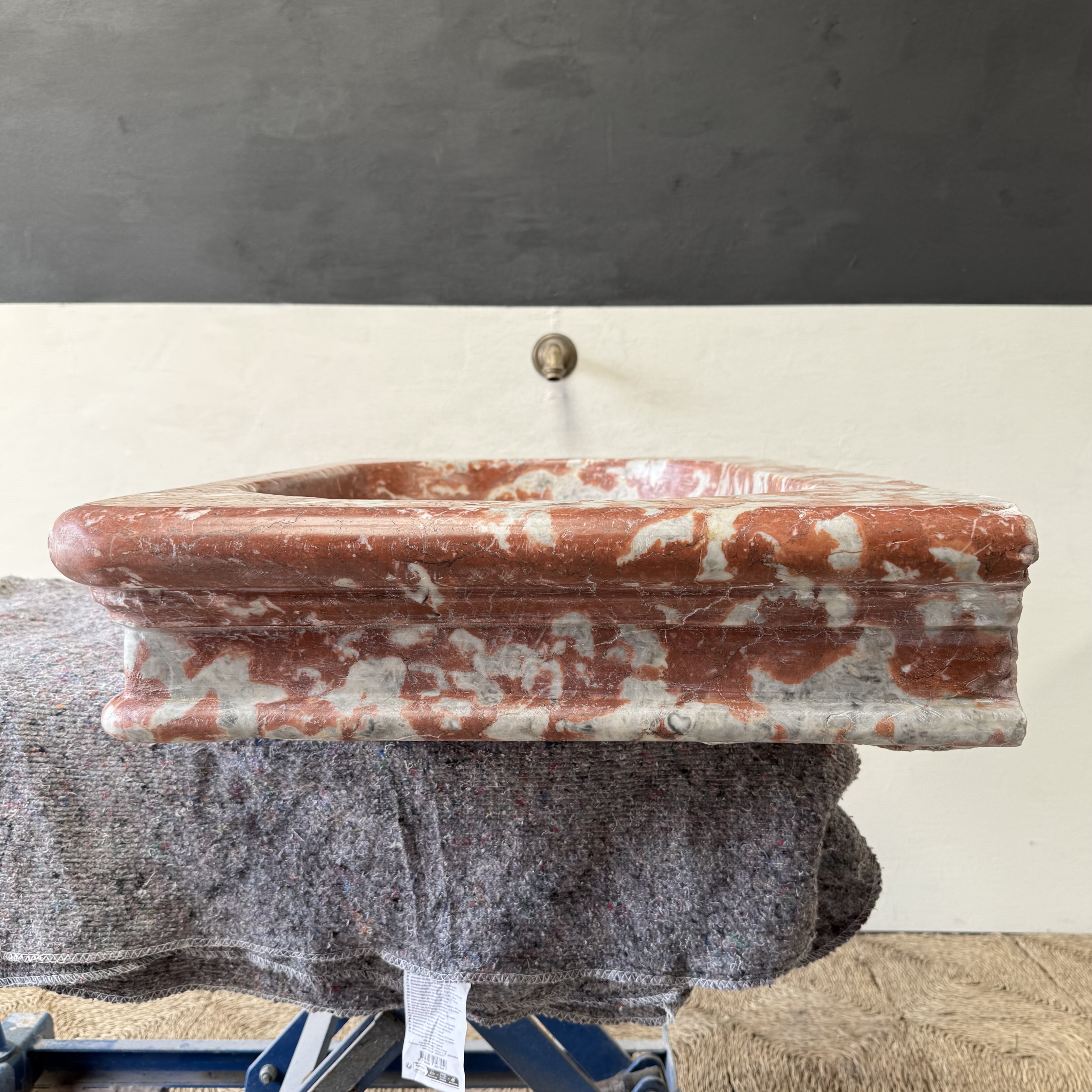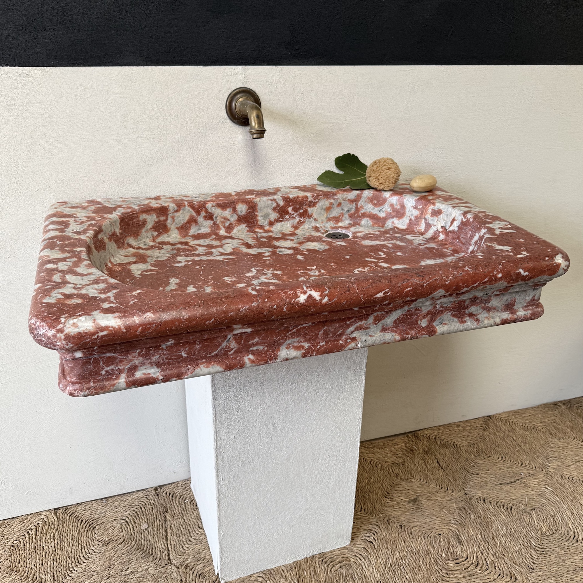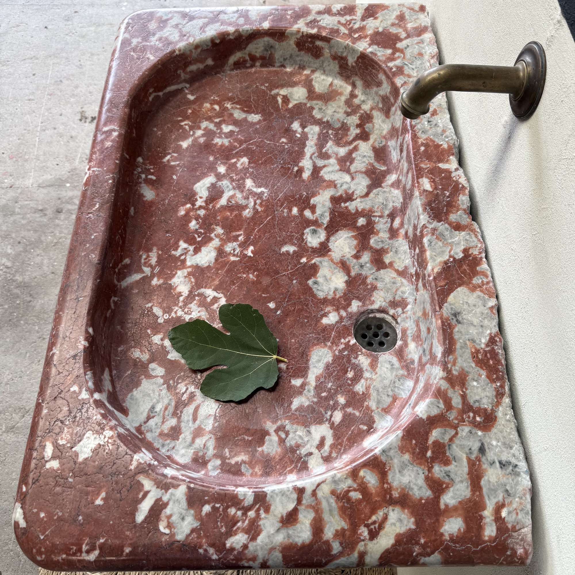A rare, 18th century marble sink of rectangular form with elaborately moulded body, carved from richly veined Rouge Incarnat marble. The surface with natural wear