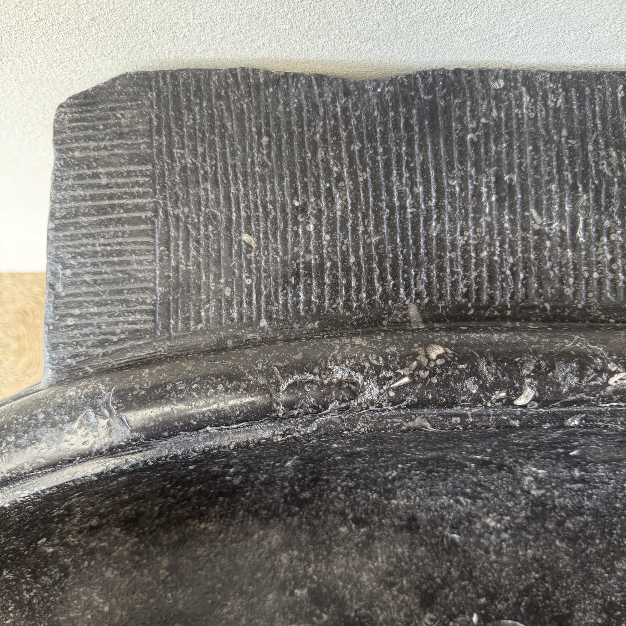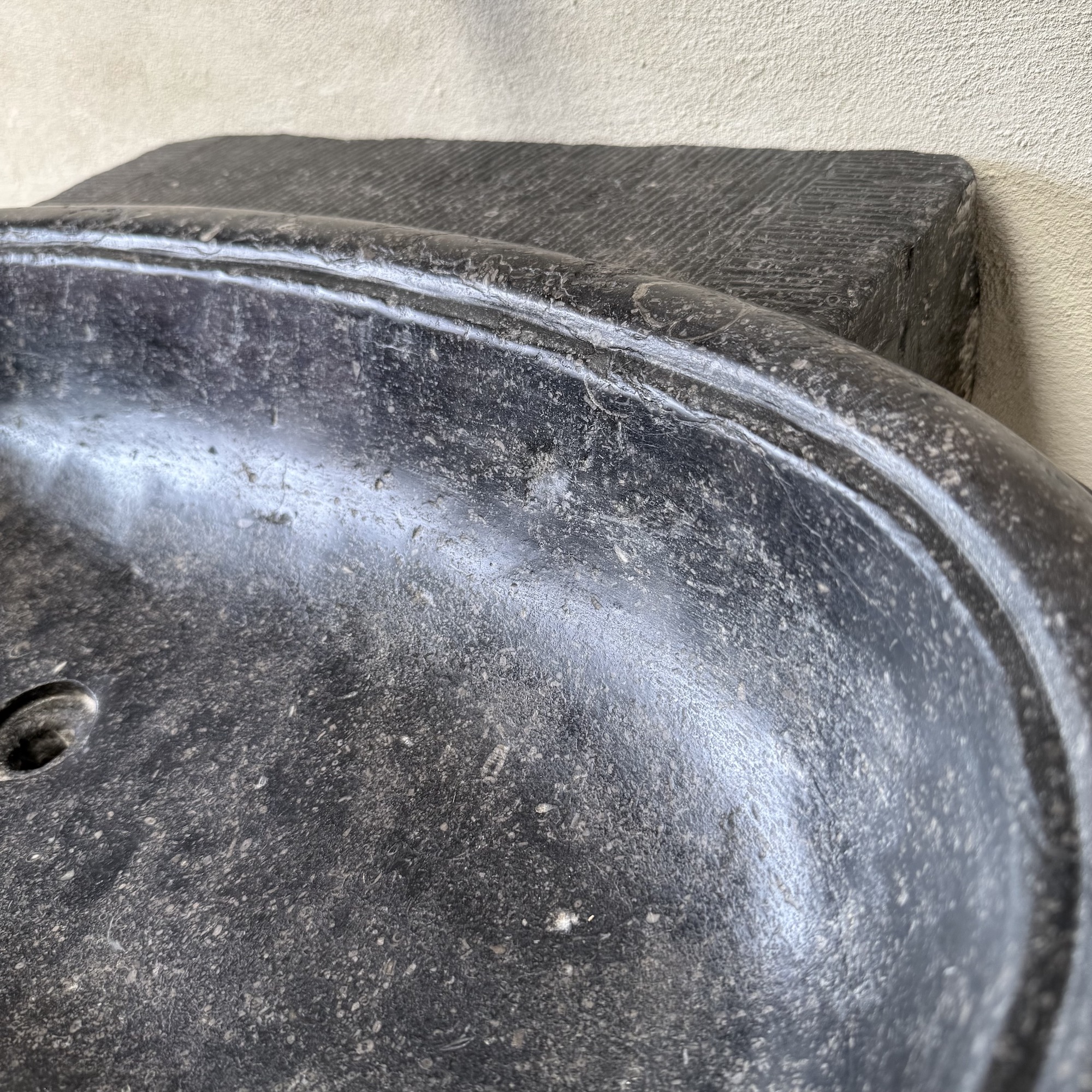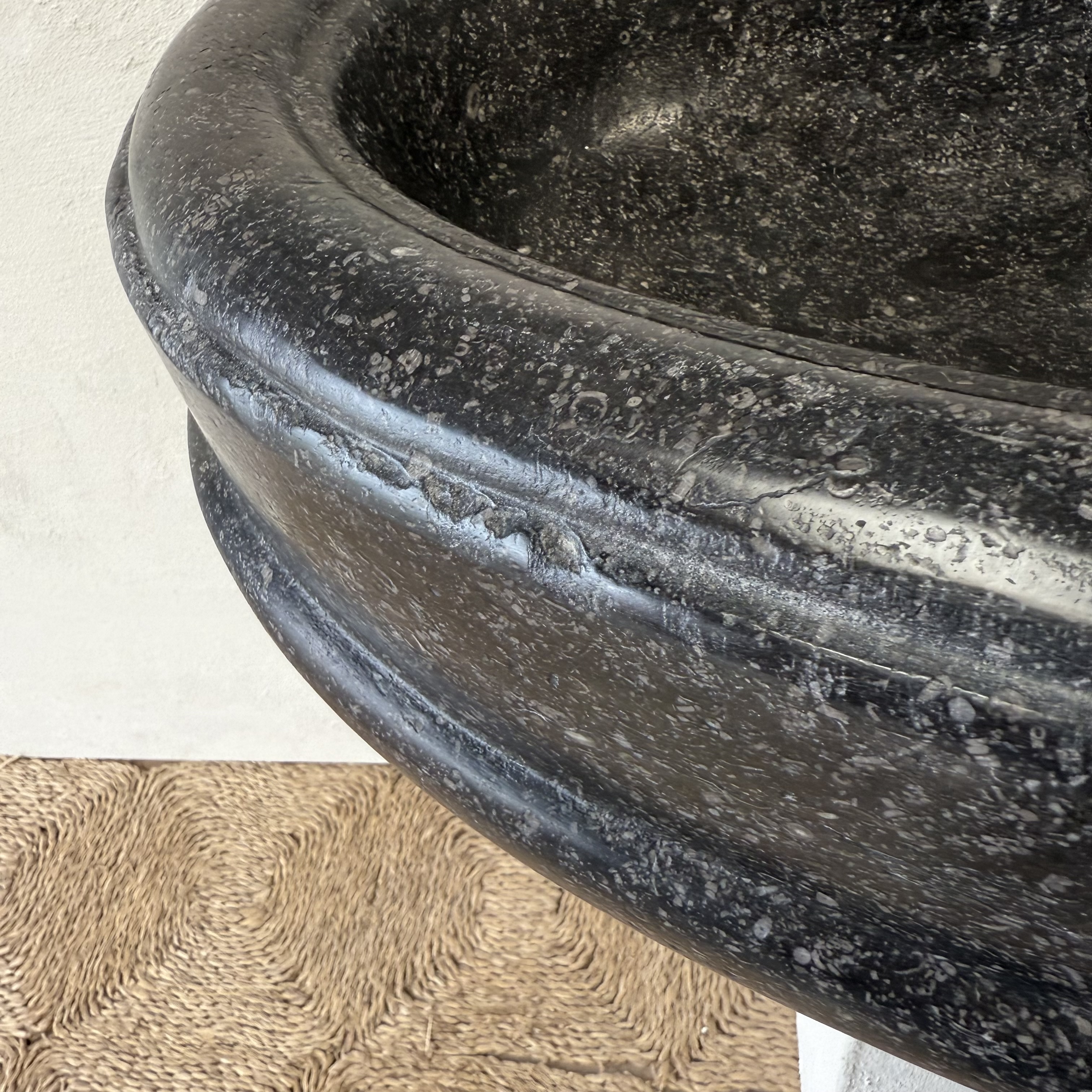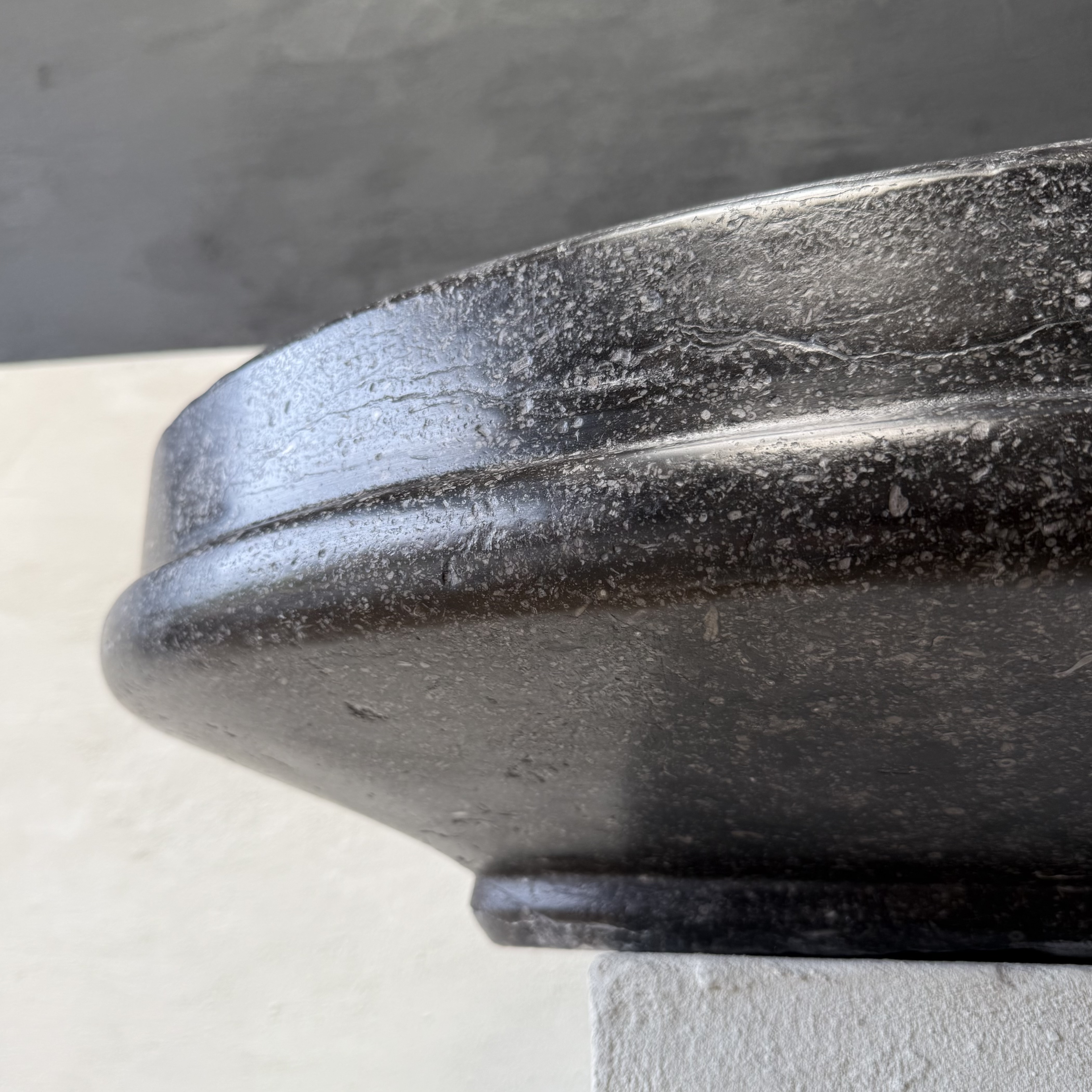 An exceptional oval font carved from dark black “petit granit” limestone, notable for its fine inclusions of small white fossils. This piece features a gracefully shaped, oval drum body resting on a tapered base. The font retains its original dovetail joint with a chiseled finish at the back, designed for secure wall mounting.