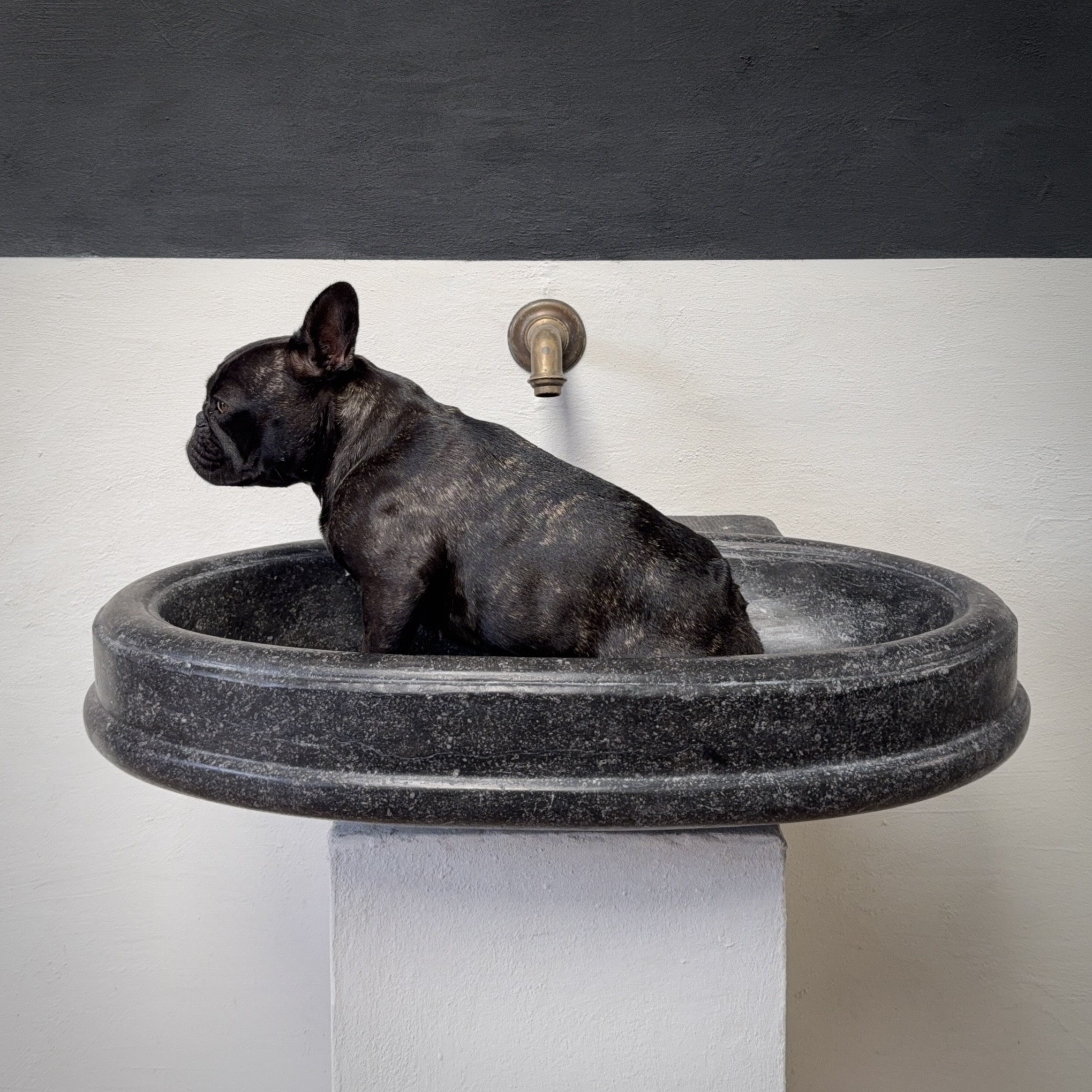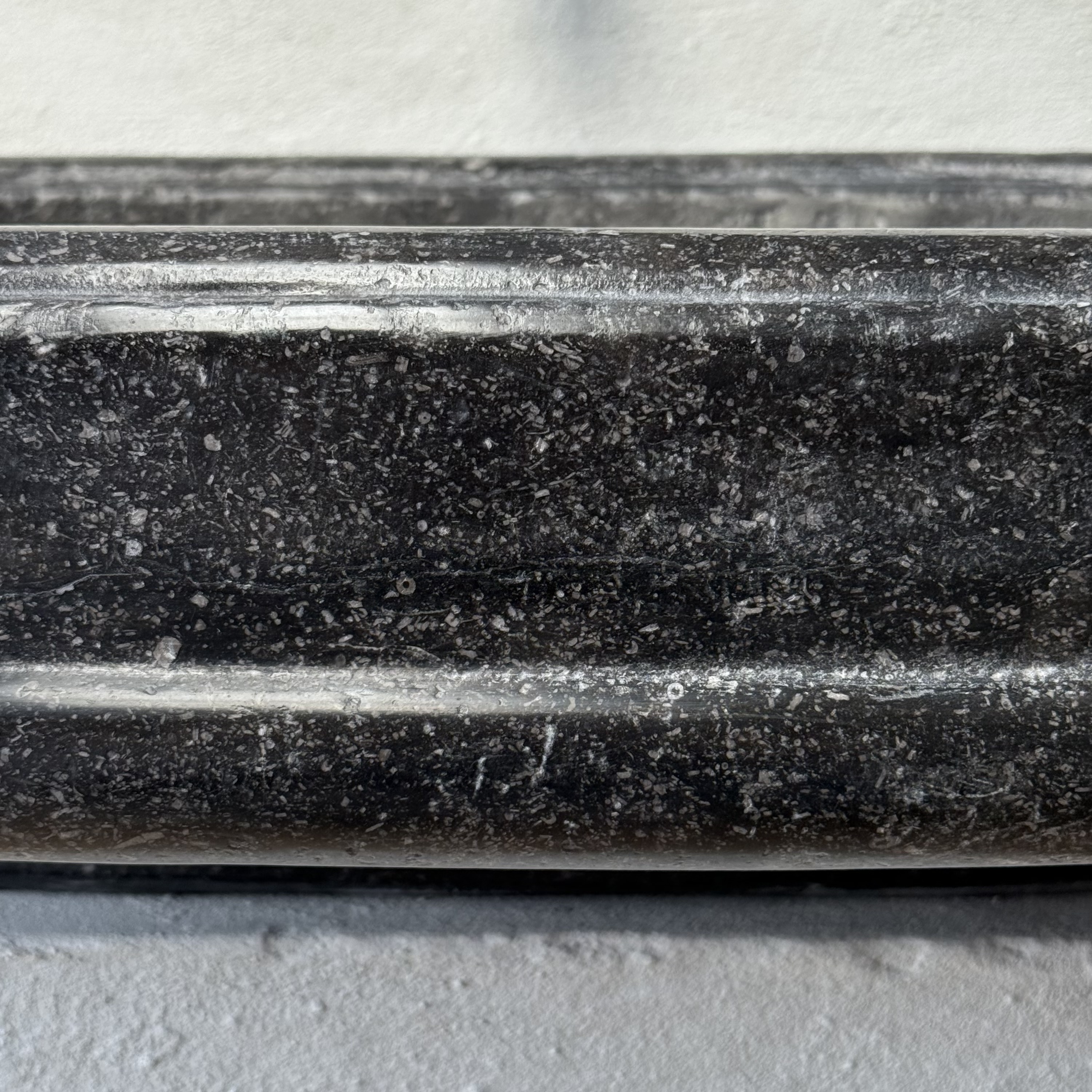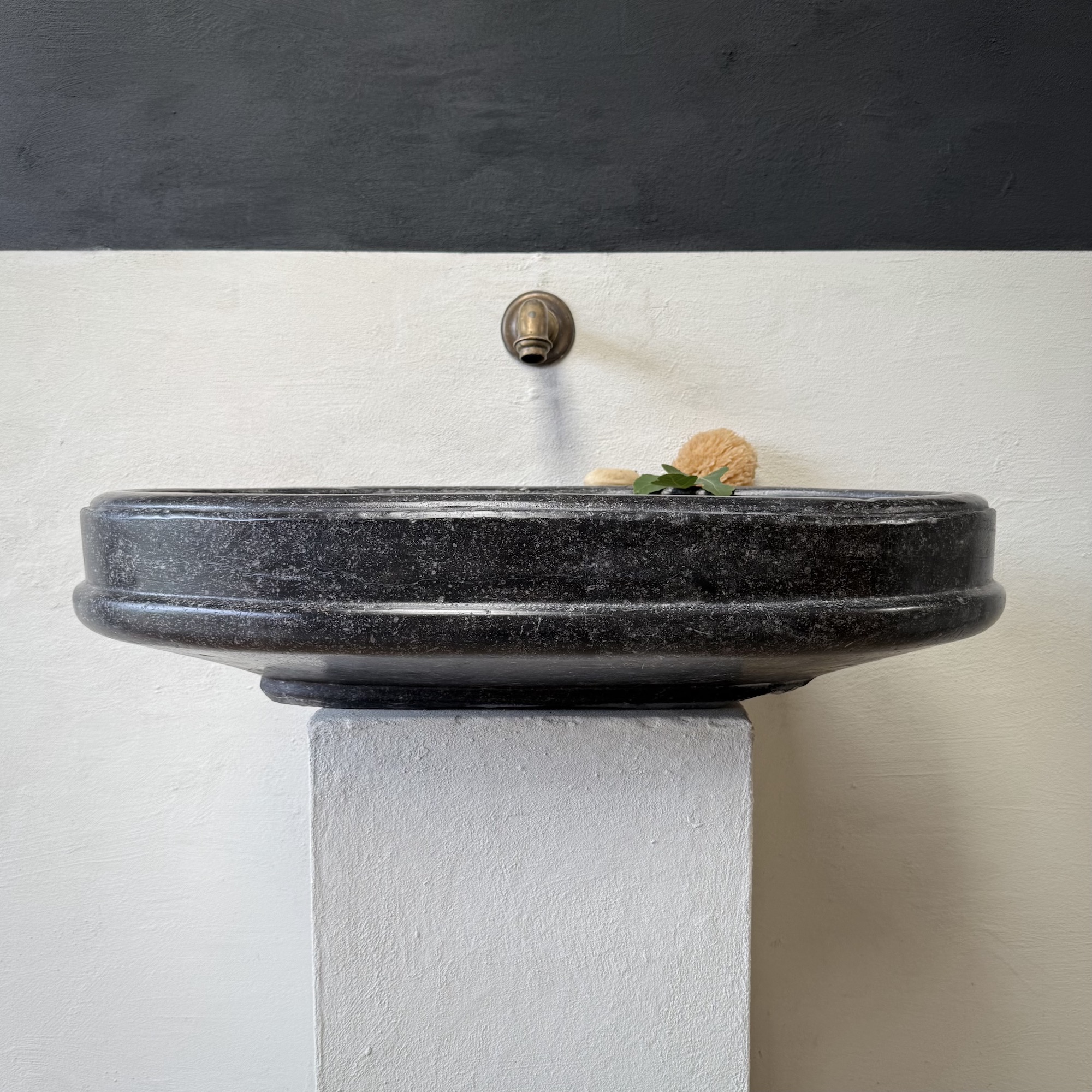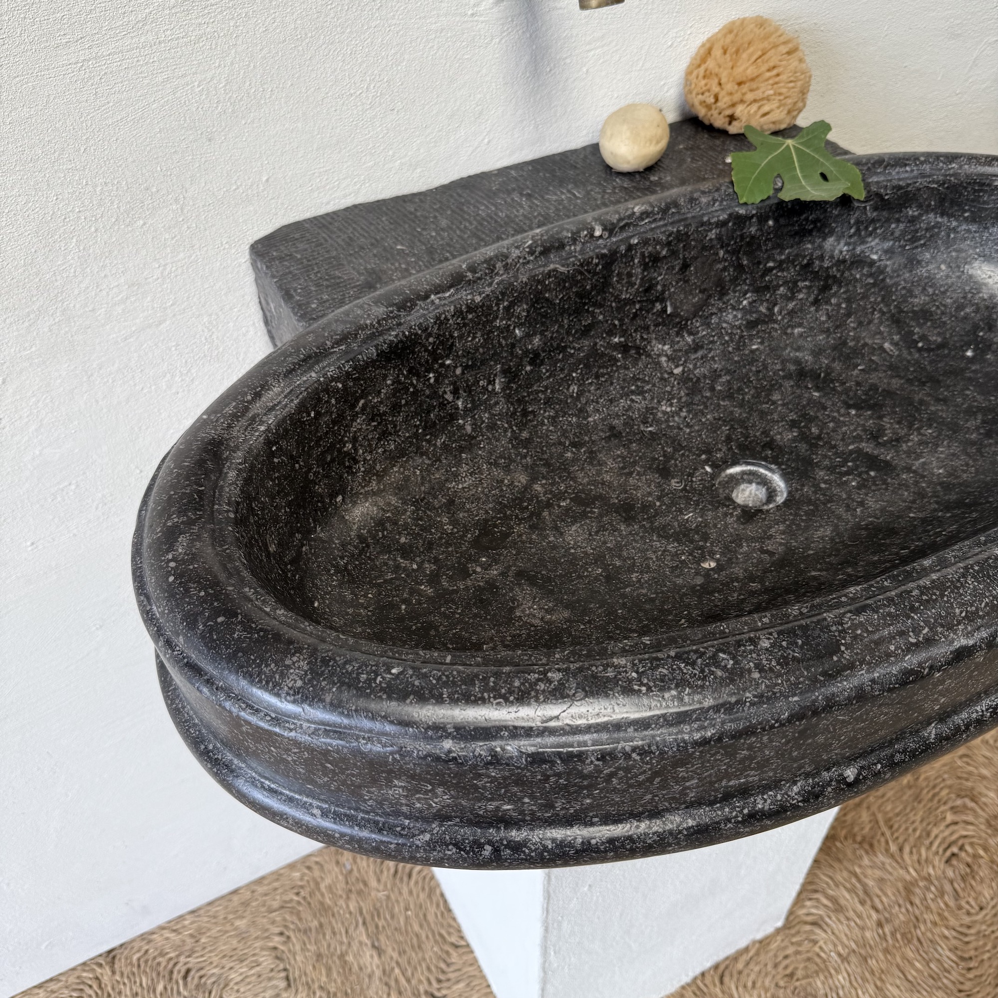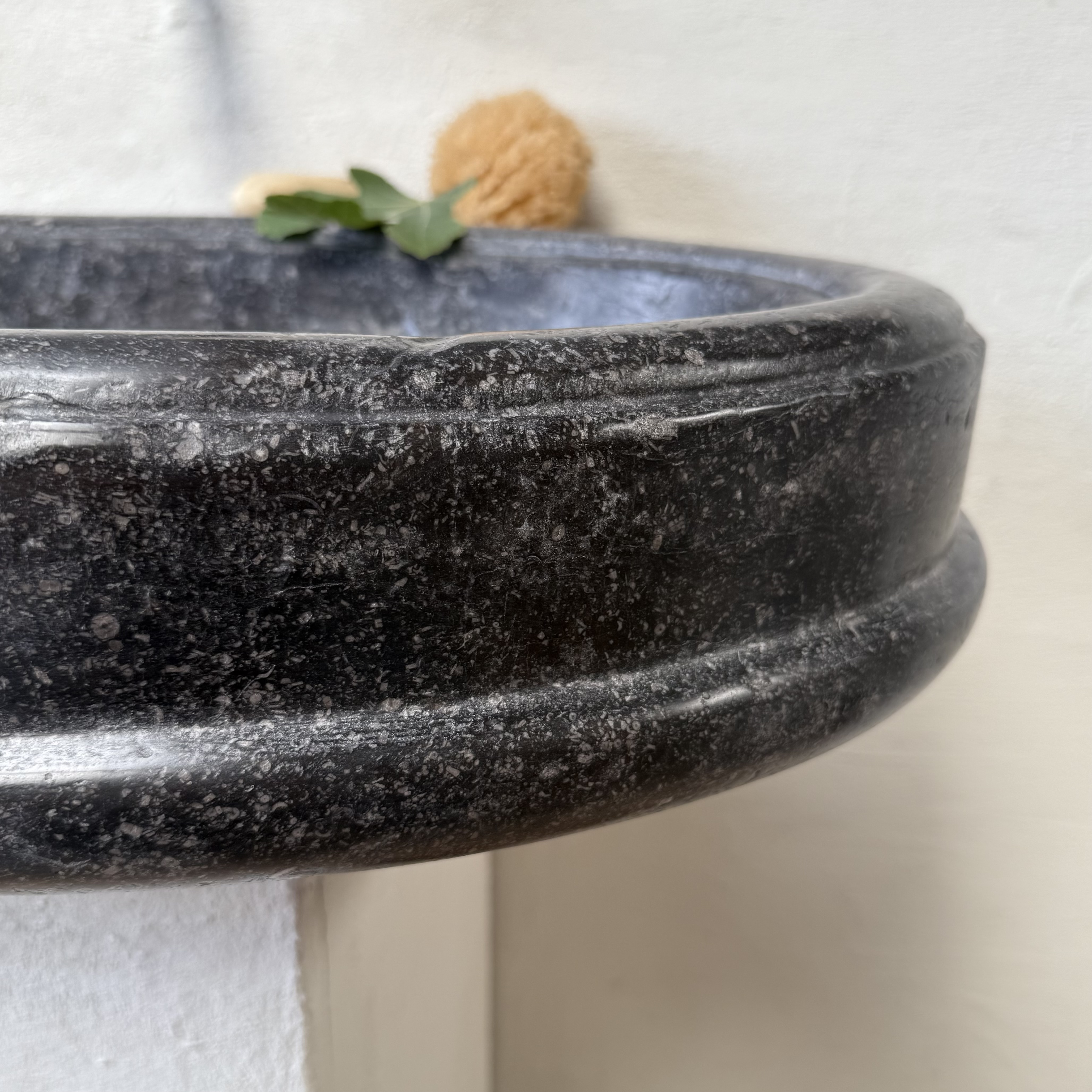 An exceptional oval font carved from dark black “petit granit” limestone, notable for its fine inclusions of small white fossils. This piece features a gracefully shaped, oval drum body resting on a tapered base. The font retains its original dovetail joint with a chiseled finish at the back, designed for secure wall mounting.