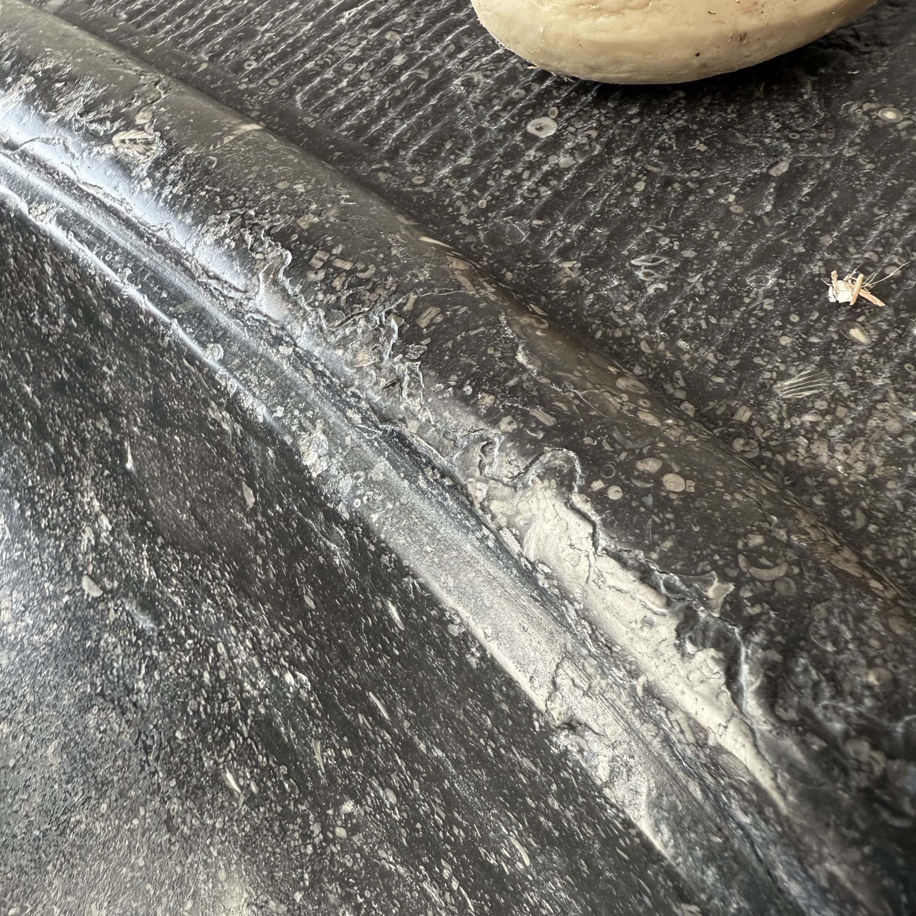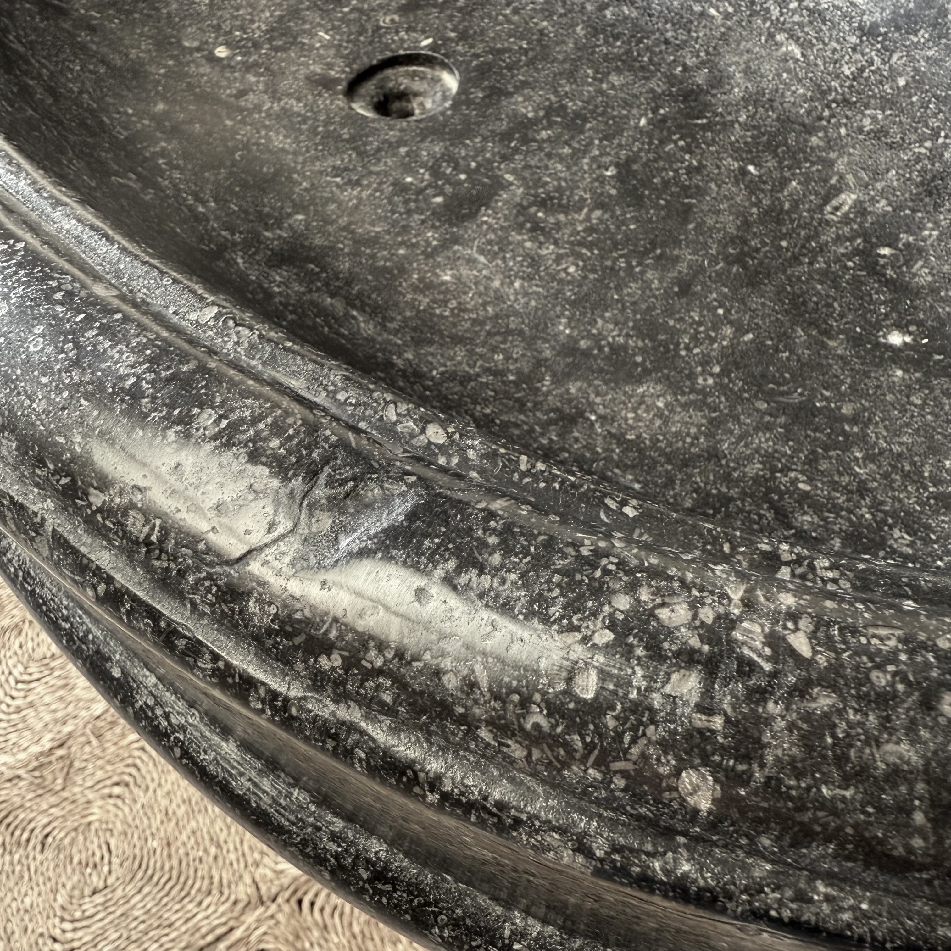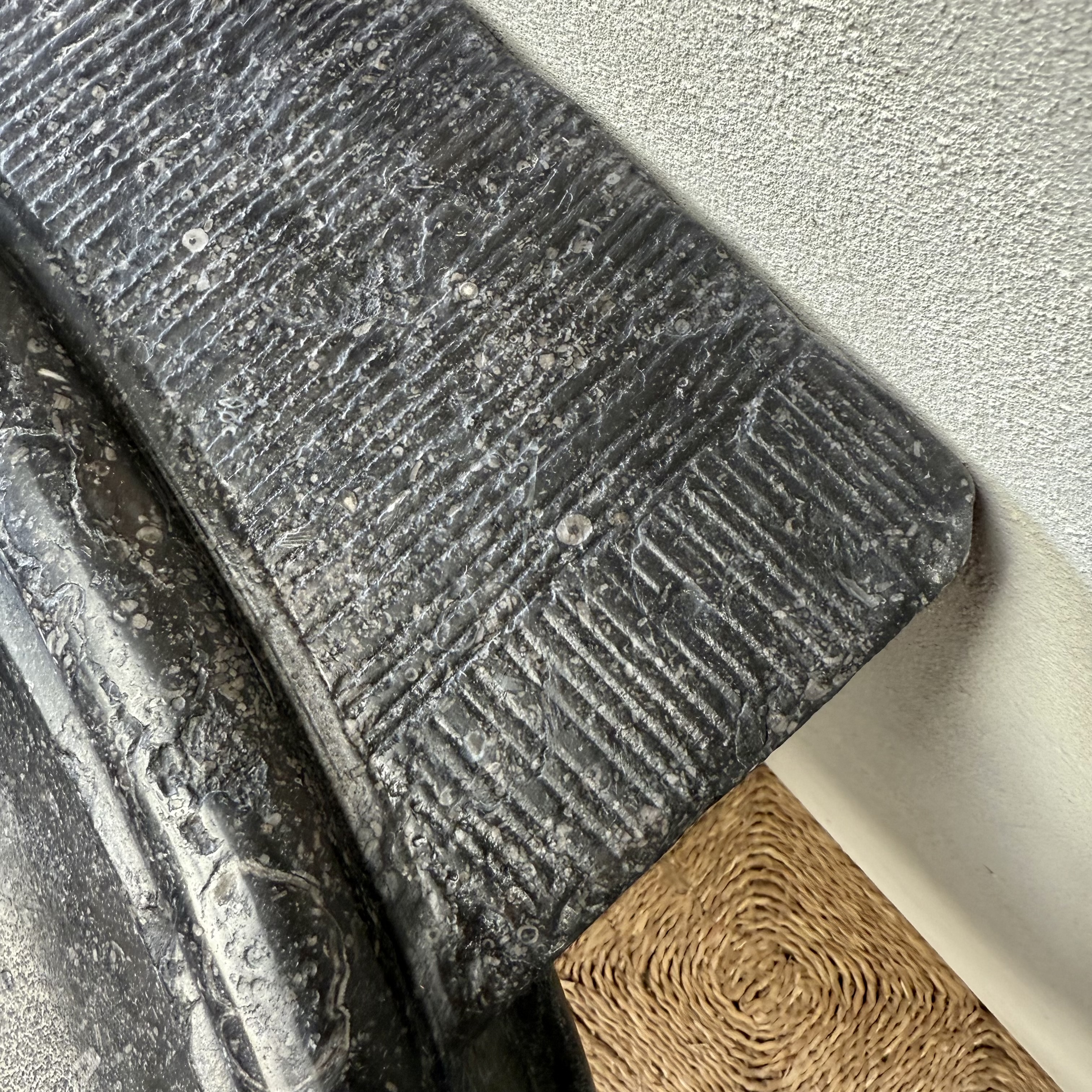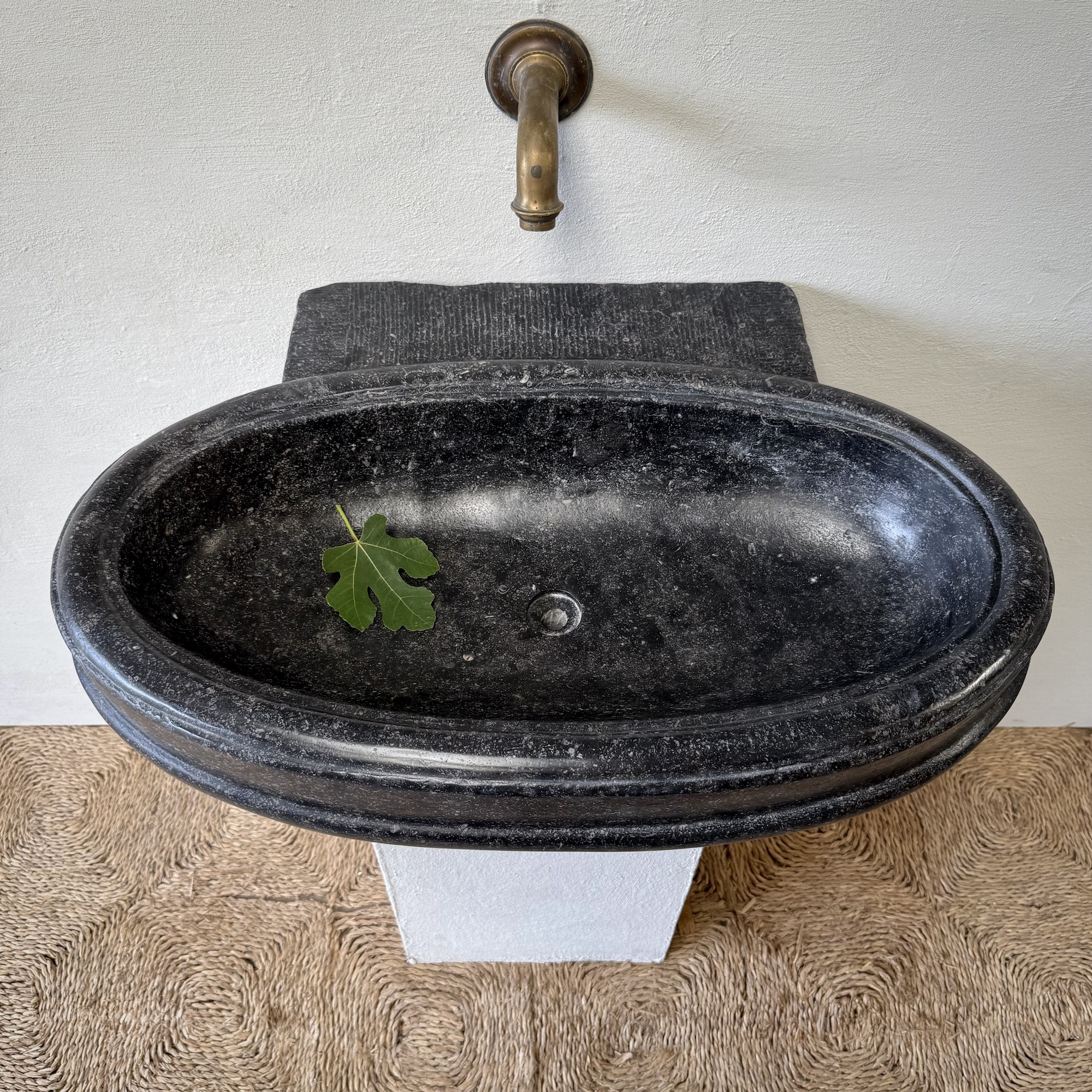 An exceptional oval font carved from dark black “petit granit” limestone, notable for its fine inclusions of small white fossils. This piece features a gracefully shaped, oval drum body resting on a tapered base. The font retains its original dovetail joint with a chiseled finish at the back, designed for secure wall mounting.