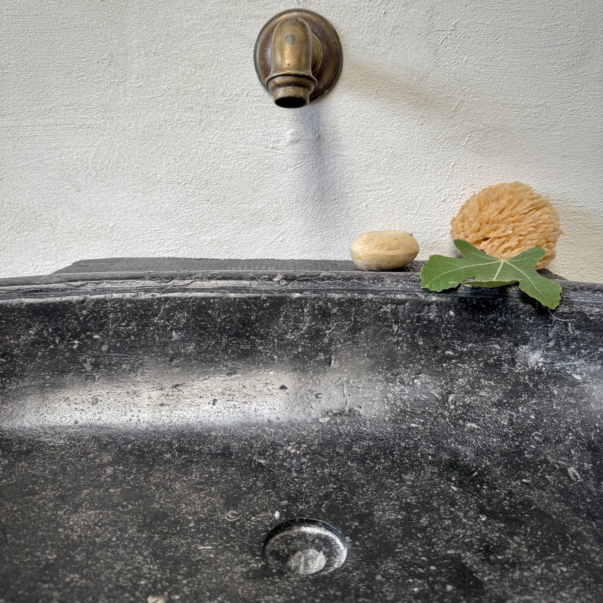 The upper rim is adorned with an elegant convex moulding, adding a refined architectural touch to its robust form. The interior is smoothly finished, ensuring perfect water drainage, while the exterior shows a beautifully aged patina.