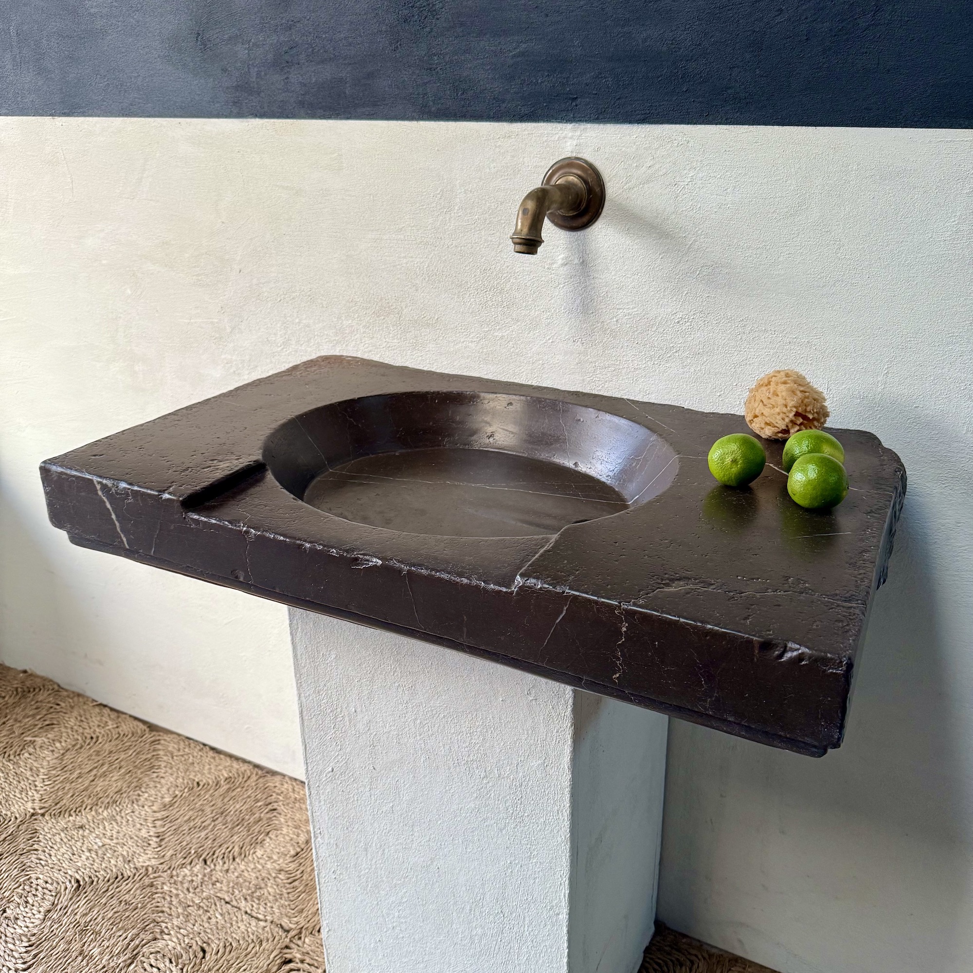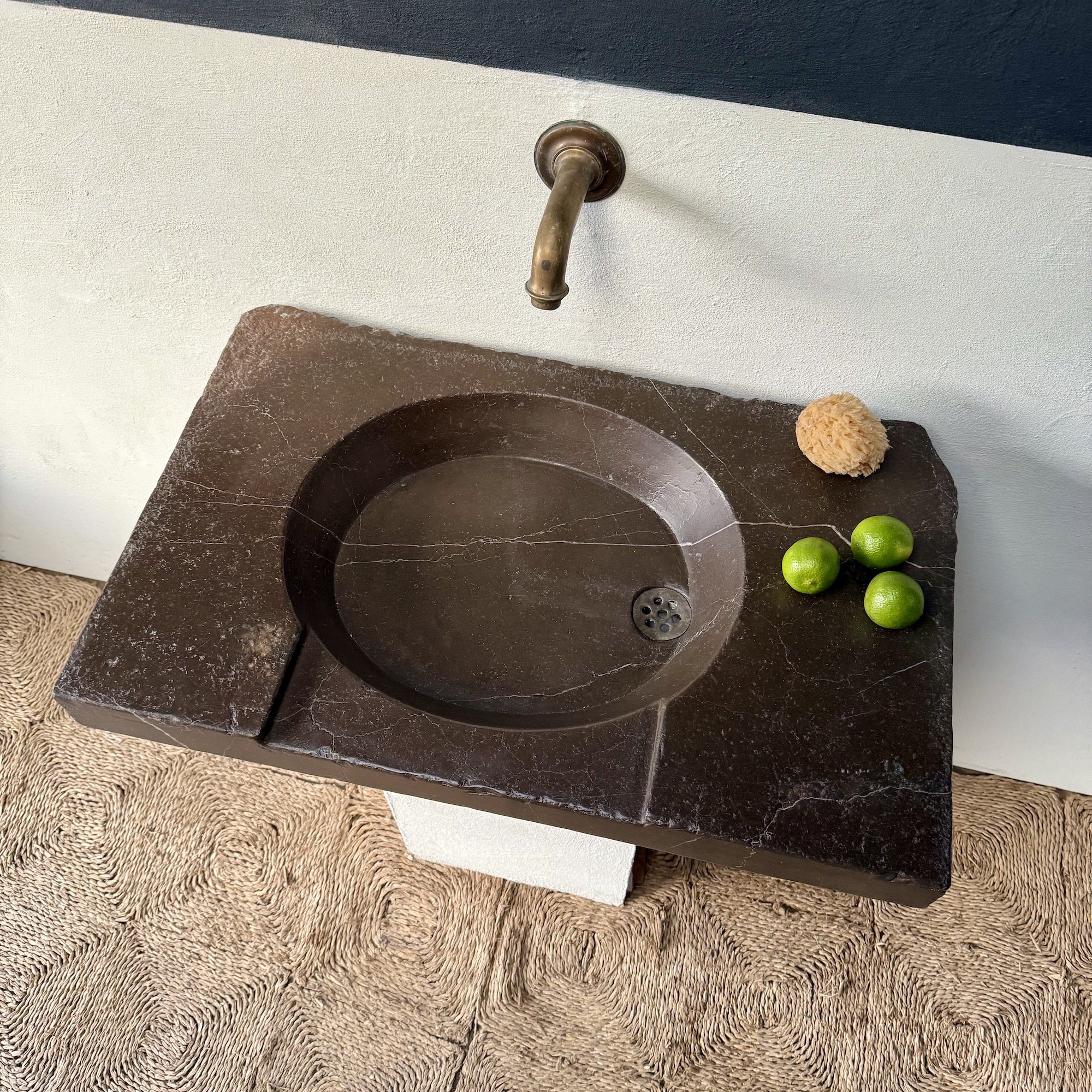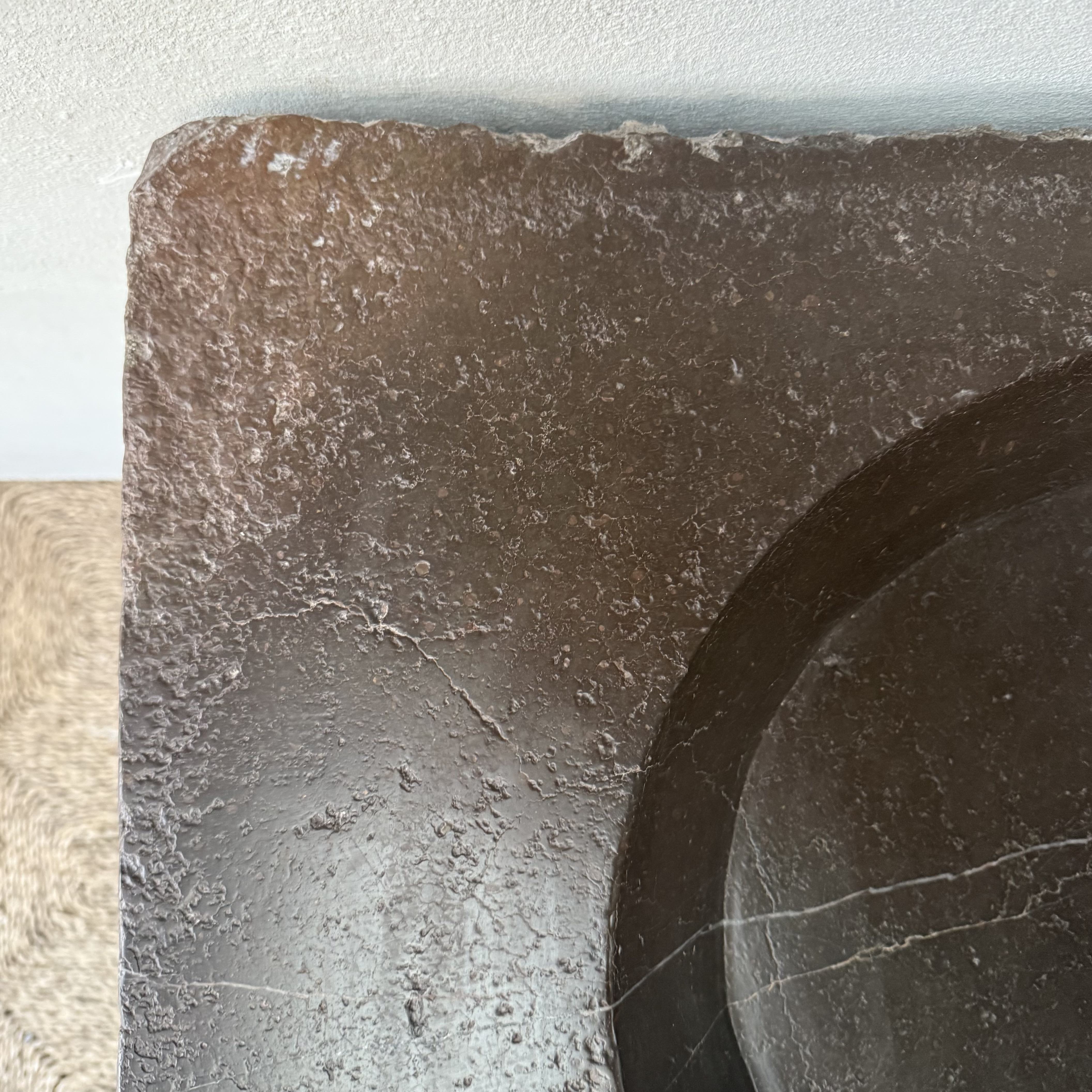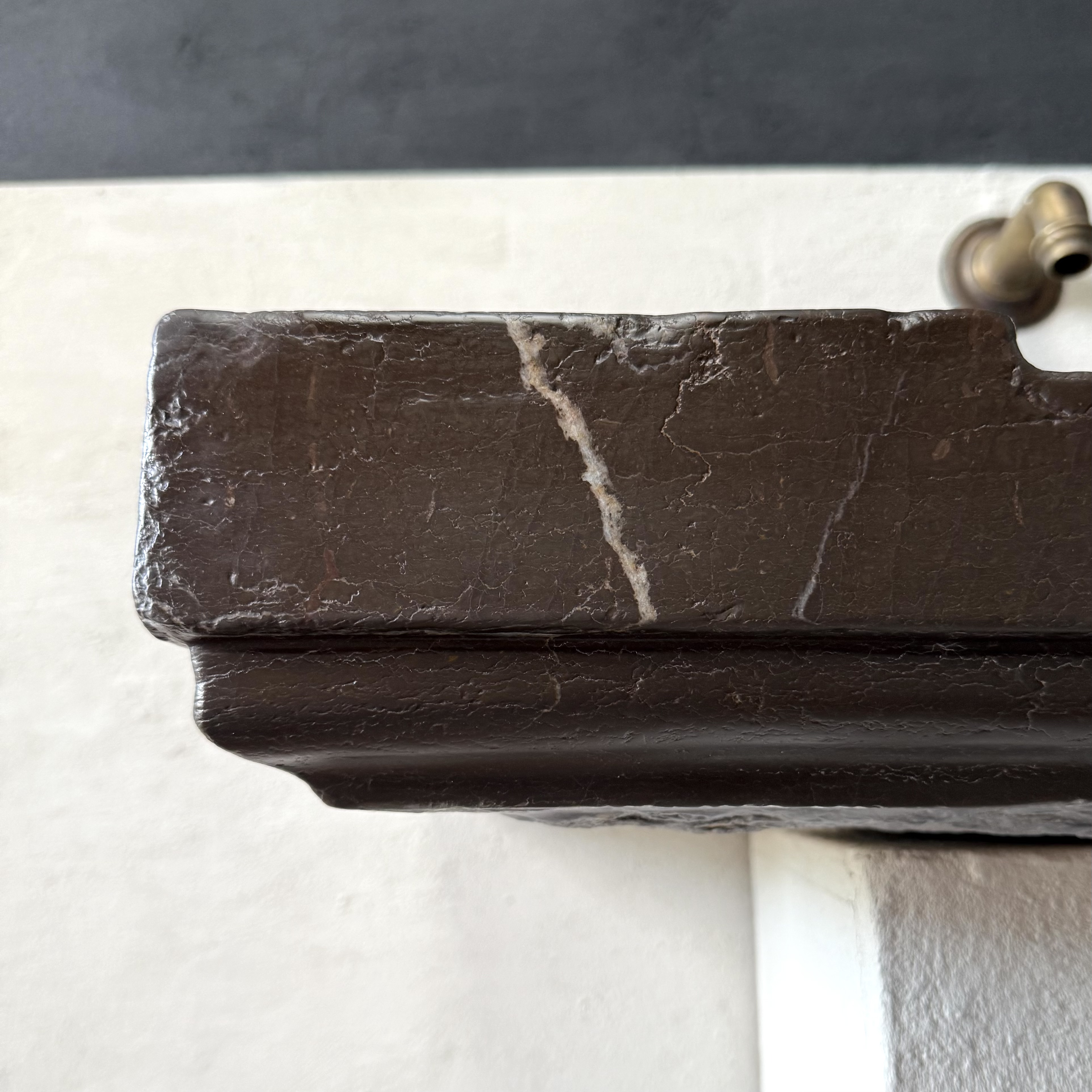 A beautifully carved sink in dark, warm brown Pyrenean marble, dating to circa 1780. Of rectangular form with a slightly off-centered oval basin, the piece features a finely worked moulding along the lower rim. The front edge is subtly lowered at the basin, demonstrating both craftsmanship and functional design typical of the period.