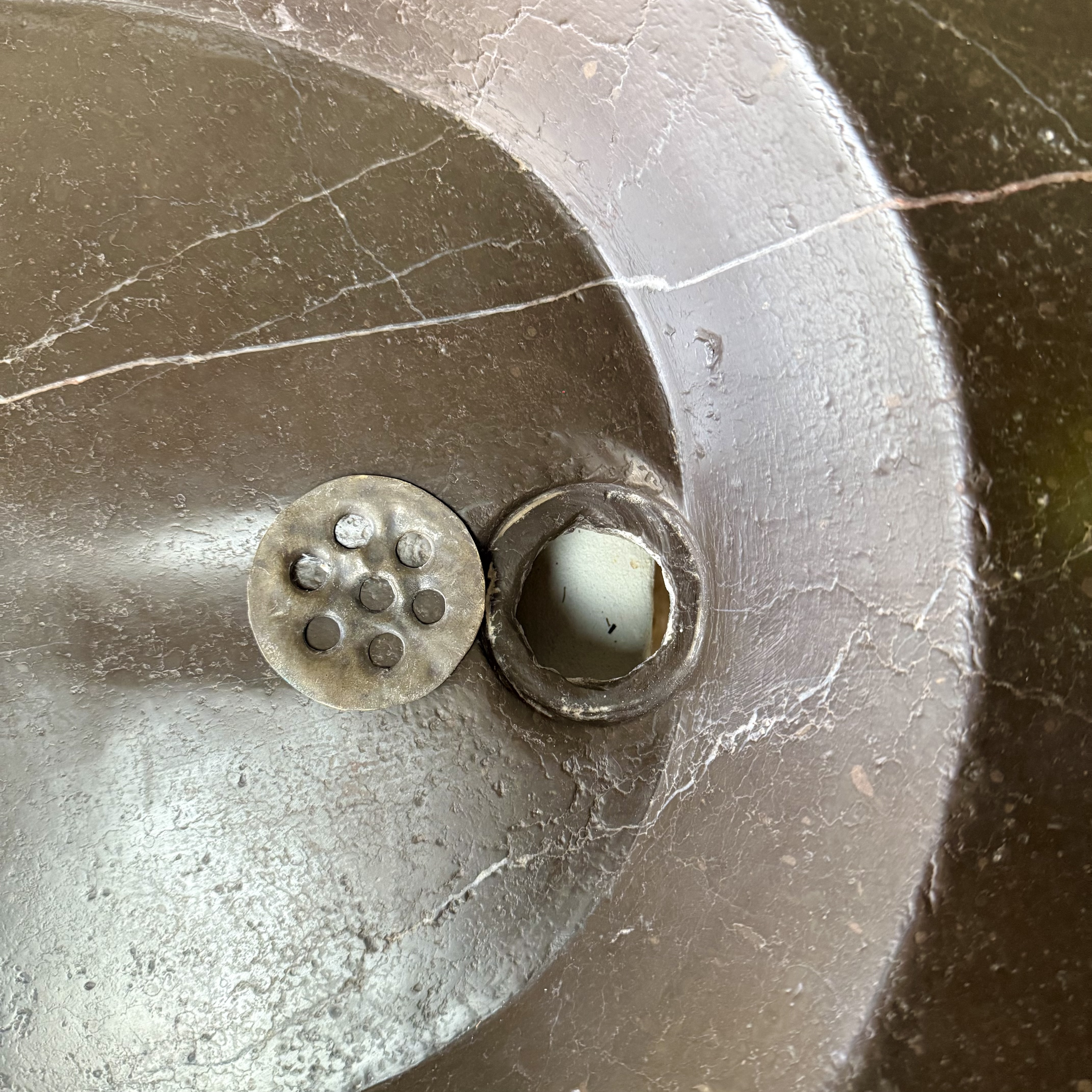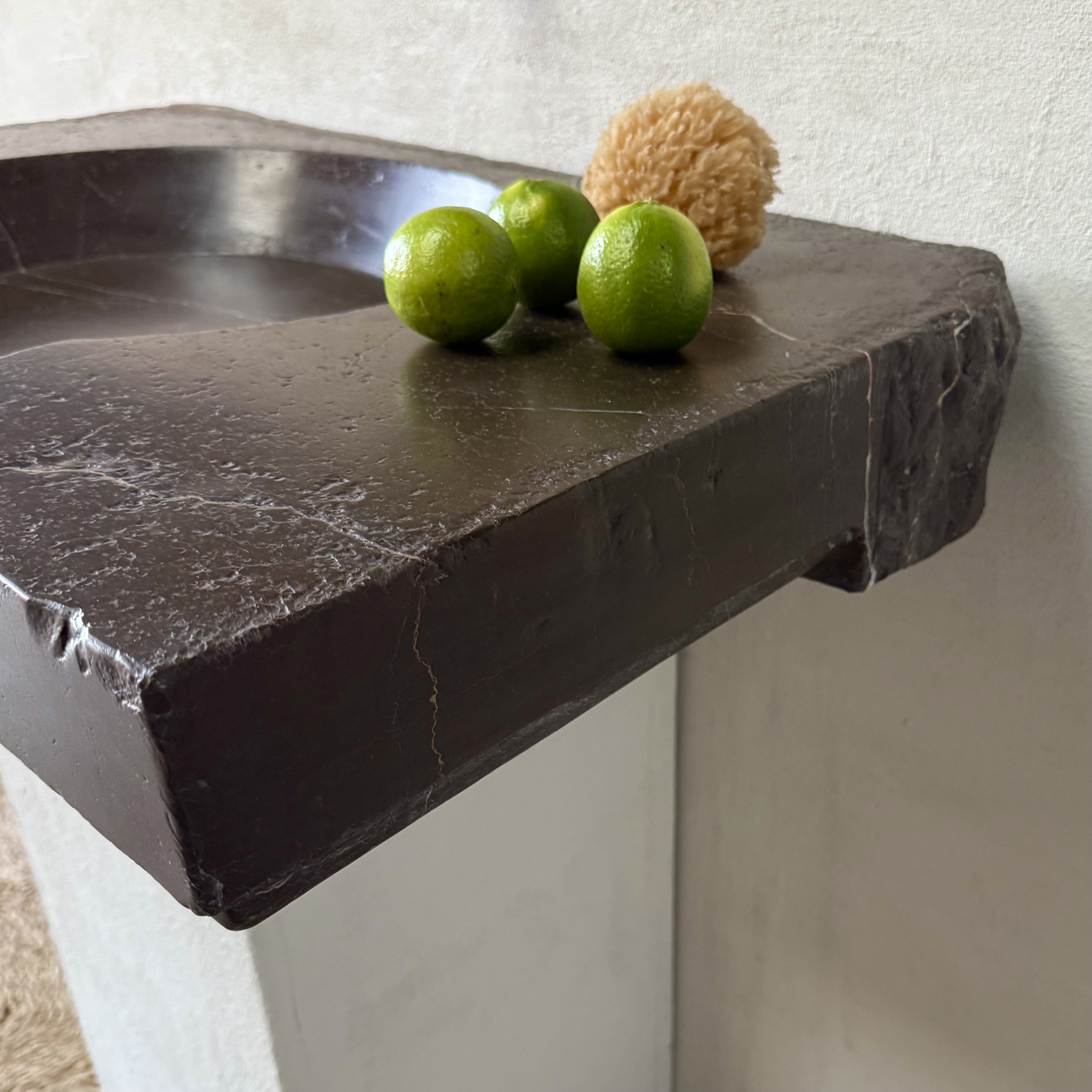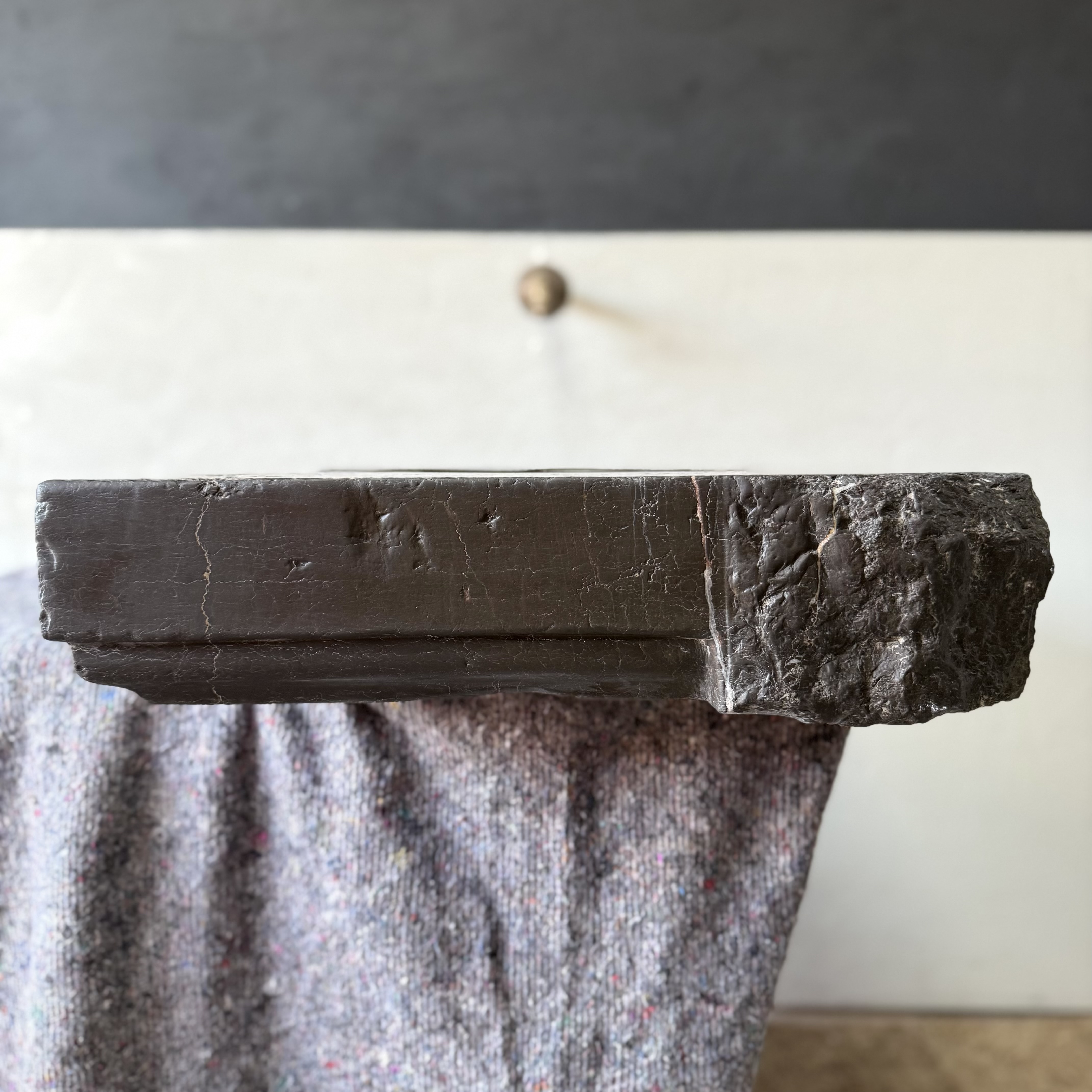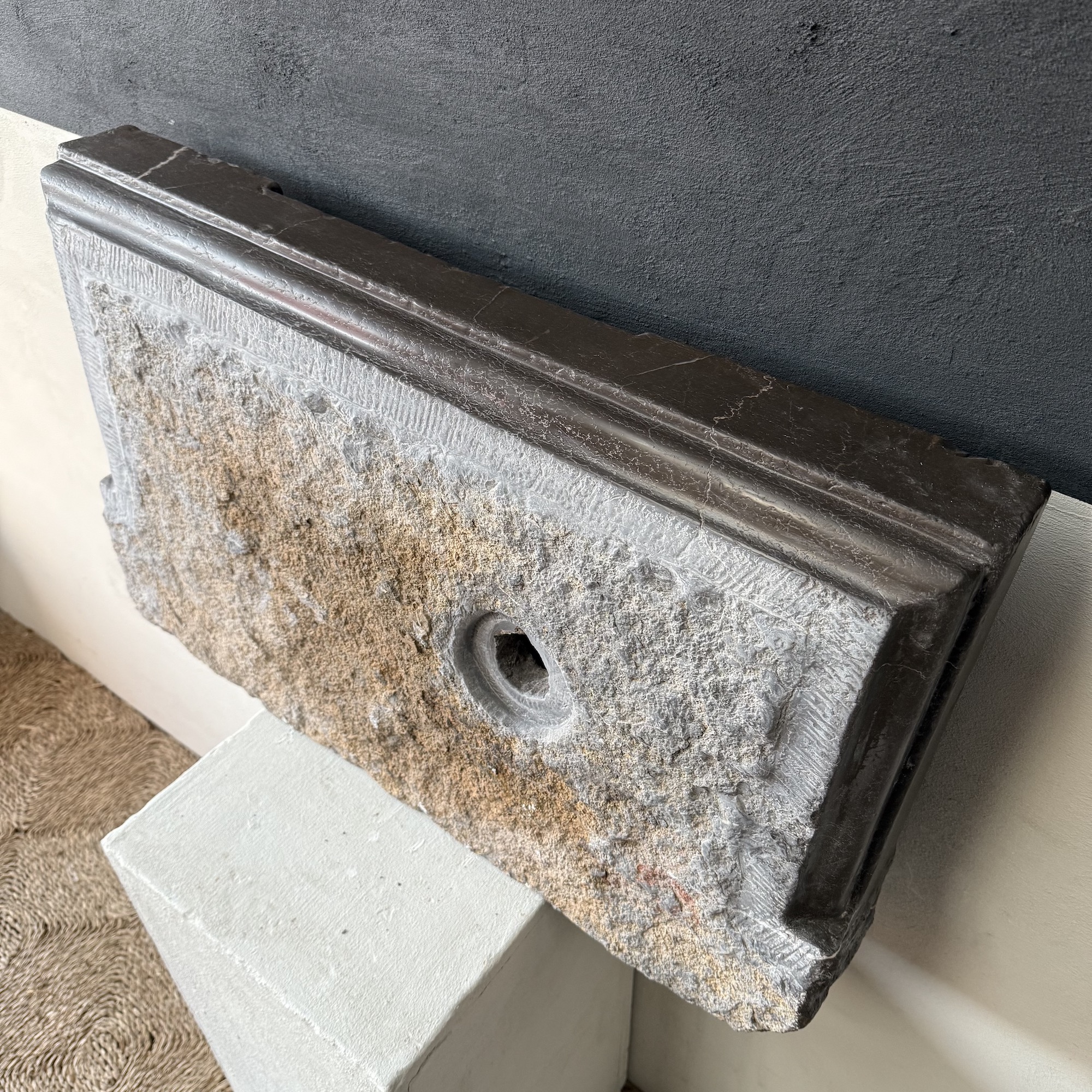 A beautifully carved sink in dark, warm brown Pyrenean marble, dating to circa 1780. Of rectangular form with a slightly off-centered oval basin, the piece features a finely worked moulding along the lower rim. The front edge is subtly lowered at the basin, demonstrating both craftsmanship and functional design typical of the period.