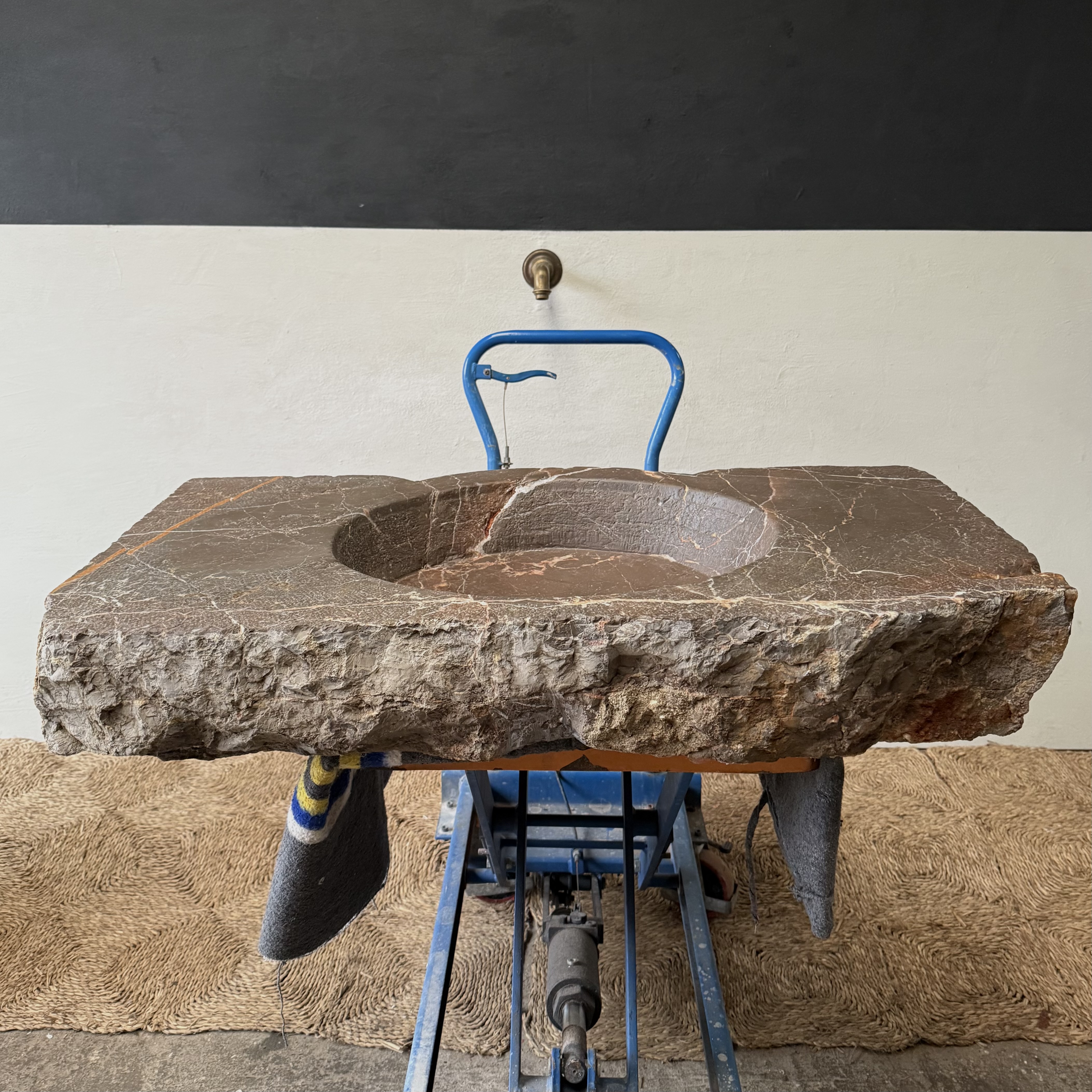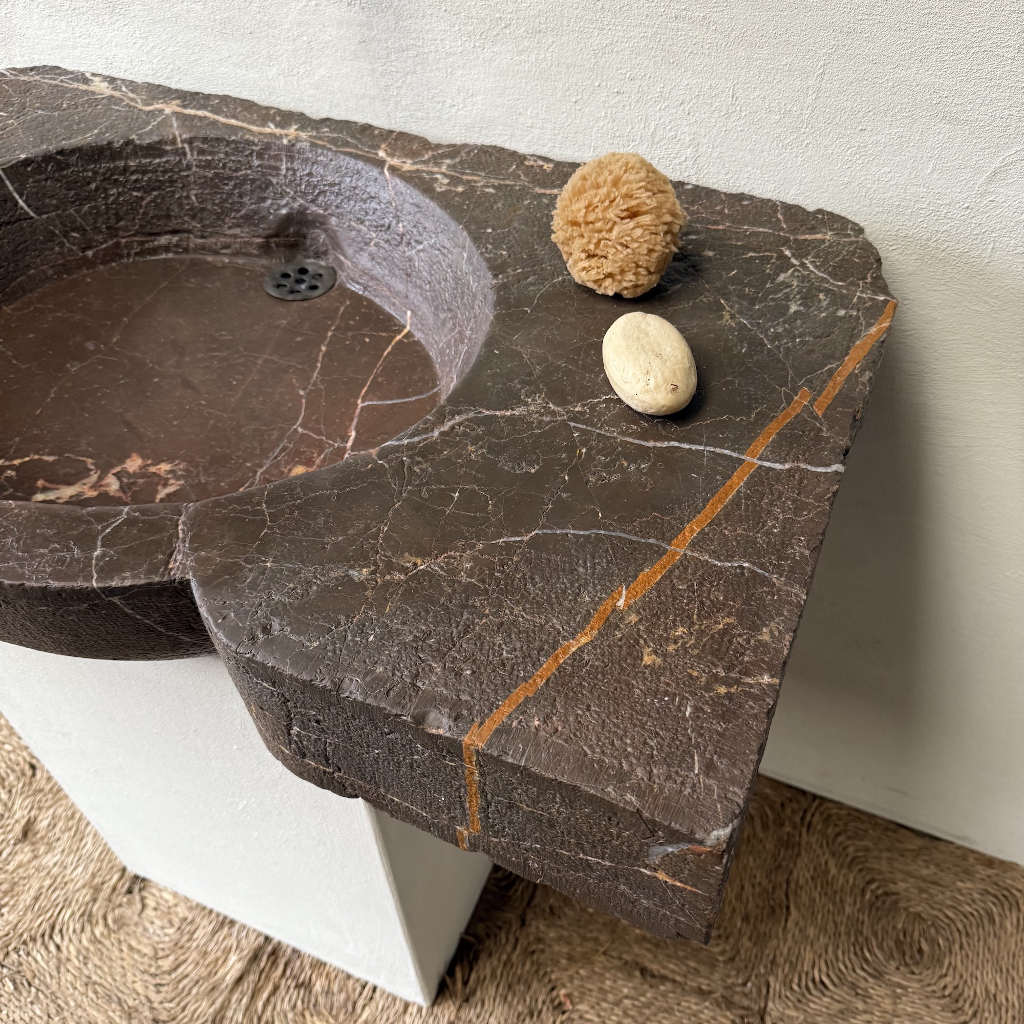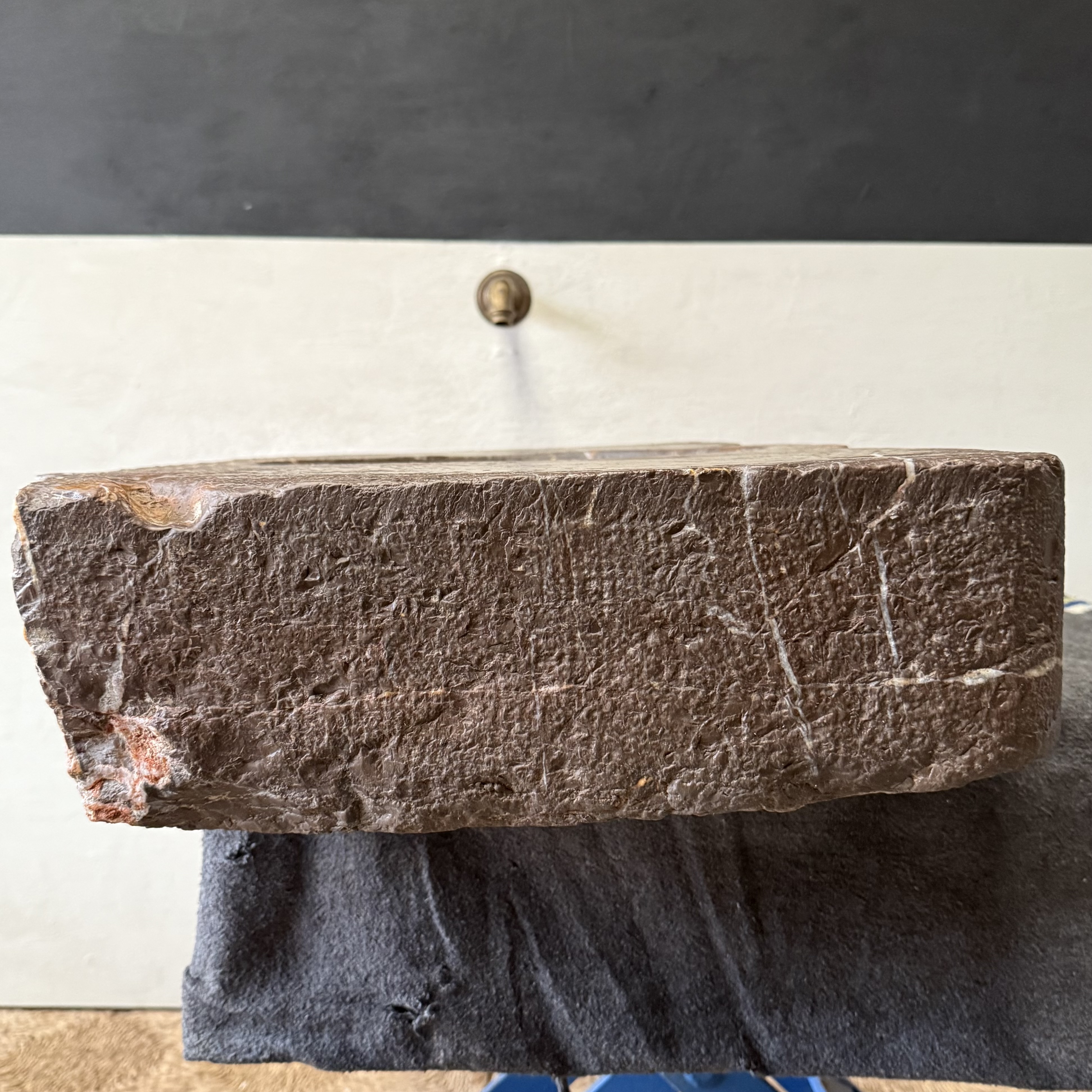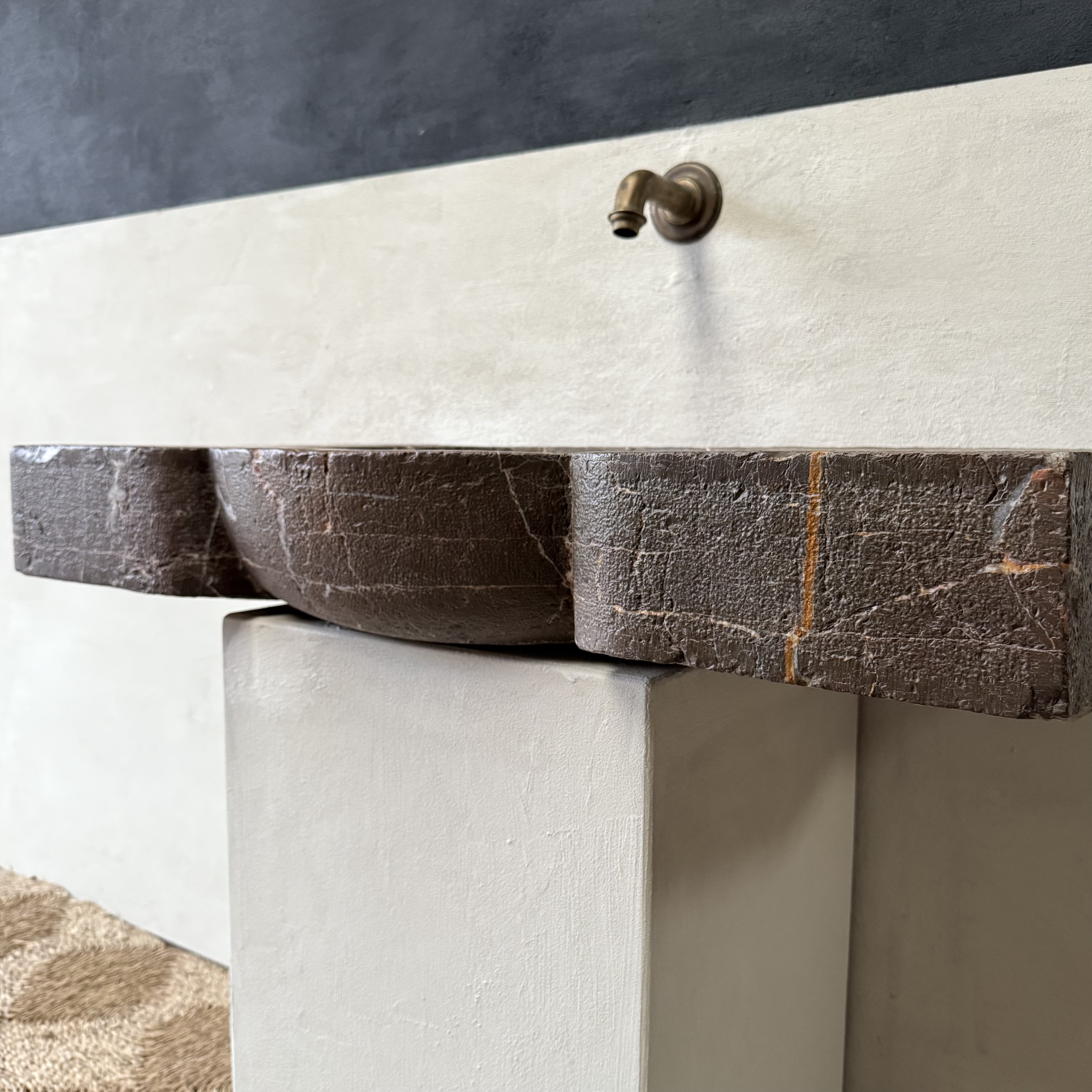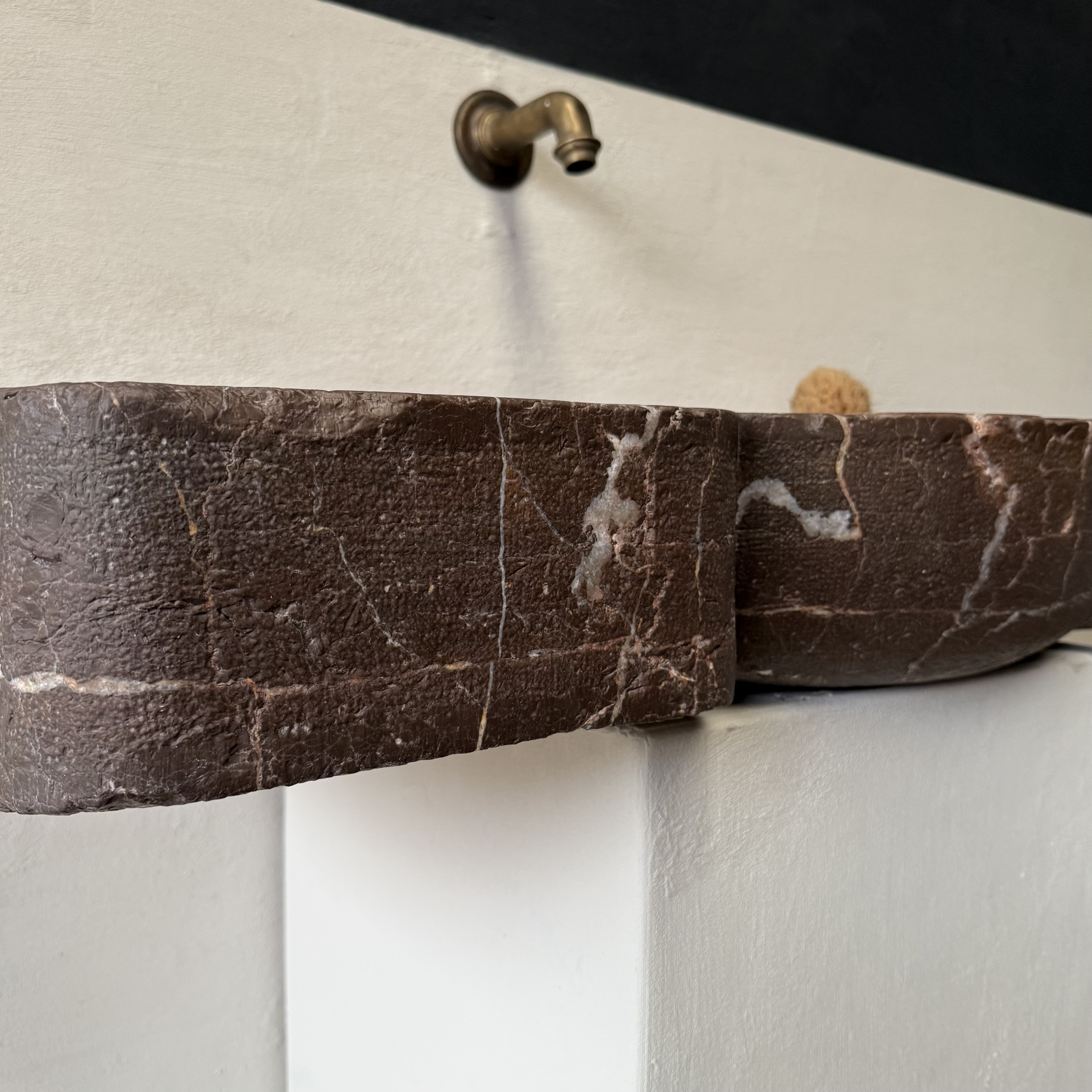 The back edge remains roughly worked, as the sink was originally built into a wall. Structurally excellent and fully usable, with no cracks or breaks. The basin bottom is smoothly finished, ensuring proper water flow. Expected traces of age are present, including minor edge wear and small chips, but overall the condition is outstanding for a piece of this period.