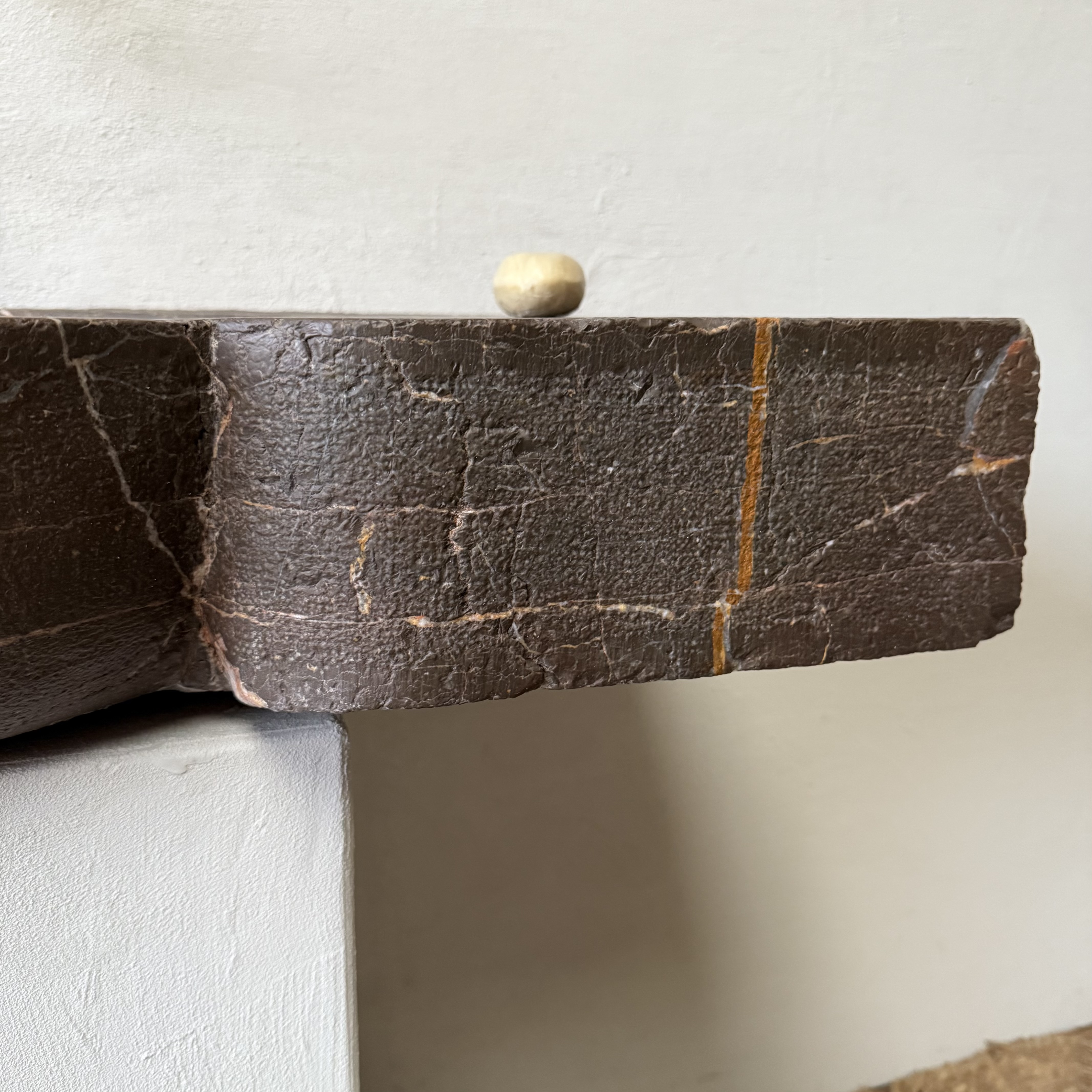 A beautifully veined French marble sink dating to the late 1600s / early 1700s. Rectangular in form, it features a recessed bowed front with an elegantly carved oval basin, flanked by two integrated drain boards. Hewn from a warm brown Pyrenean marble richly patterned with intricate white and orange veining, the piece displays a refined chiseled and lightly hammered surface finish.
