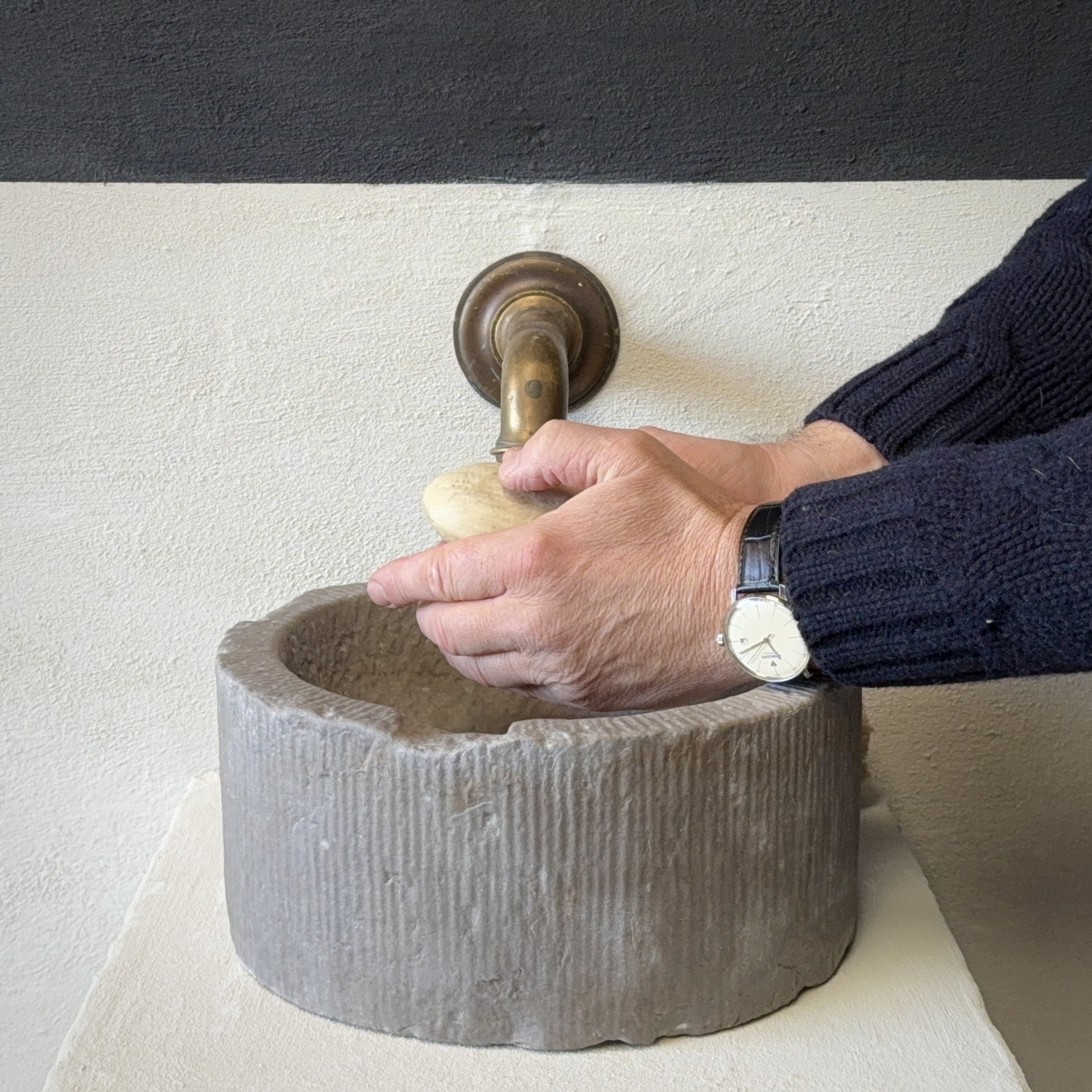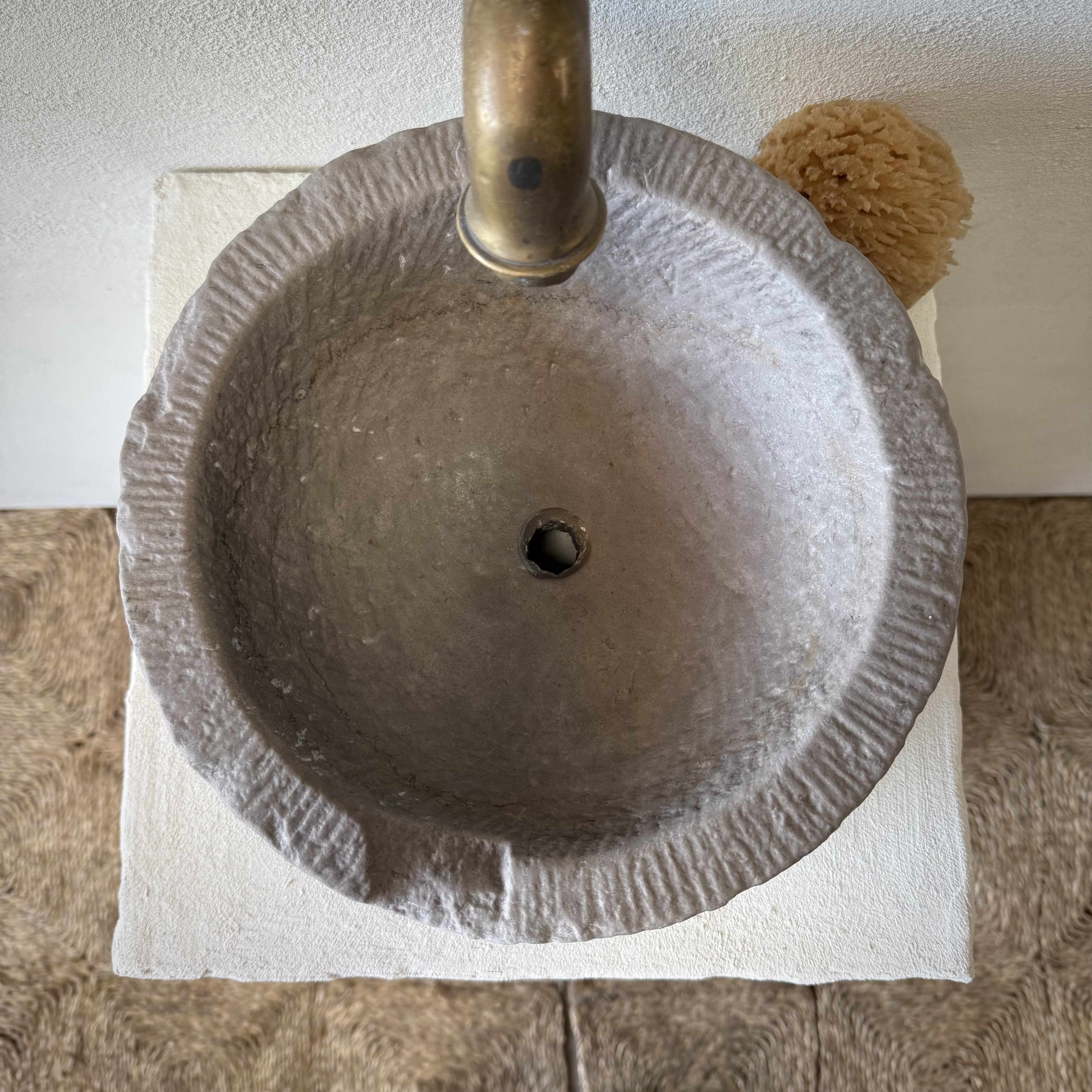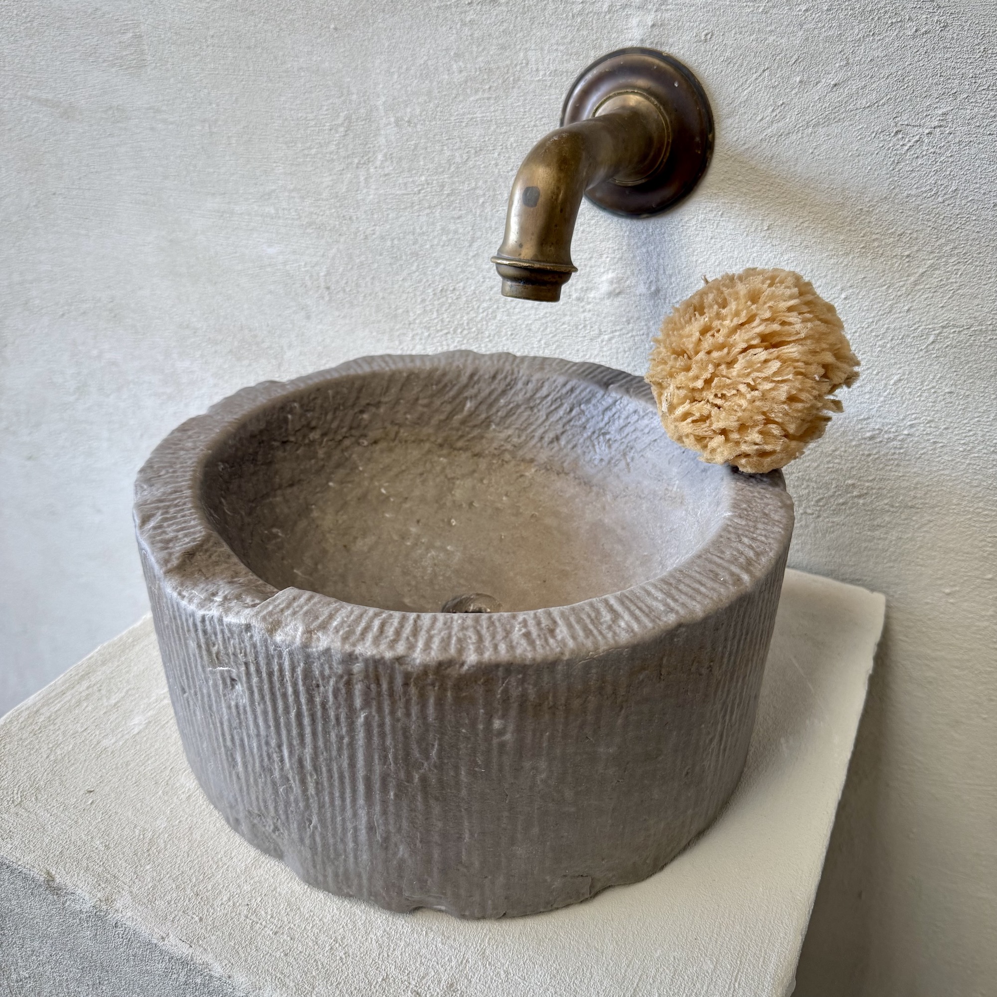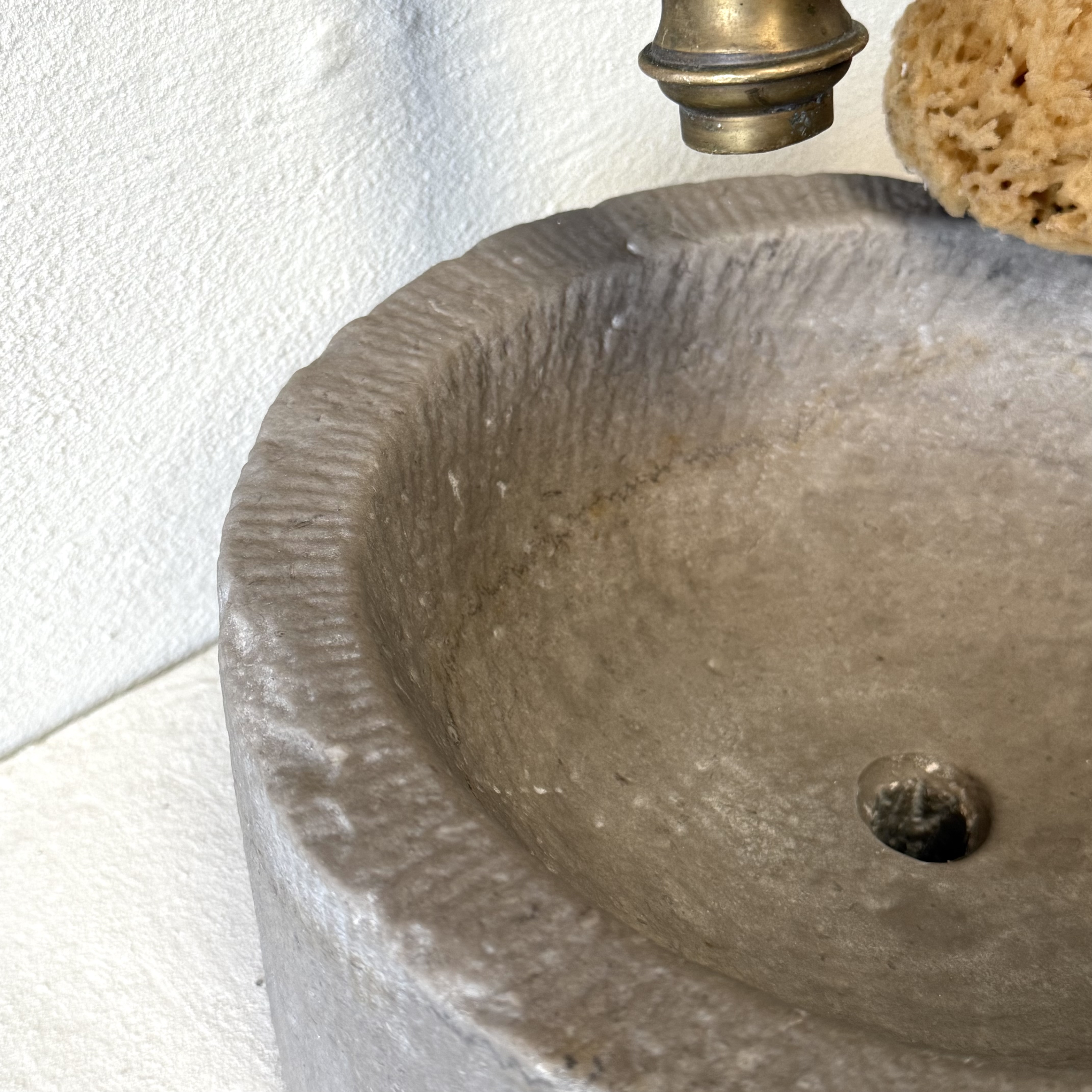 The stone displays an attractive, well-aged patina with surface wear consistent with its age and long functional history. There is a small loss to the upper rim, as shown in the photographs, but no cracks or structural damage. The font is sound, stable, and robust.