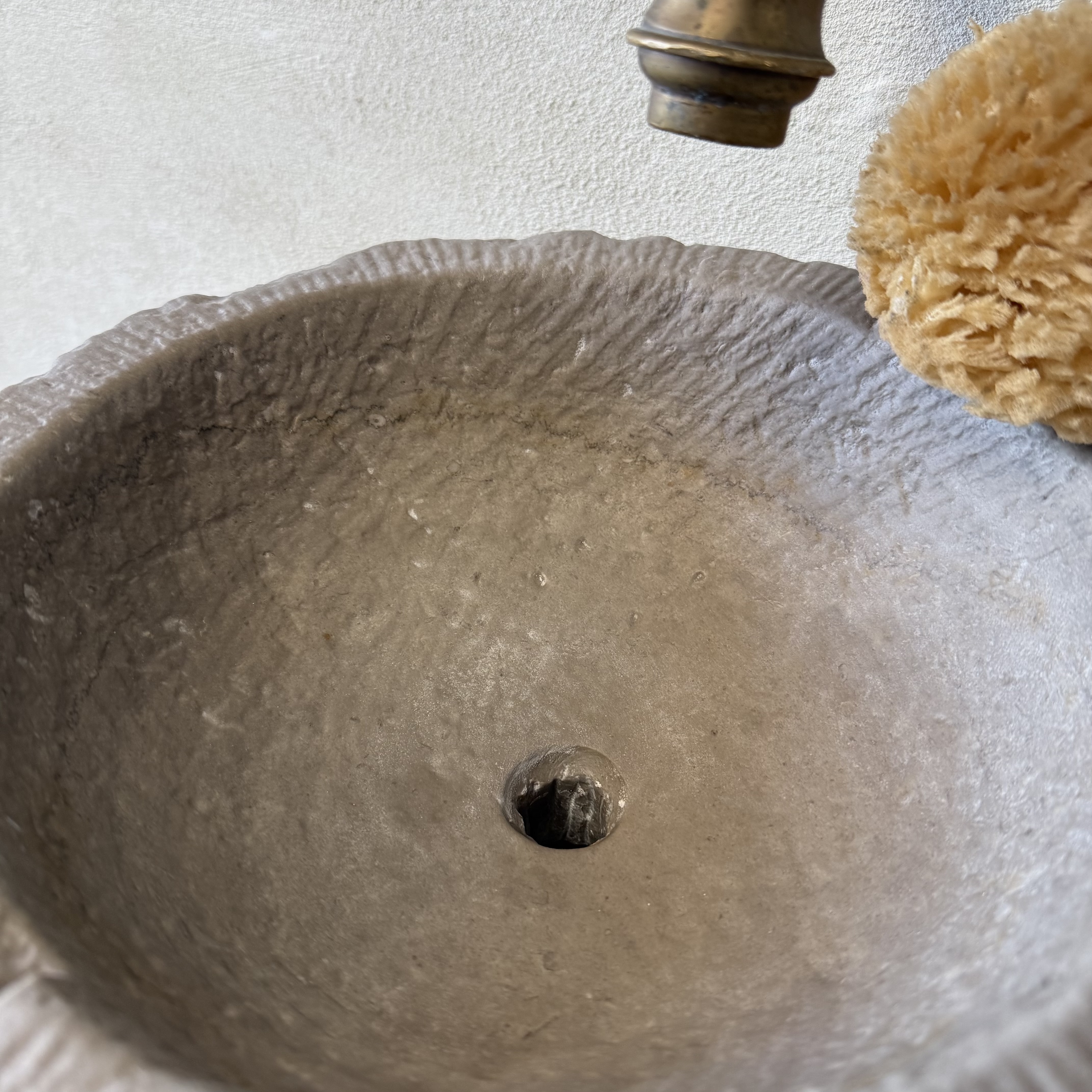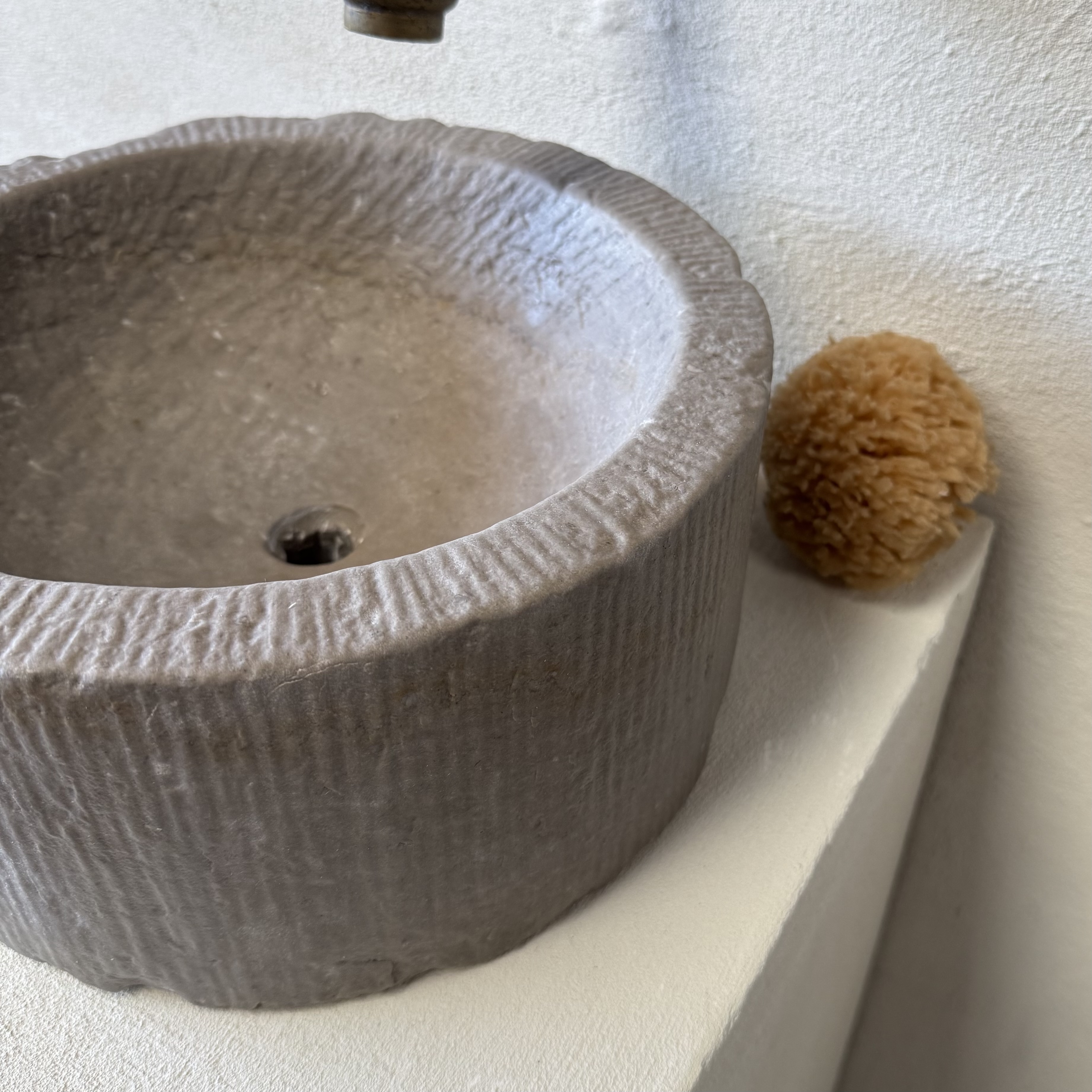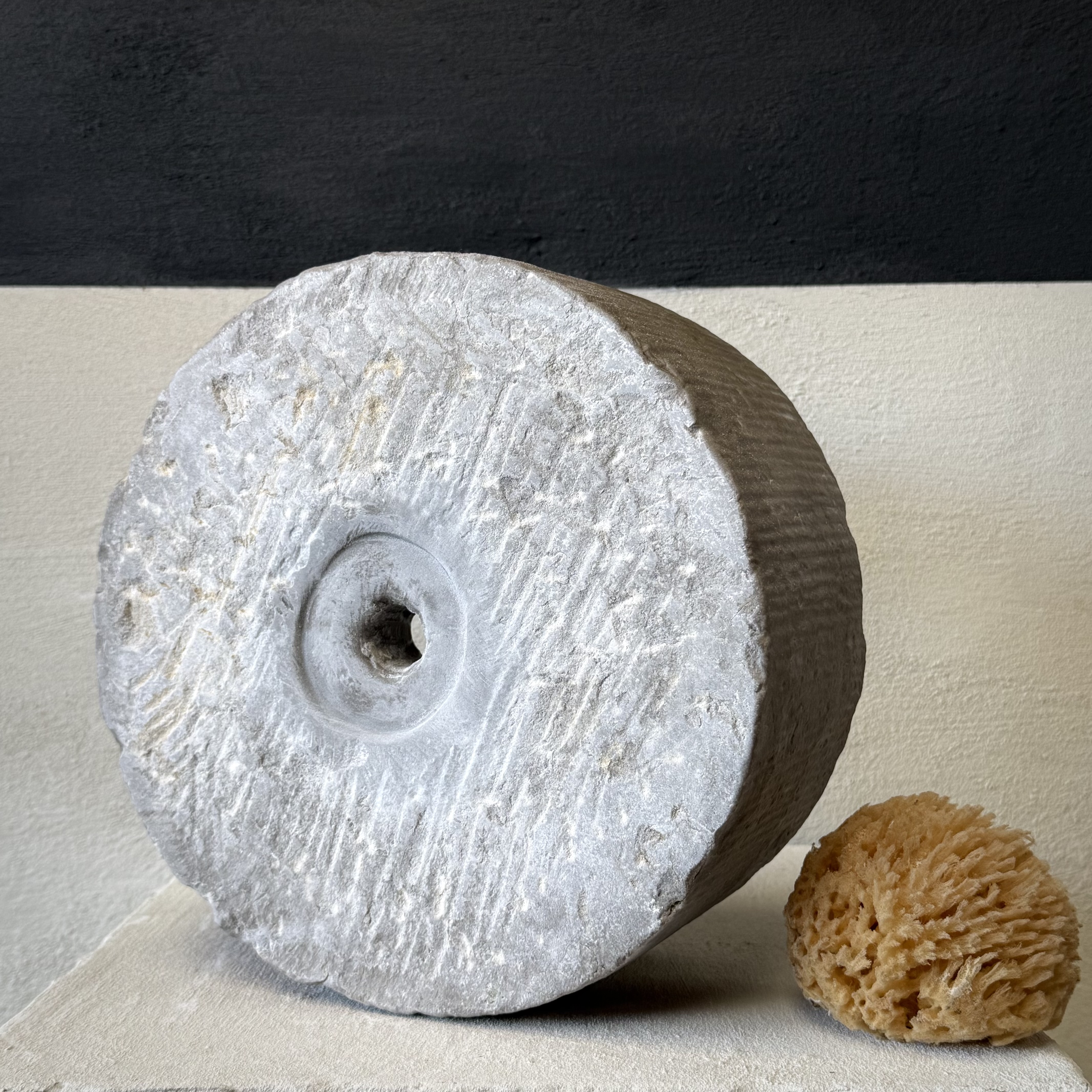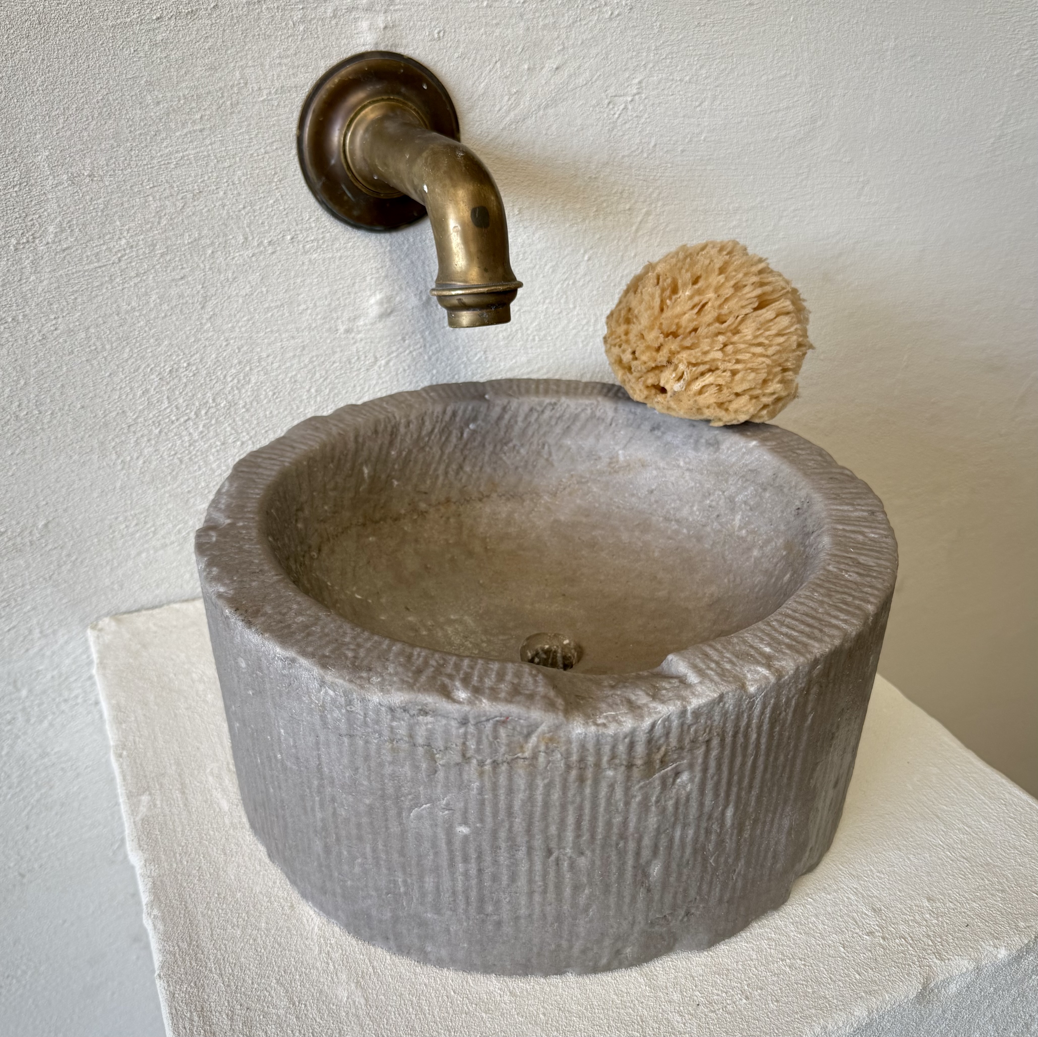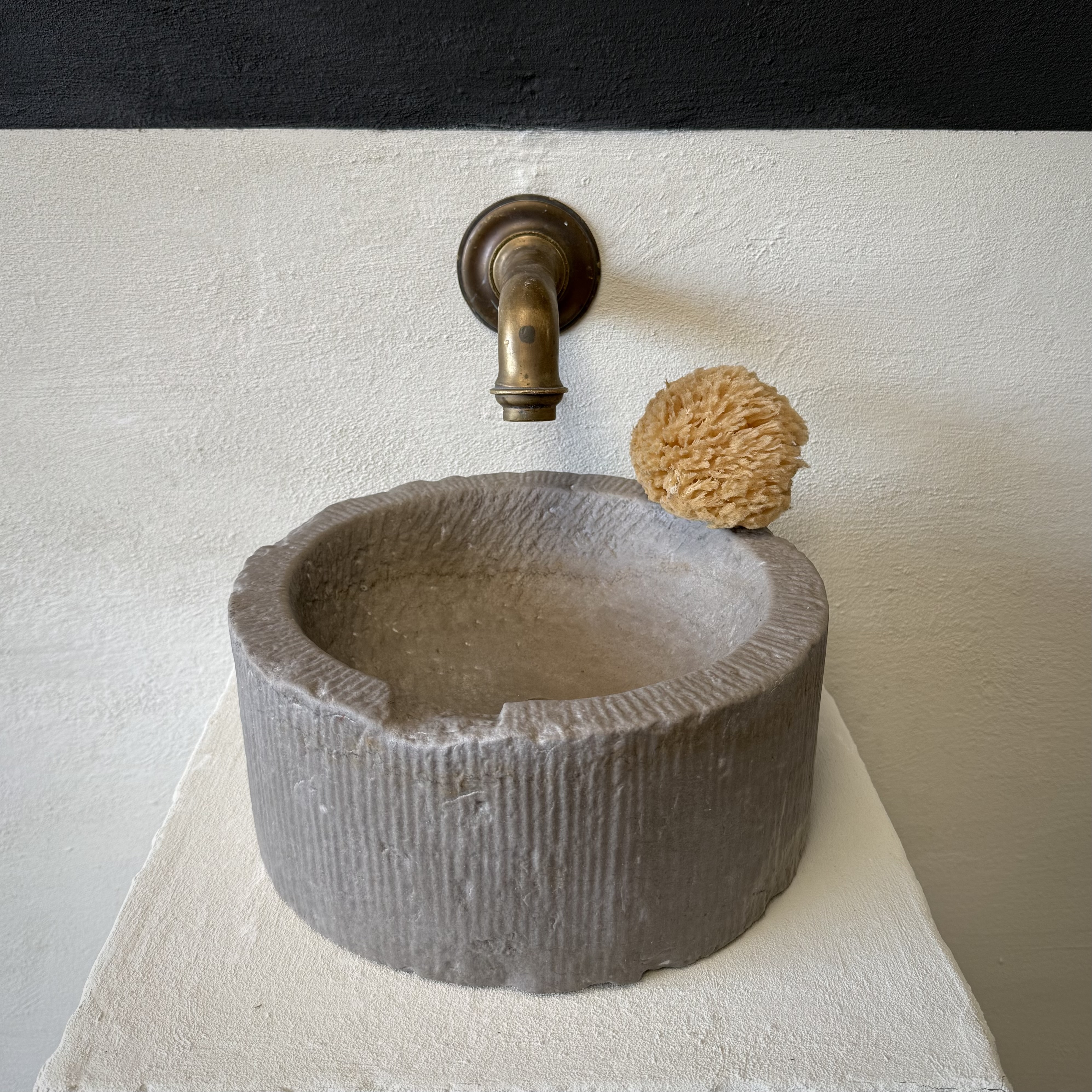 The stone displays an attractive, well-aged patina with surface wear consistent with its age and long functional history. There is a small loss to the upper rim, as shown in the photographs, but no cracks or structural damage. The font is sound, stable, and robust.
