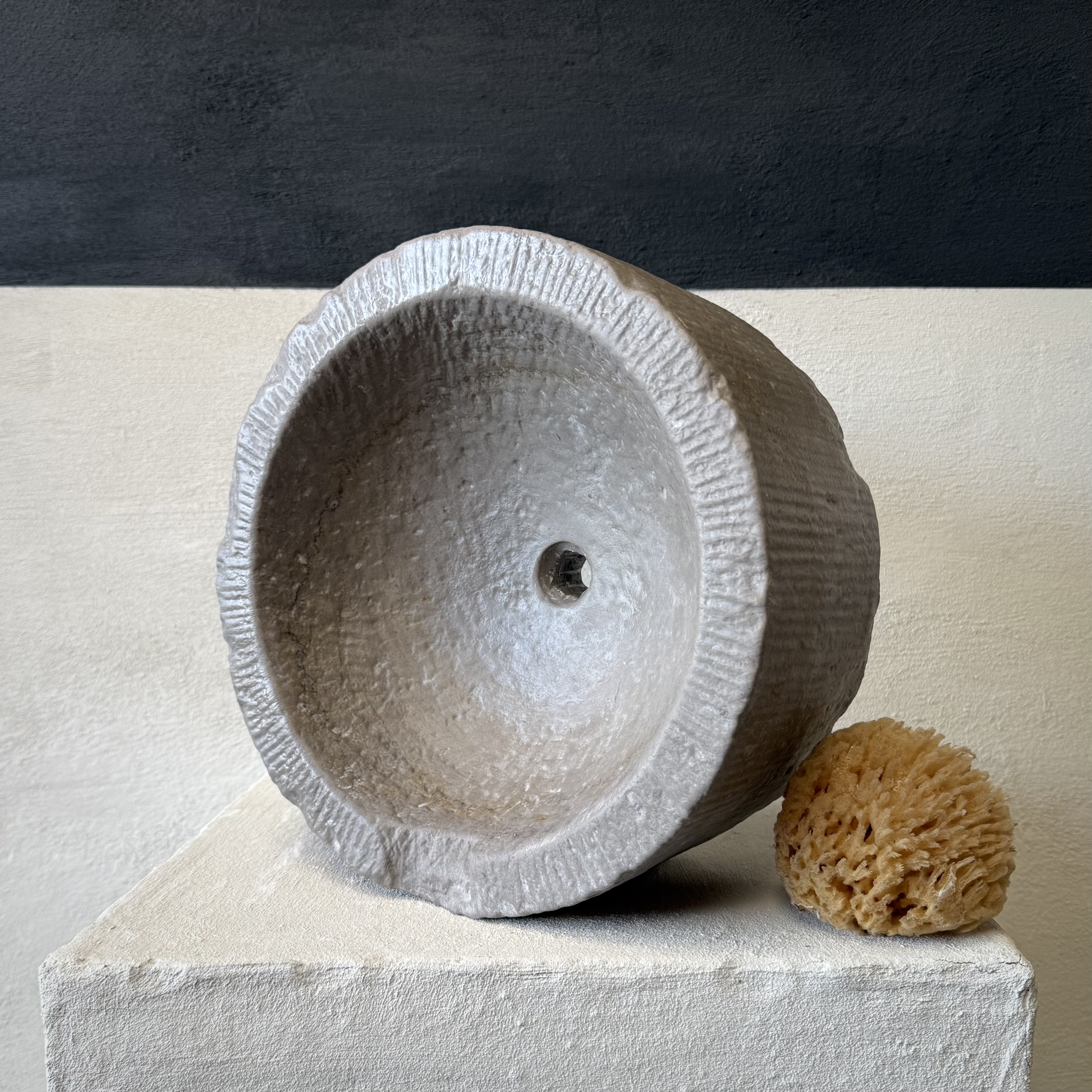 Late 18th / early 19th century Dutch stone font, of classic drum form. Carved from solid stone and finished with a finely chiseled surface throughout, retaining clear tool marks that give the piece a strong sense of texture and hand craftsmanship. The interior basin is smoothly worn from use, contrasting subtly with the more vertical chisel work to the exterior.