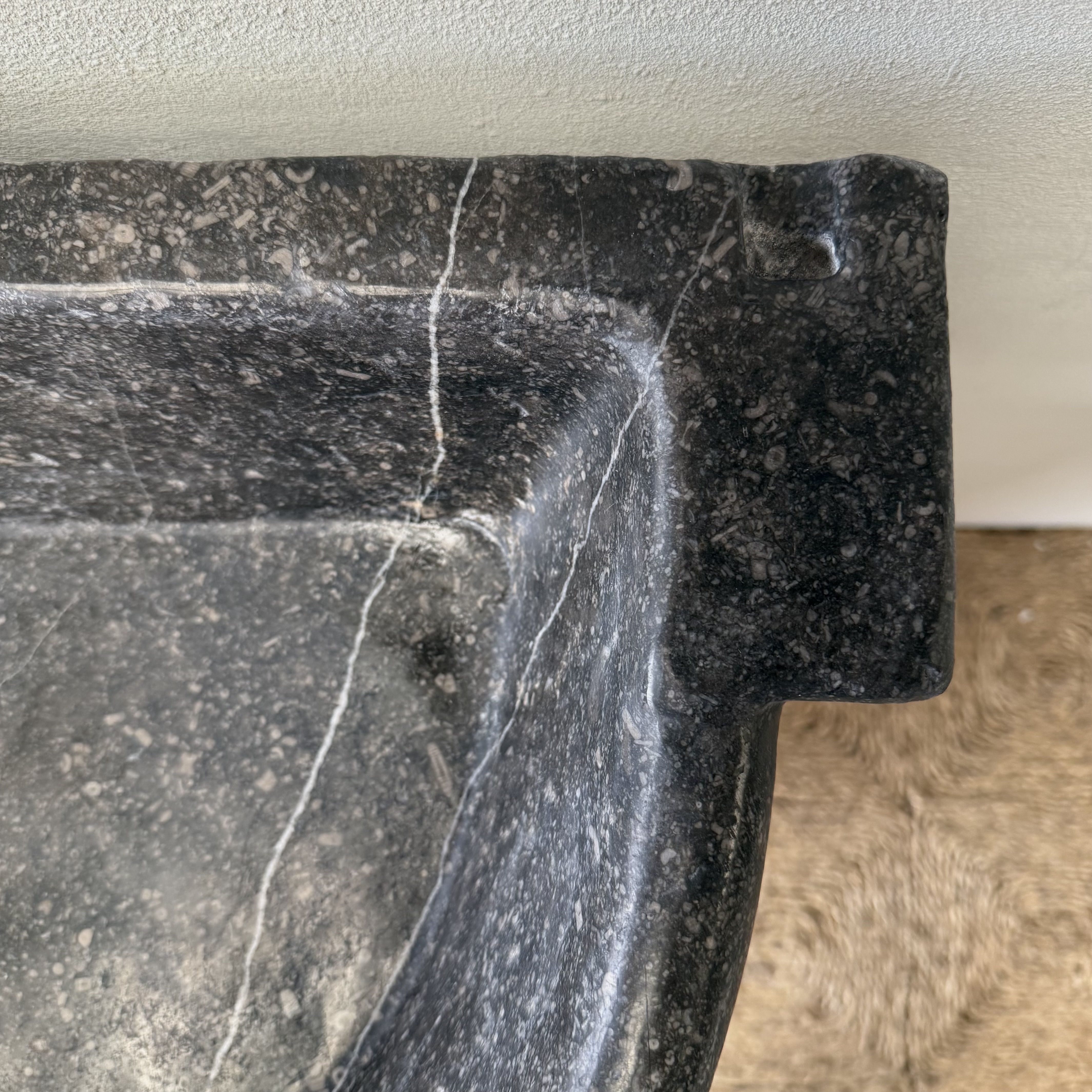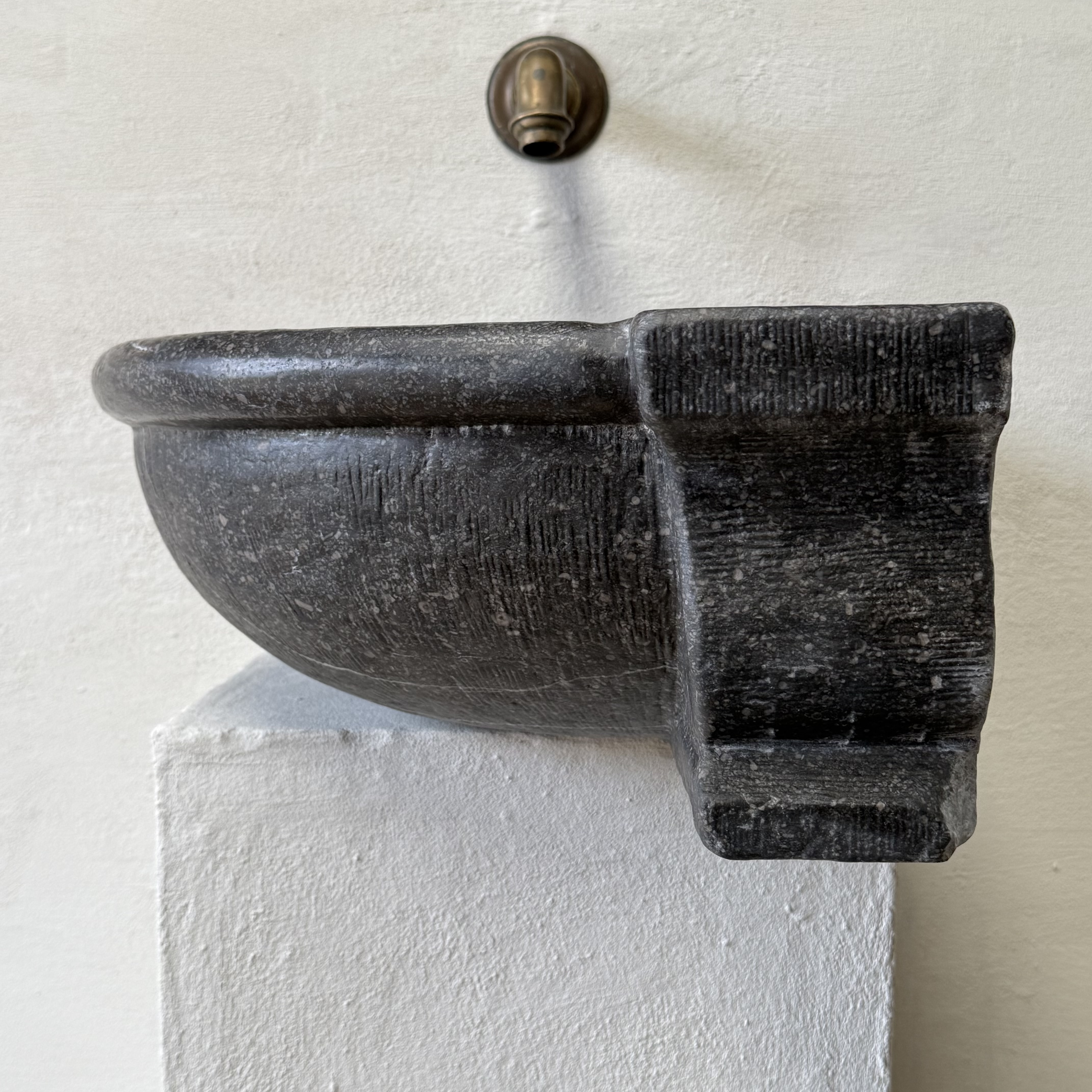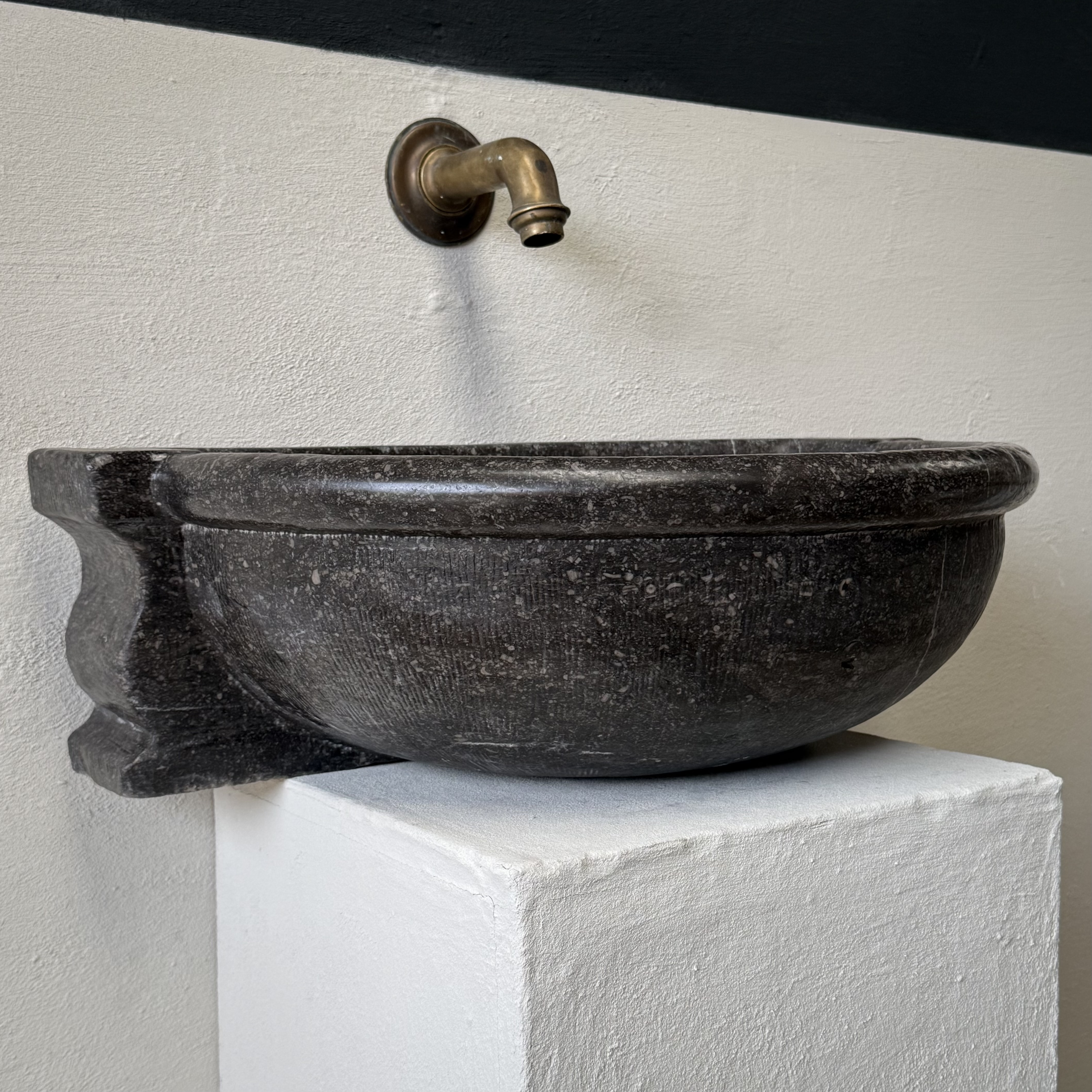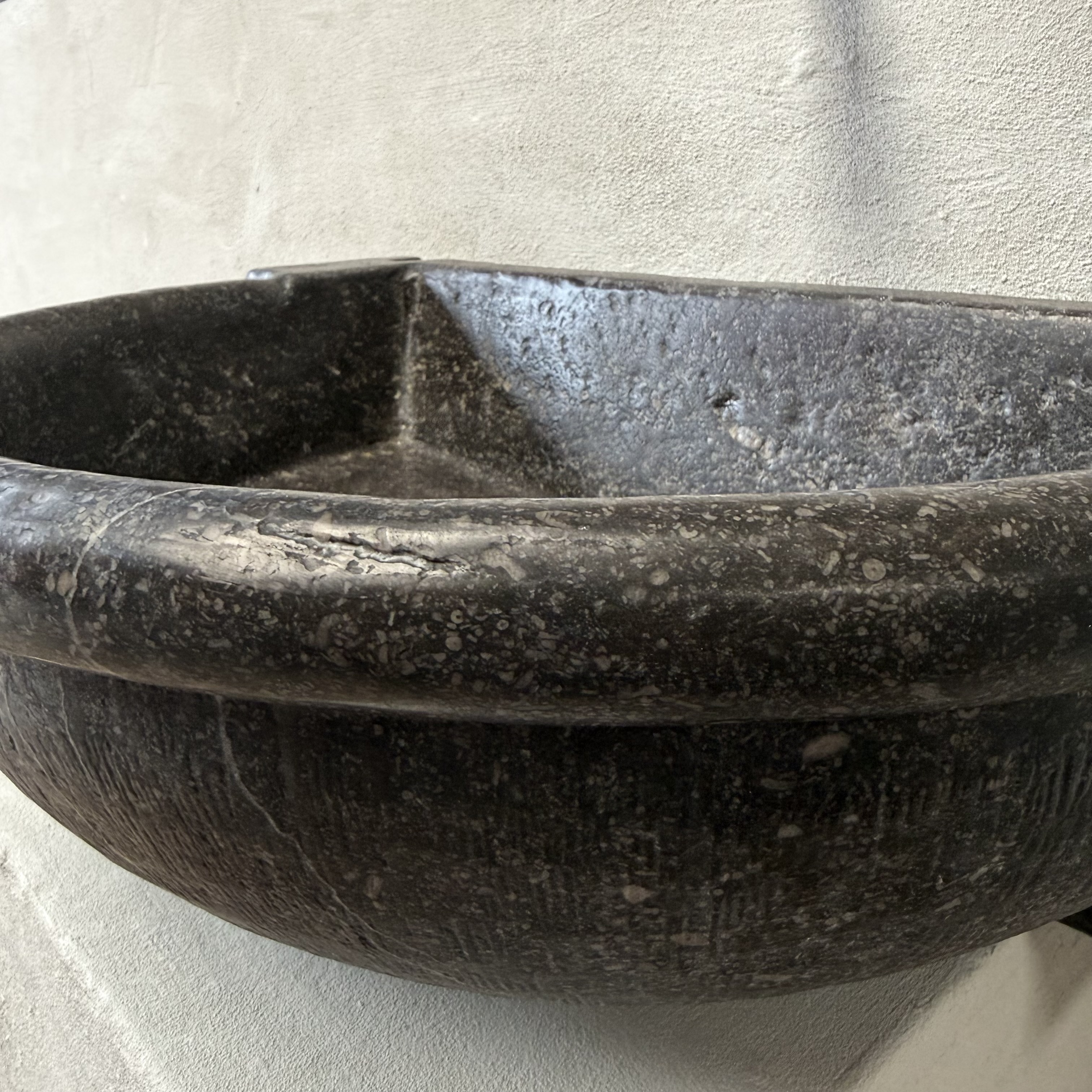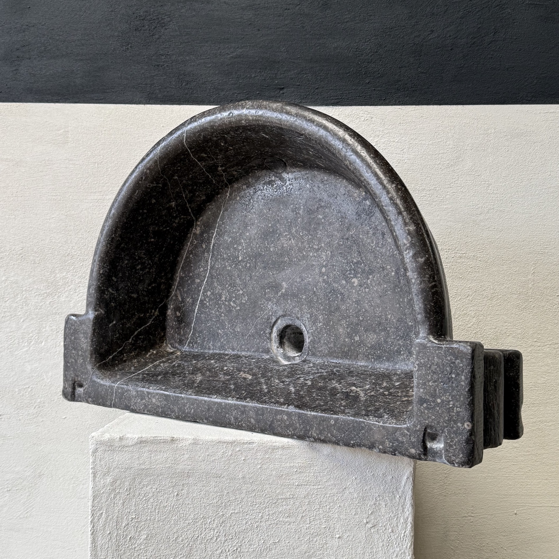 An 18th-century Belgian semi-circular stone sink, expertly carved from petit granit limestone. The sink features a generously proportioned bowl-shaped body, flanked on either side by elegant scroll-shaped “ears,” a distinctive and highly decorative architectural detail typical of the period.