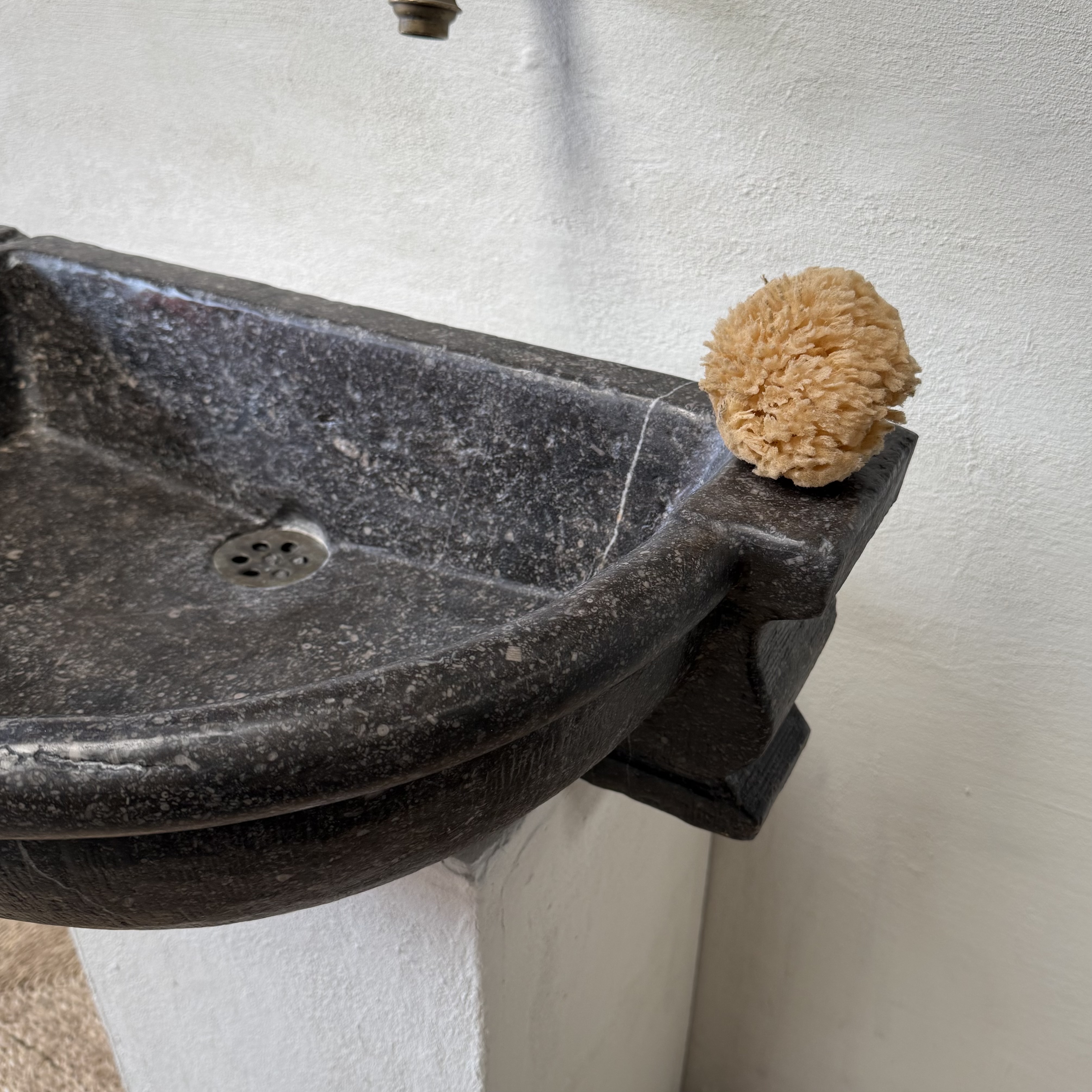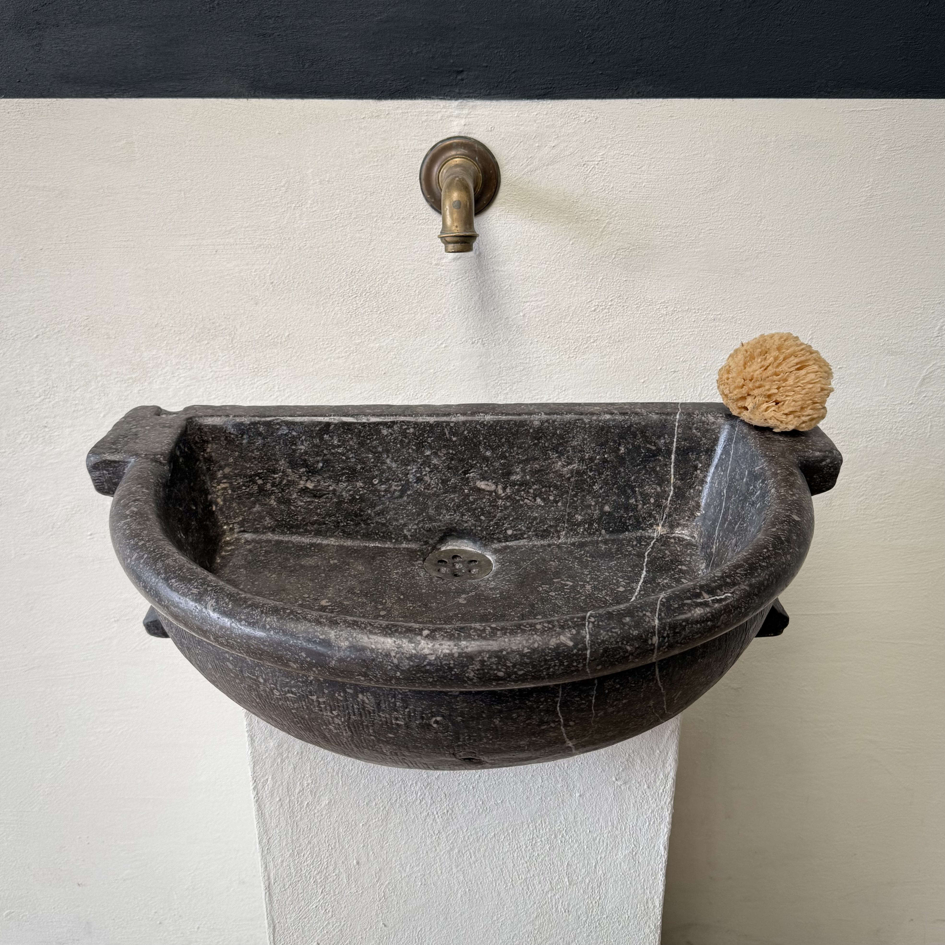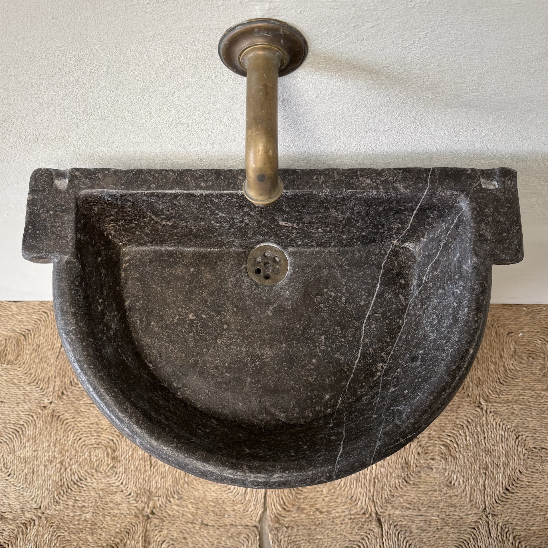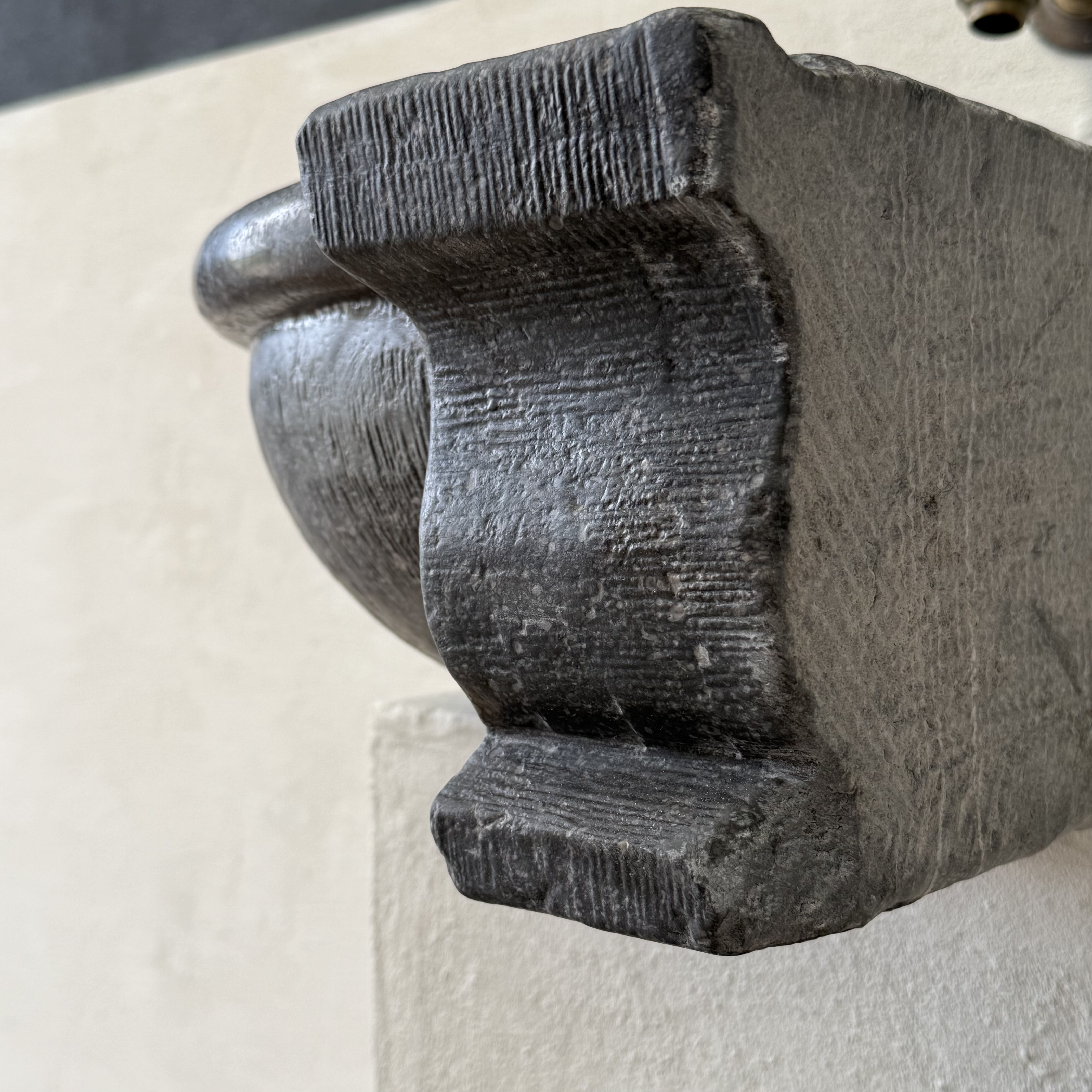 An 18th-century Belgian semi-circular stone sink, expertly carved from petit granit limestone. The sink features a generously proportioned bowl-shaped body, flanked on either side by elegant scroll-shaped “ears,” a distinctive and highly decorative architectural detail typical of the period.