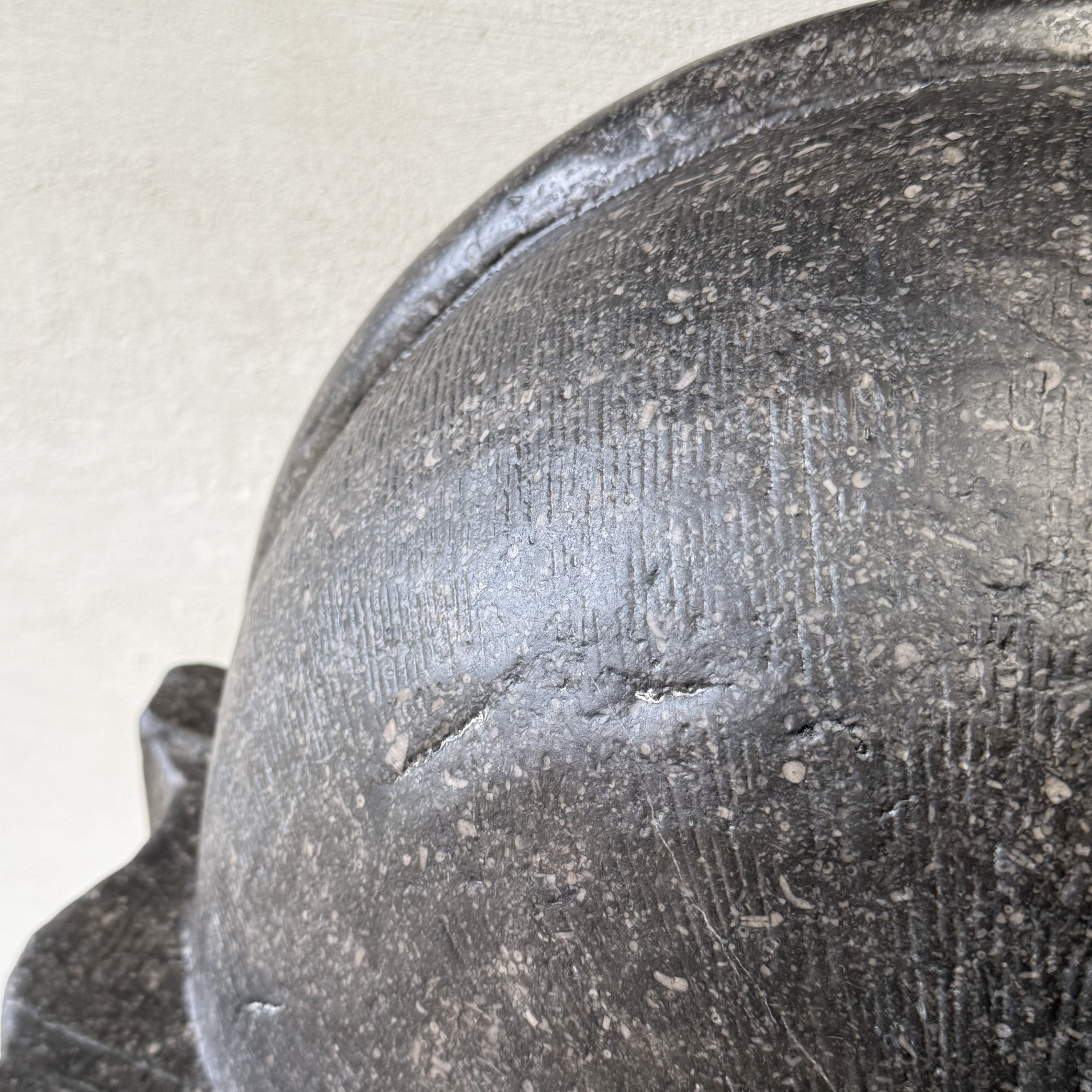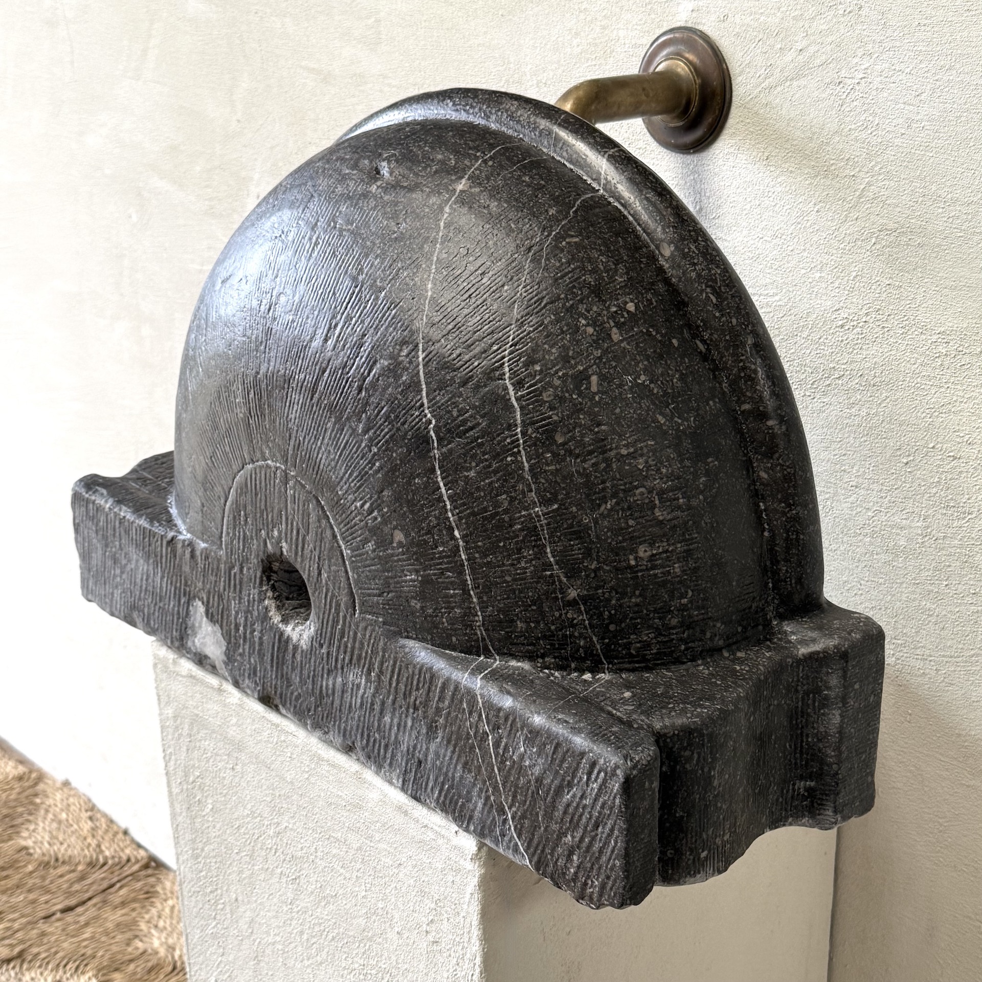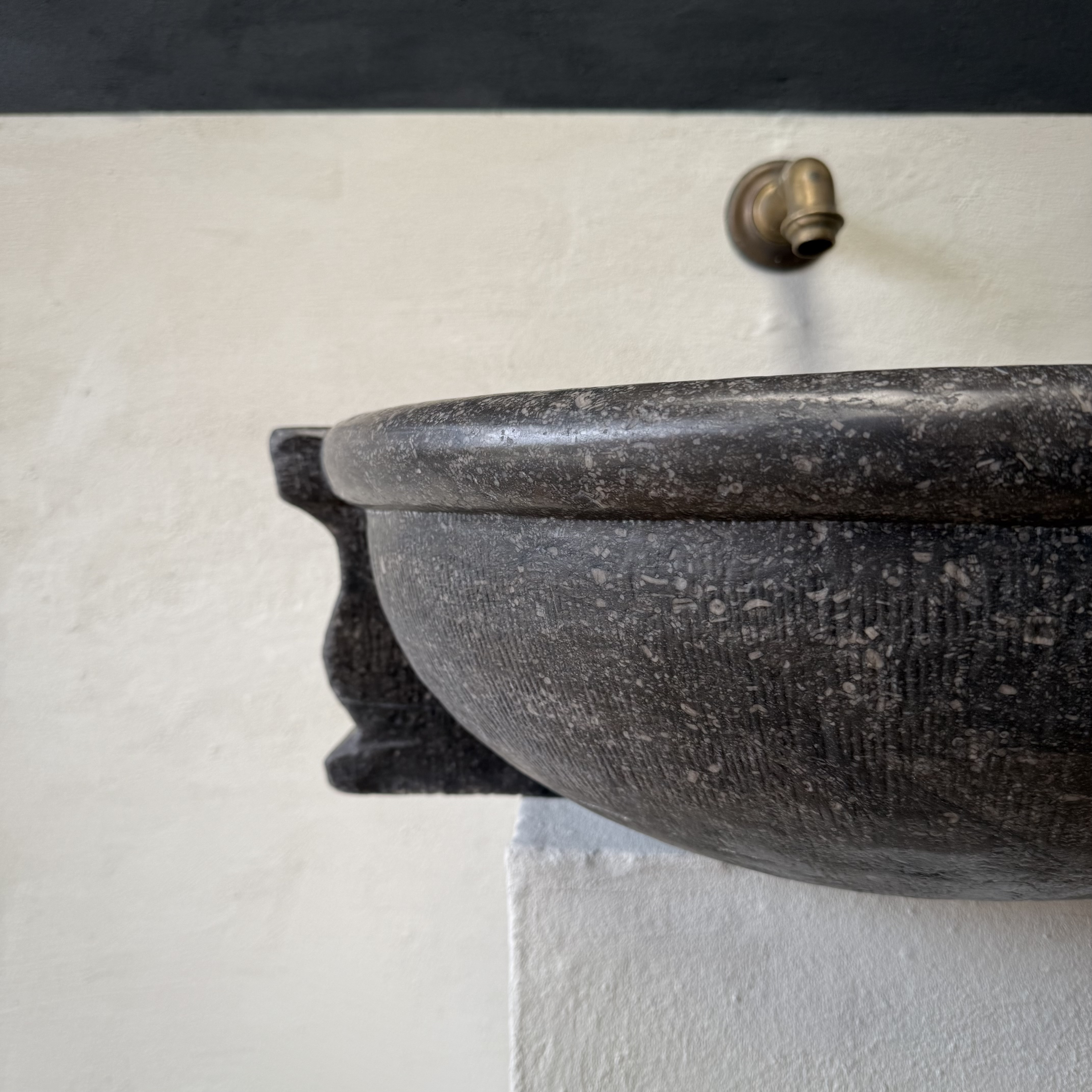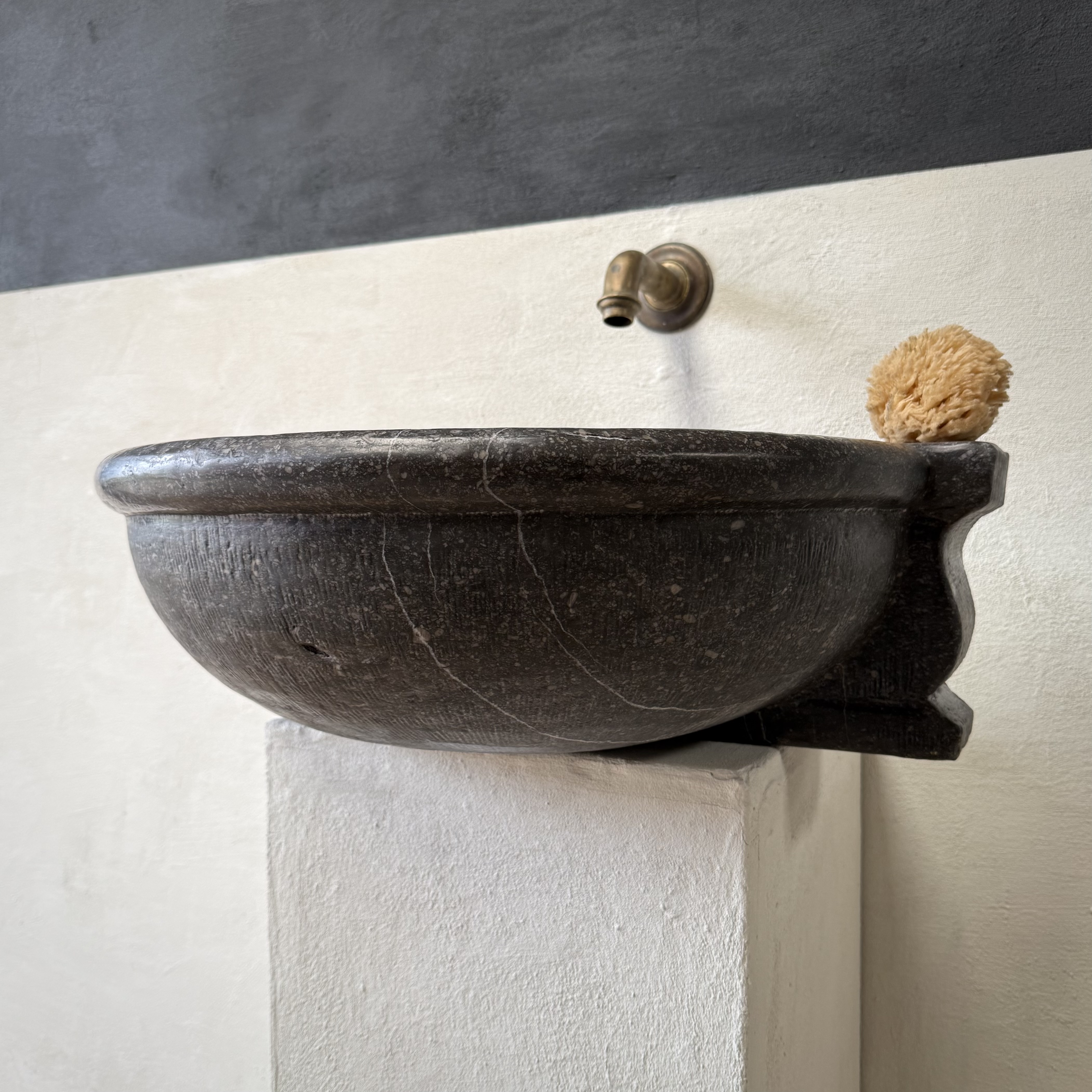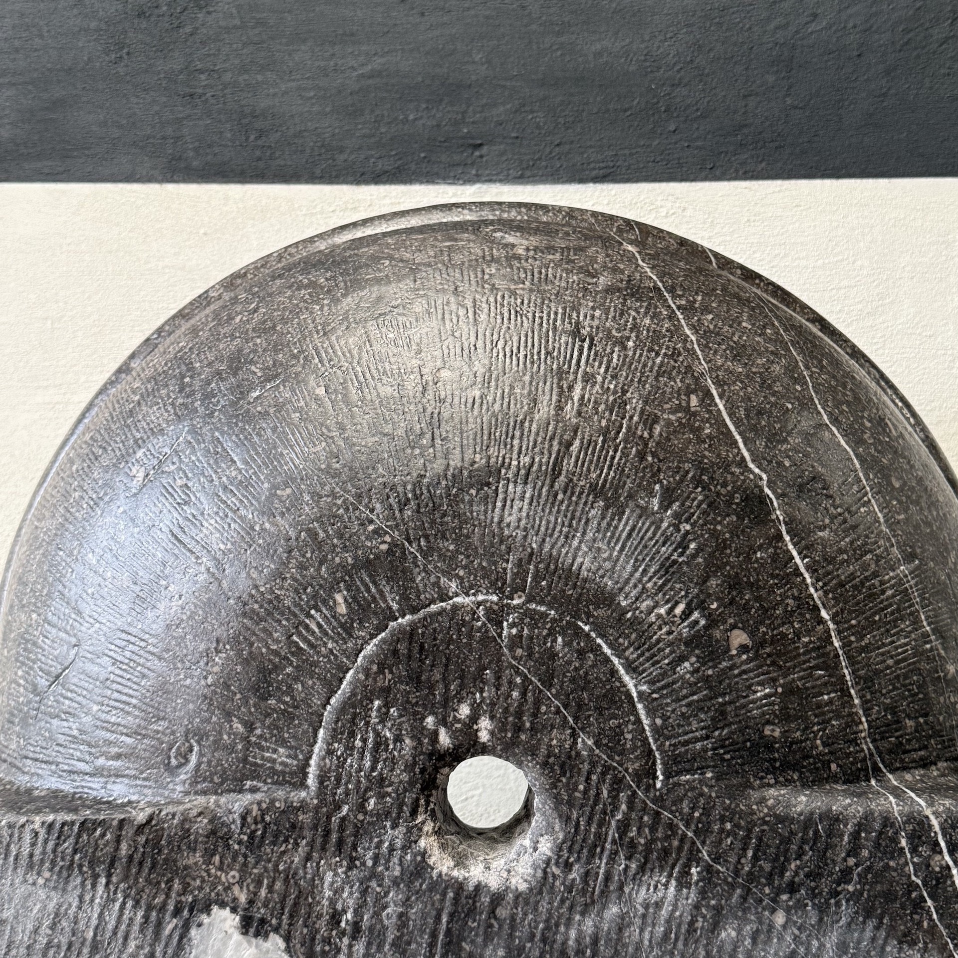 An 18th-century Belgian semi-circular stone sink, expertly carved from petit granit limestone. The sink features a generously proportioned bowl-shaped body, flanked on either side by elegant scroll-shaped “ears,” a distinctive and highly decorative architectural detail typical of the period.
