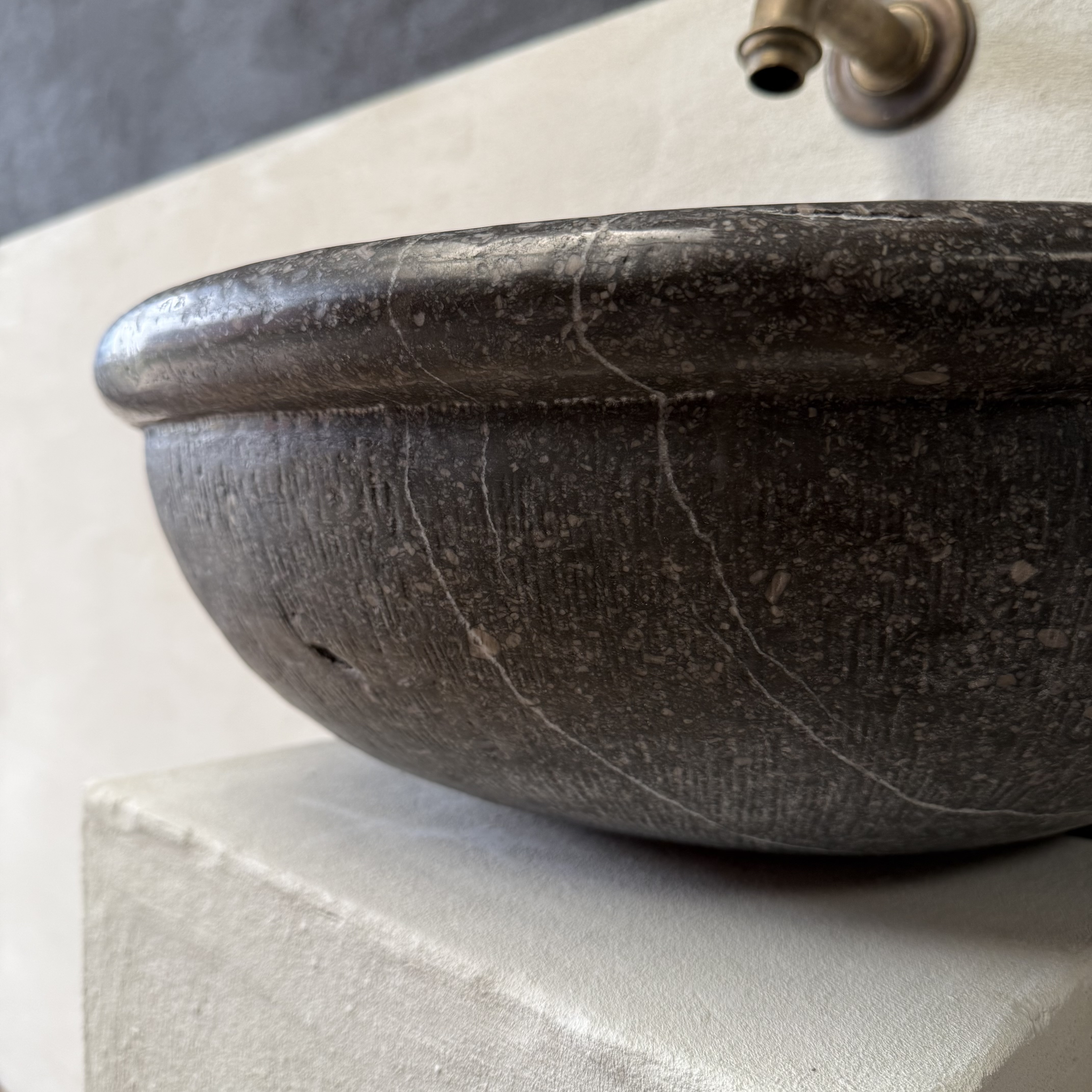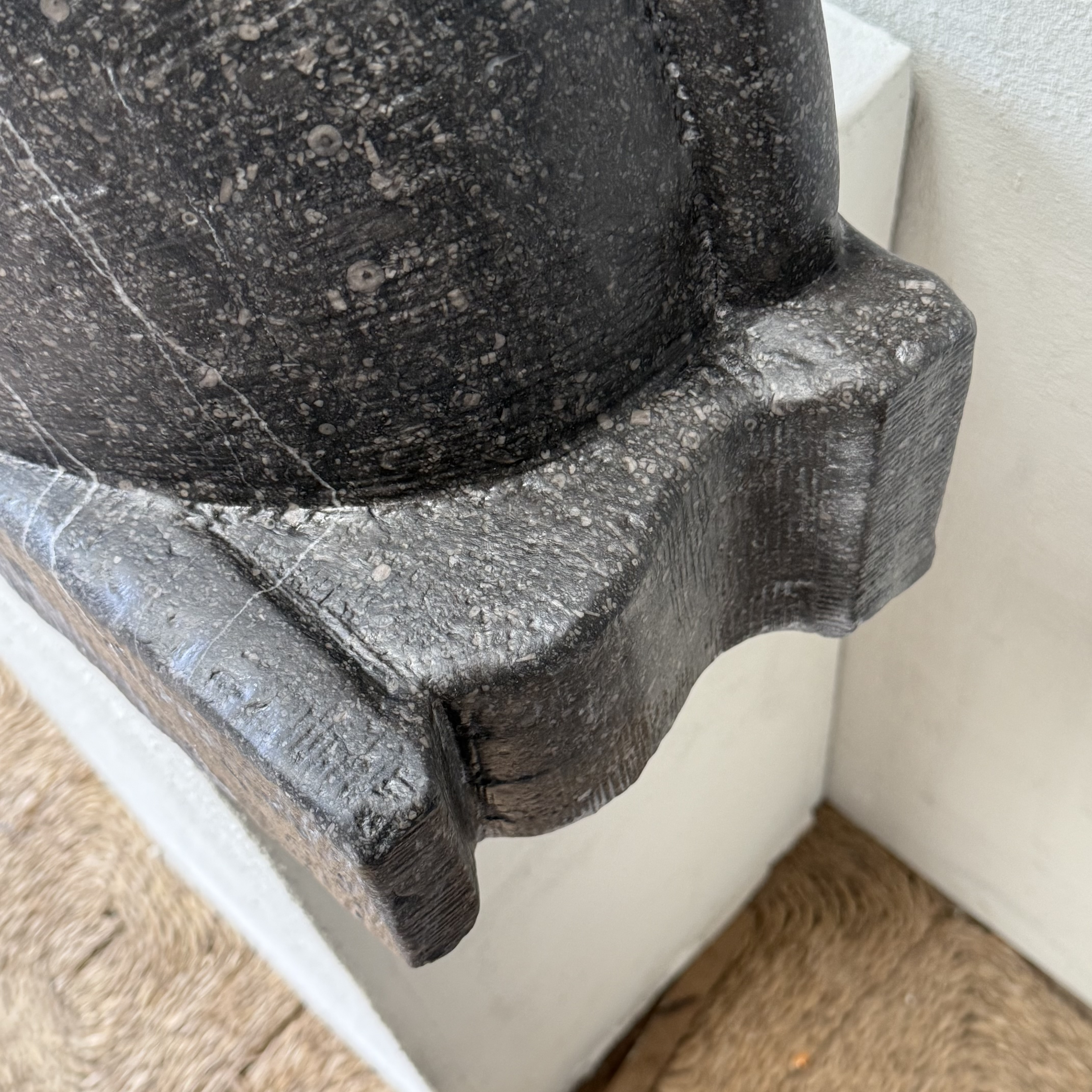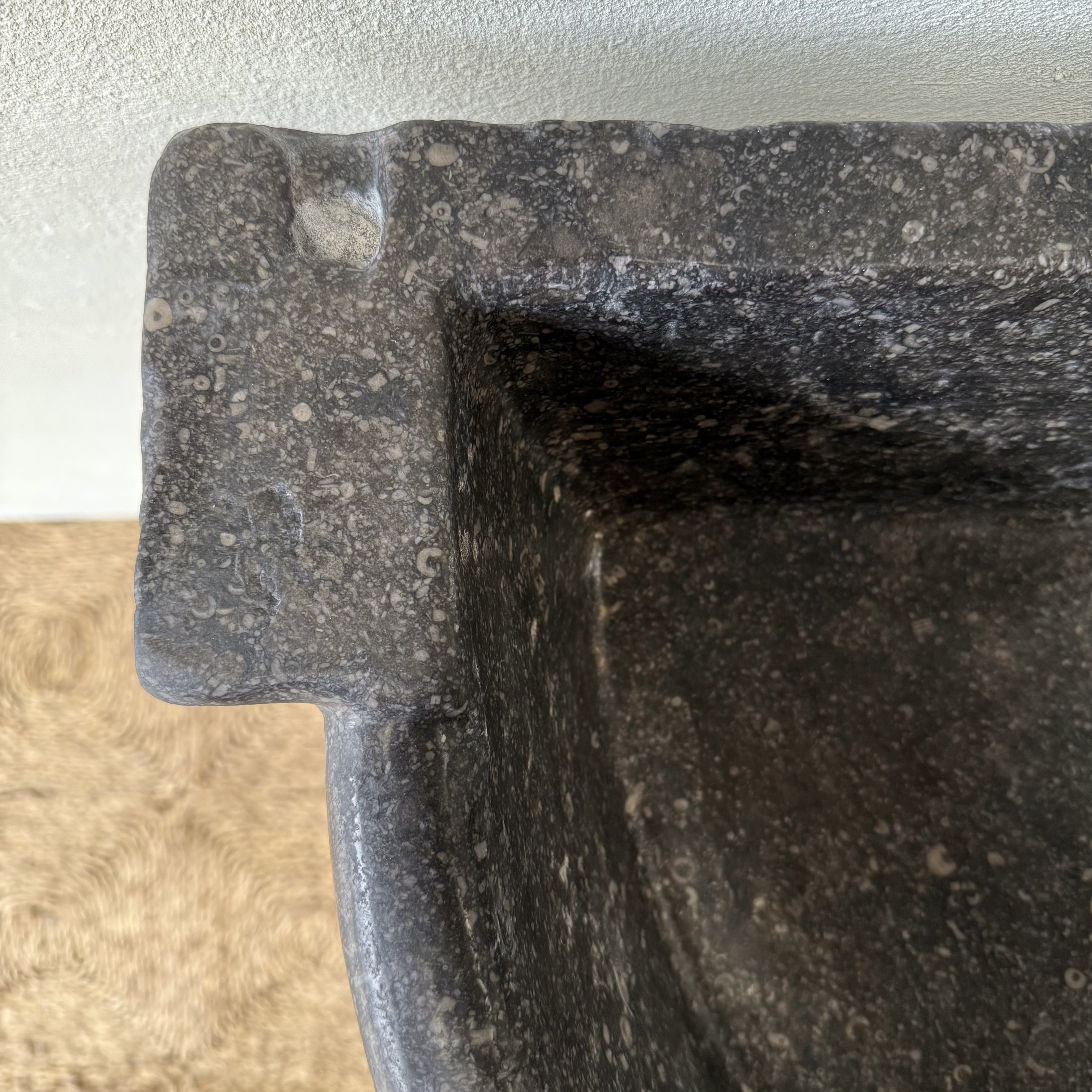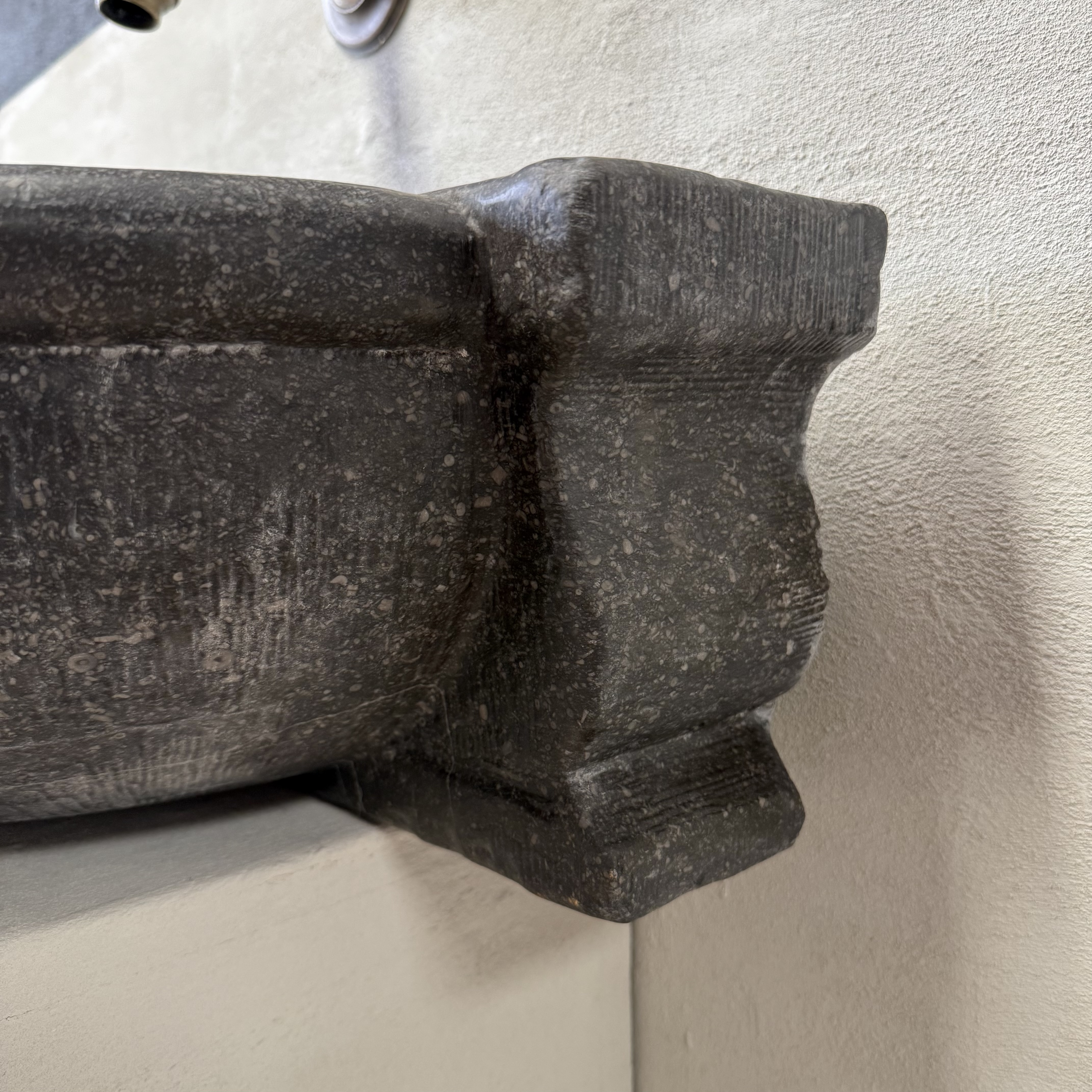 The exterior displays a finely chiseled finish, evidencing skilled hand craftsmanship, while the interior surface has been carefully smoothed to ensure efficient water drainage. The natural limestone shows a beautiful, time-softened patina, enhancing its historic character without compromising functionality.