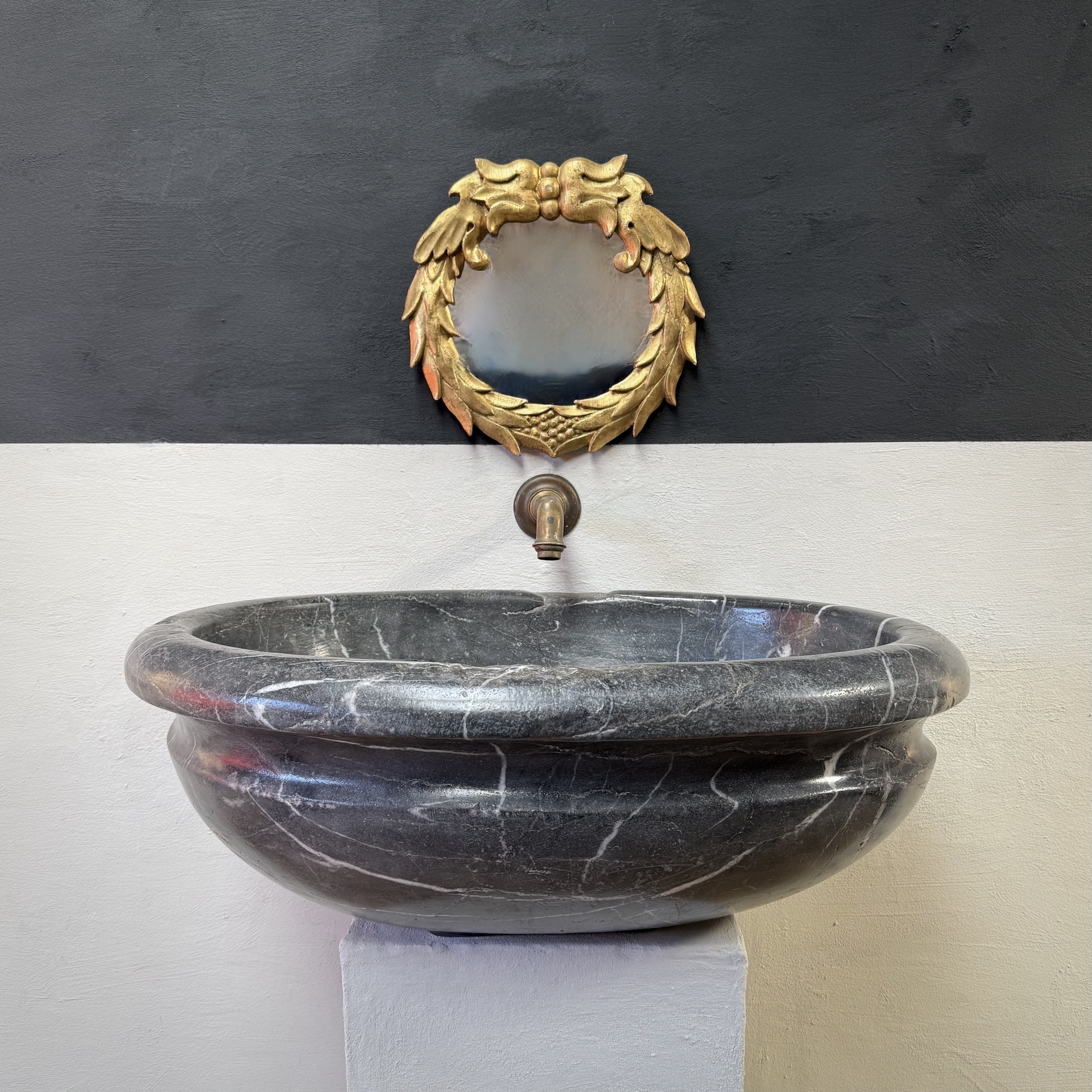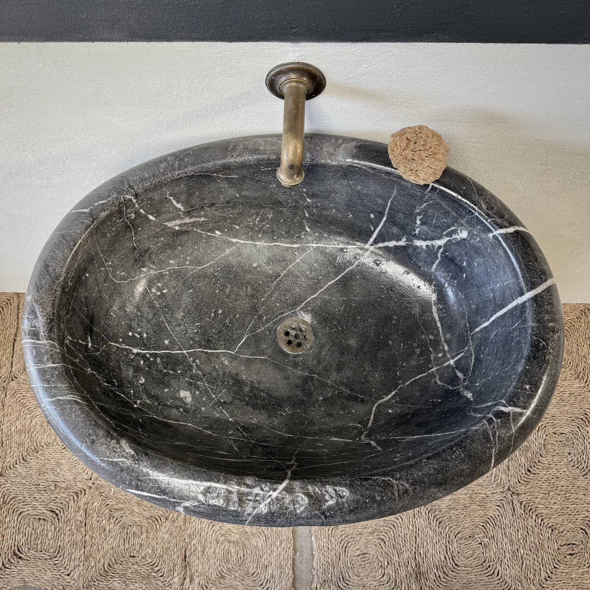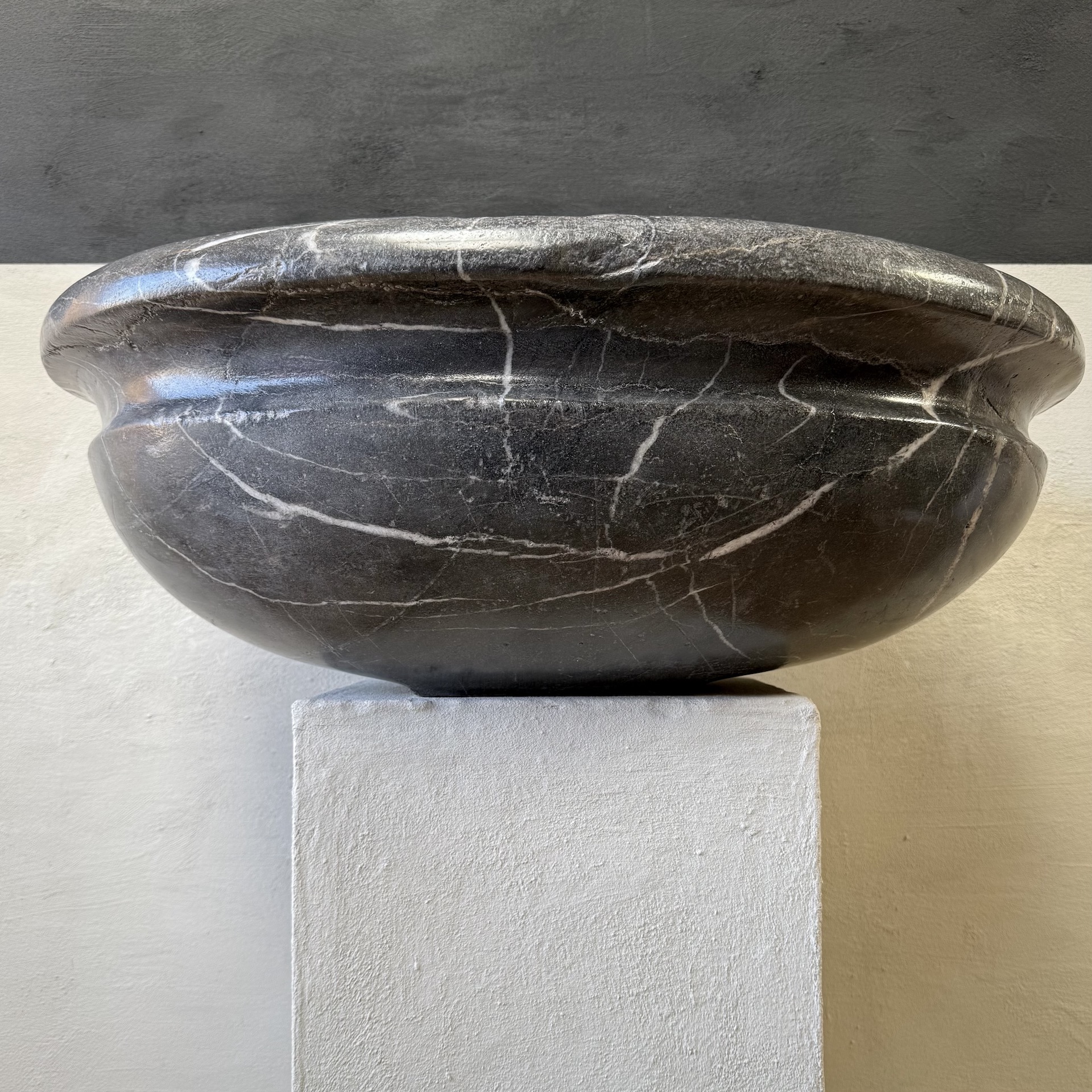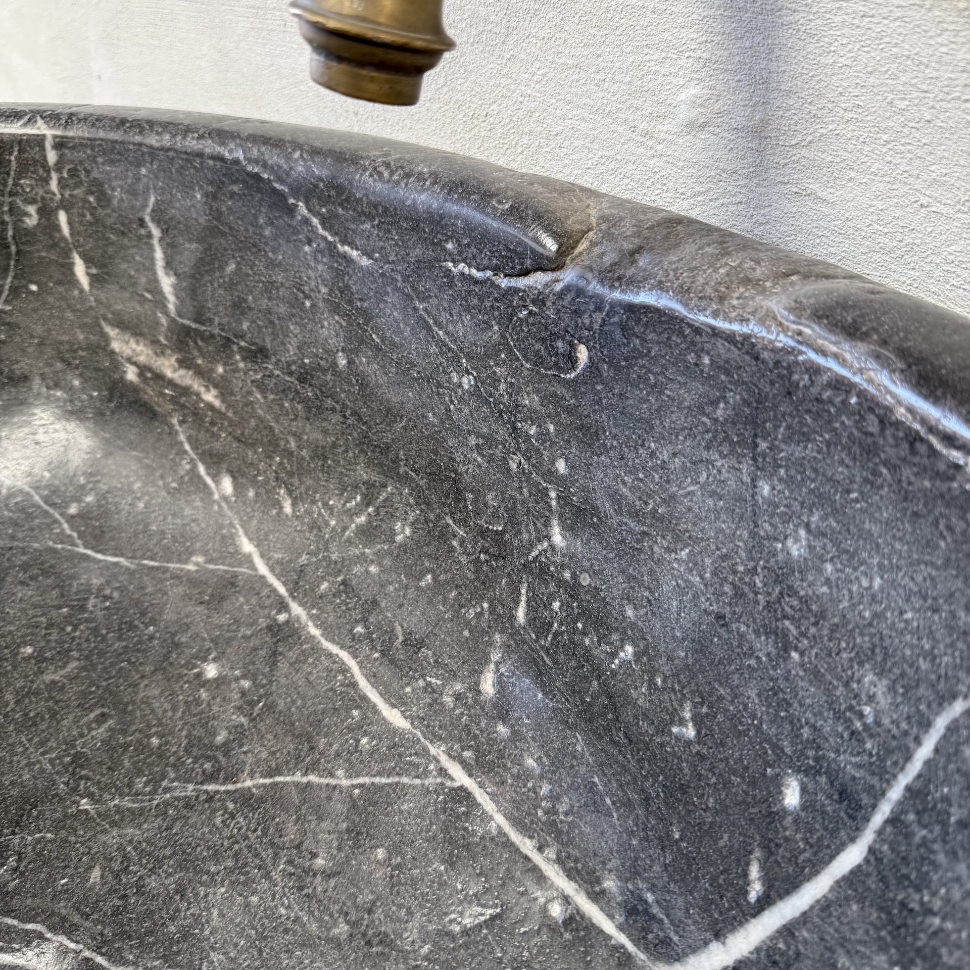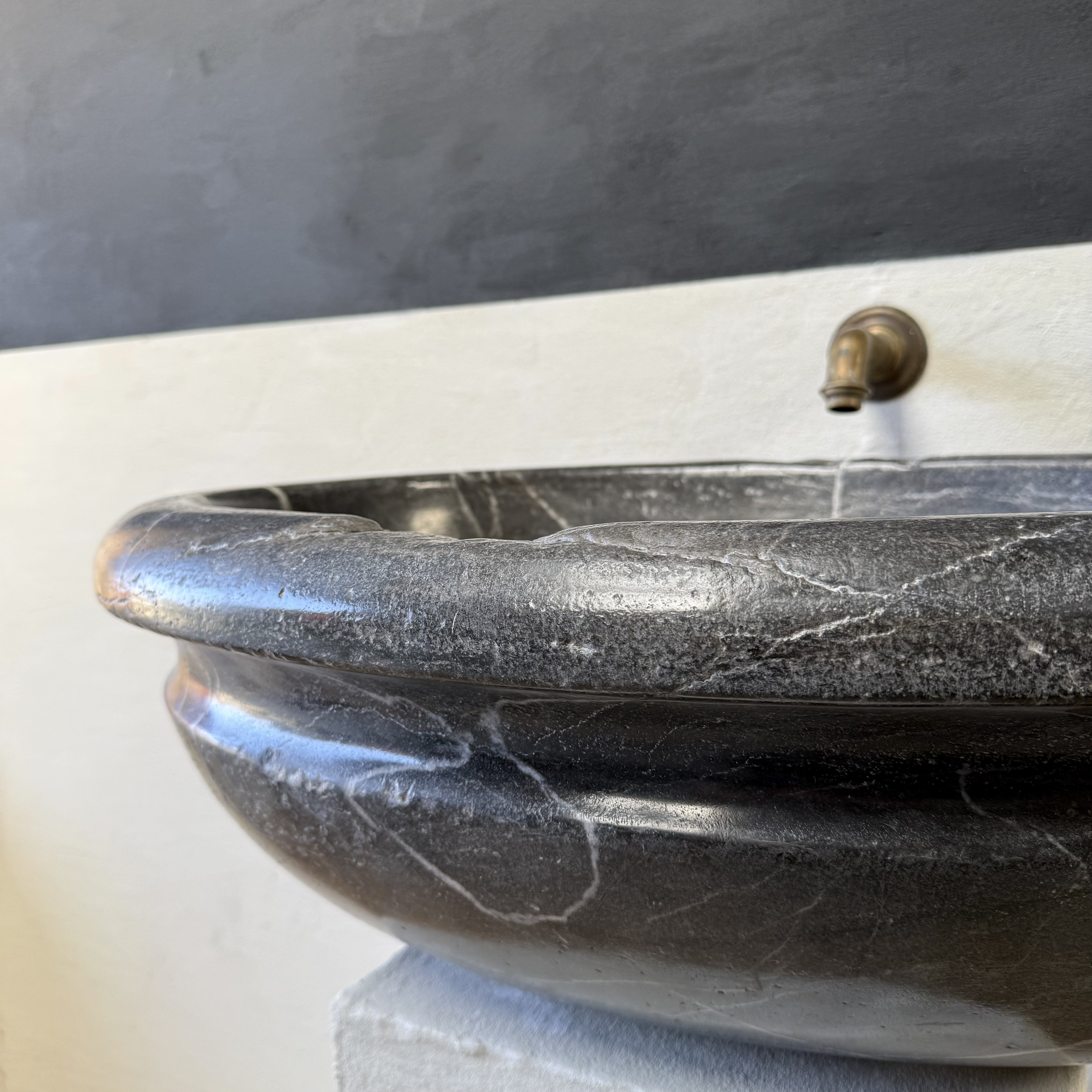 A very large, late 17th-century French oval marble sink carved from richly veined “Cihigue” marble.