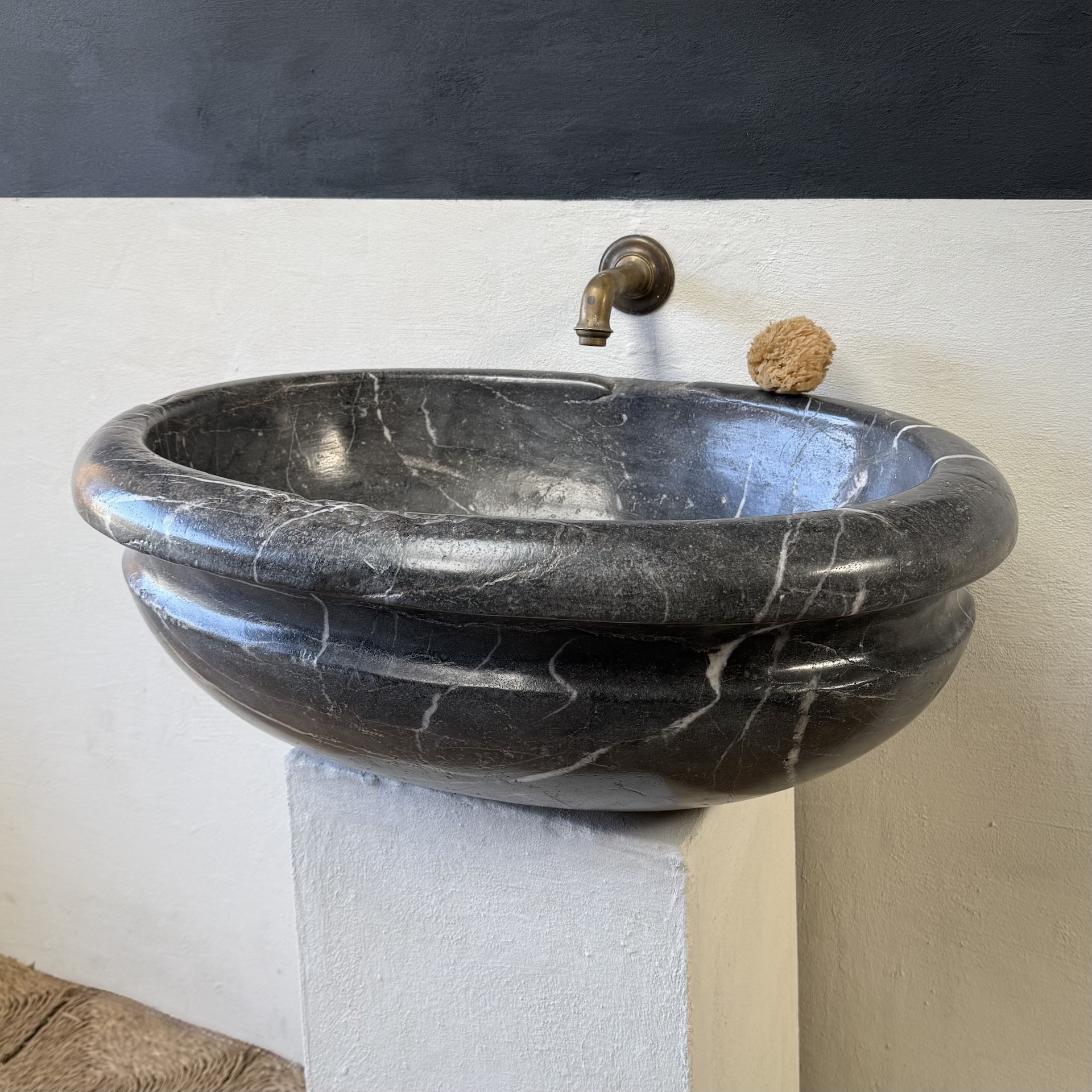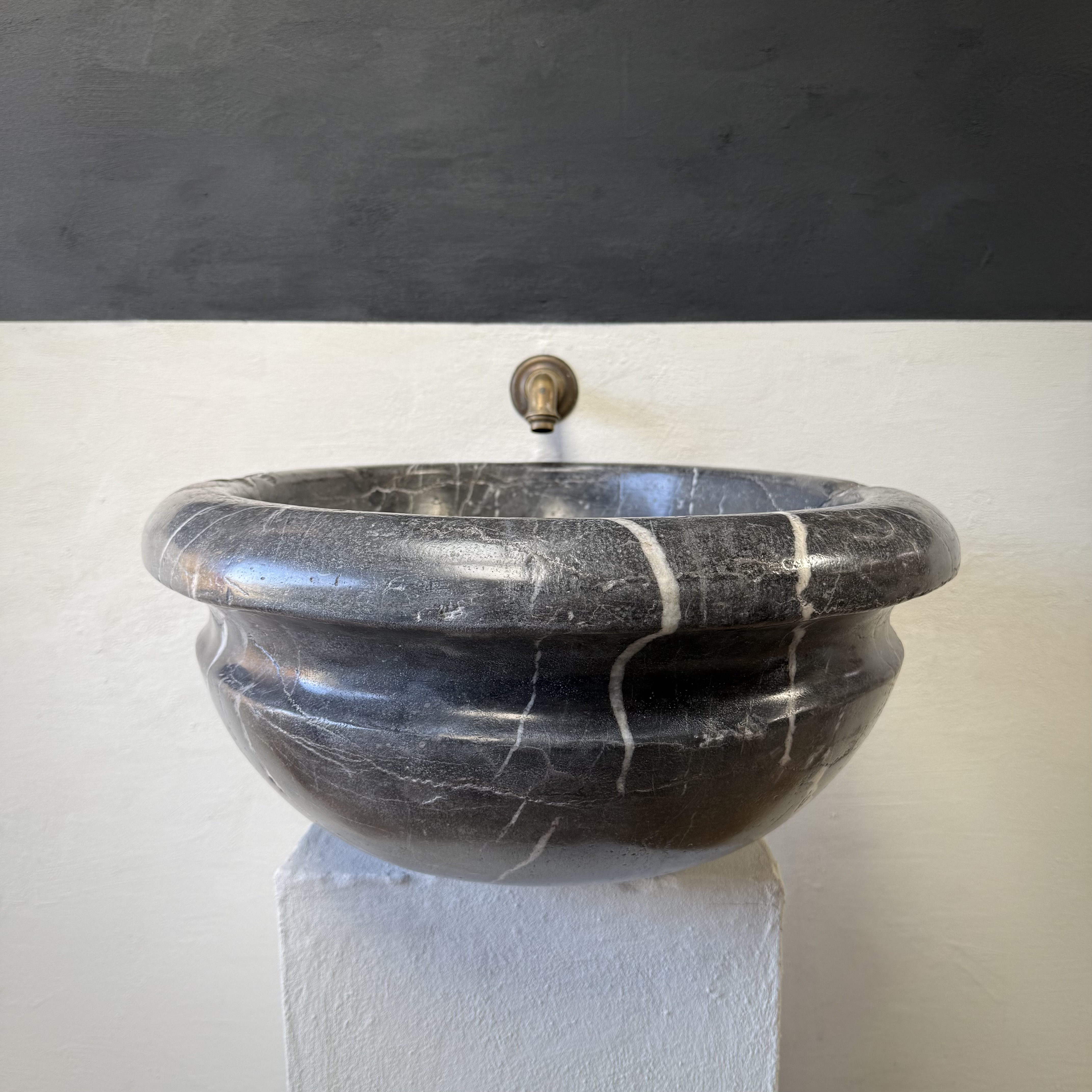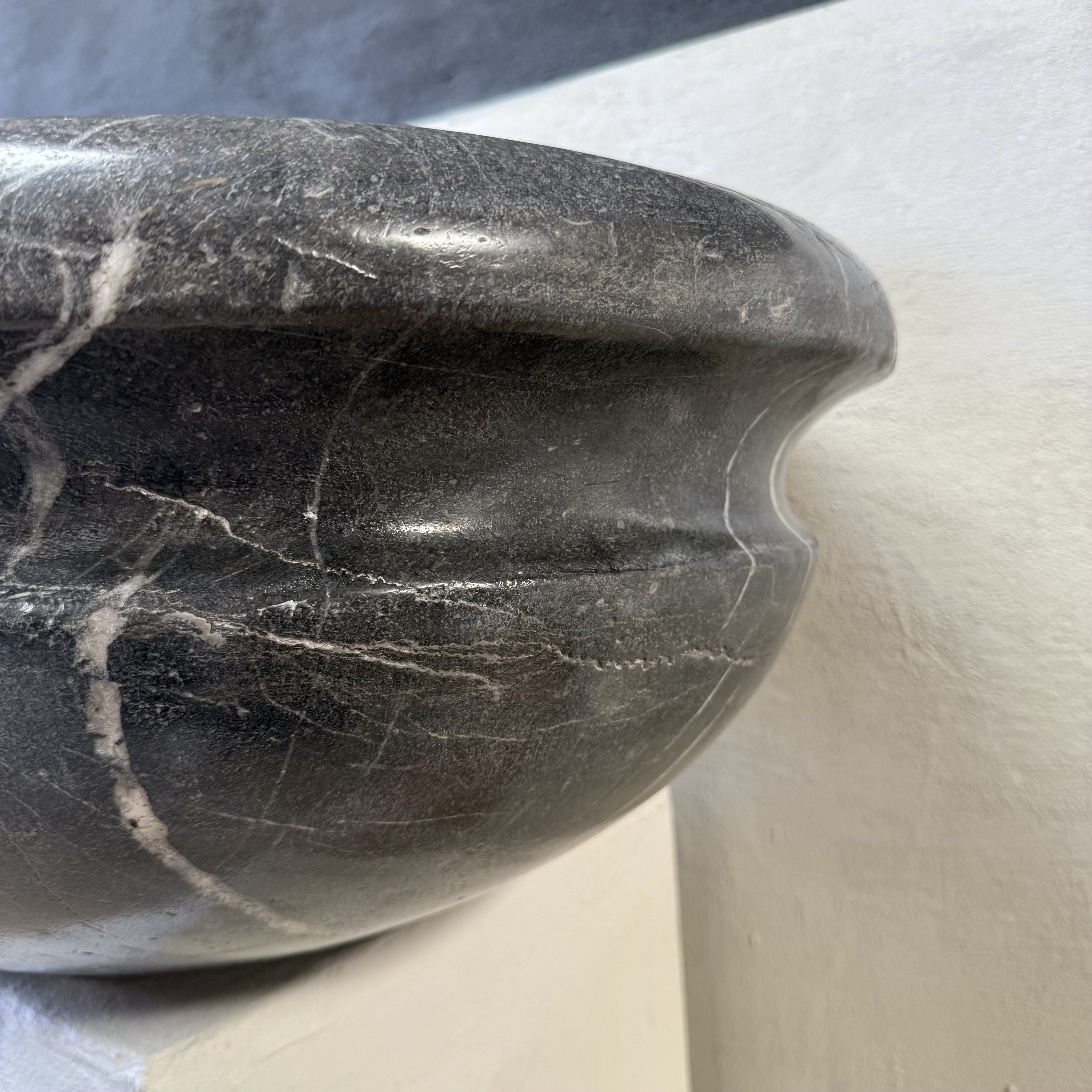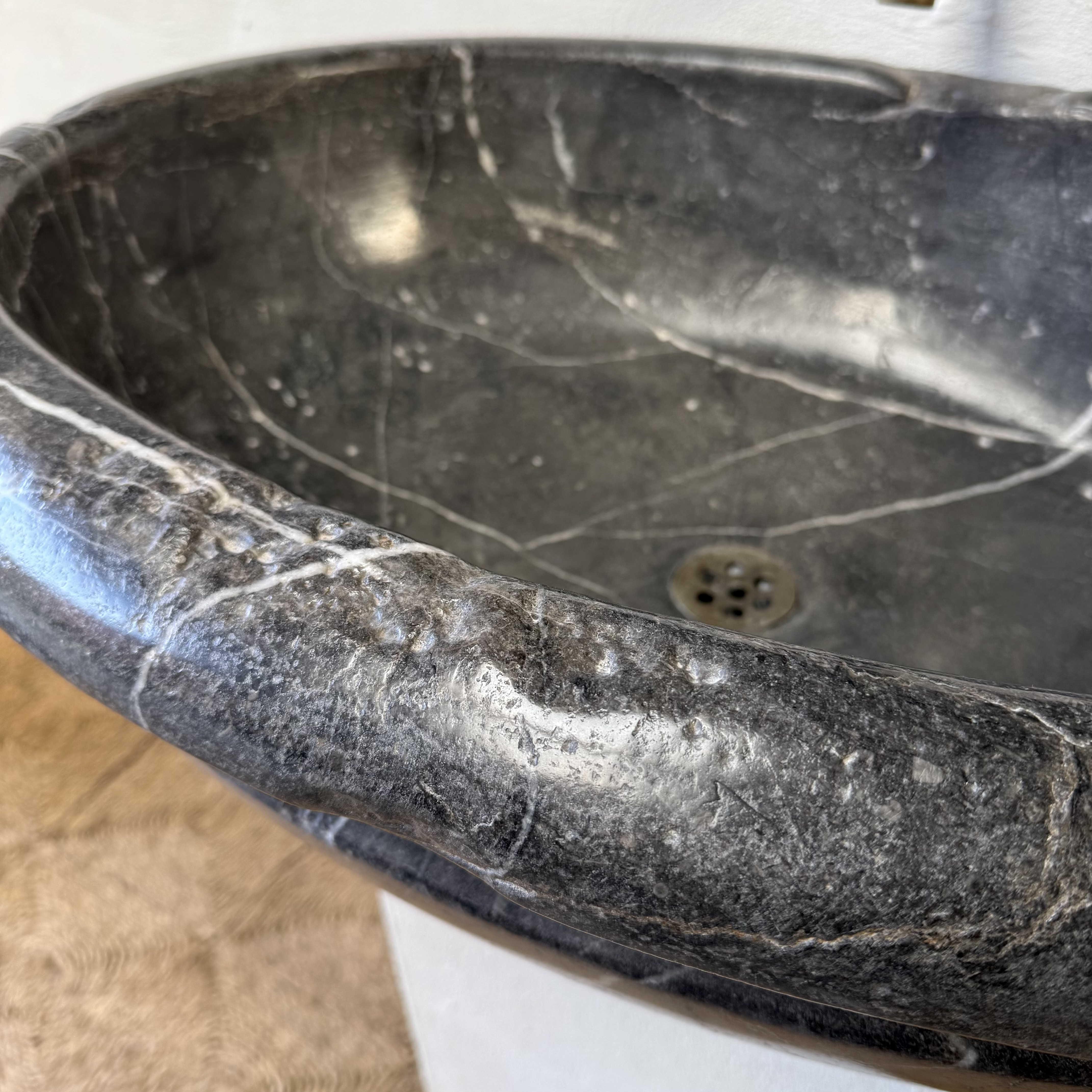 A very large, late 17th-century French oval marble sink carved from richly veined “Cihigue” marble.