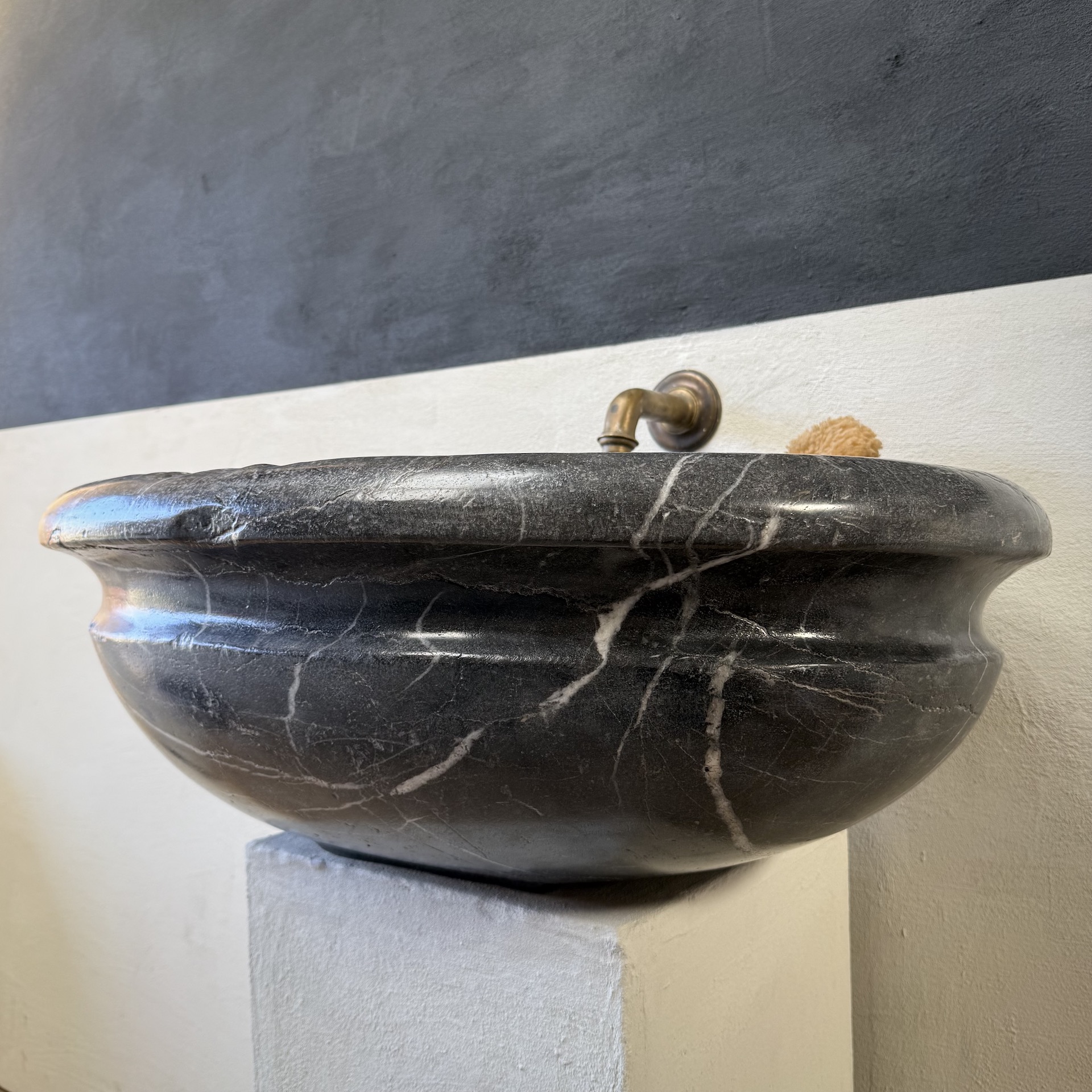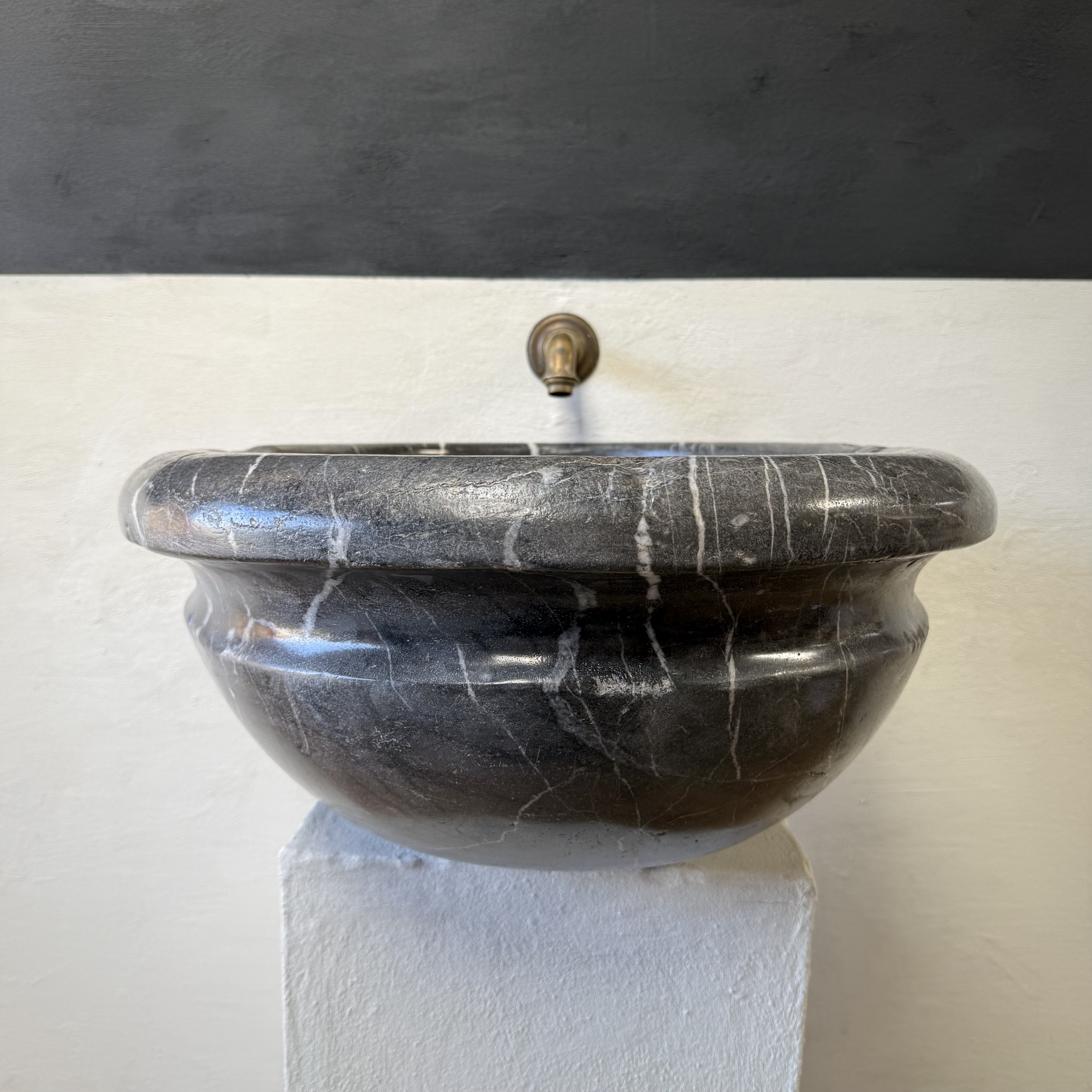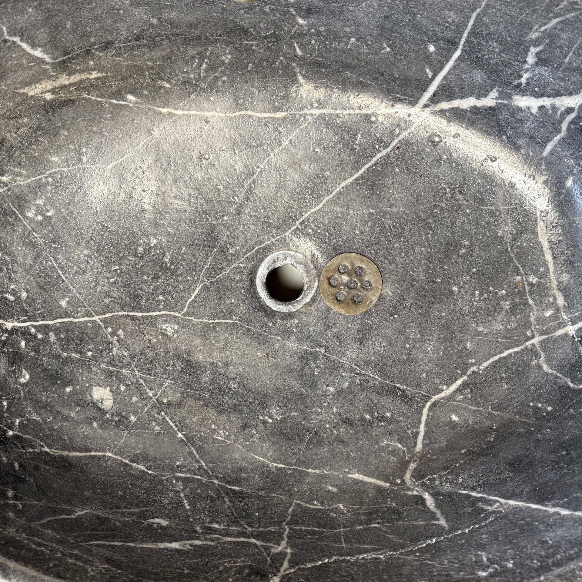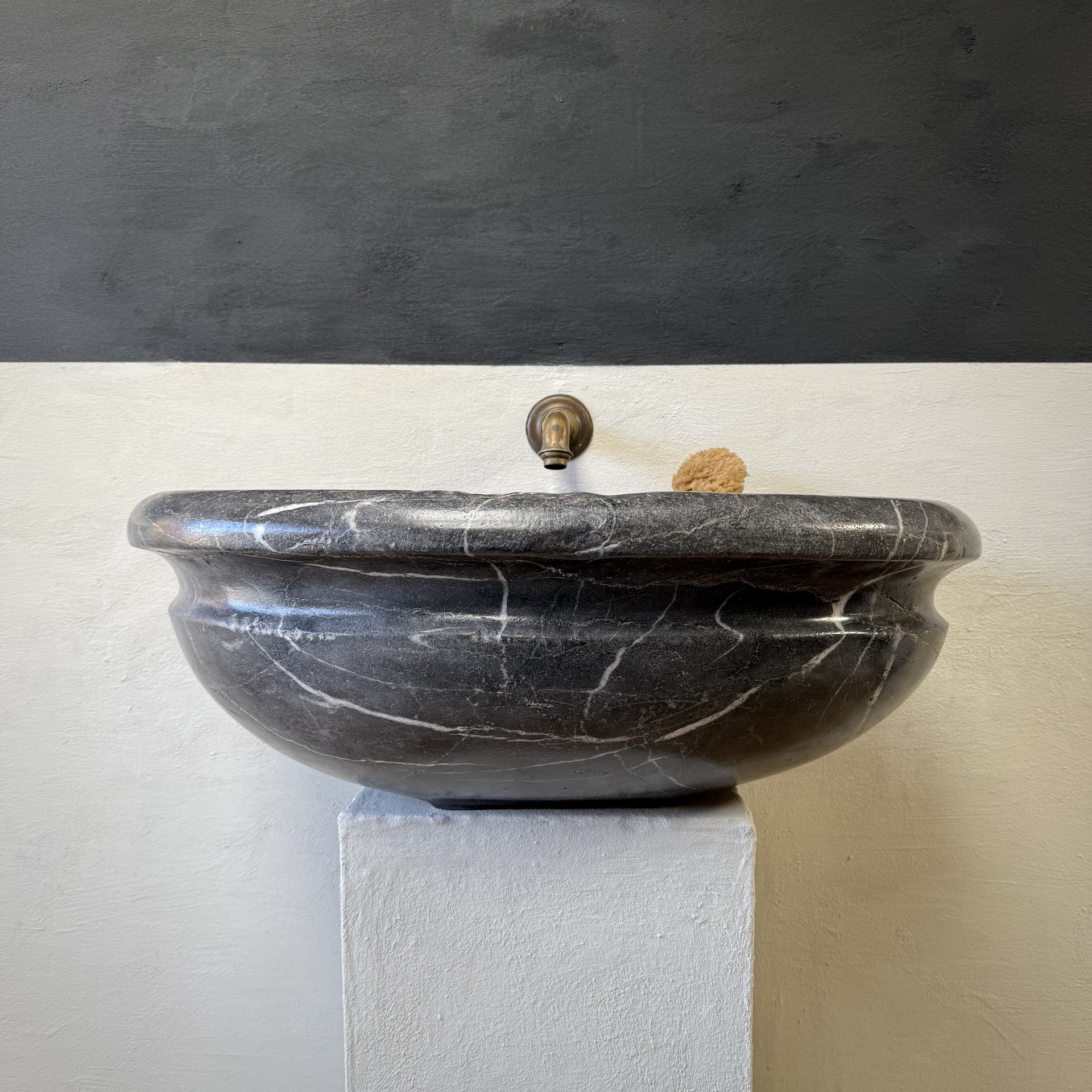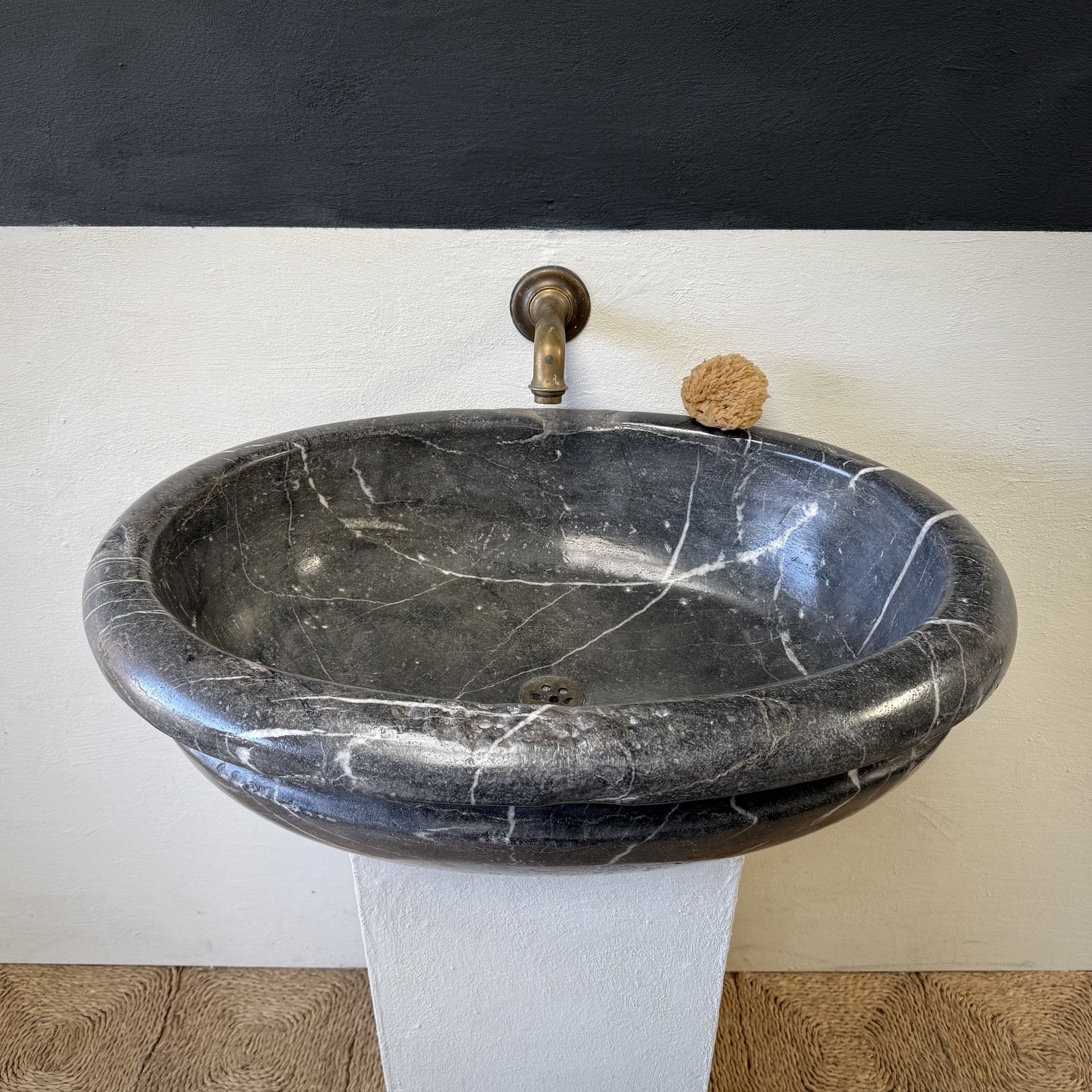 A very large, late 17th-century French oval marble sink carved from richly veined “Cihigue” marble.