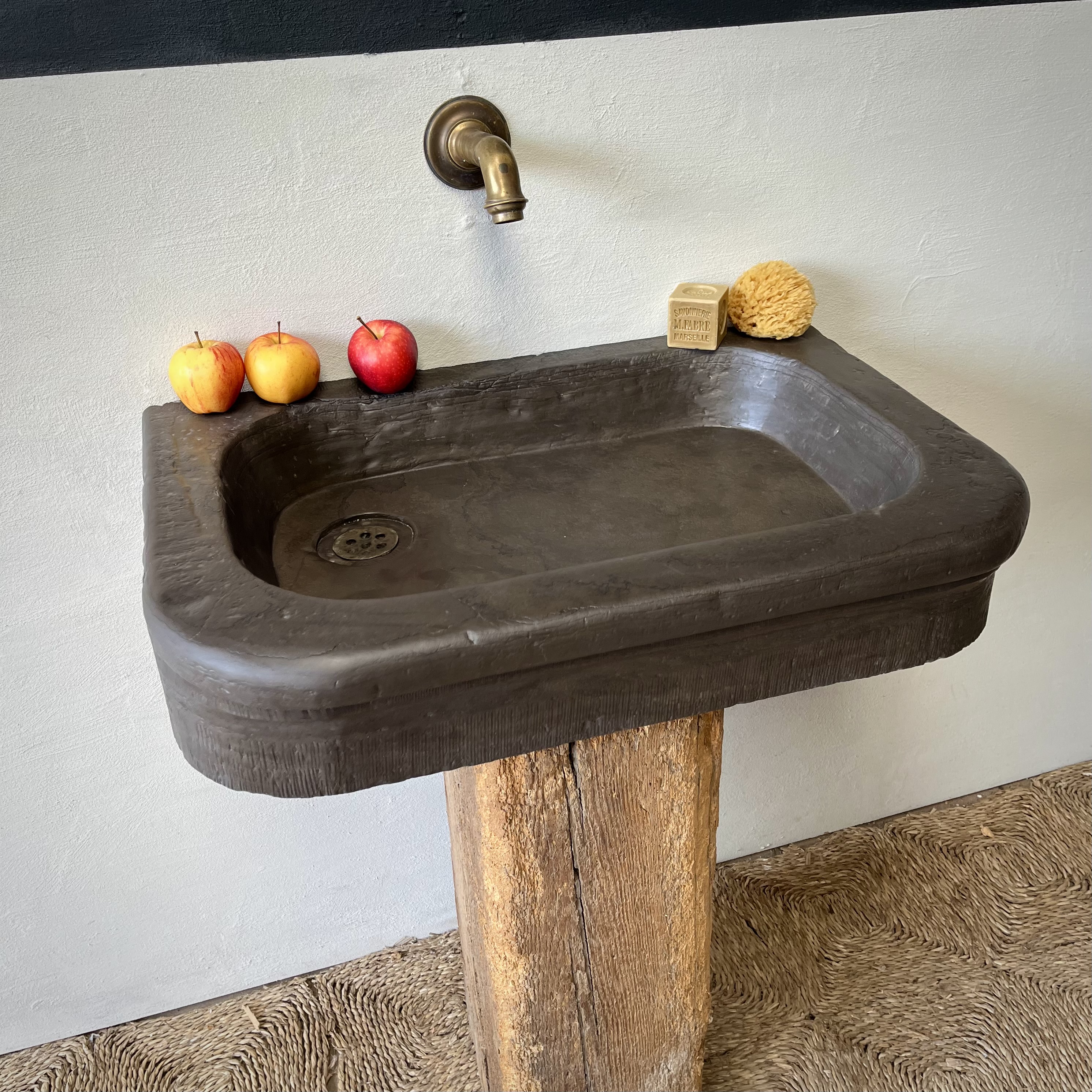 A solid, rectangular sink with curved front corners. Carved out of a dark bronze colour slate. Elaborate bolection moulding on the front. Beautiful, chiseled finish on the body. A few, unobtrusive knocks and scuffs. Wear consistent with age and use. Structurally sound and perfectly water tight.