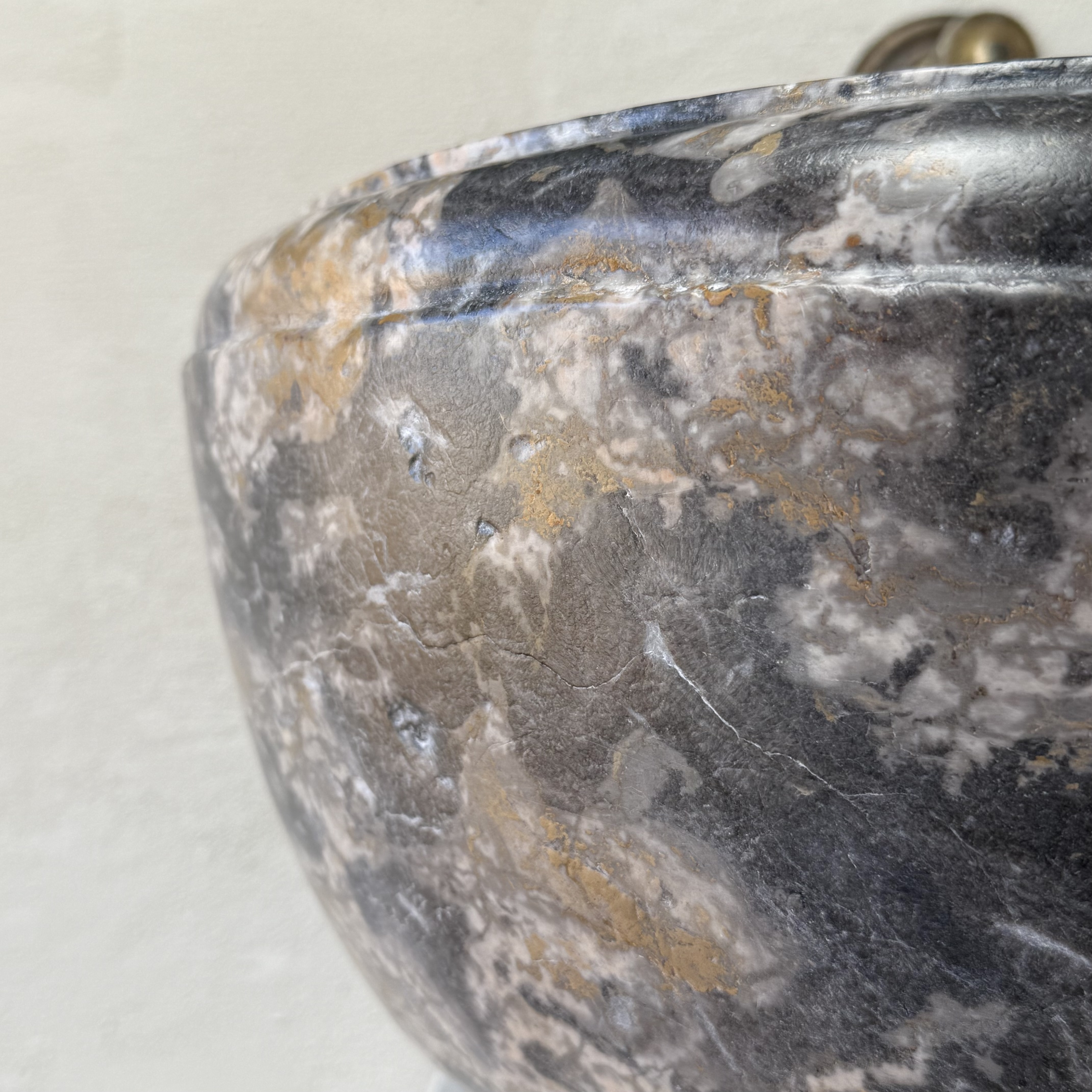 A substantial, 18th century circular marble basin. The basin takes the form of classical bowl, gently tapering from a wide, moulded upper rim down to a narrower base. Carved out "Gris de Caunes" marble, once quarried in Southern France. Wear consistent with age is present throughout, including surface abrasions, minor losses and chipping along the rim, body and base (please refer to pictures). Structurally sound and in very good condition.