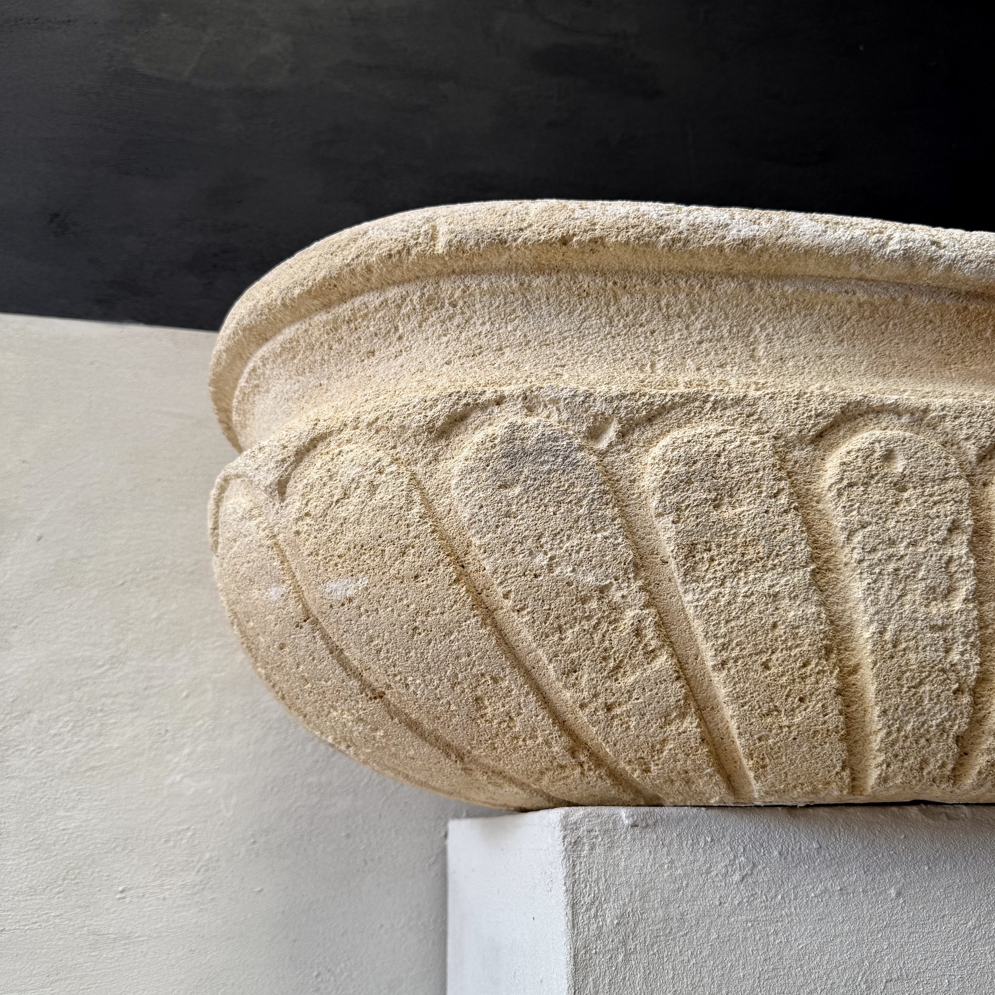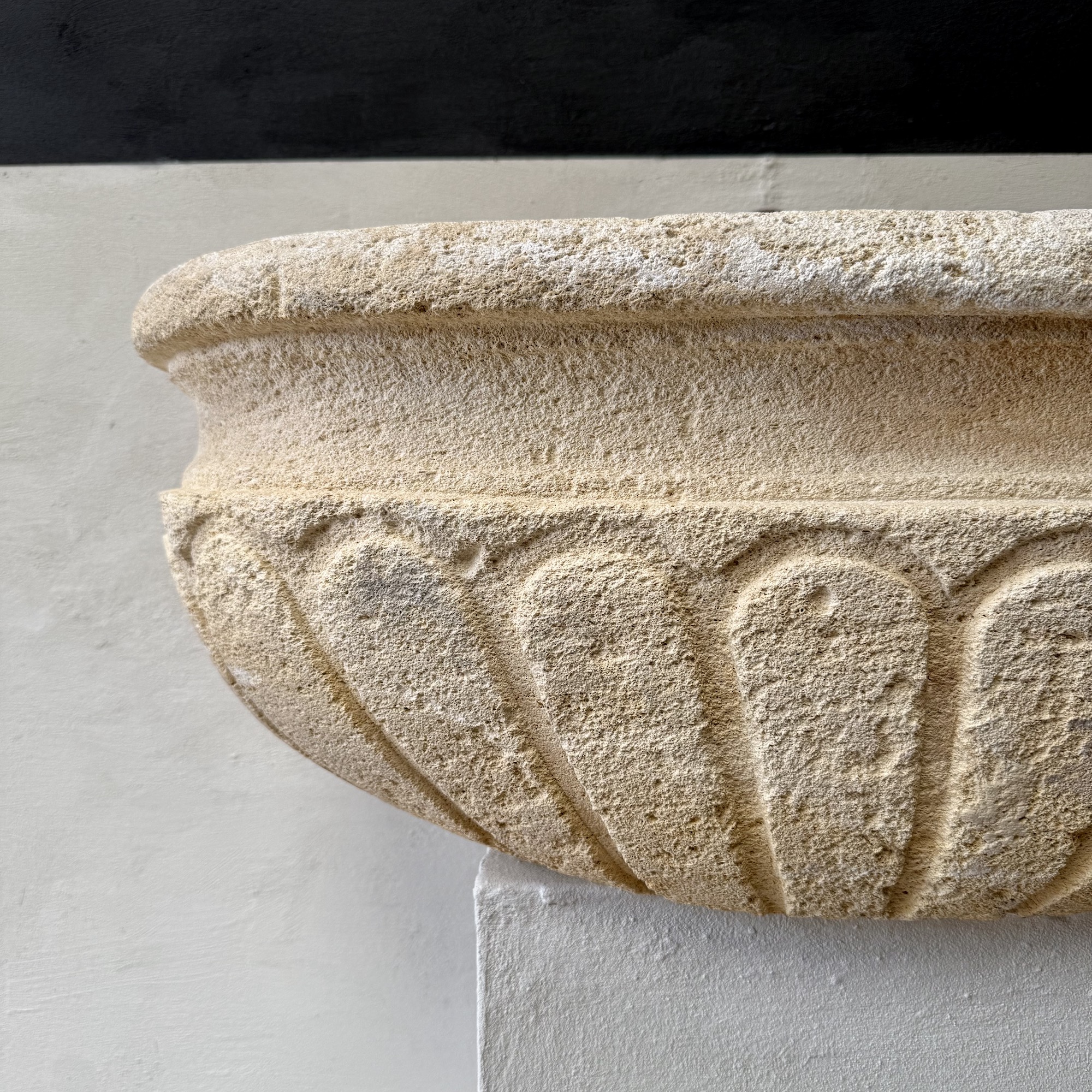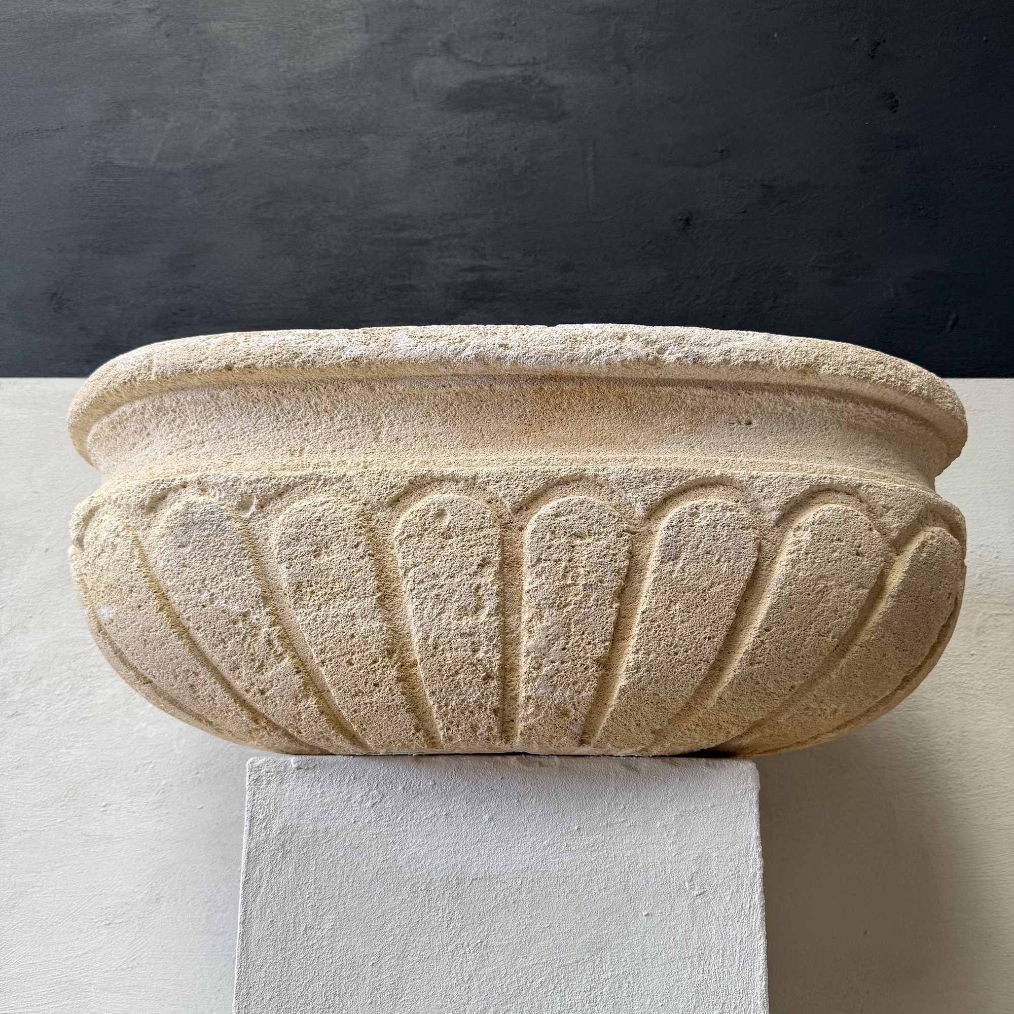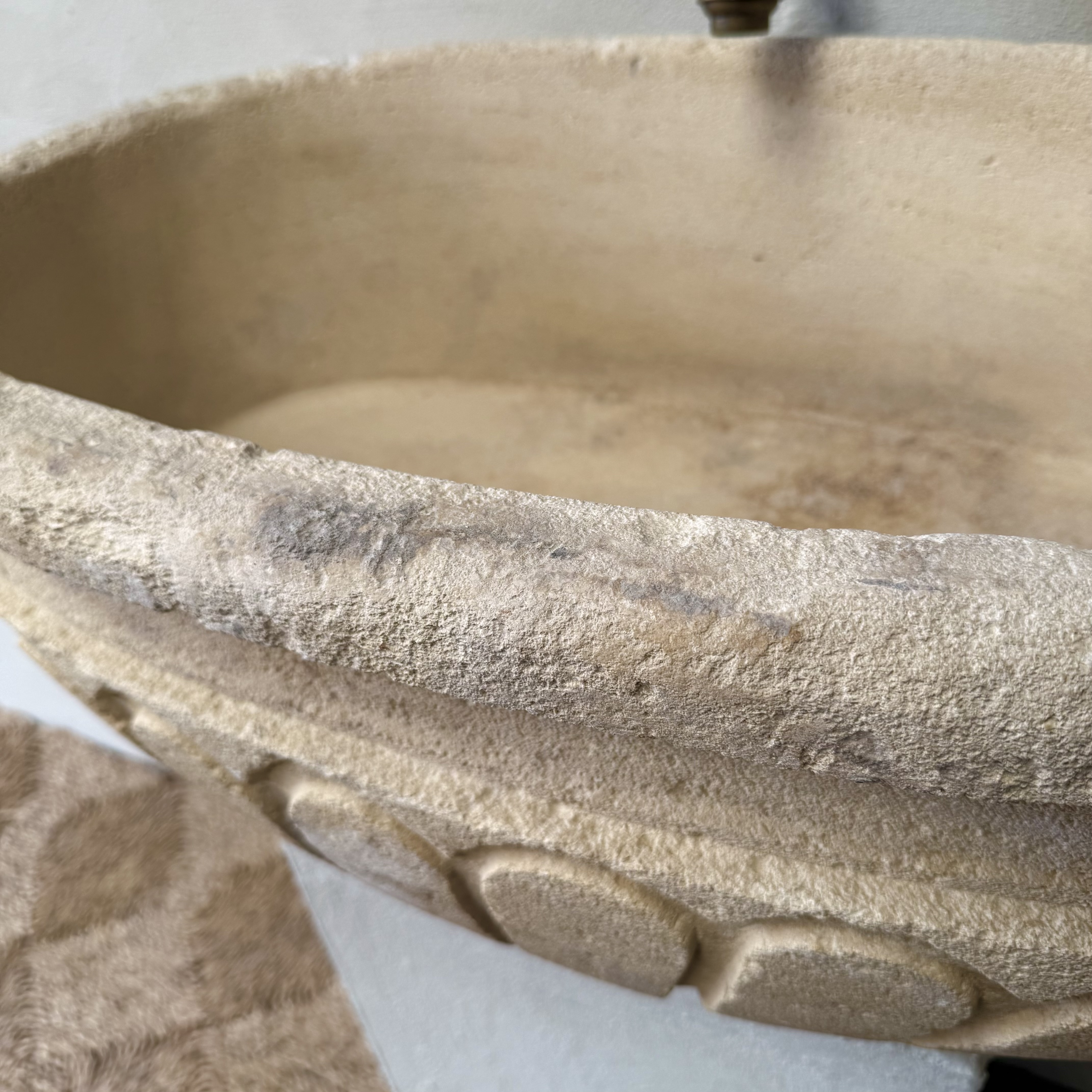 An exceptional 18th-century oval French stone font, finely hand-carved from mellow Pierre de Thénac. The piece features beautifully proportioned gadroons around the body and a well-defined cavetto moulding beneath the upper edge—hallmarks of refined French stonework of the period.