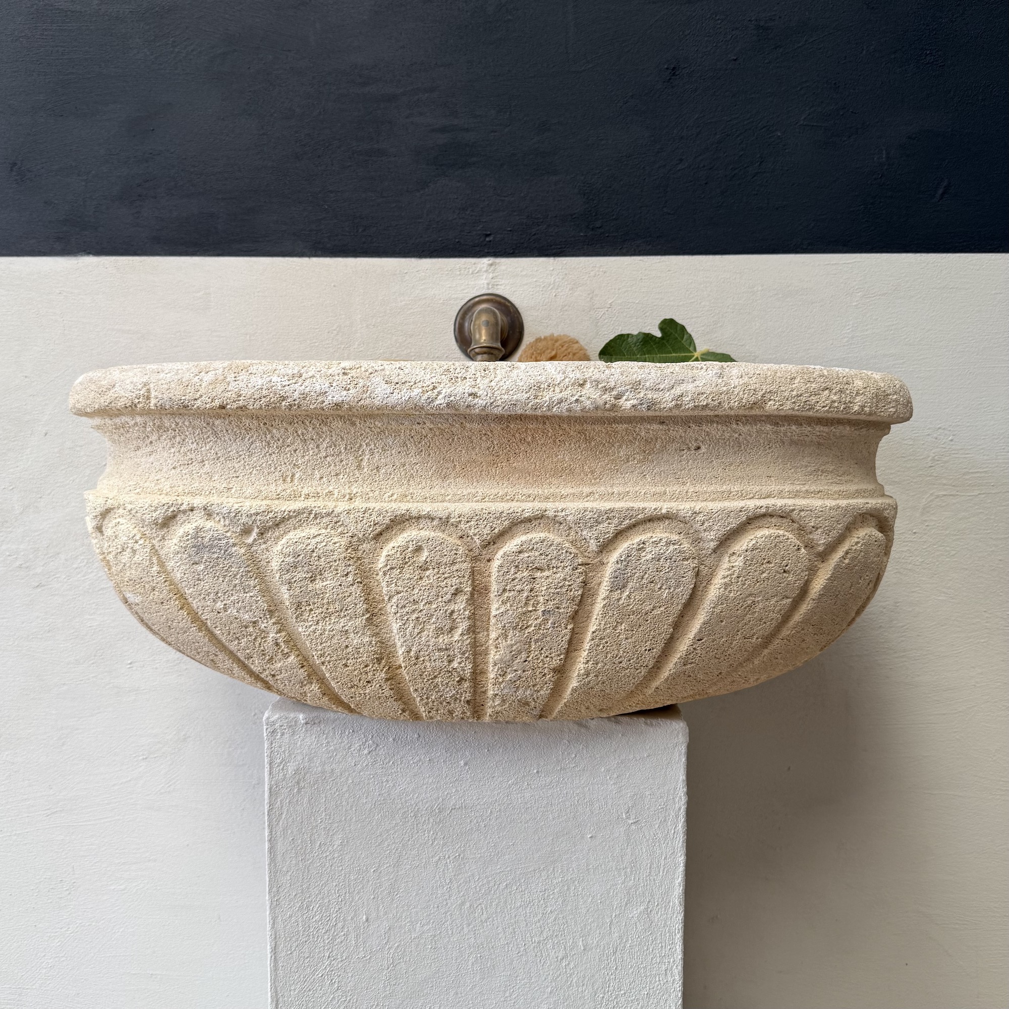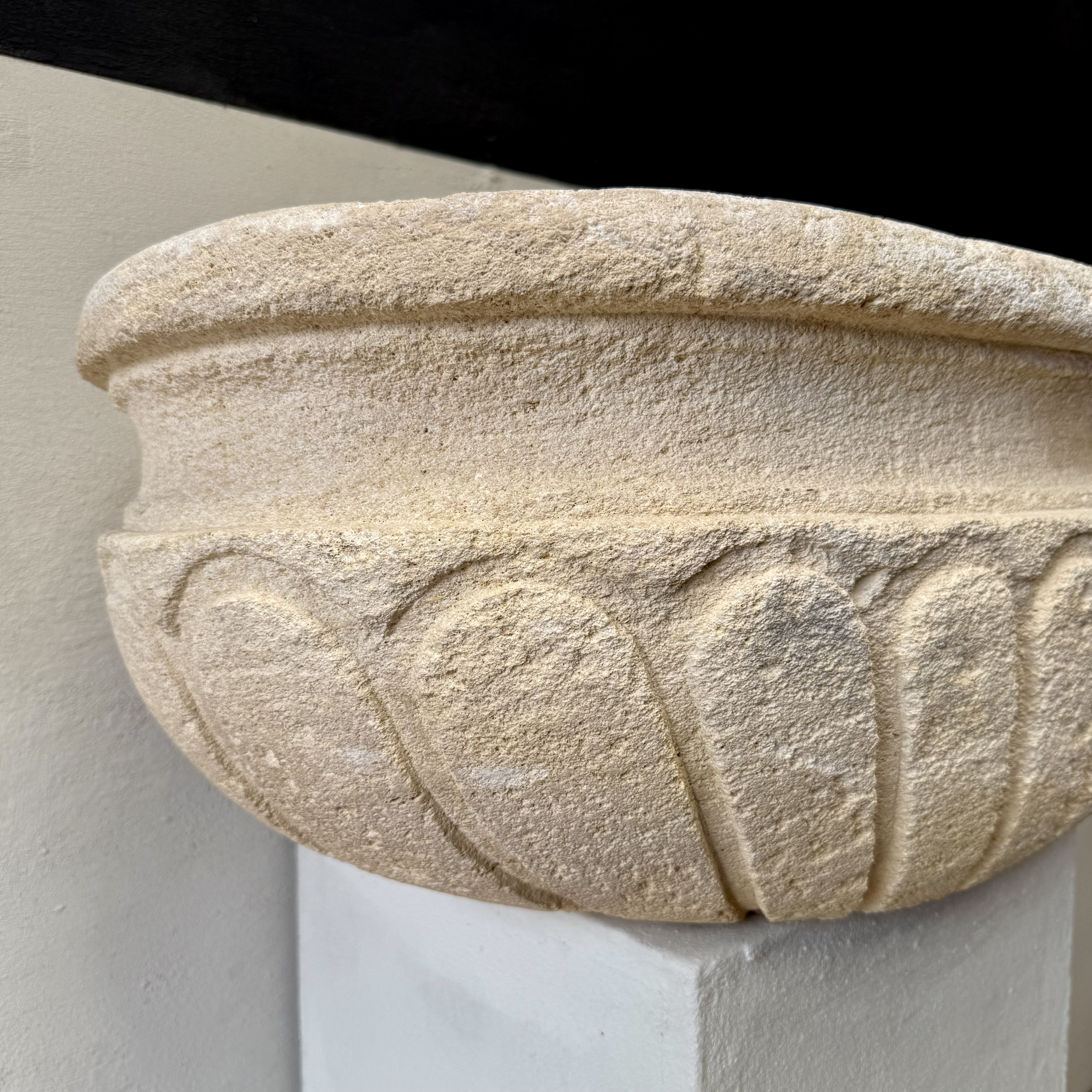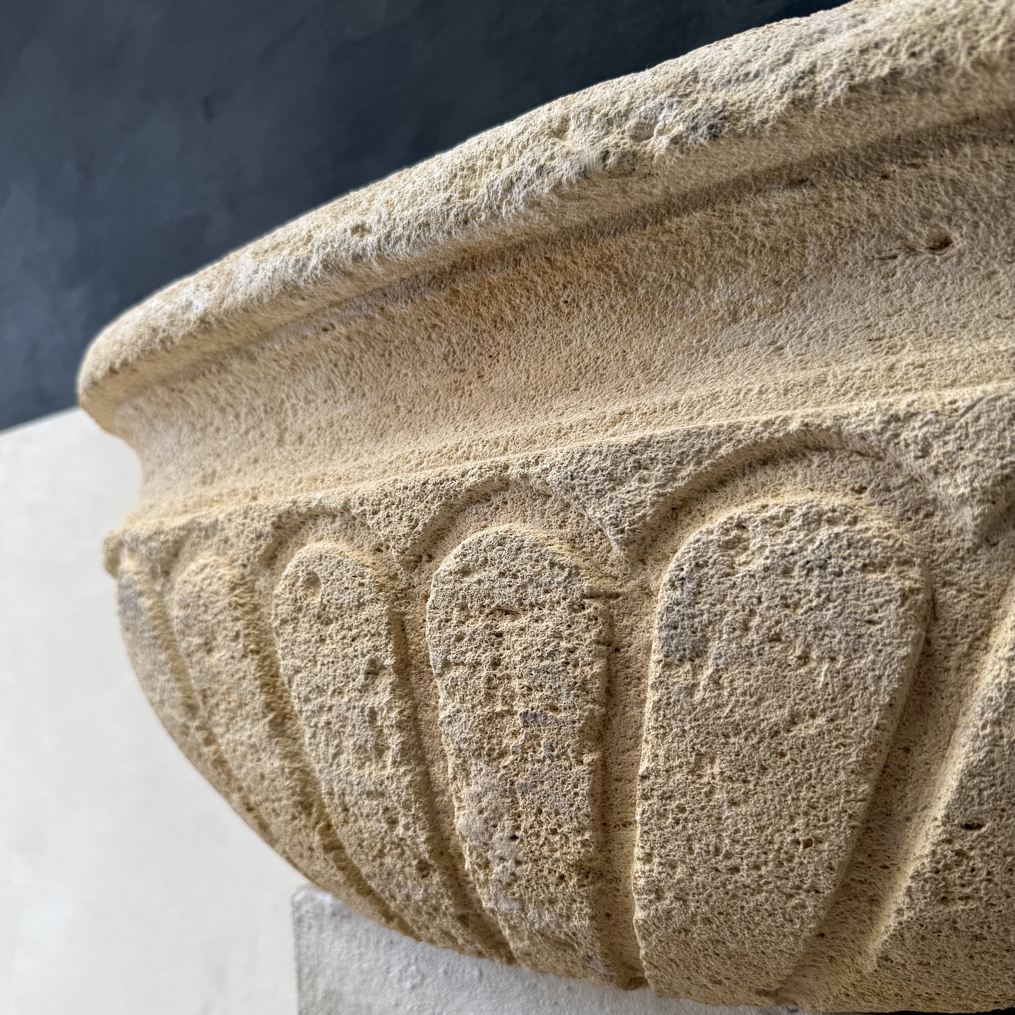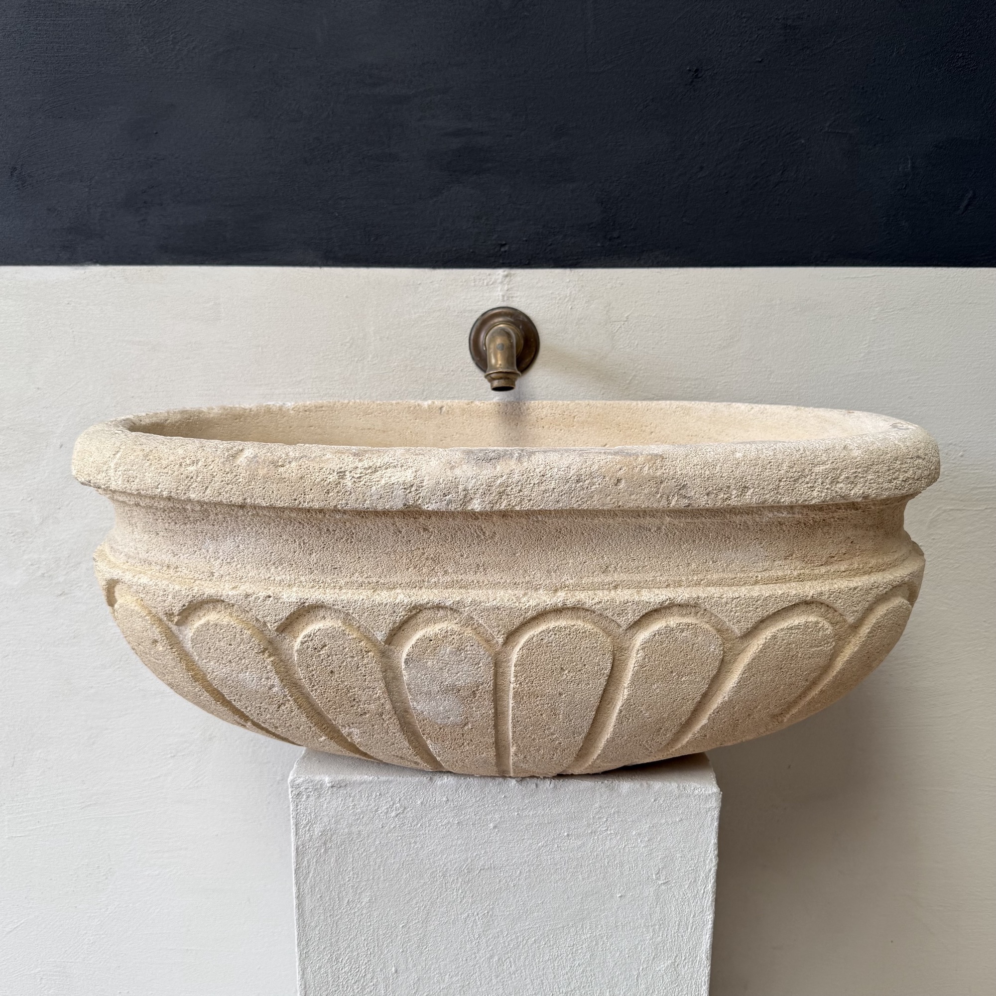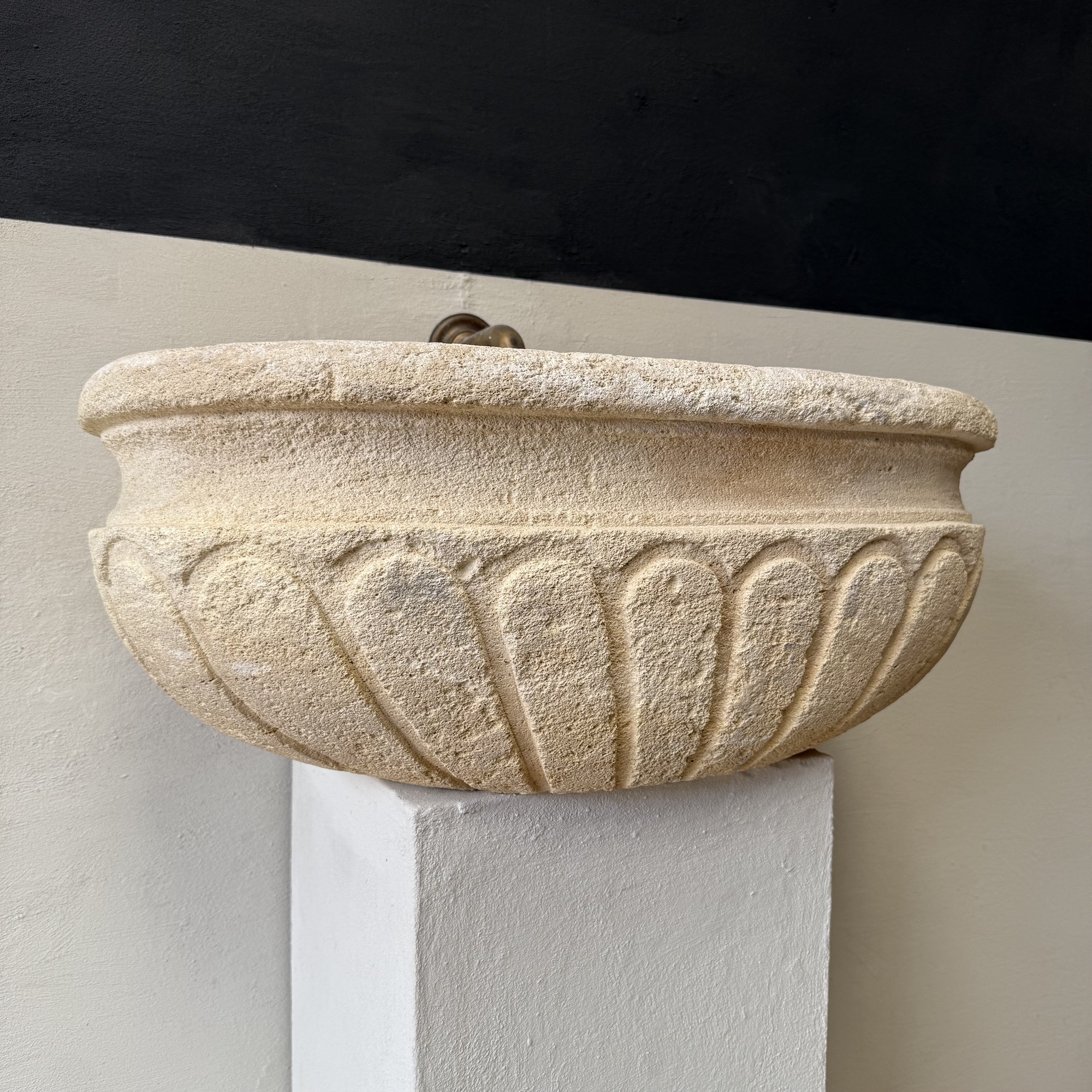 An exceptional 18th-century oval French stone font, finely hand-carved from mellow Pierre de Thénac. The piece features beautifully proportioned gadroons around the body and a well-defined cavetto moulding beneath the upper edge—hallmarks of refined French stonework of the period.