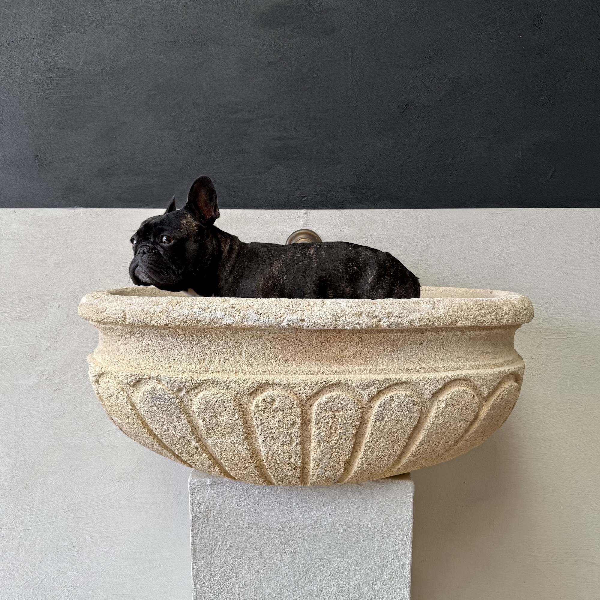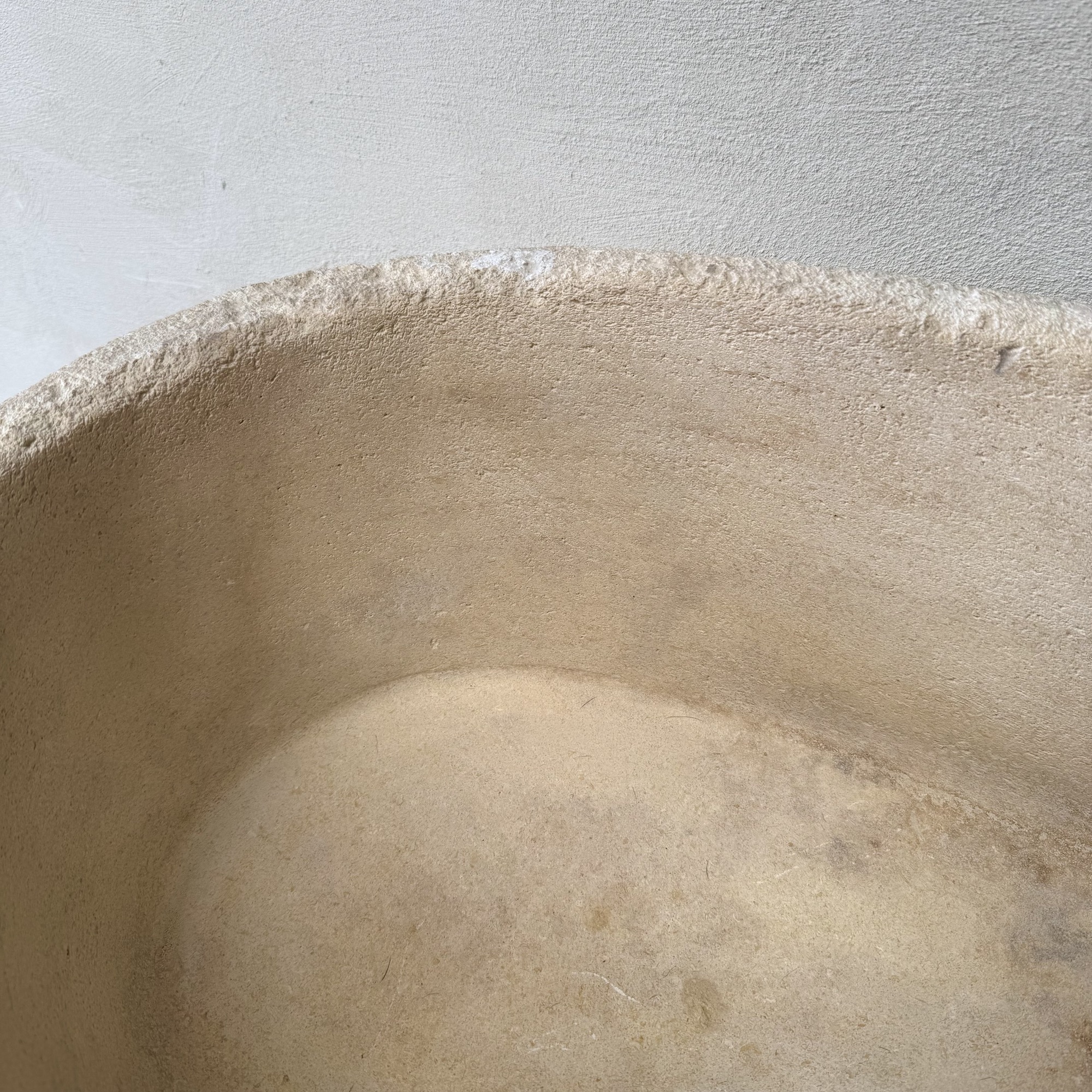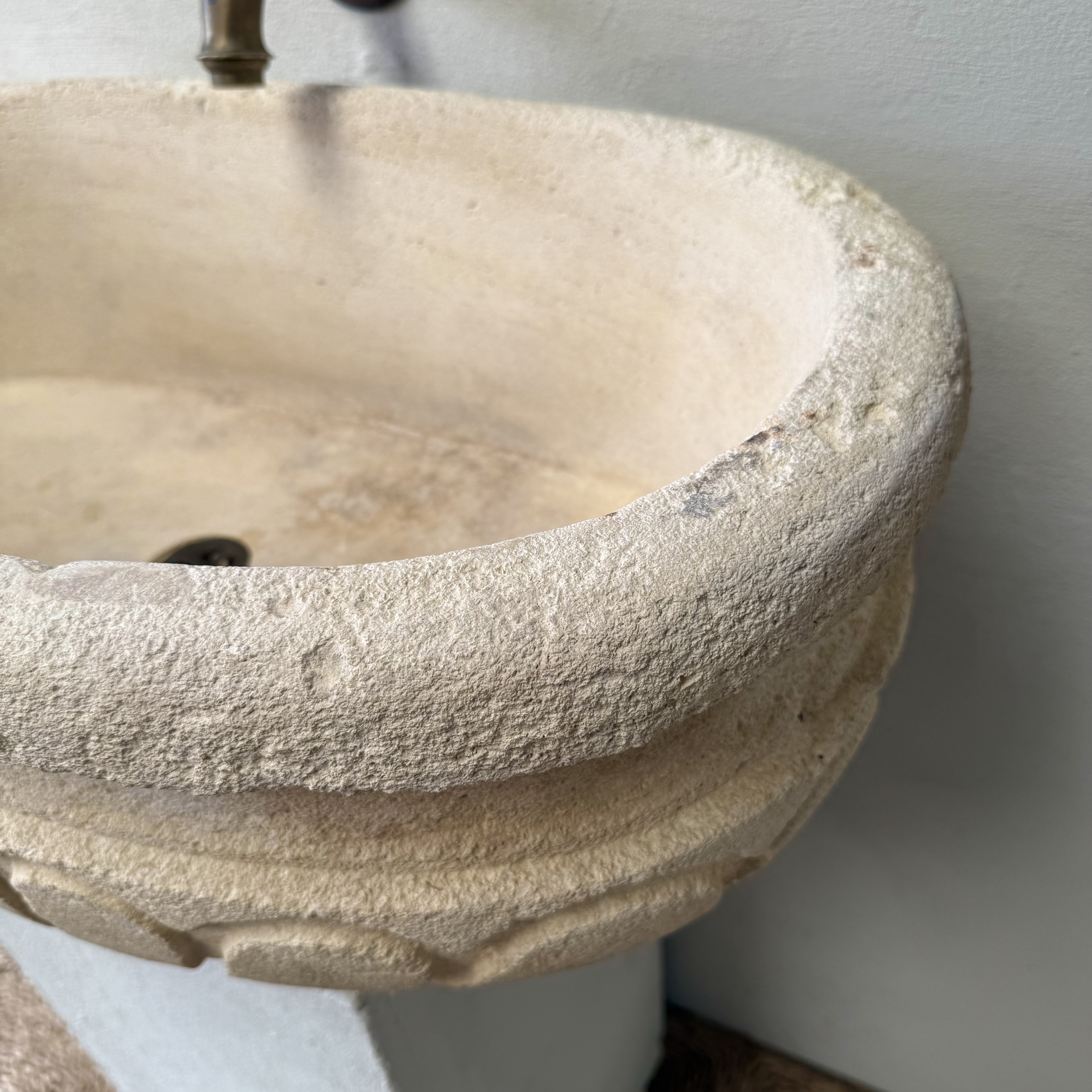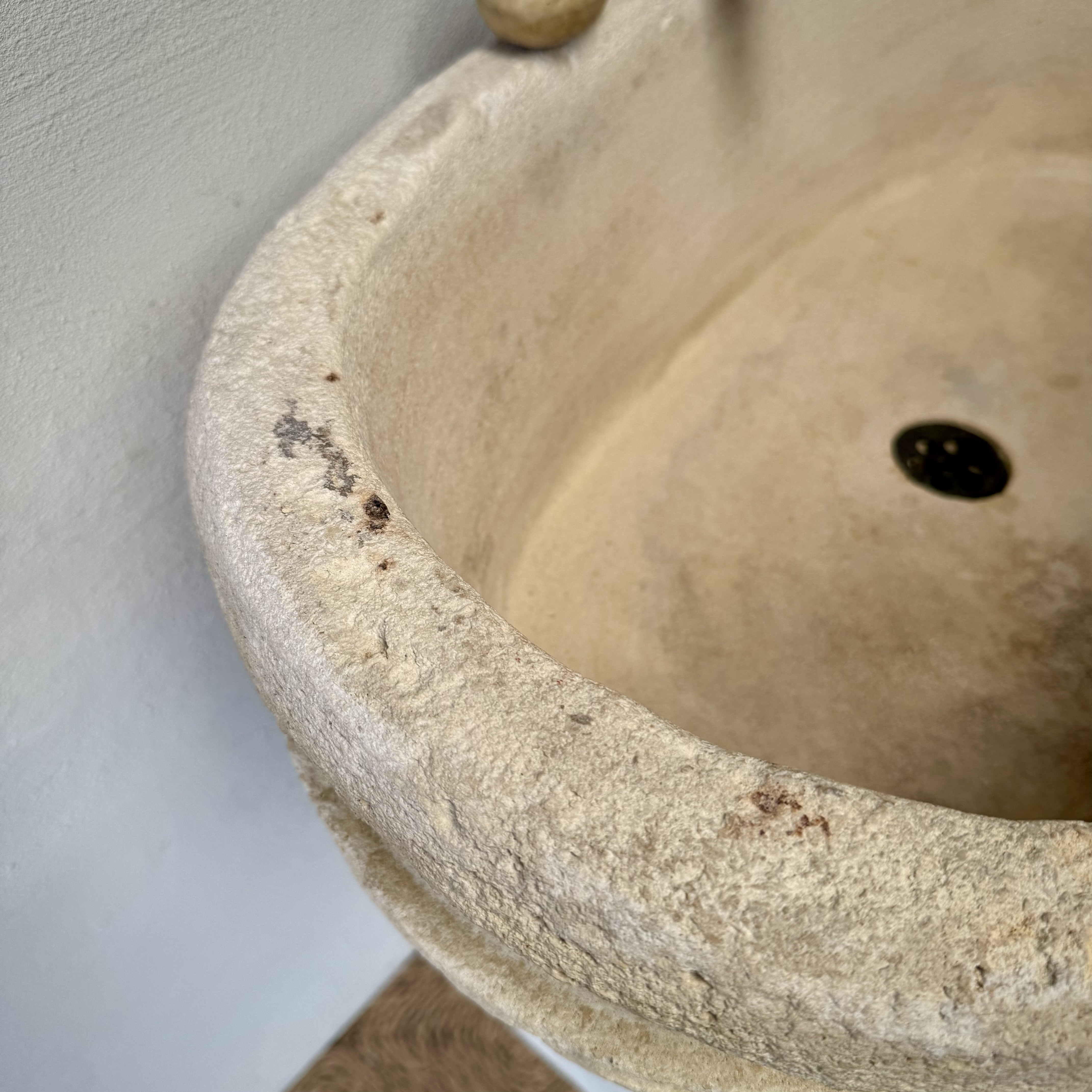 The font remains in excellent, fully usable condition. The stone has developed a naturally weathered surface, lending it an attractive, time-worn patina. Minor wear to the upper edge and a few small, unobtrusive chips and scuffs are consistent with age and add to its authenticity. The interior is smooth and clean, ensuring perfect water drainage. Structurally sound and watertight, with no cracks or breaks.