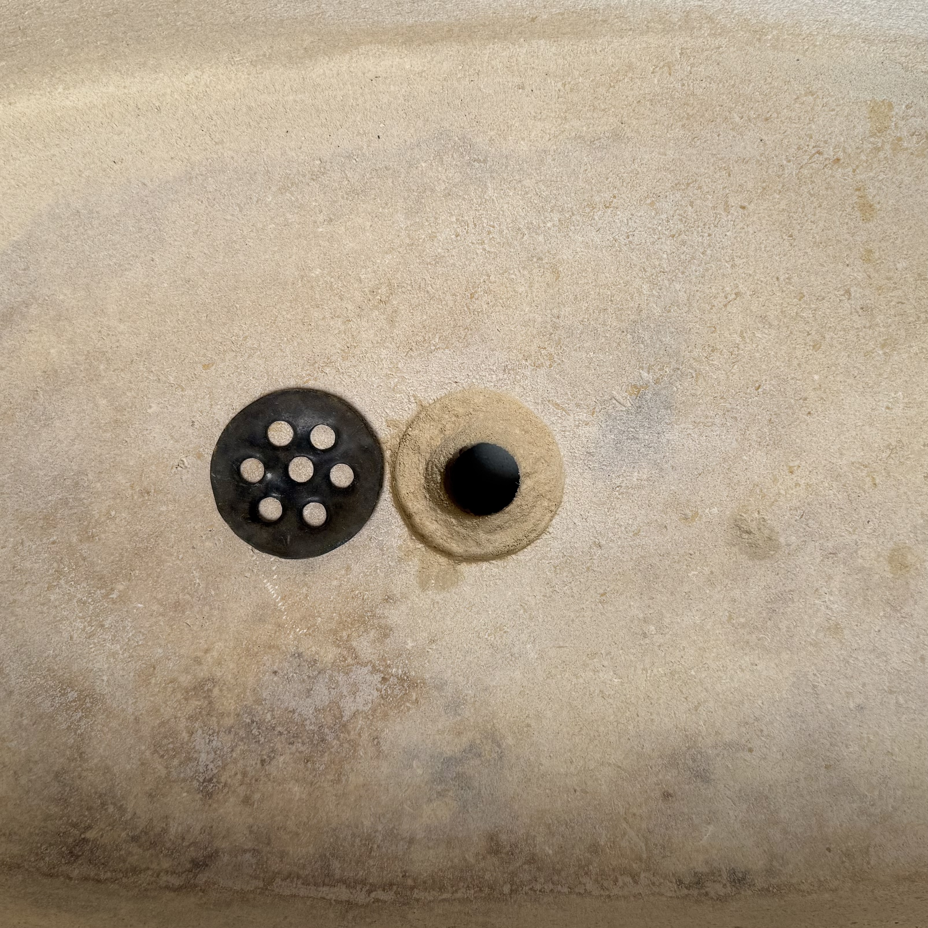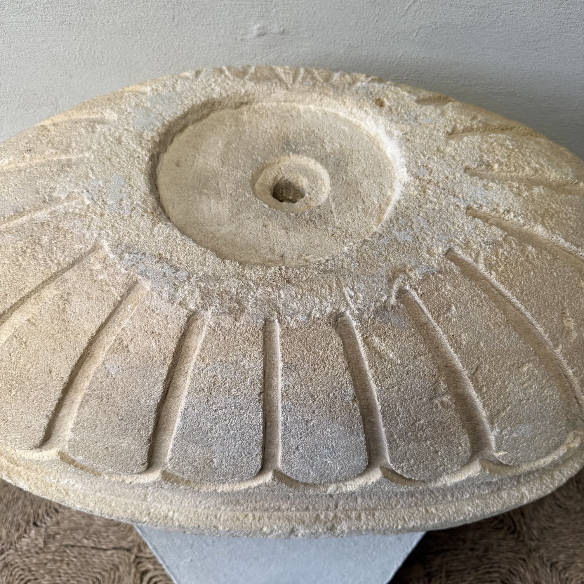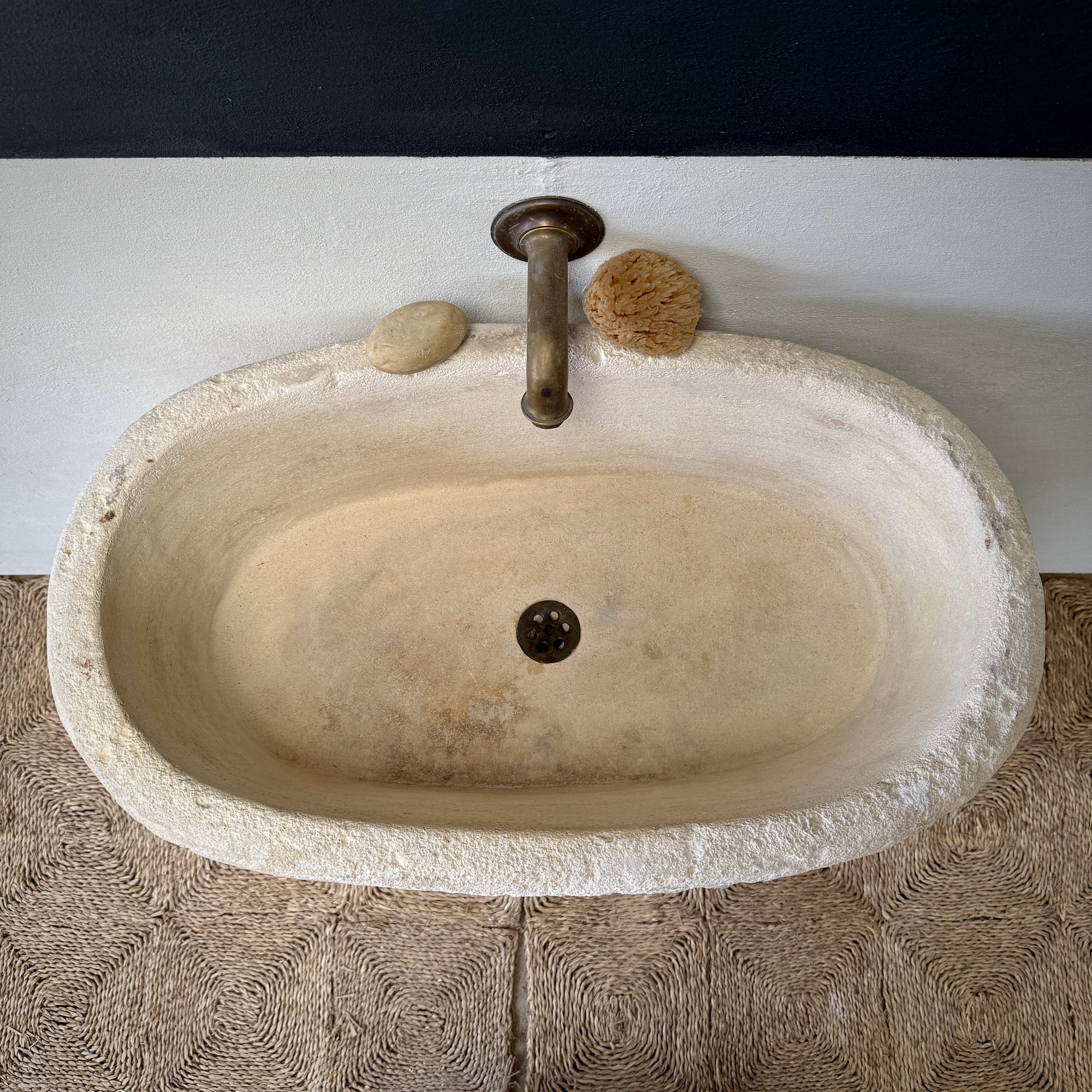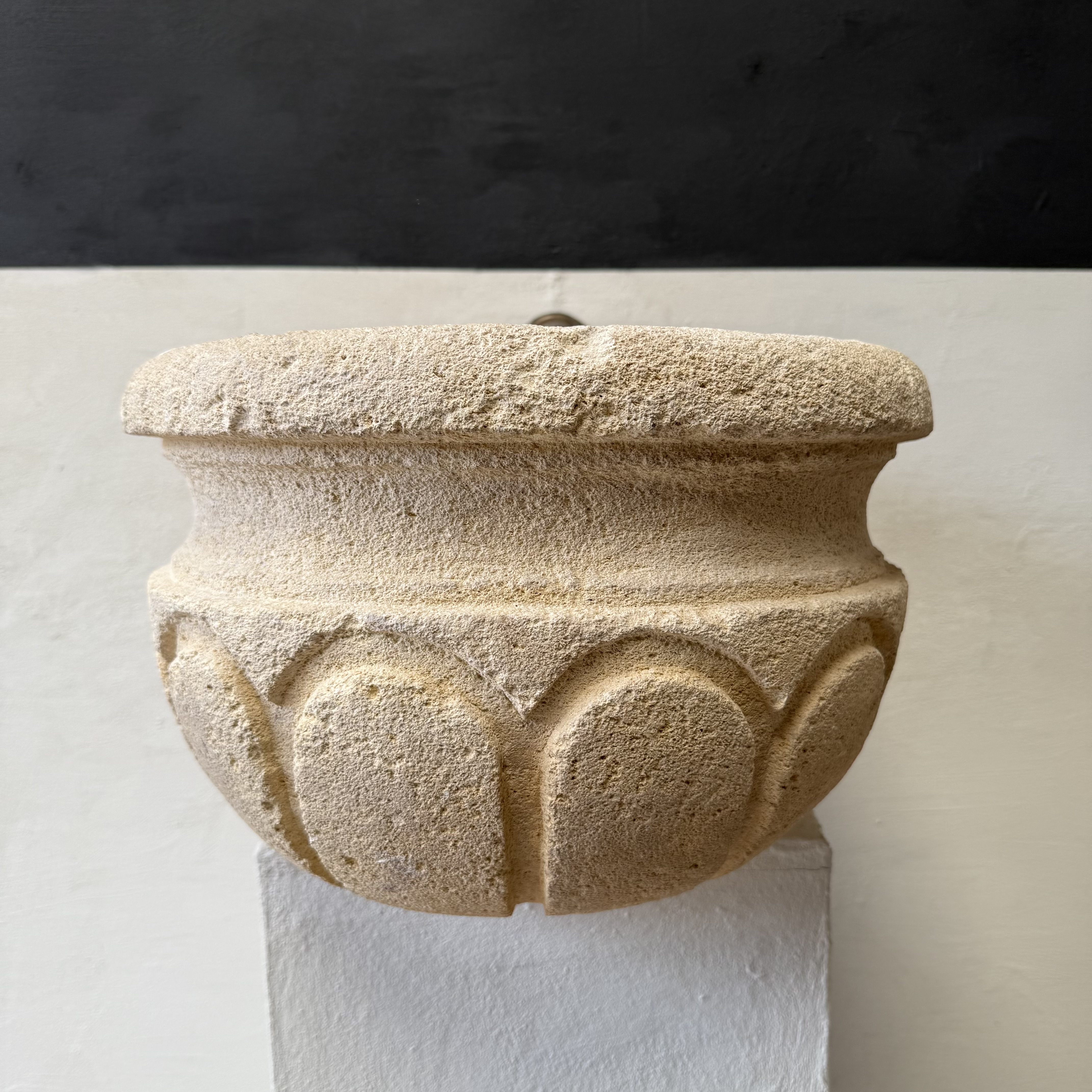 The font remains in excellent, fully usable condition. The stone has developed a naturally weathered surface, lending it an attractive, time-worn patina. Minor wear to the upper edge and a few small, unobtrusive chips and scuffs are consistent with age and add to its authenticity. The interior is smooth and clean, ensuring perfect water drainage. Structurally sound and watertight, with no cracks or breaks.