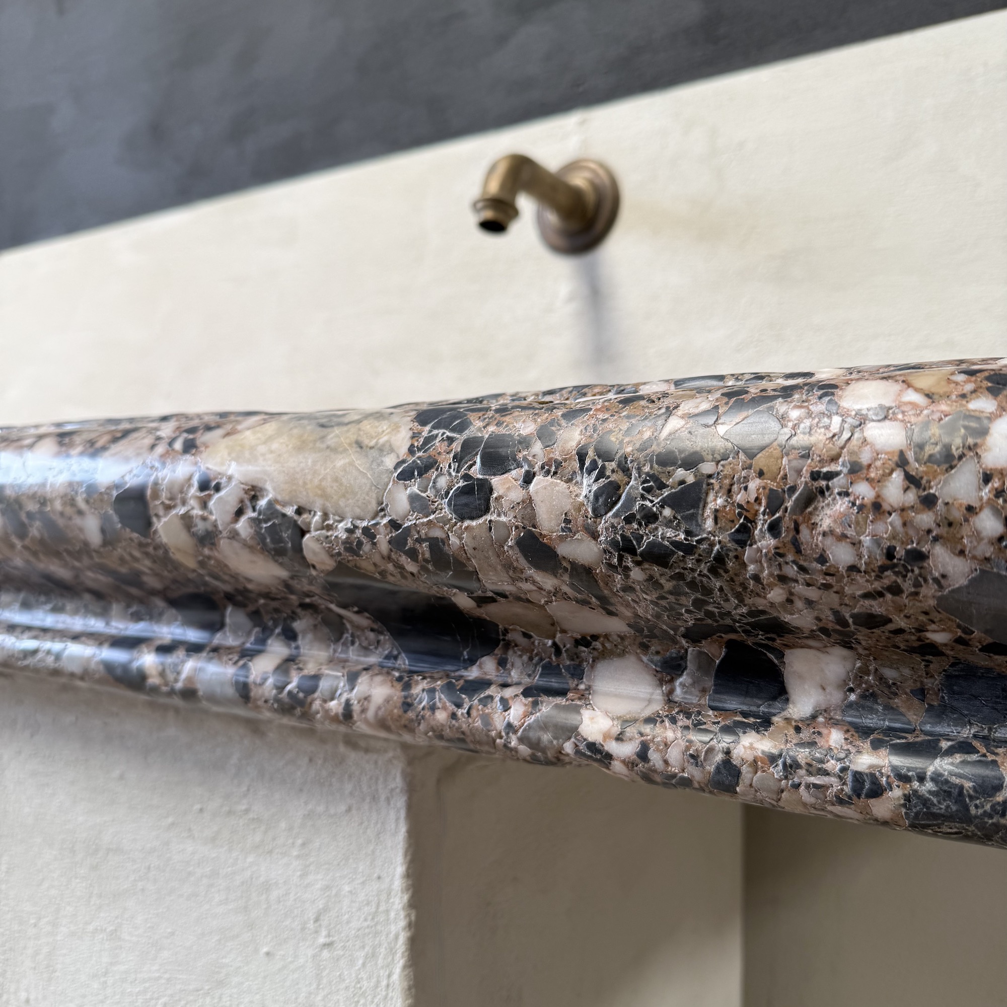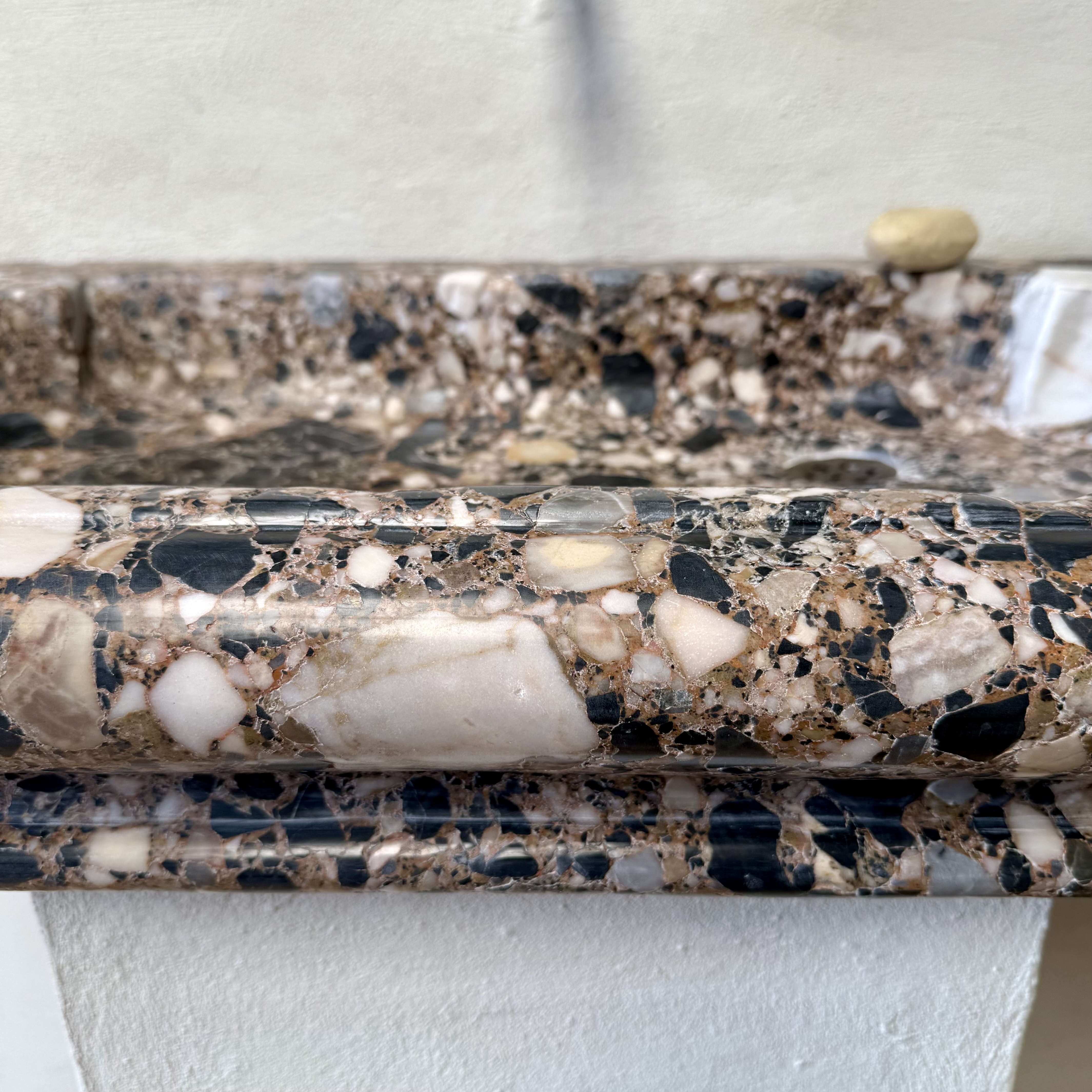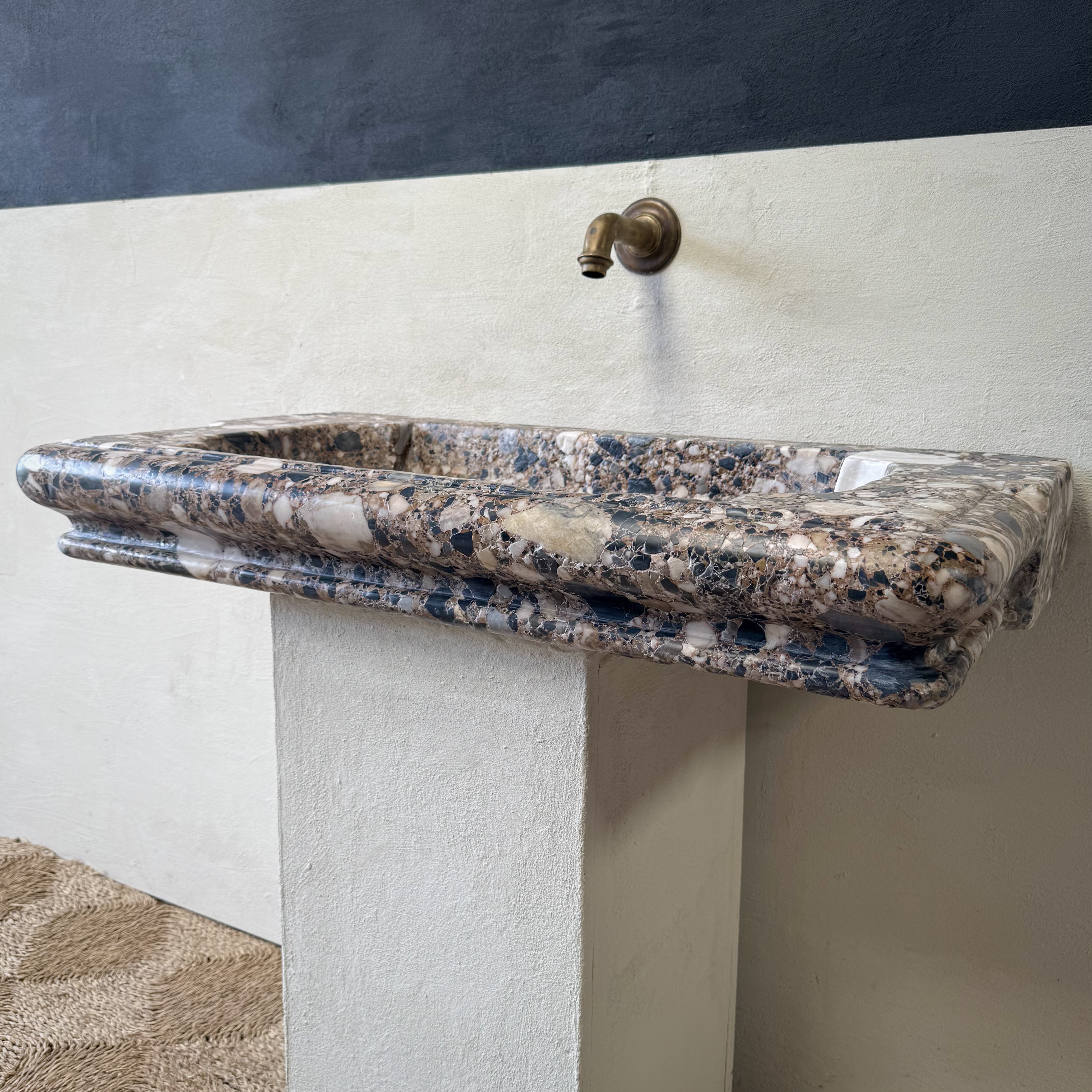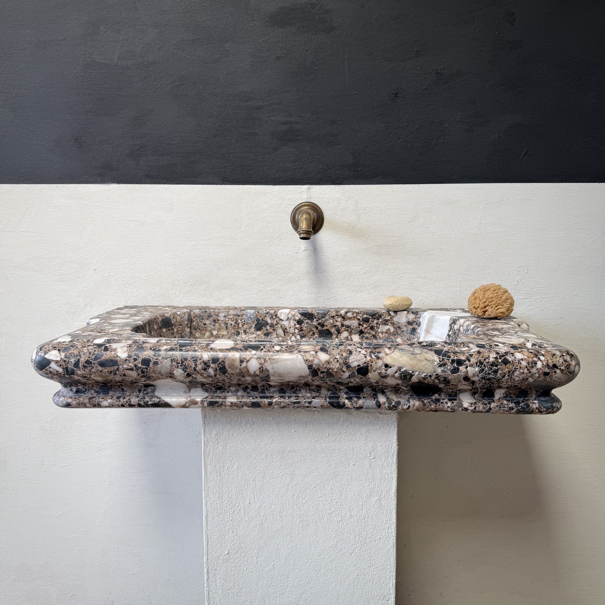 A particularly fine and rare 18th century sink carved from richly figured Breccia marble, known as Brèche de Baixas, formerly quarried in southern France. The marble displays a striking natural composition of black, white, beige, and warm brown fragments, giving the surface a vivid and decorative appearance characteristic of this prized stone.