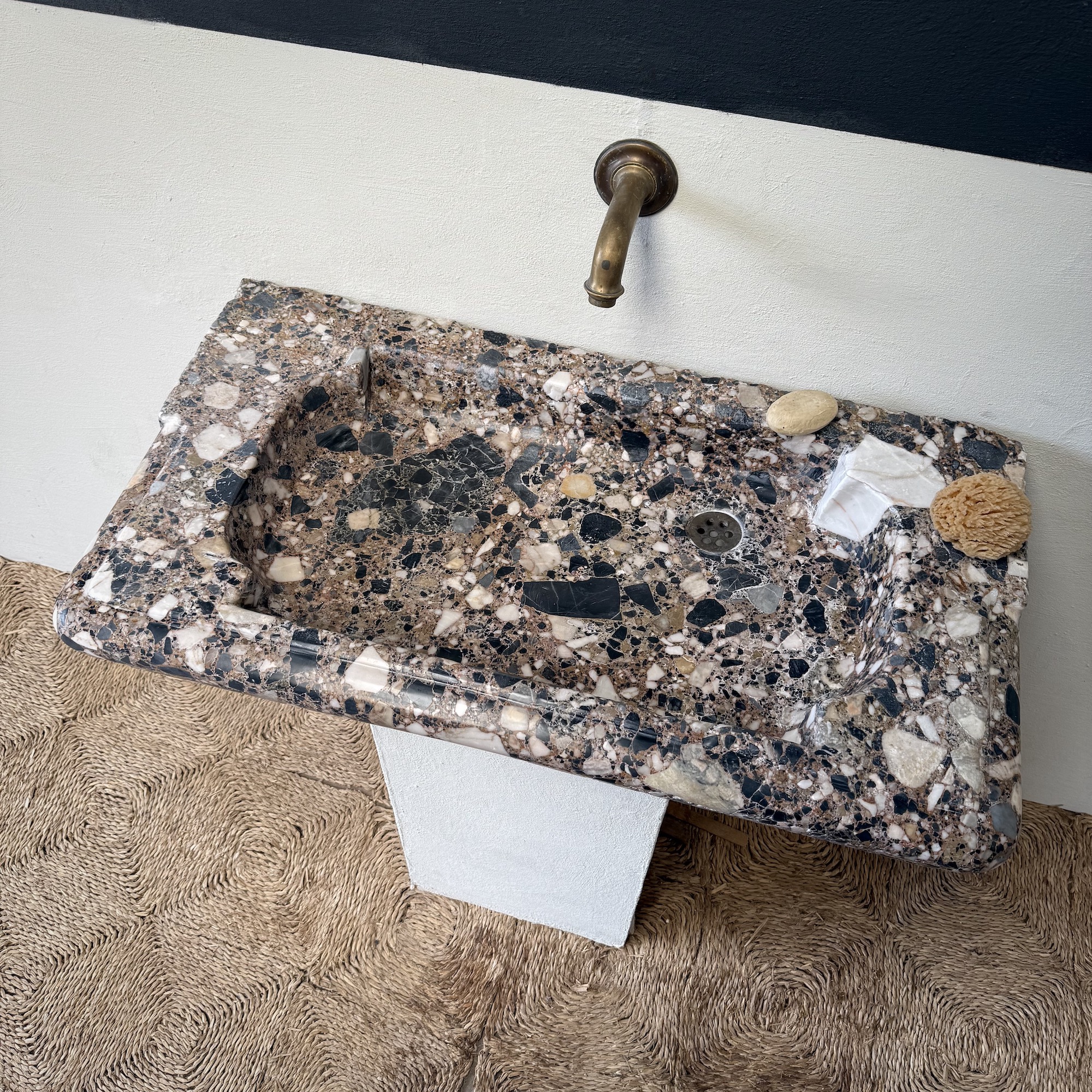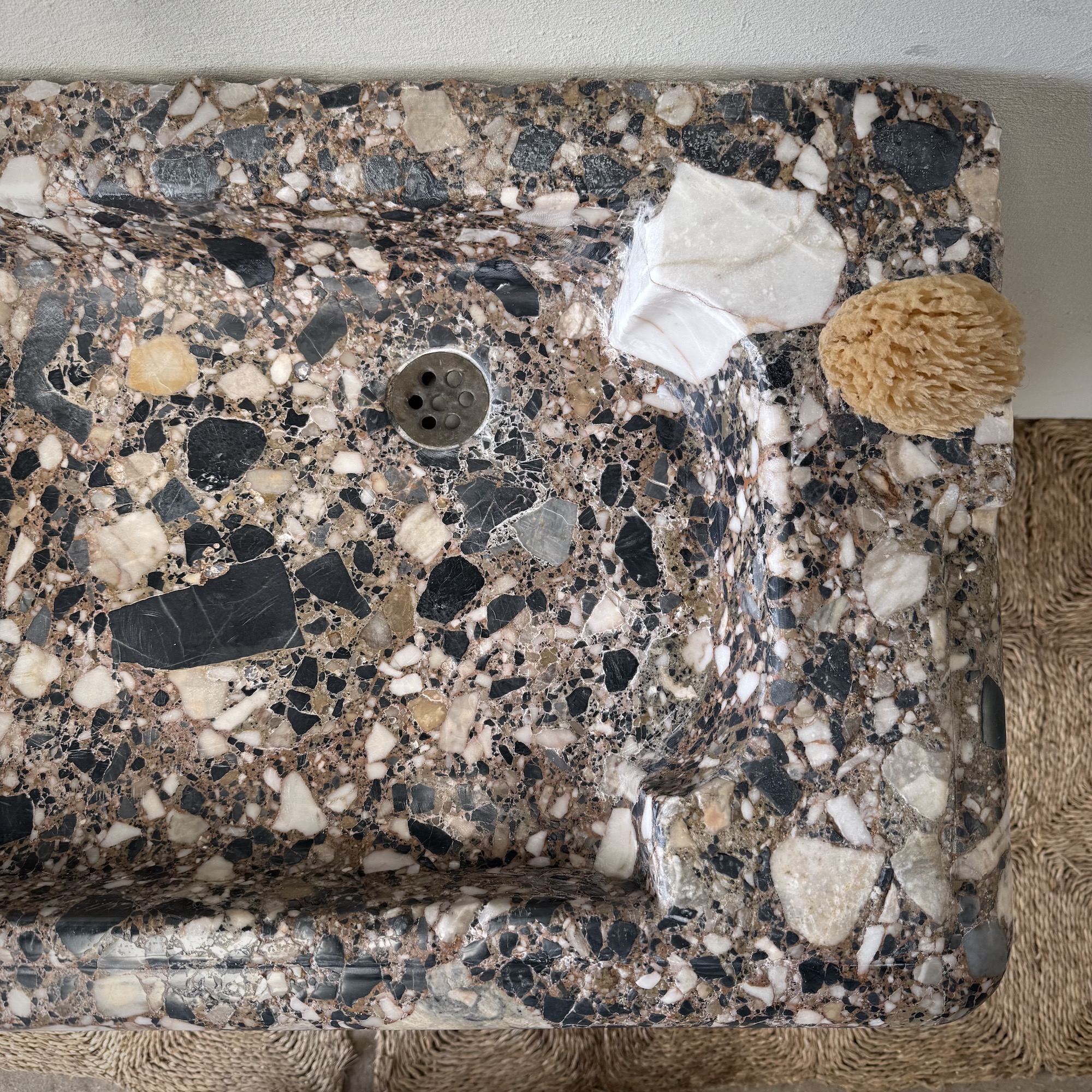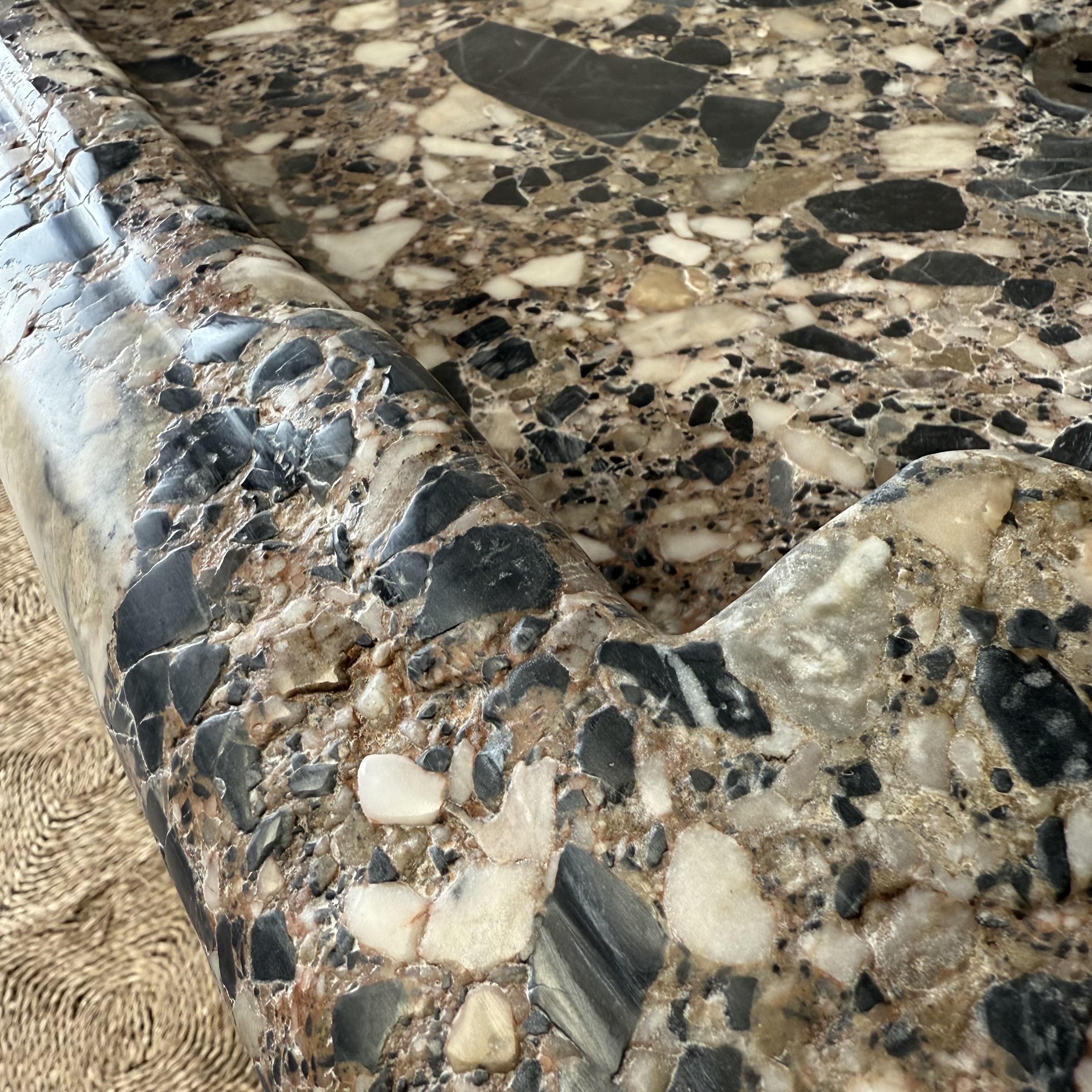 A particularly fine and rare 18th century sink carved from richly figured Breccia marble, known as Brèche de Baixas, formerly quarried in southern France. The marble displays a striking natural composition of black, white, beige, and warm brown fragments, giving the surface a vivid and decorative appearance characteristic of this prized stone.