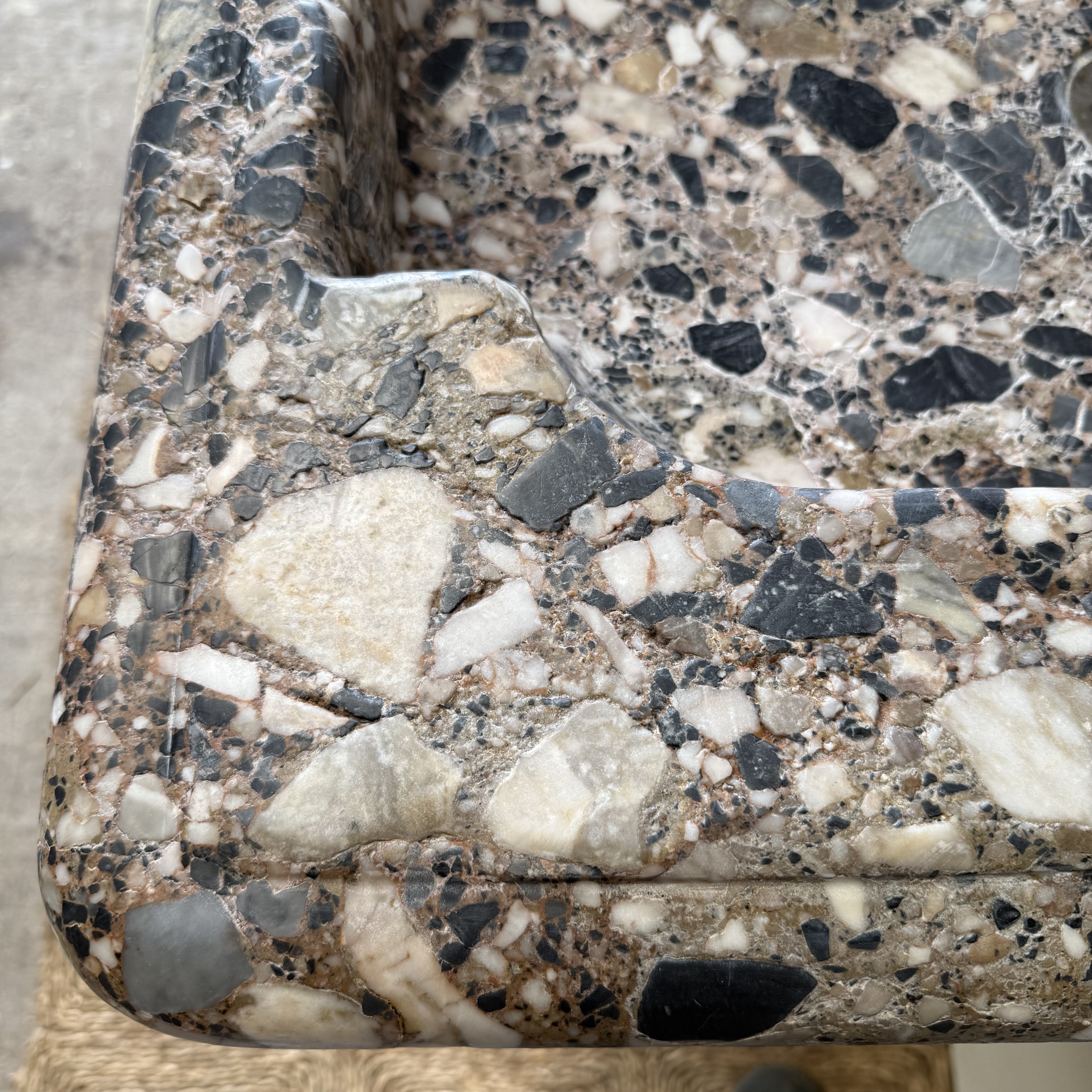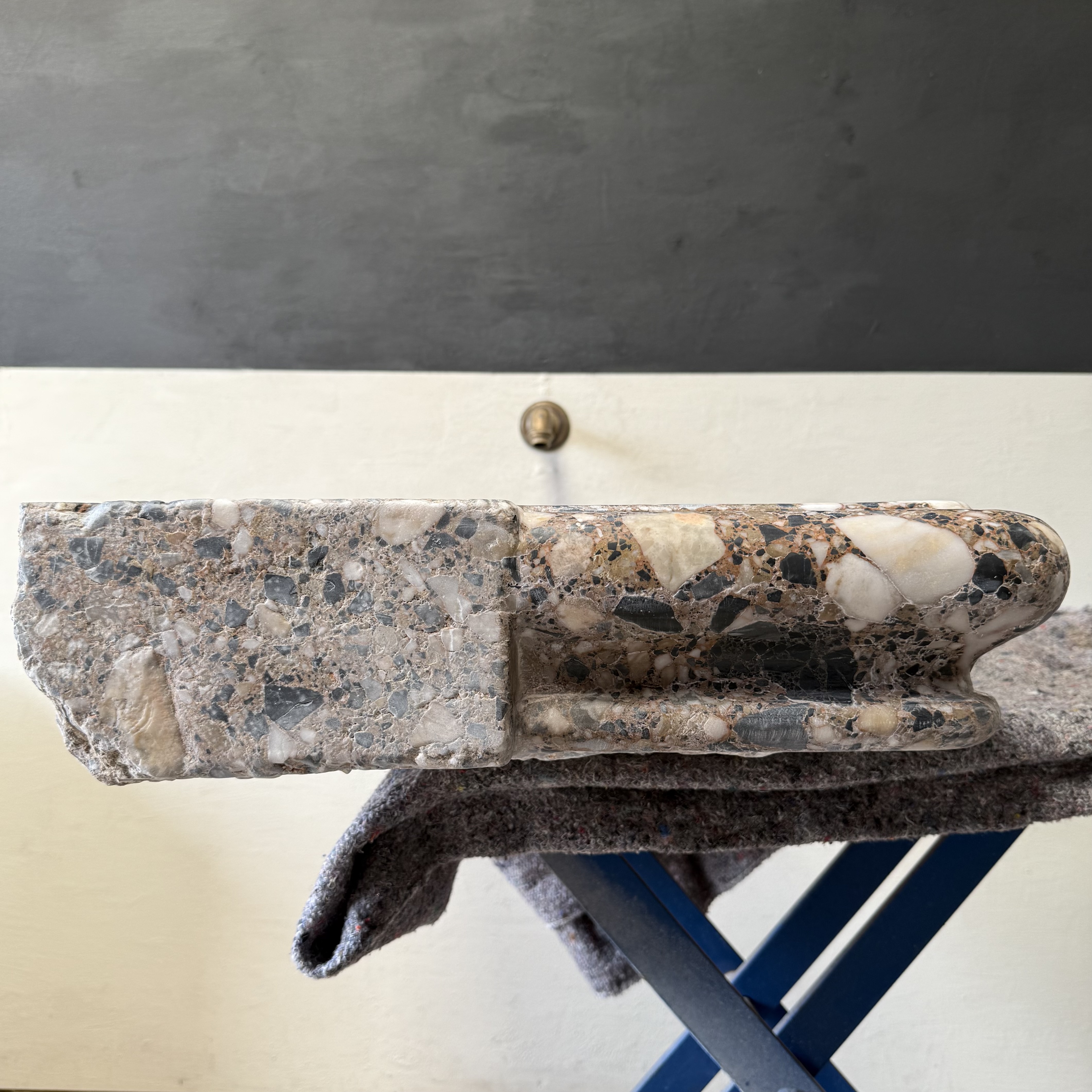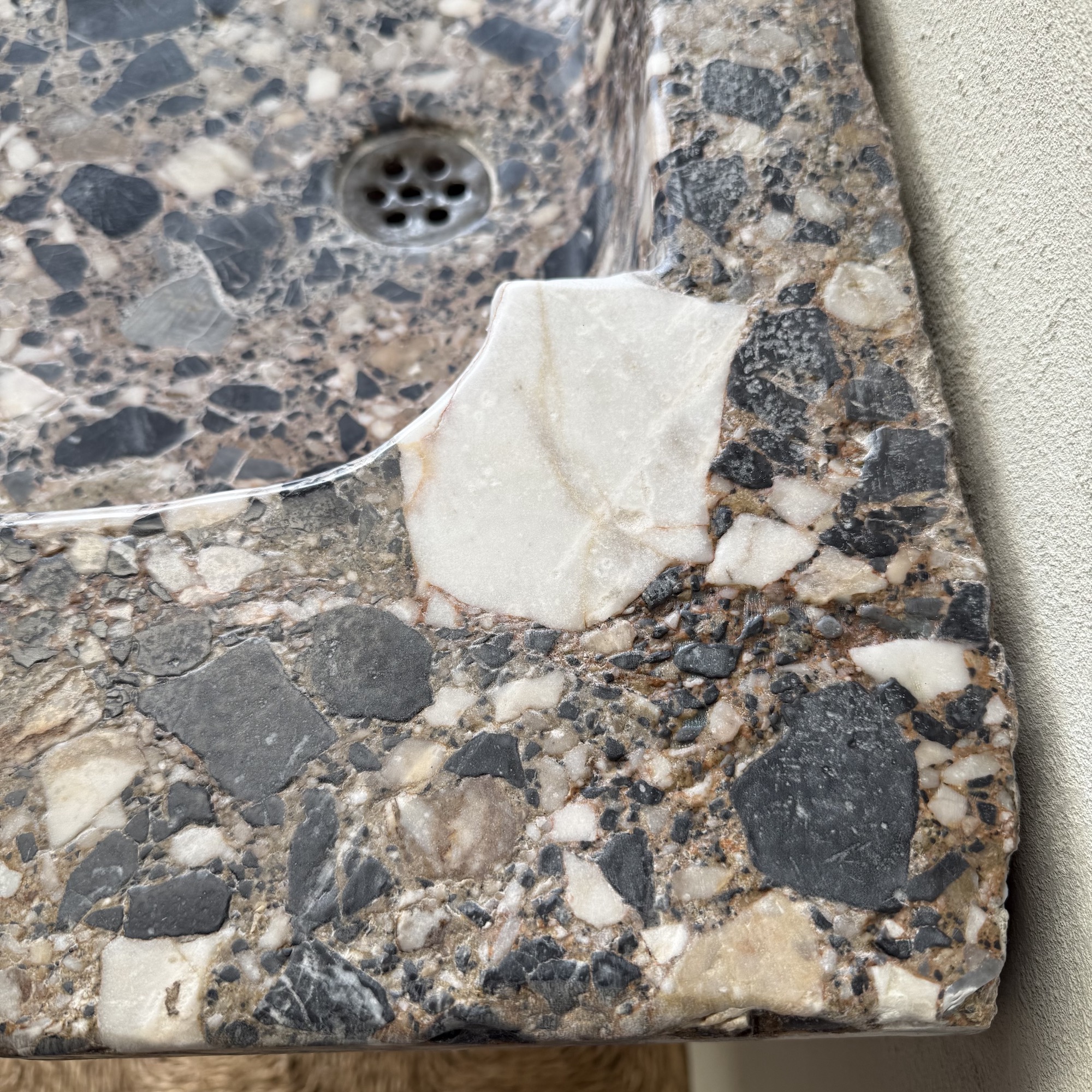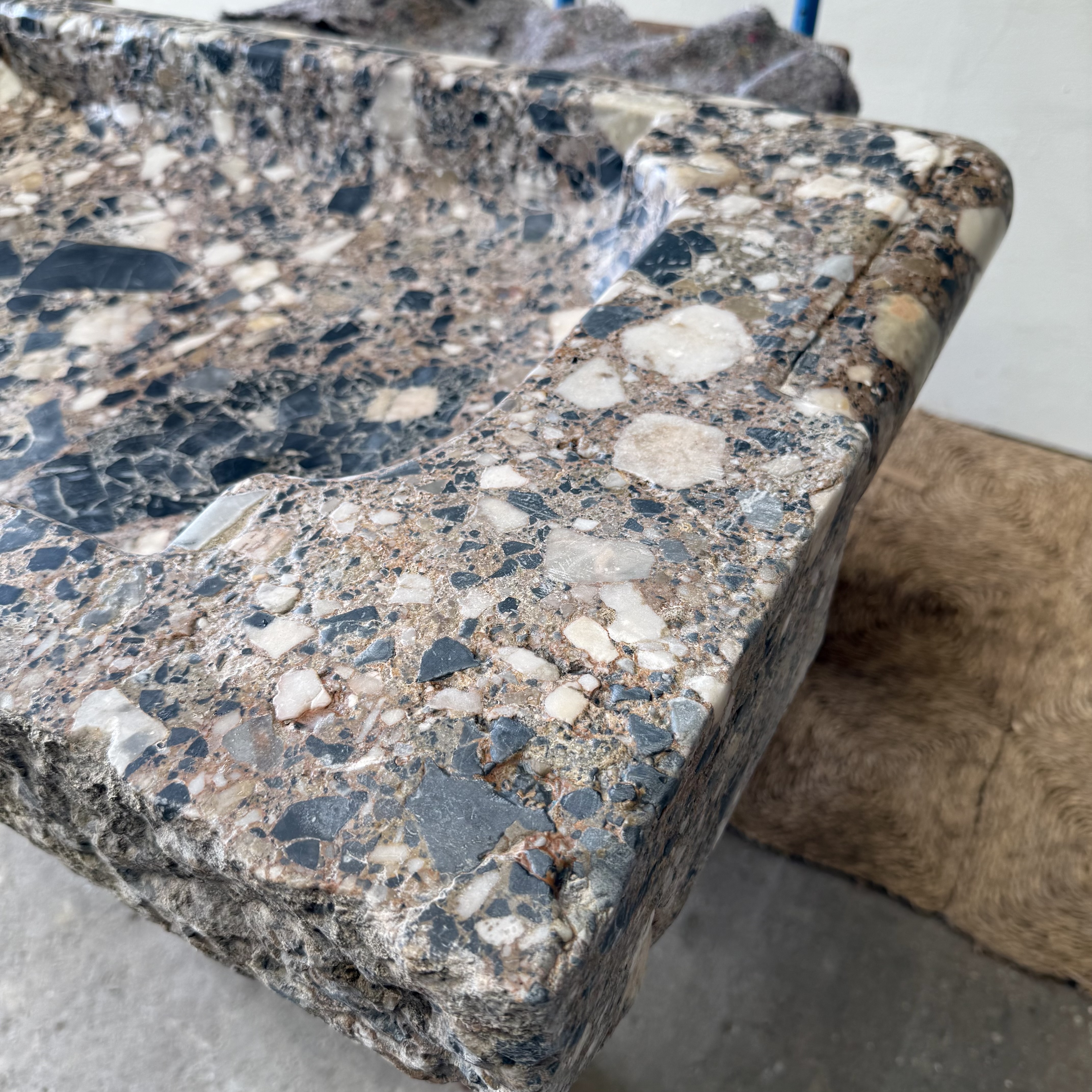 A particularly fine and rare 18th century sink carved from richly figured Breccia marble, known as Brèche de Baixas, formerly quarried in southern France. The marble displays a striking natural composition of black, white, beige, and warm brown fragments, giving the surface a vivid and decorative appearance characteristic of this prized stone.
