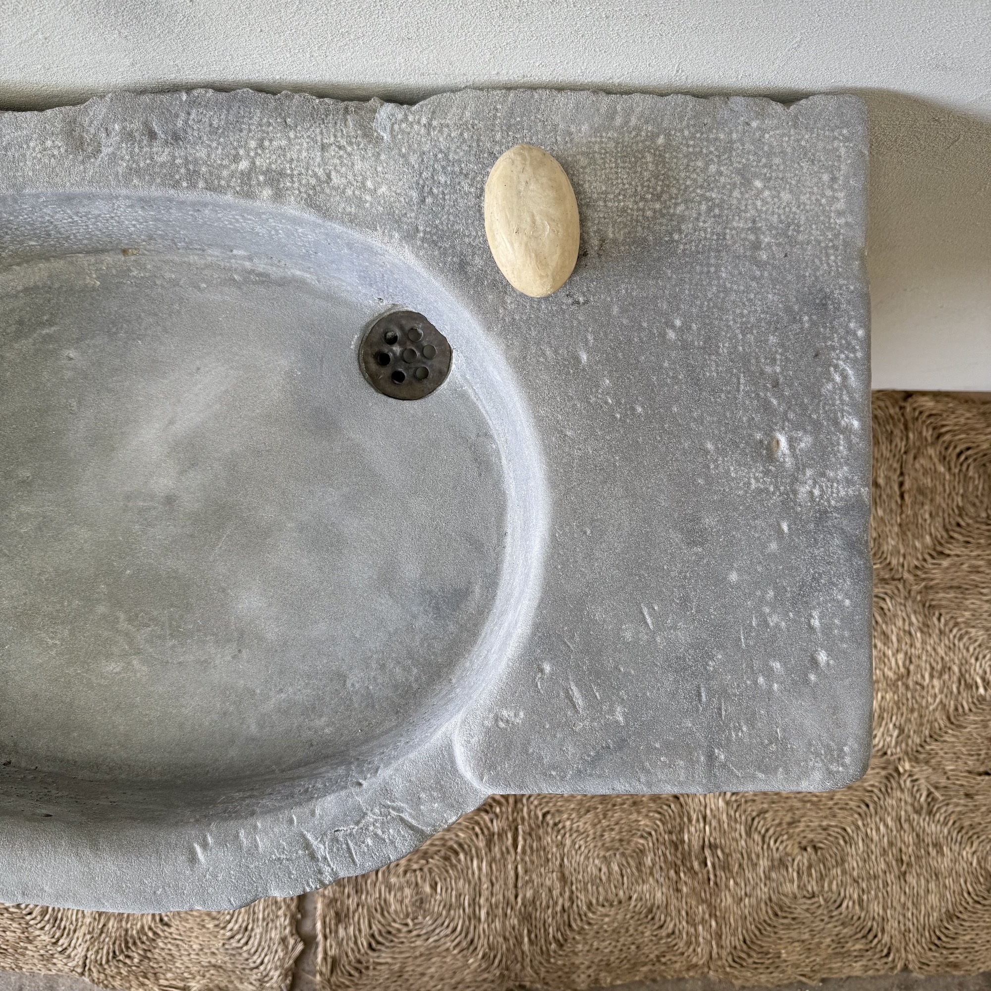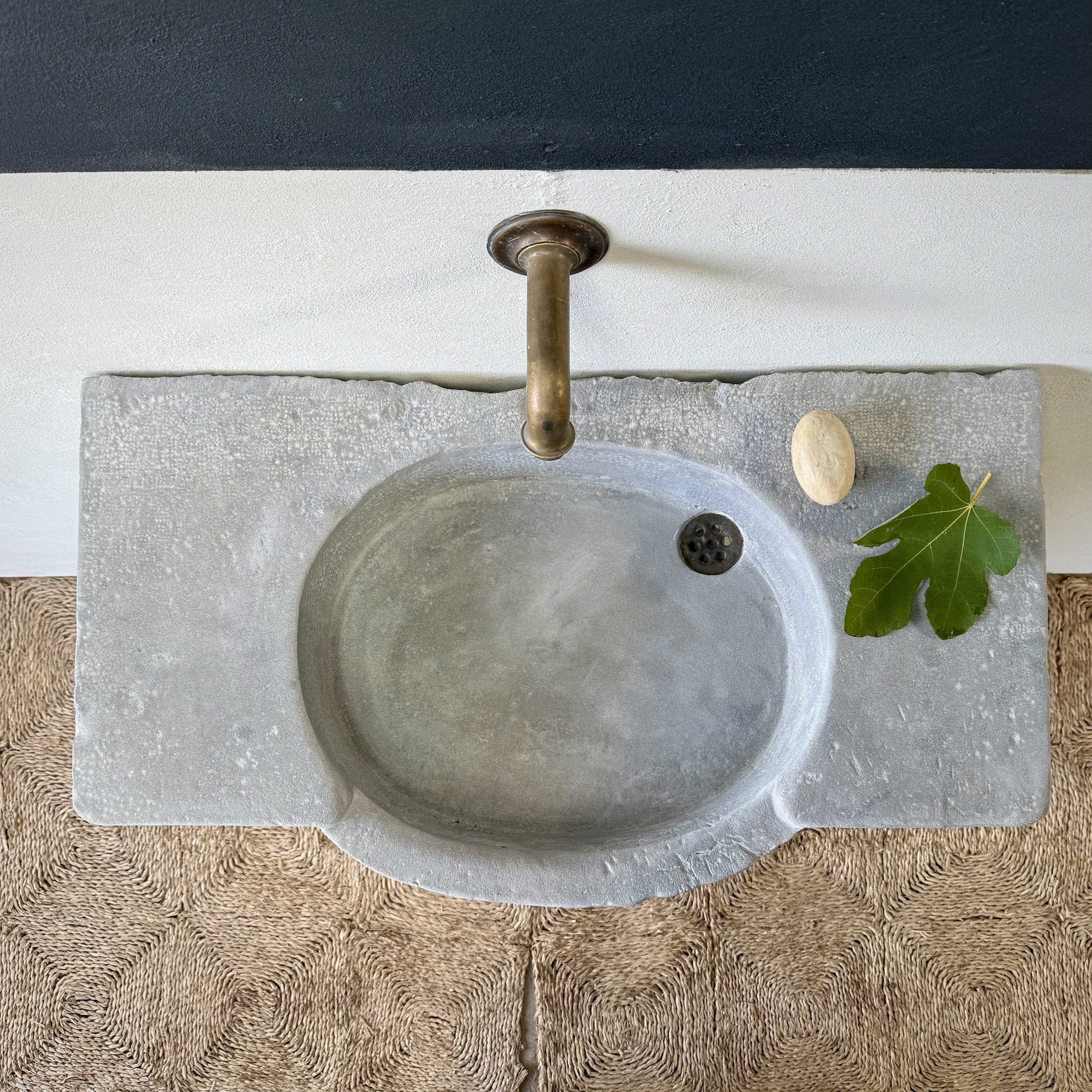 A rare, 18th century French limestone sink, of sculptural form, the sink carved from a single block of limestone with a central oval basin flanked by two integral drainboards, each gently tapering towards the centre. The front edge slightly lowered, the design achieving a harmonious balance between function and elegance. The stone exhibits a fine, timeworn surface with subtle tool marks and a natural patina accrued over centuries of use.