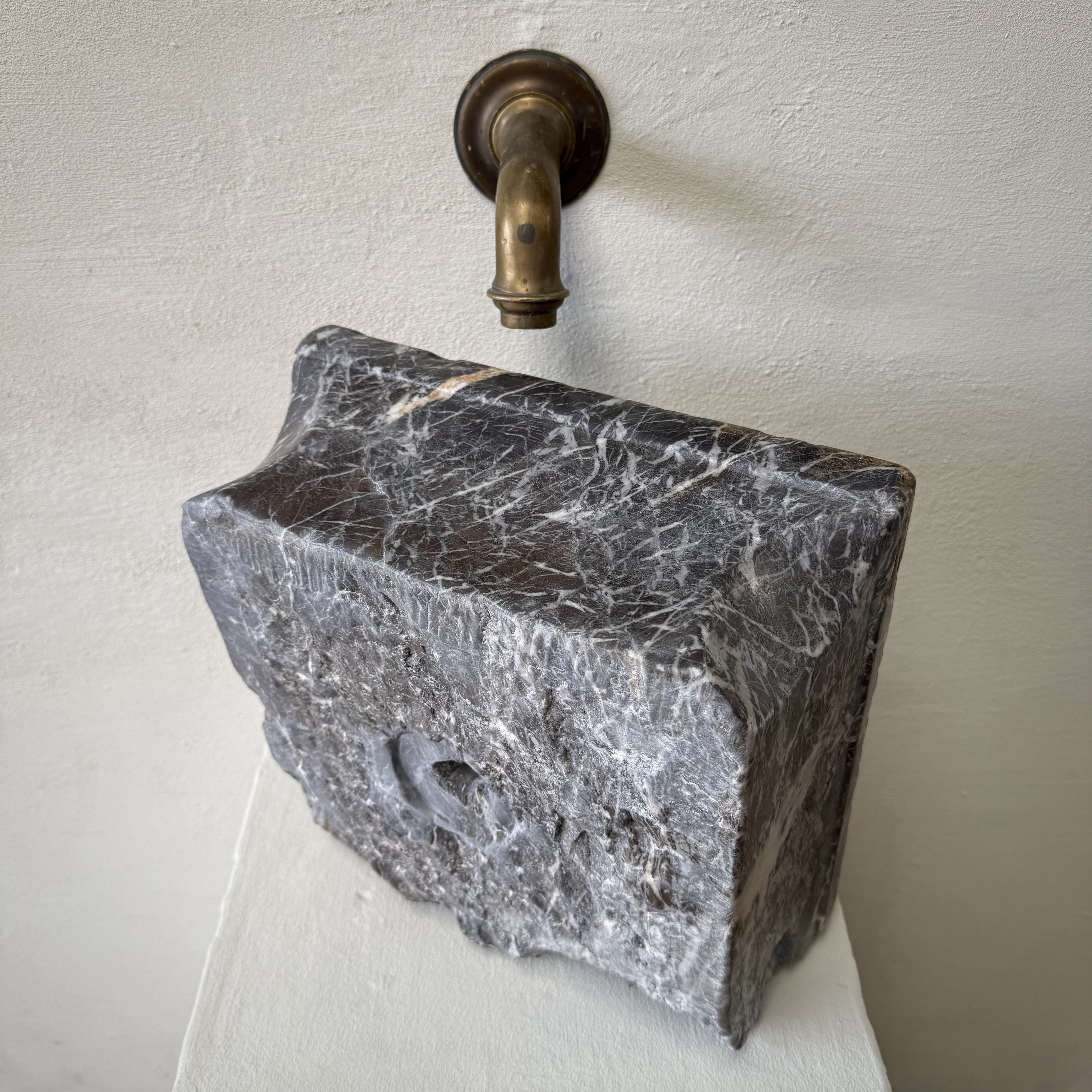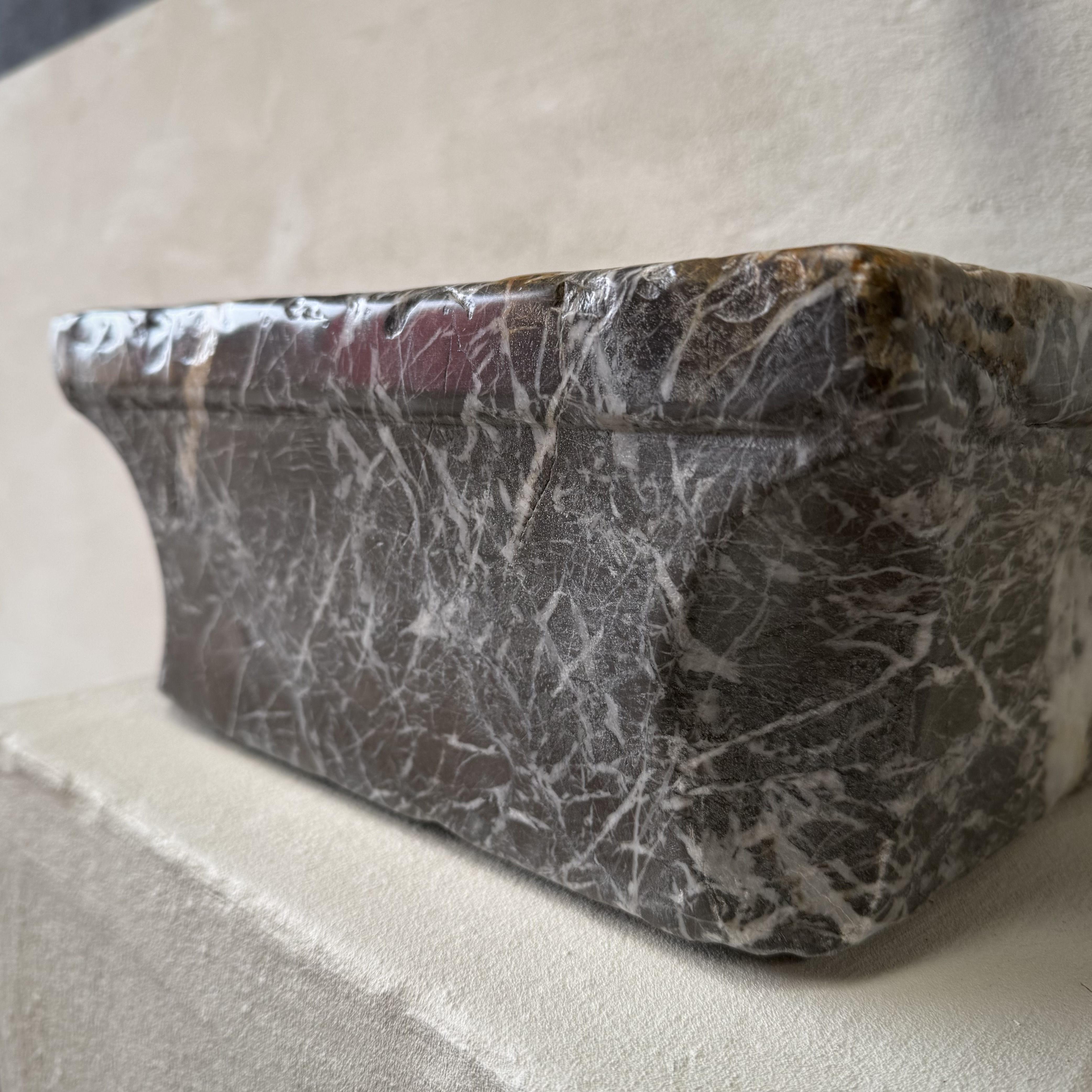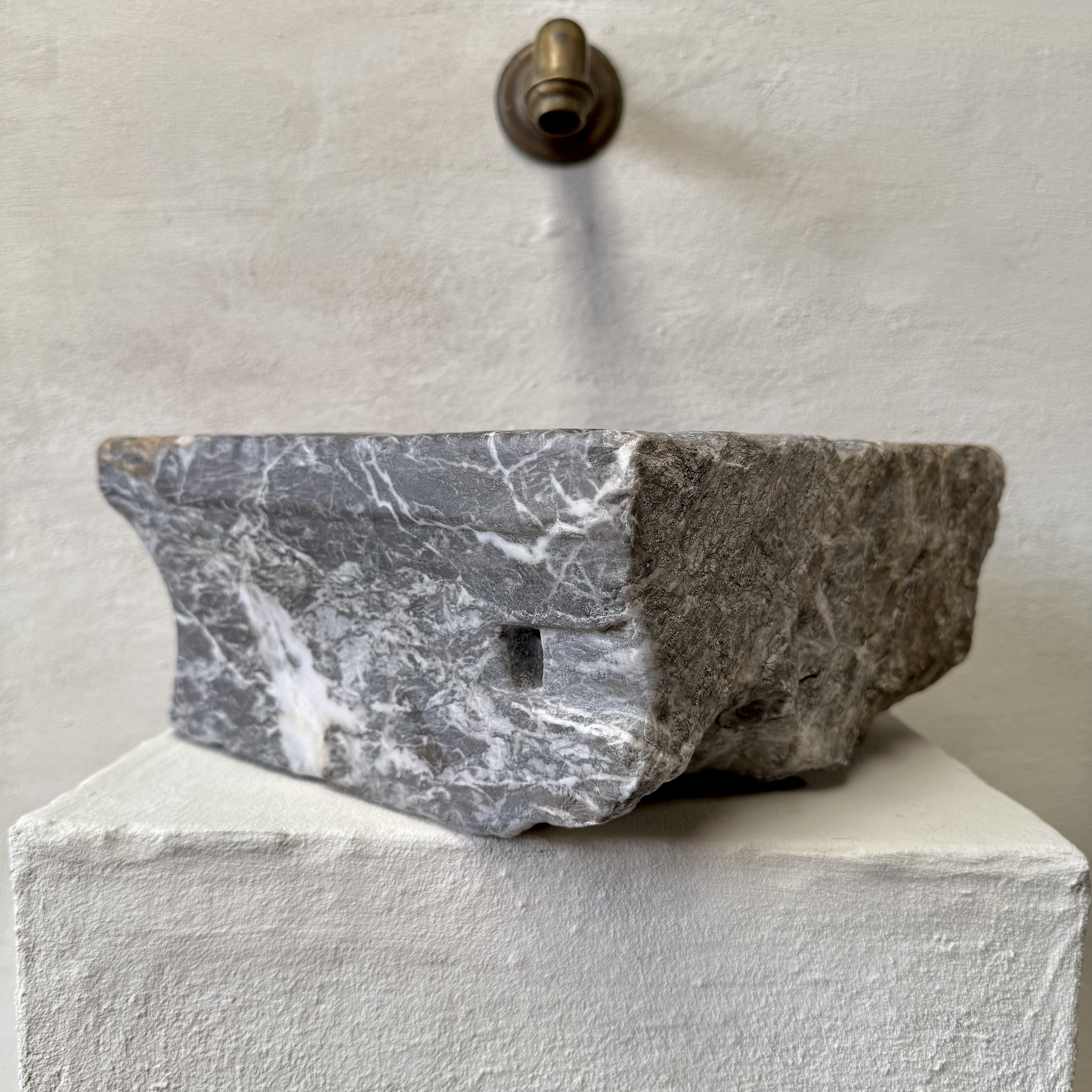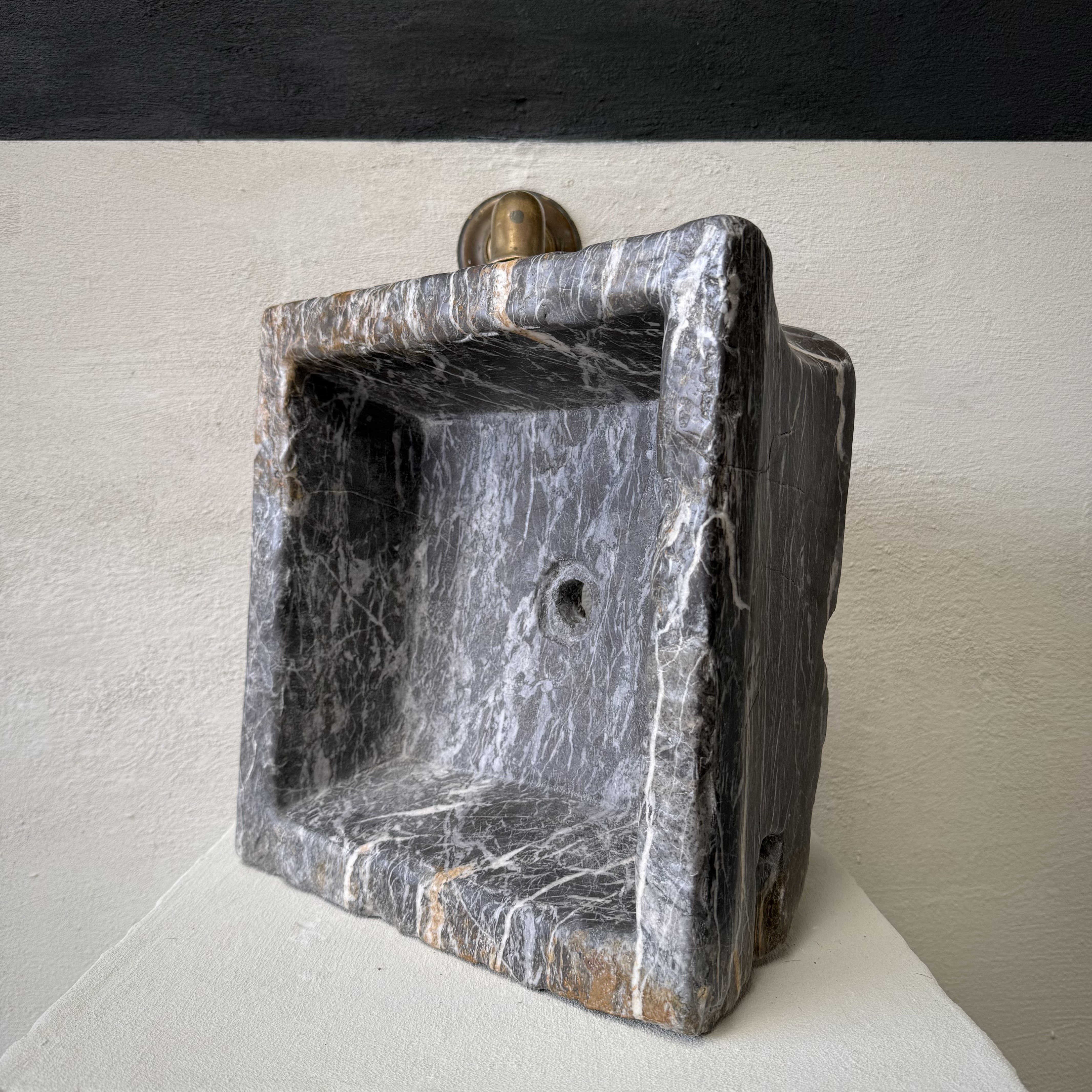 An 18th-century wall-mounted sink carved from Gris des Ardennes marble, featuring a square form with a slightly tapered body and two concave cut-away corners to the front. The dark grey marble is richly veined with white and subtle ochre tones.