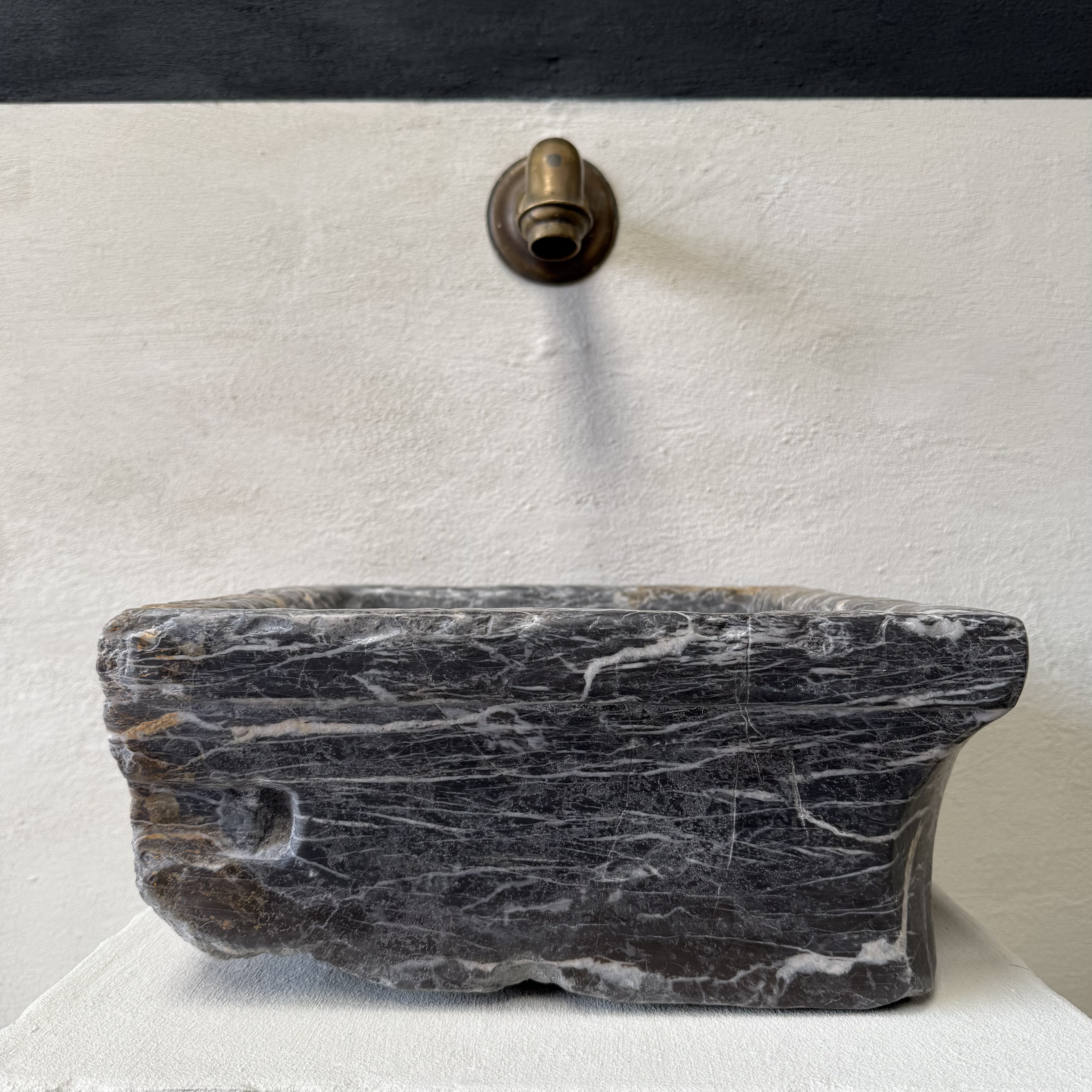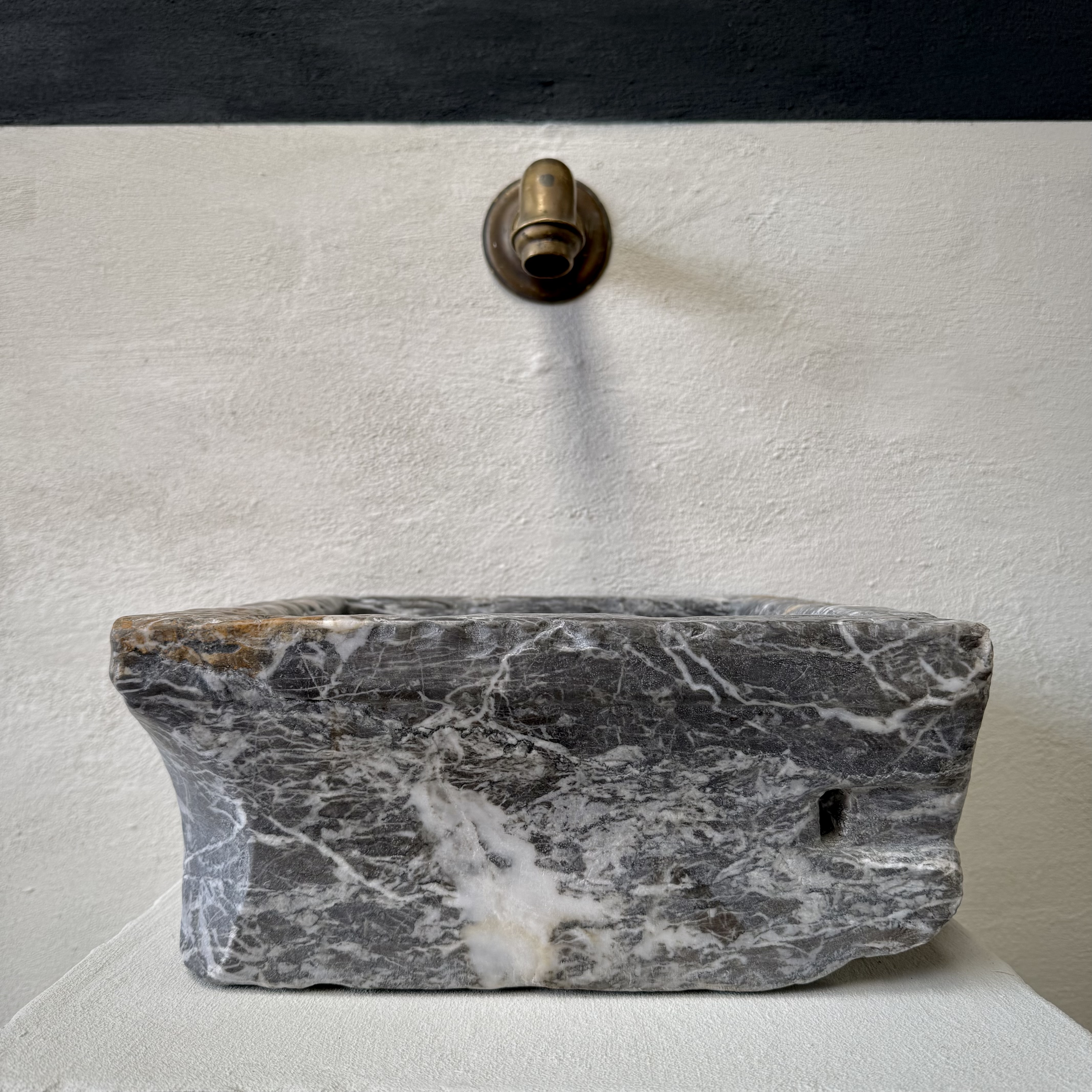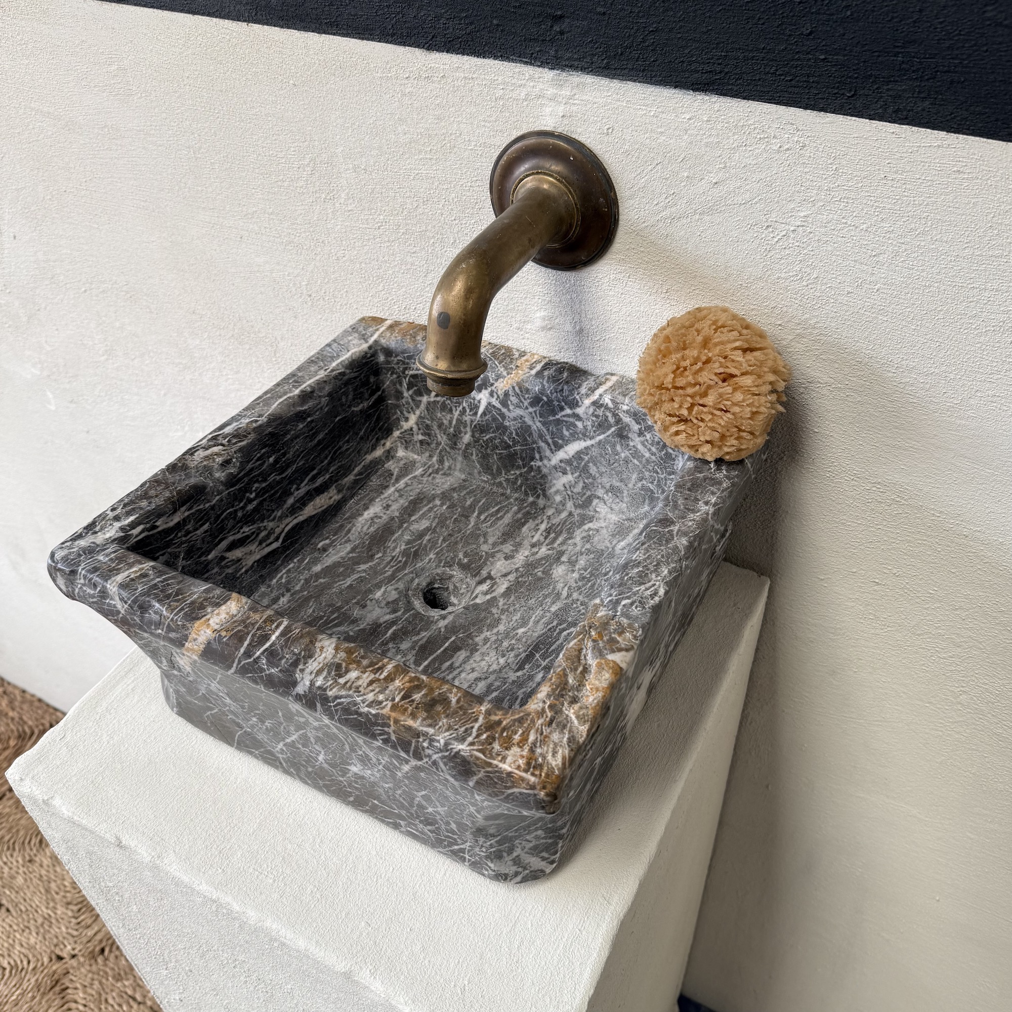 An 18th-century wall-mounted sink carved from Gris des Ardennes marble, featuring a square form with a slightly tapered body and two concave cut-away corners to the front. The dark grey marble is richly veined with white and subtle ochre tones.