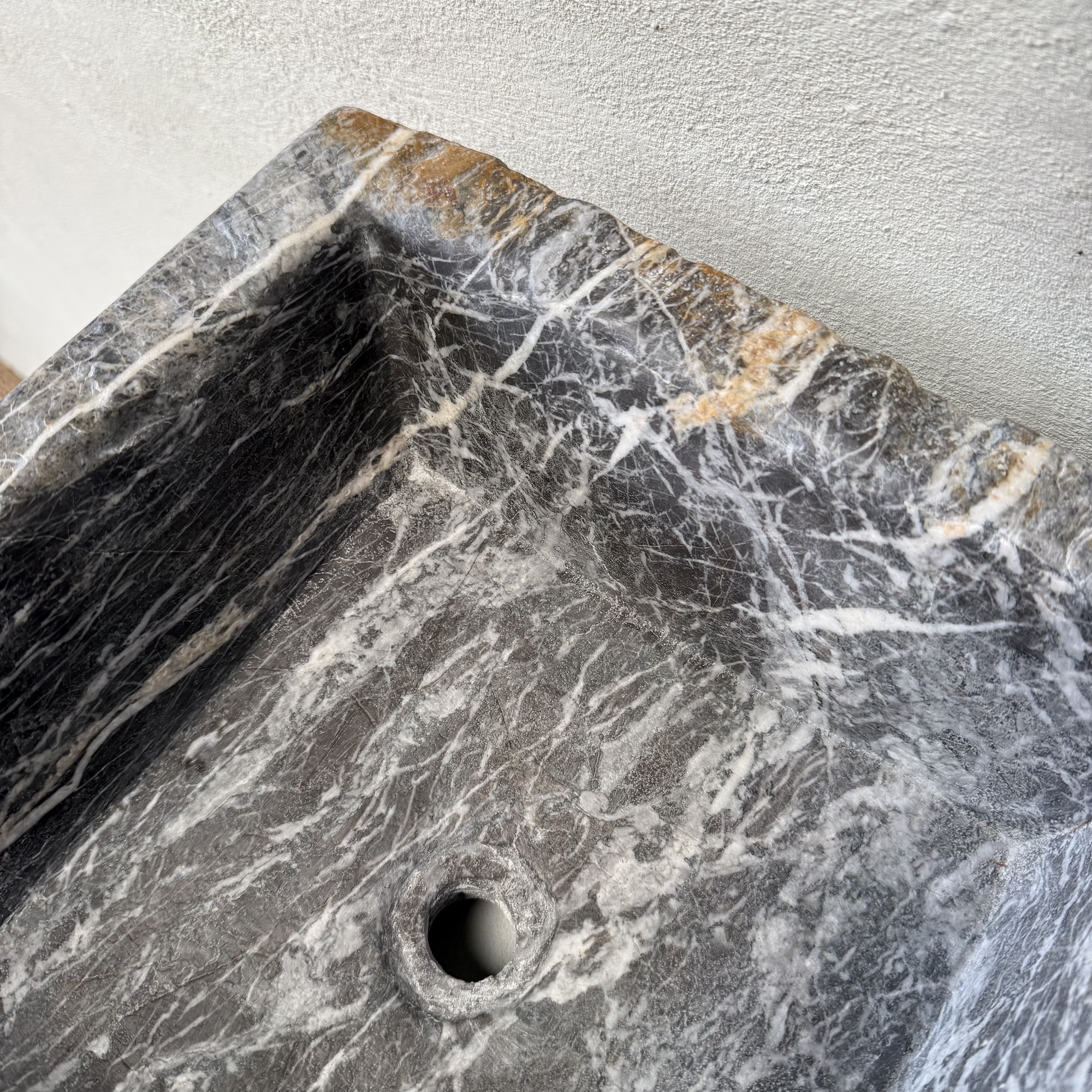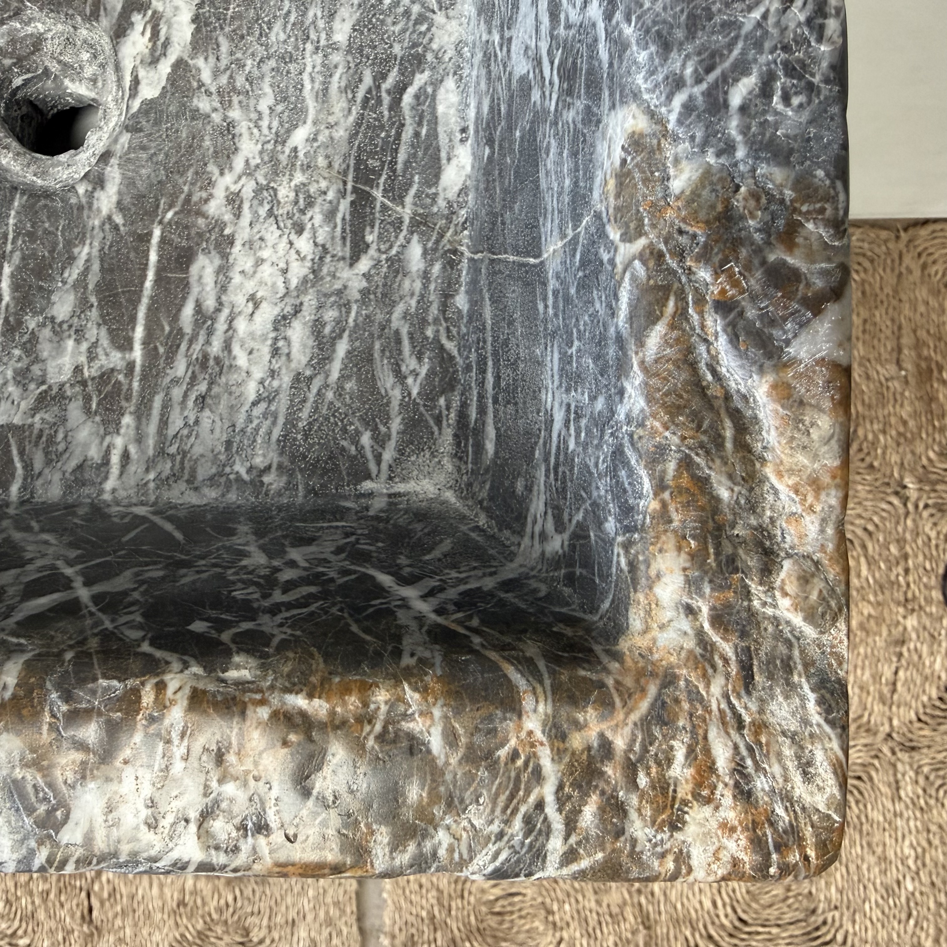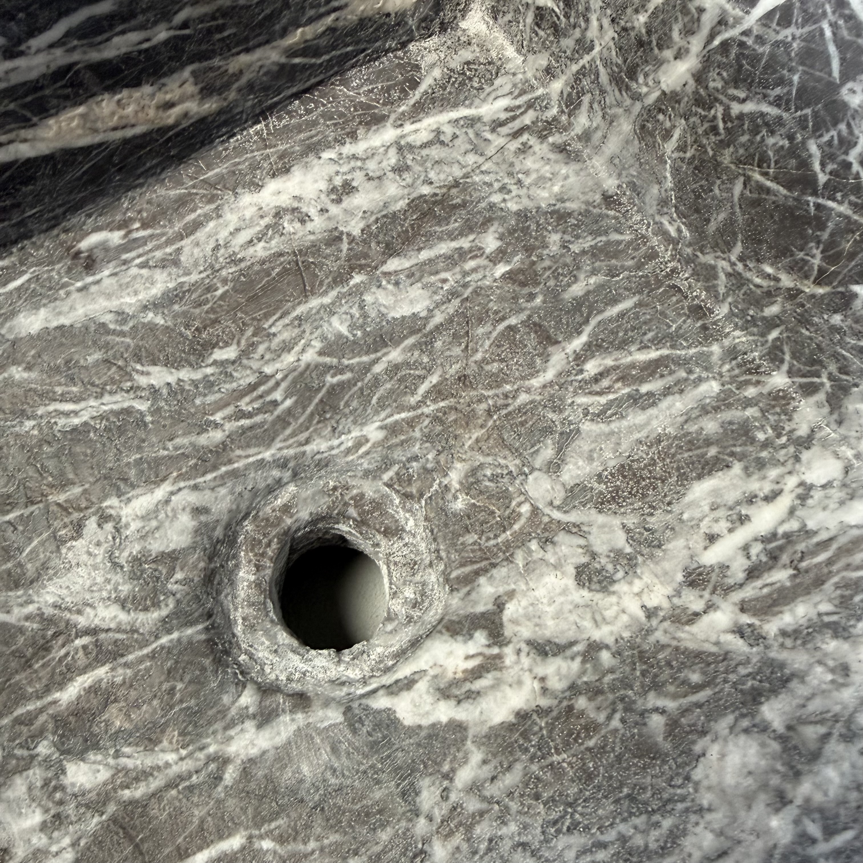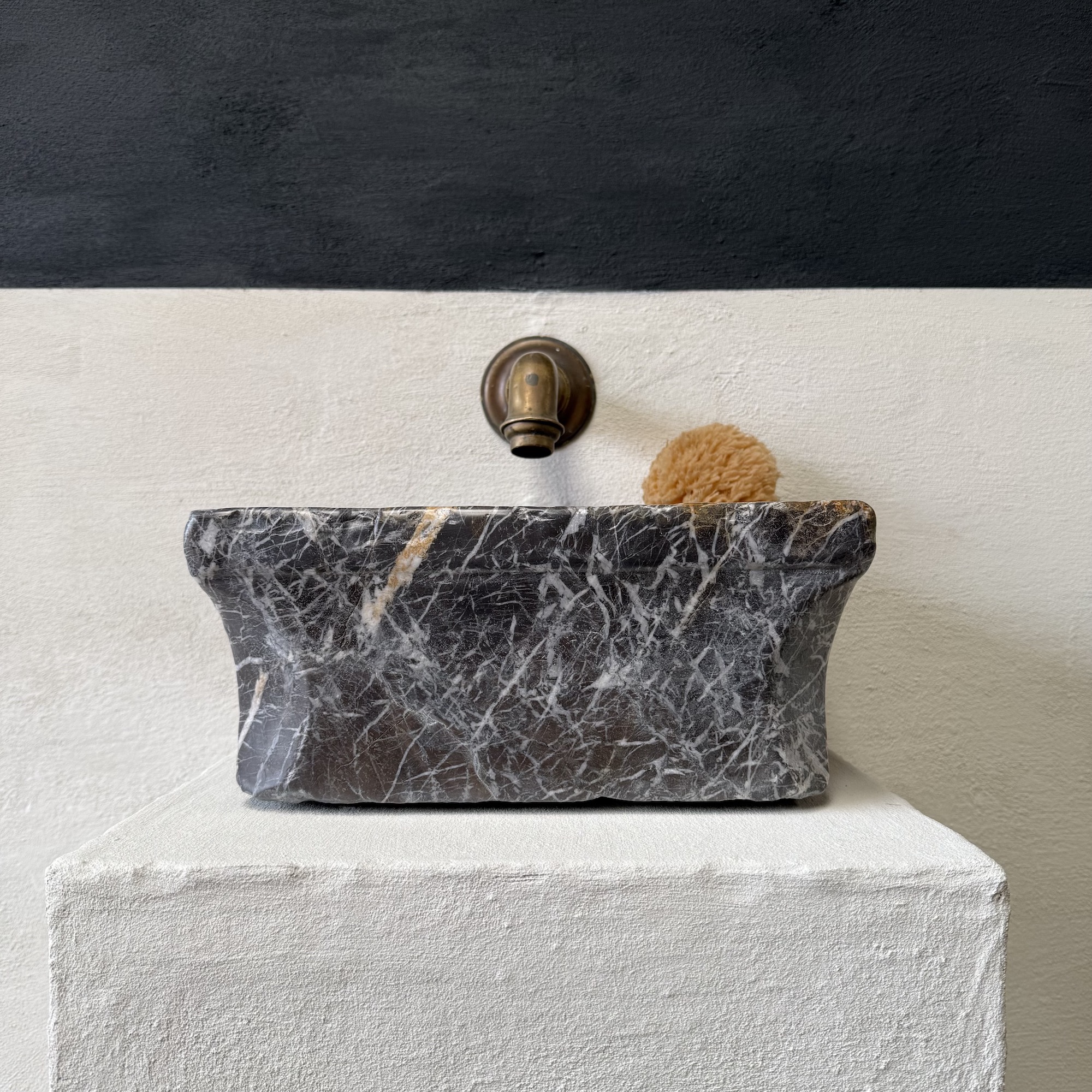 An 18th-century wall-mounted sink carved from Gris des Ardennes marble, featuring a square form with a slightly tapered body and two concave cut-away corners to the front. The dark grey marble is richly veined with white and subtle ochre tones.