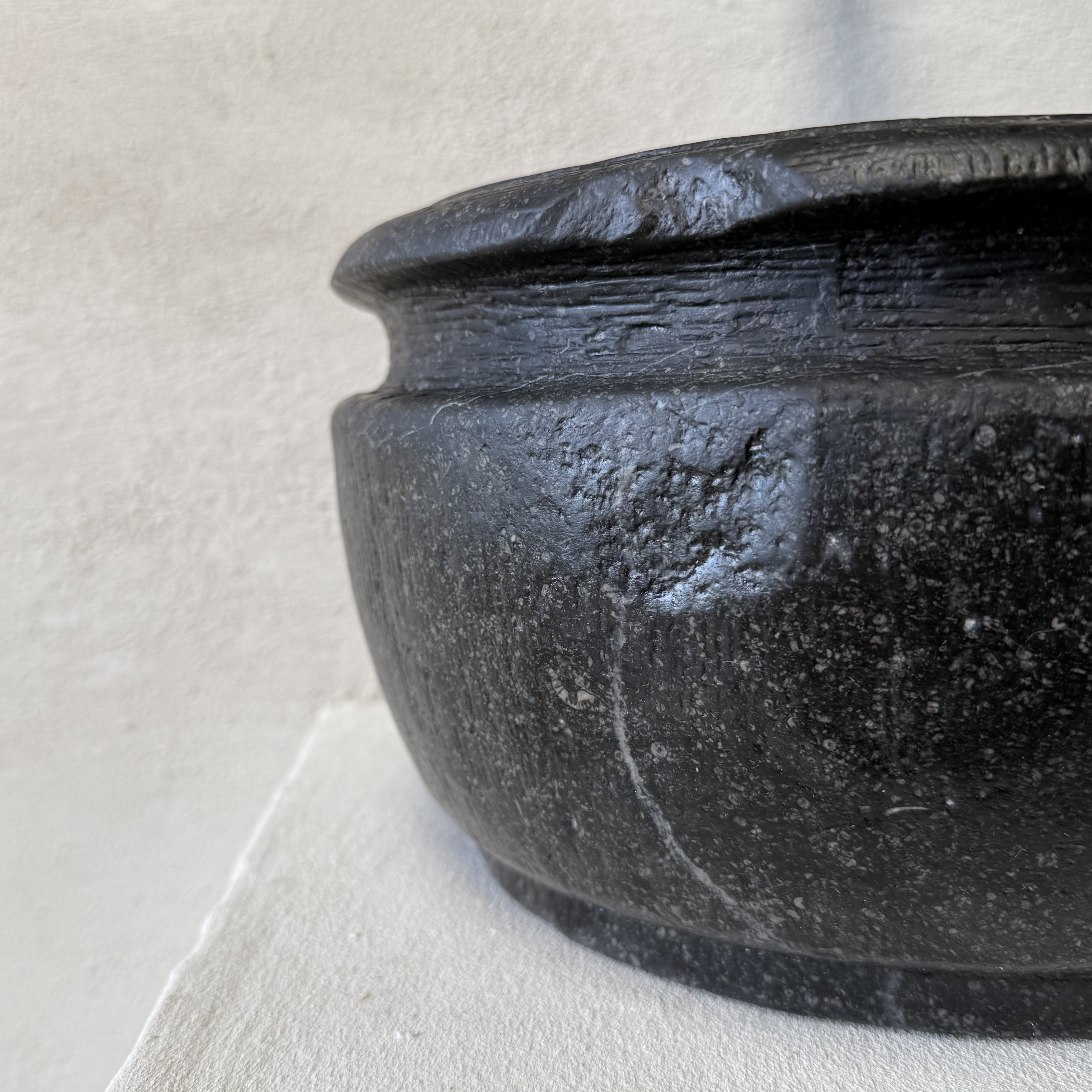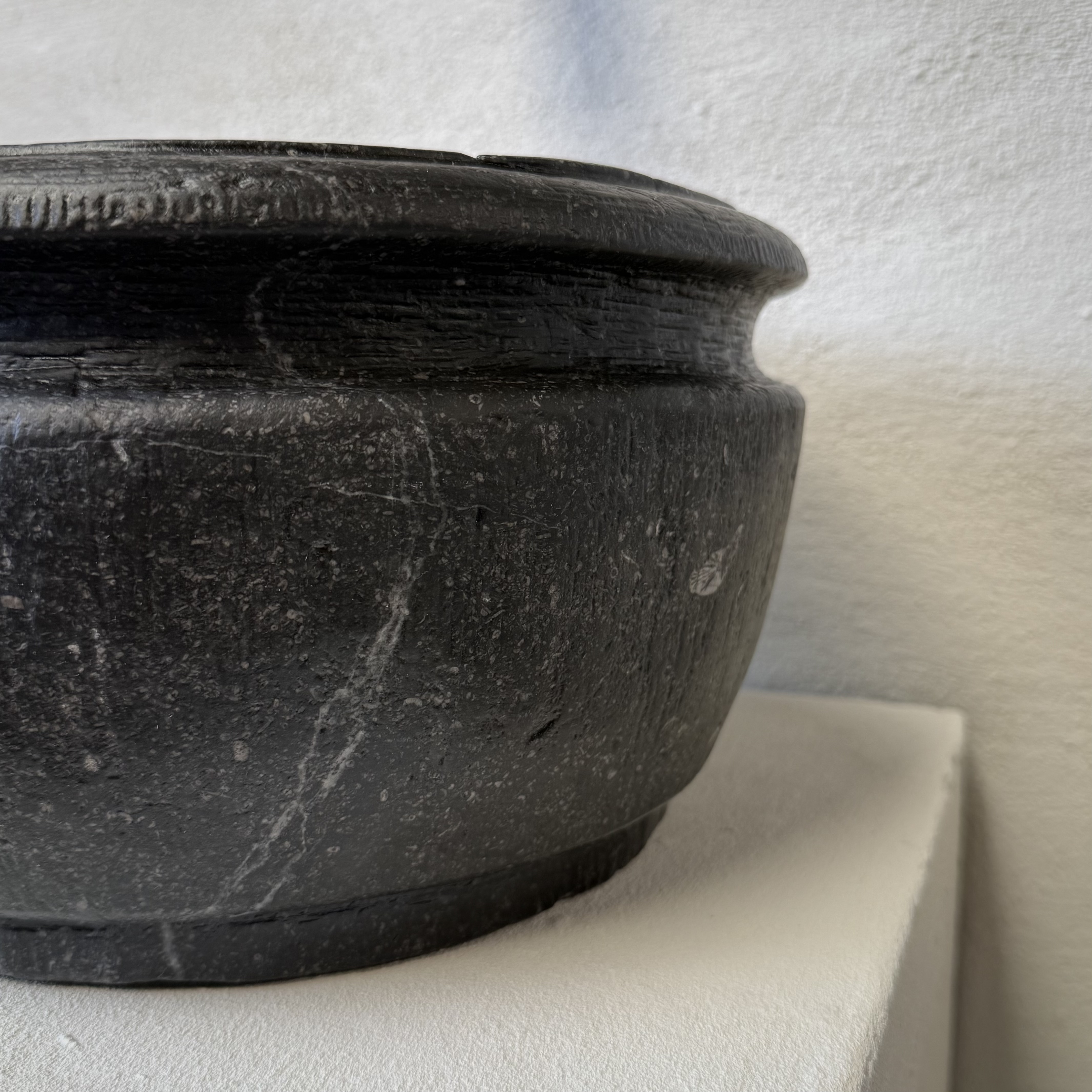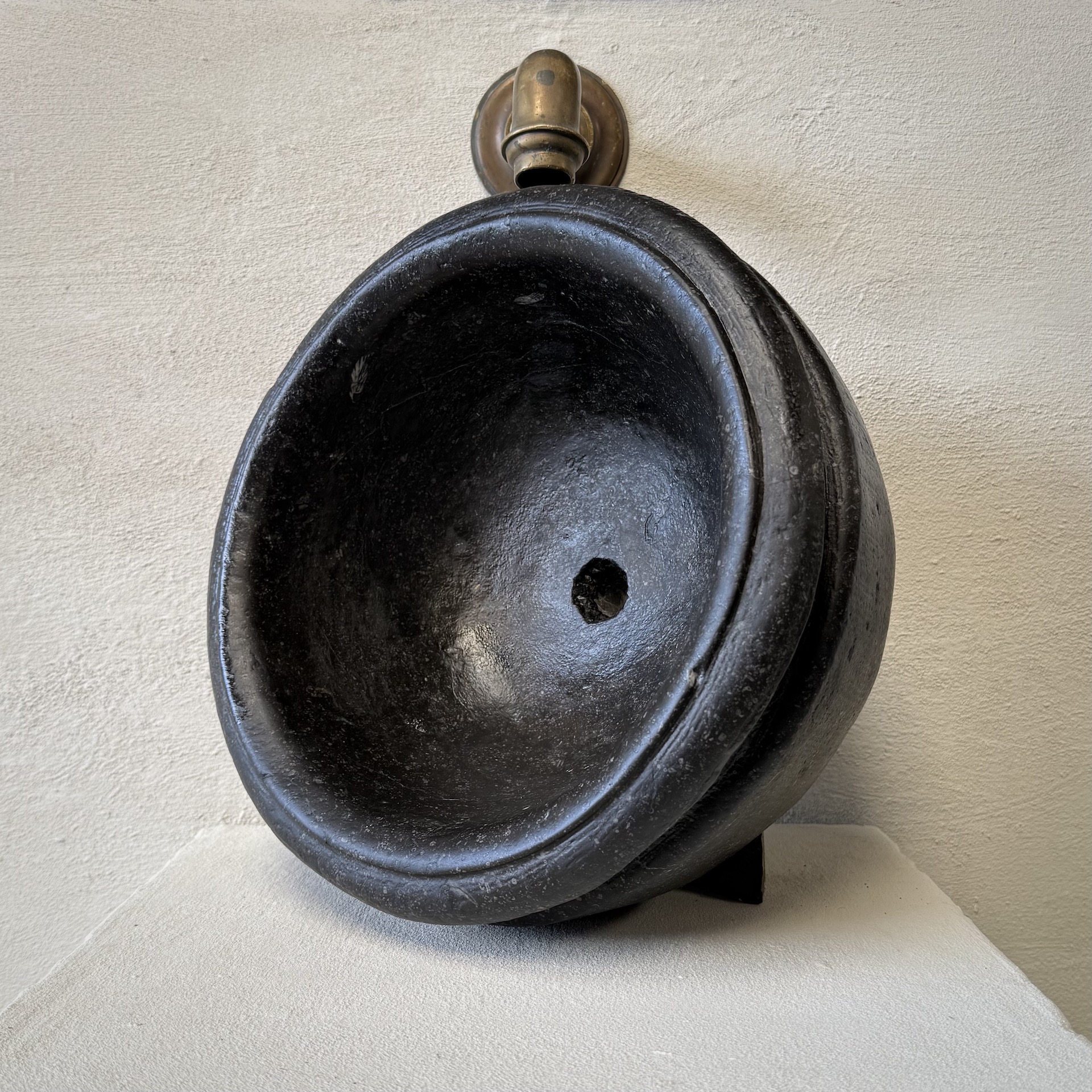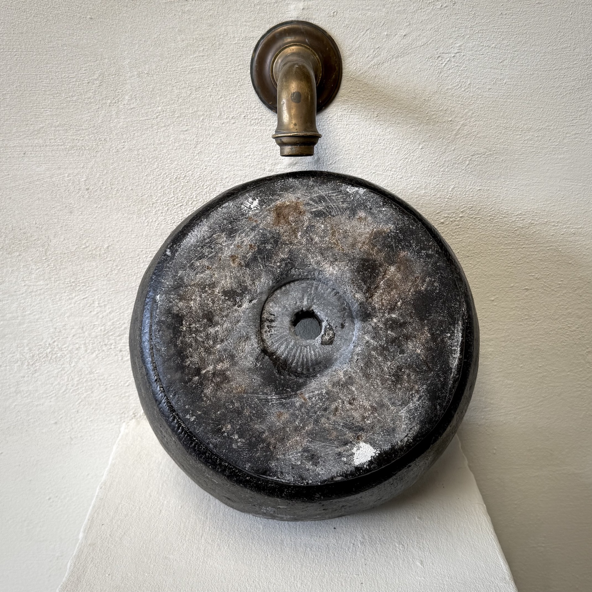 Rare circular Dutch stone font dating to the 18th century, carved from Petit Granit limestone. Featuring a beautifully moulded upper rim and a bowl-shaped body with a delicate, hand-chiseled surface throughout. The interior is smoothly finished, allowing for excellent water drainage. One minor loss to the upper rim (see images). Otherwise in excellent, sound, and fully usable condition, with no cracks or structural breaks. A highly characterful and authentic piece of early Dutch stonework.