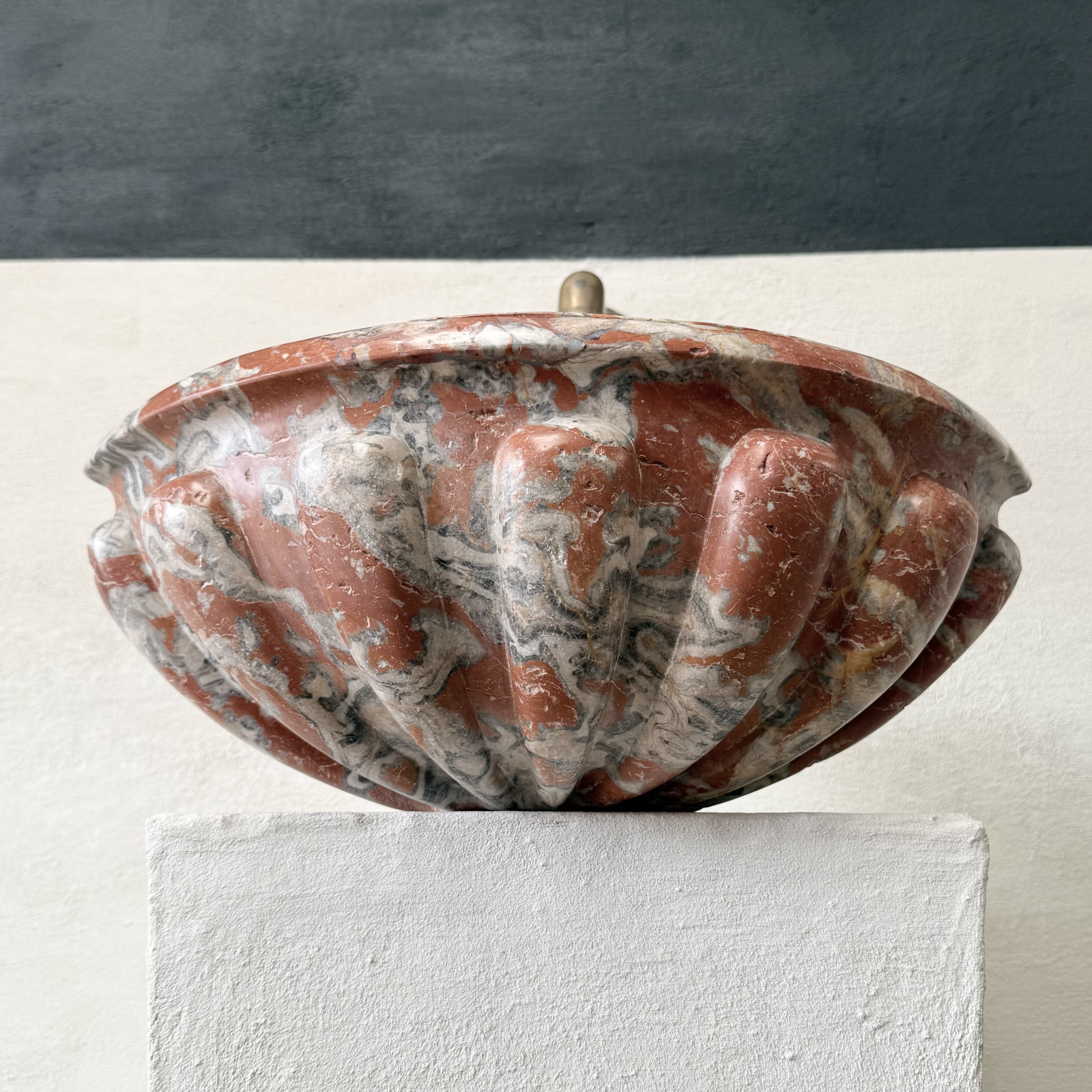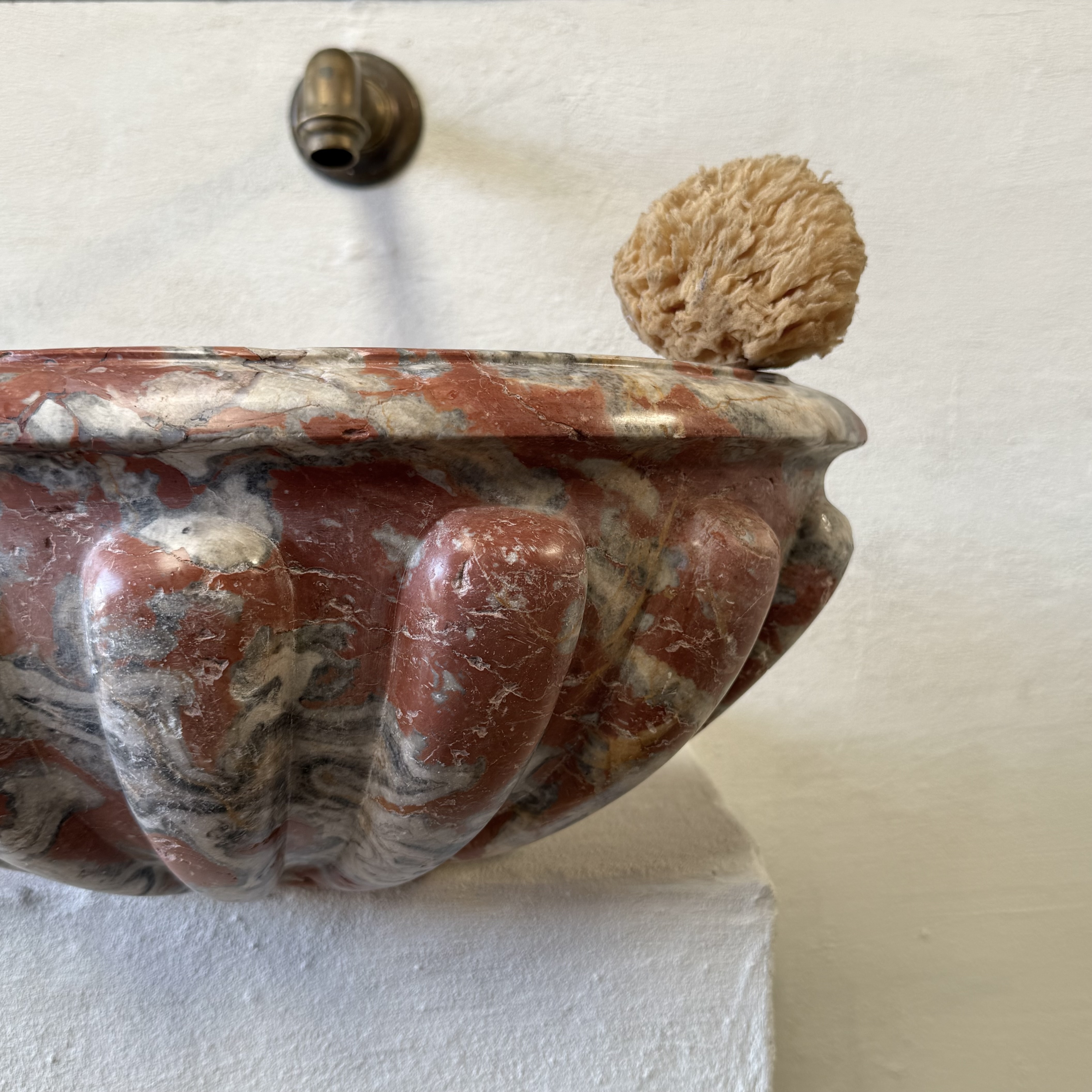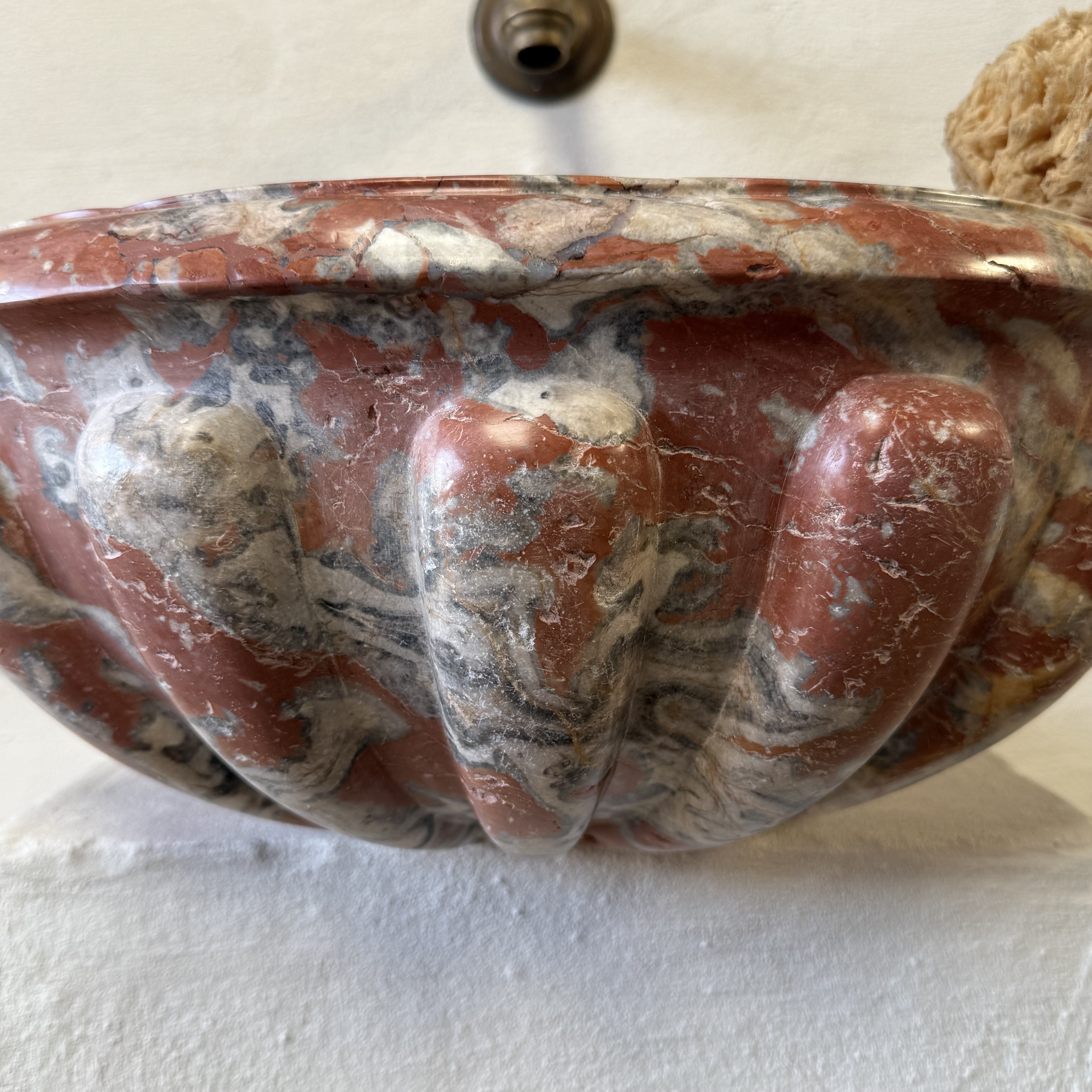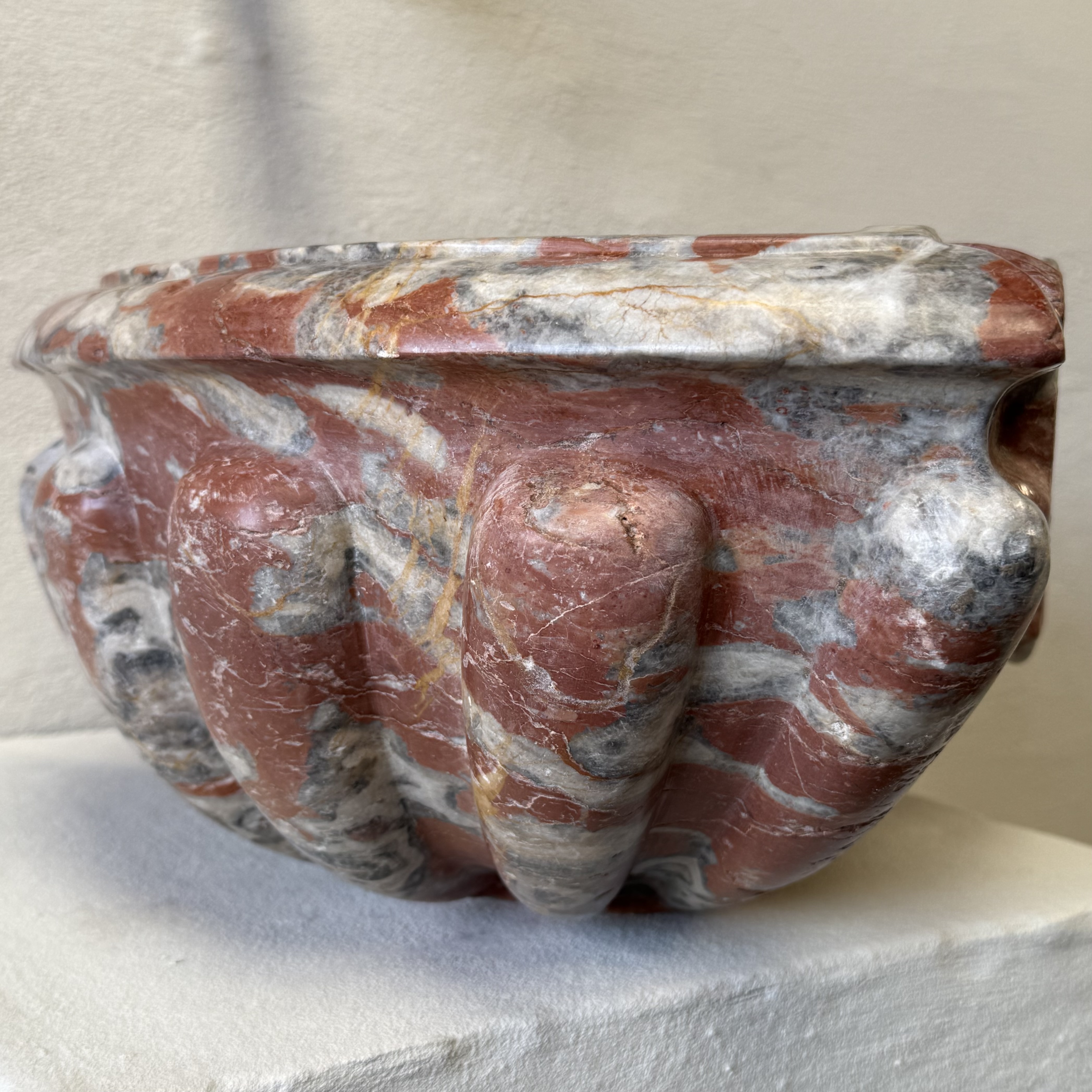 Rare late 17th / early 18th century French quarter-round corner basin, finely carved from richly veined Incarnat turquin marble. The basin features a deep, well-proportioned bowl and a boldly sculpted exterior with pronounced gadroons, showcasing the depth and movement of the marble.
