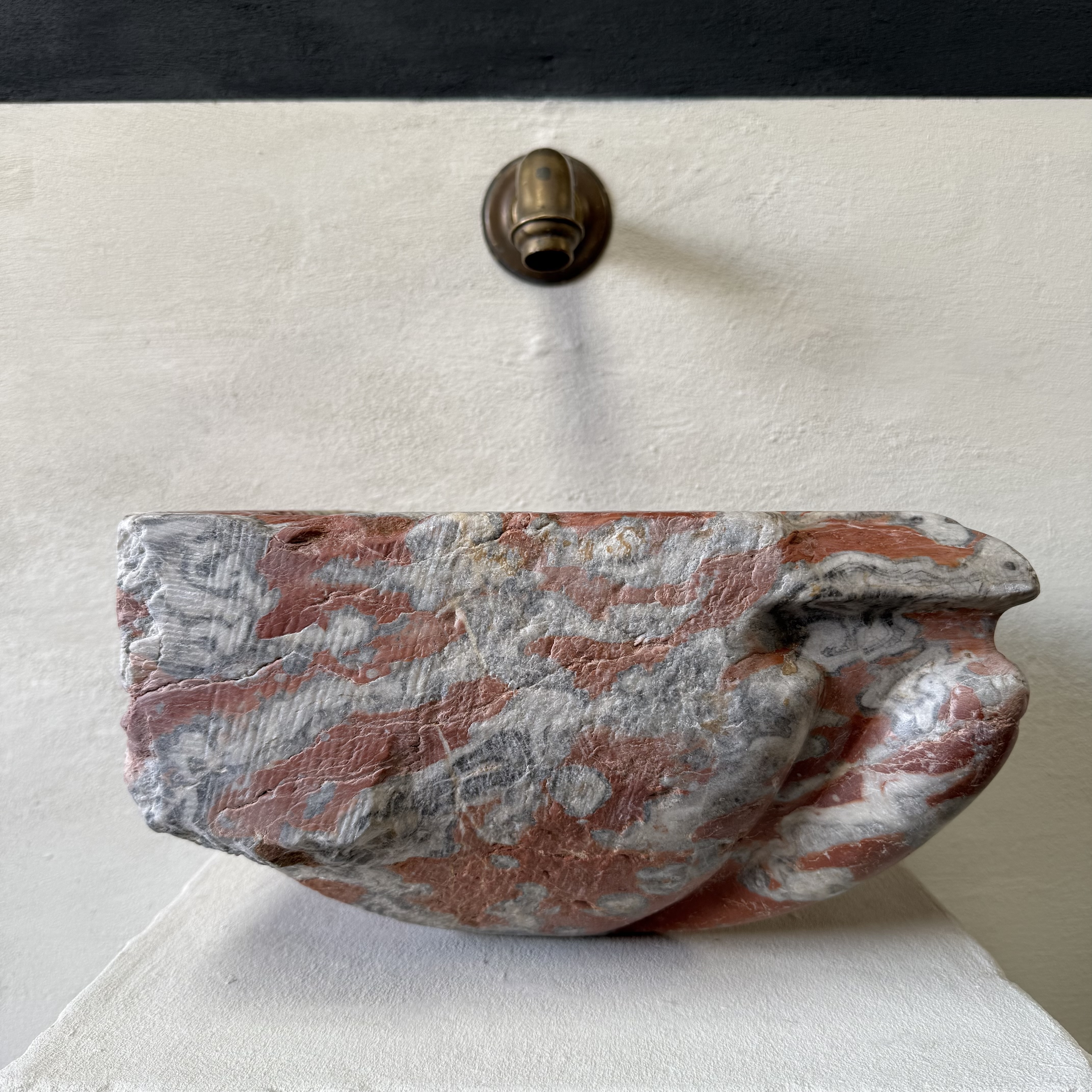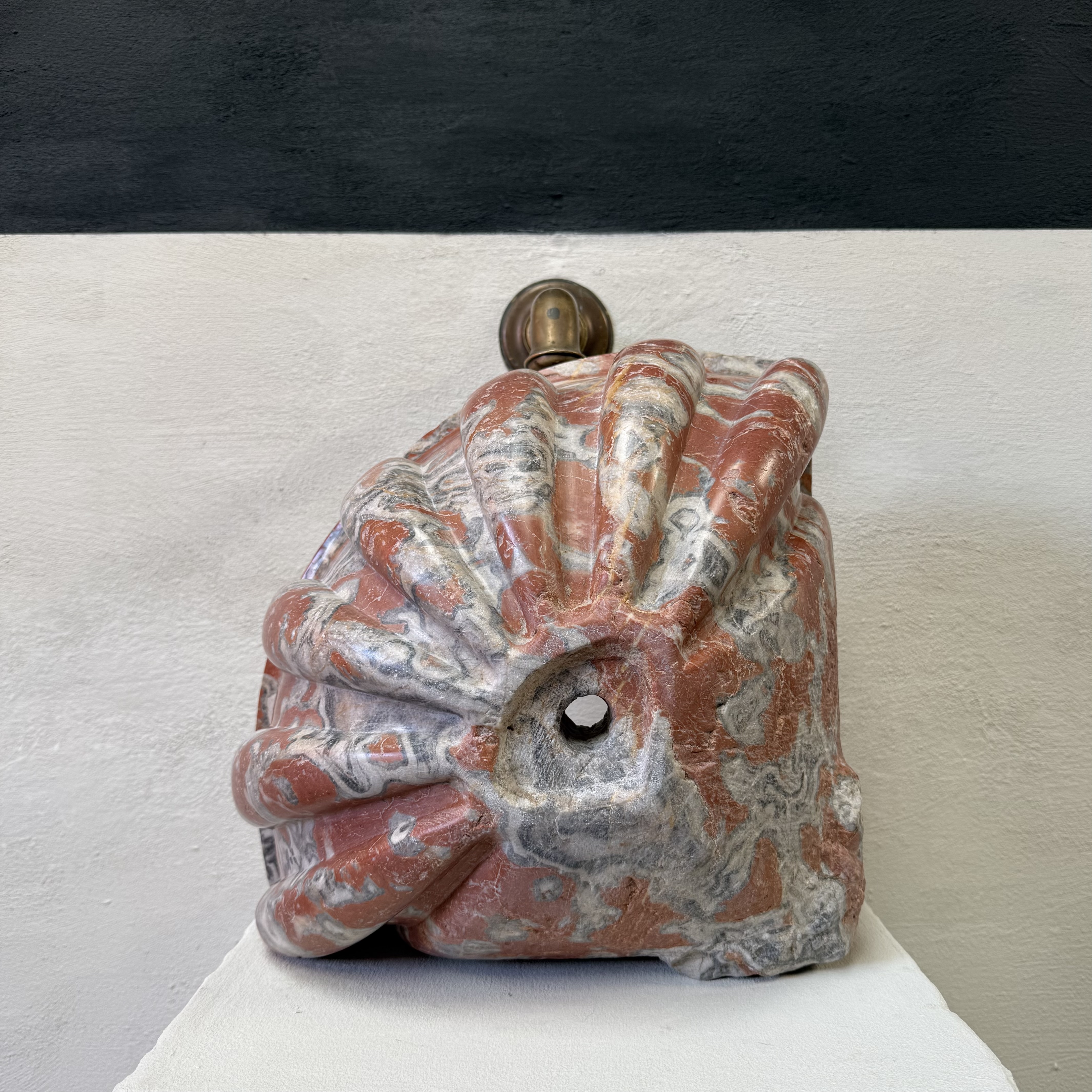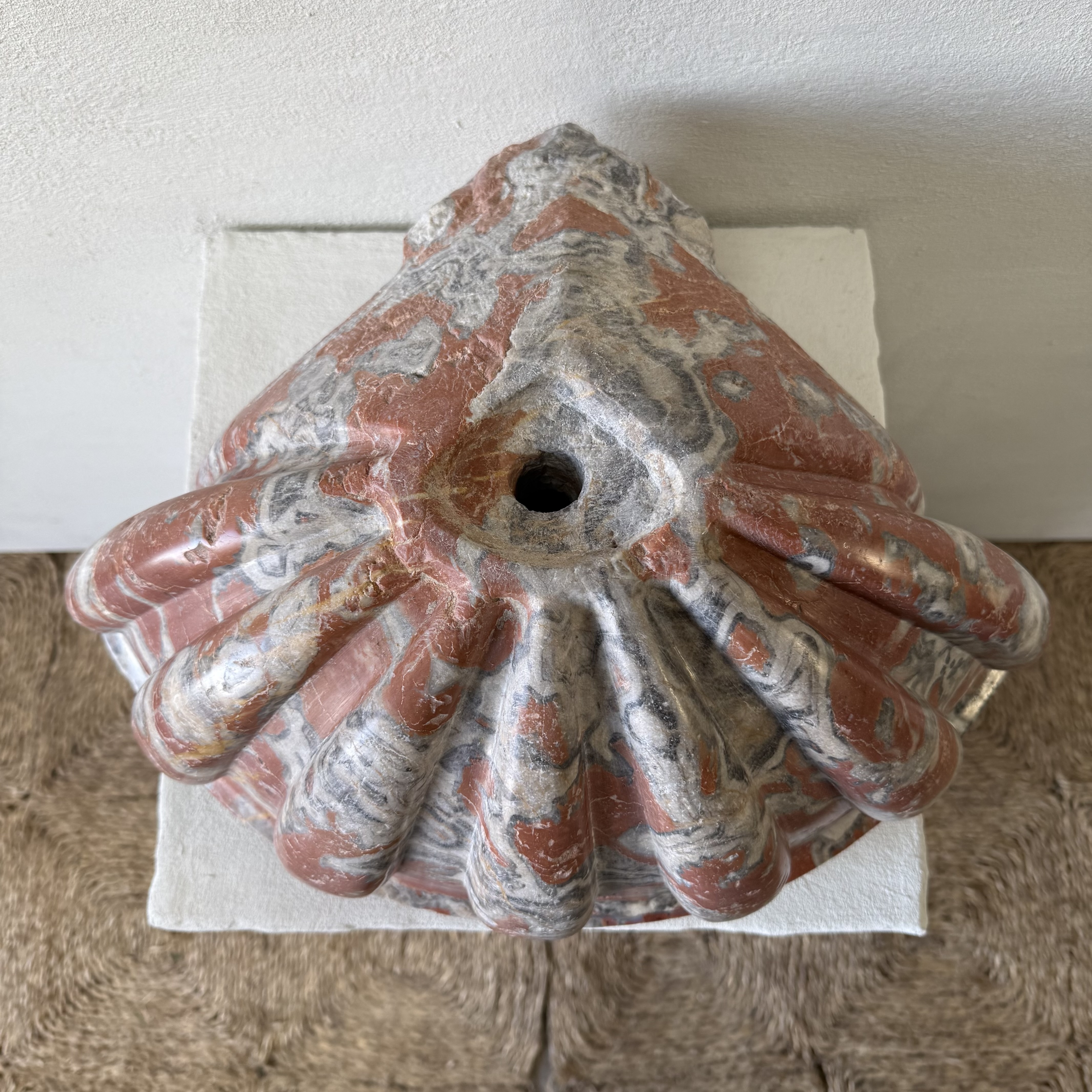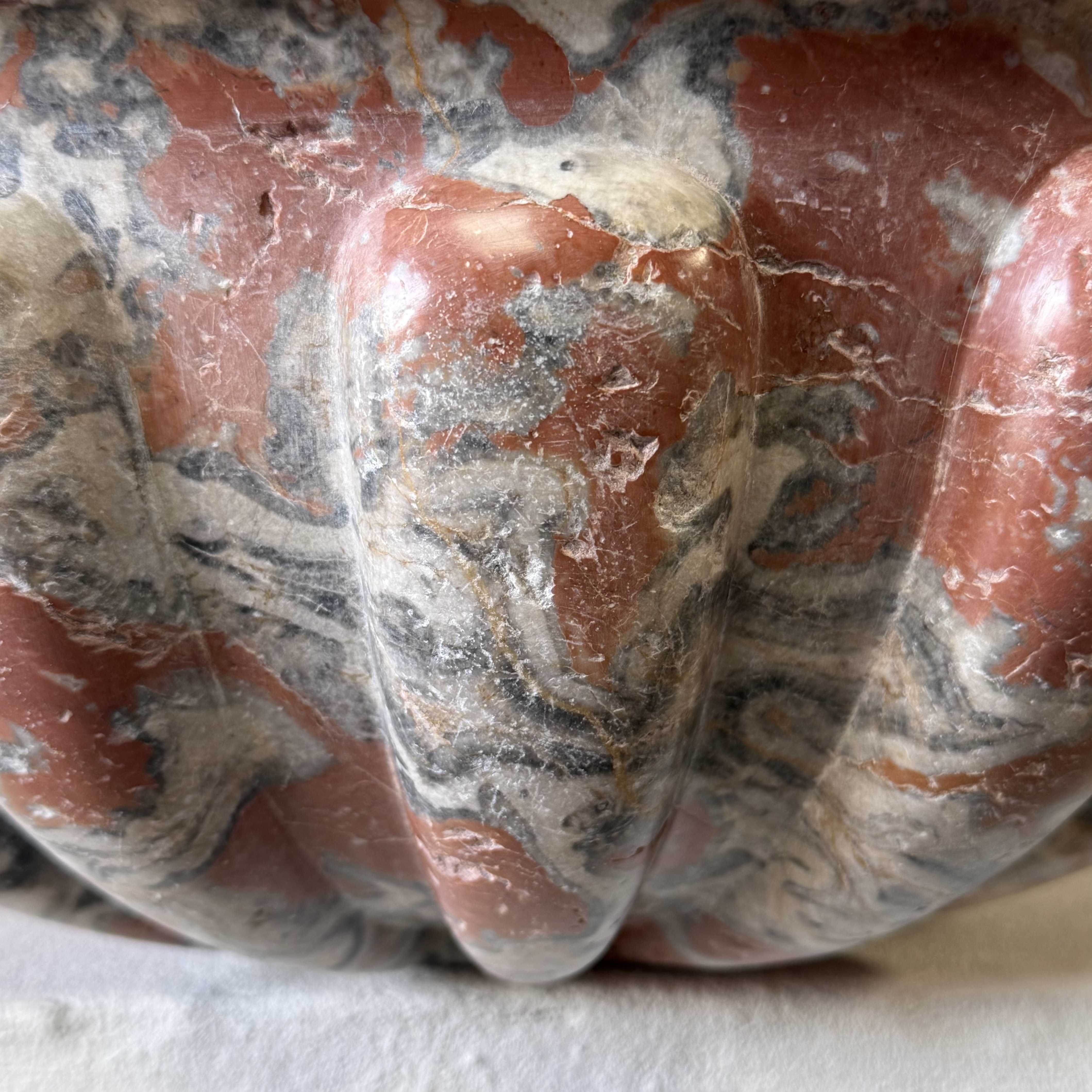 Rare late 17th / early 18th century French quarter-round corner basin, finely carved from richly veined Incarnat turquin marble. The basin features a deep, well-proportioned bowl and a boldly sculpted exterior with pronounced gadroons, showcasing the depth and movement of the marble.