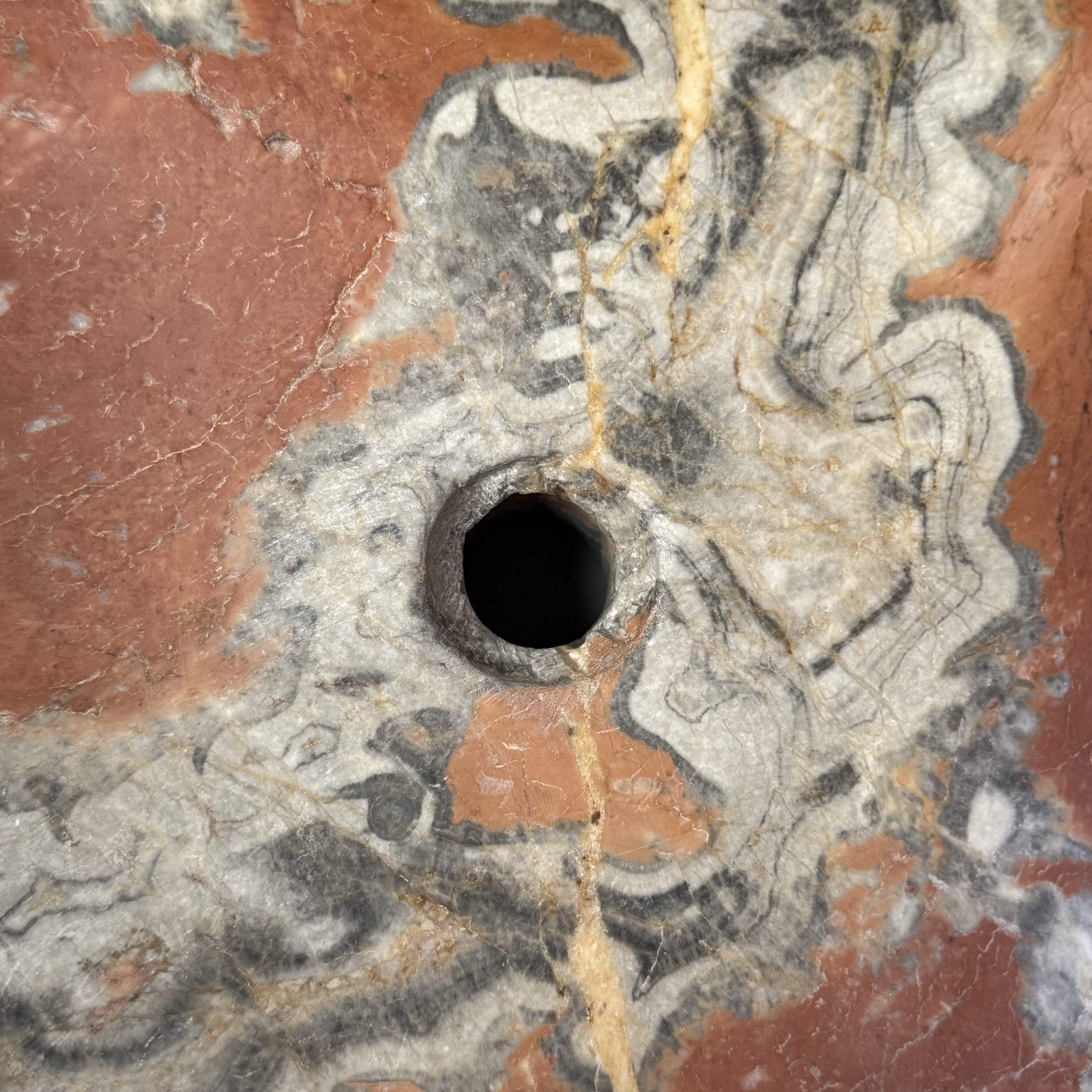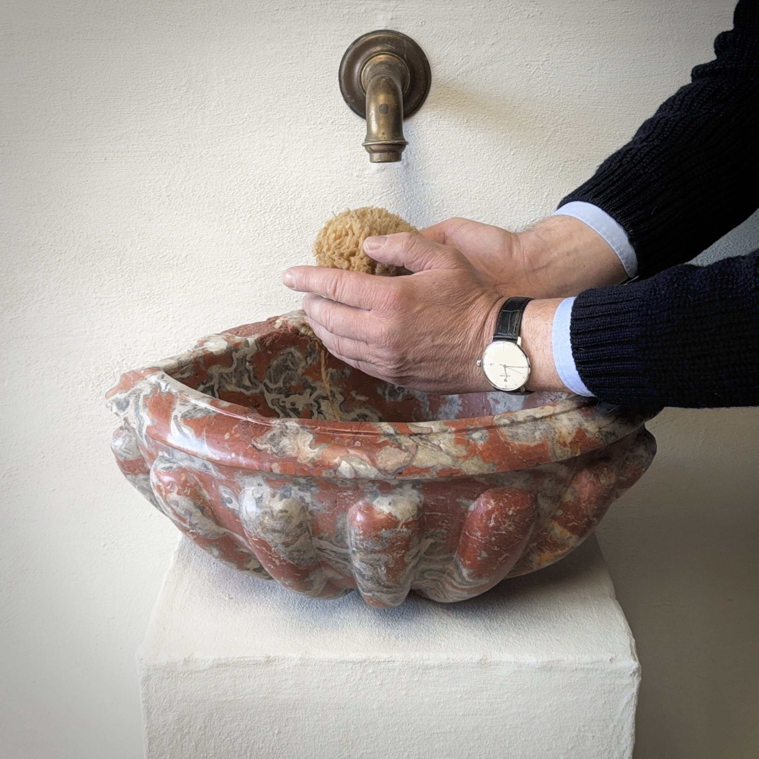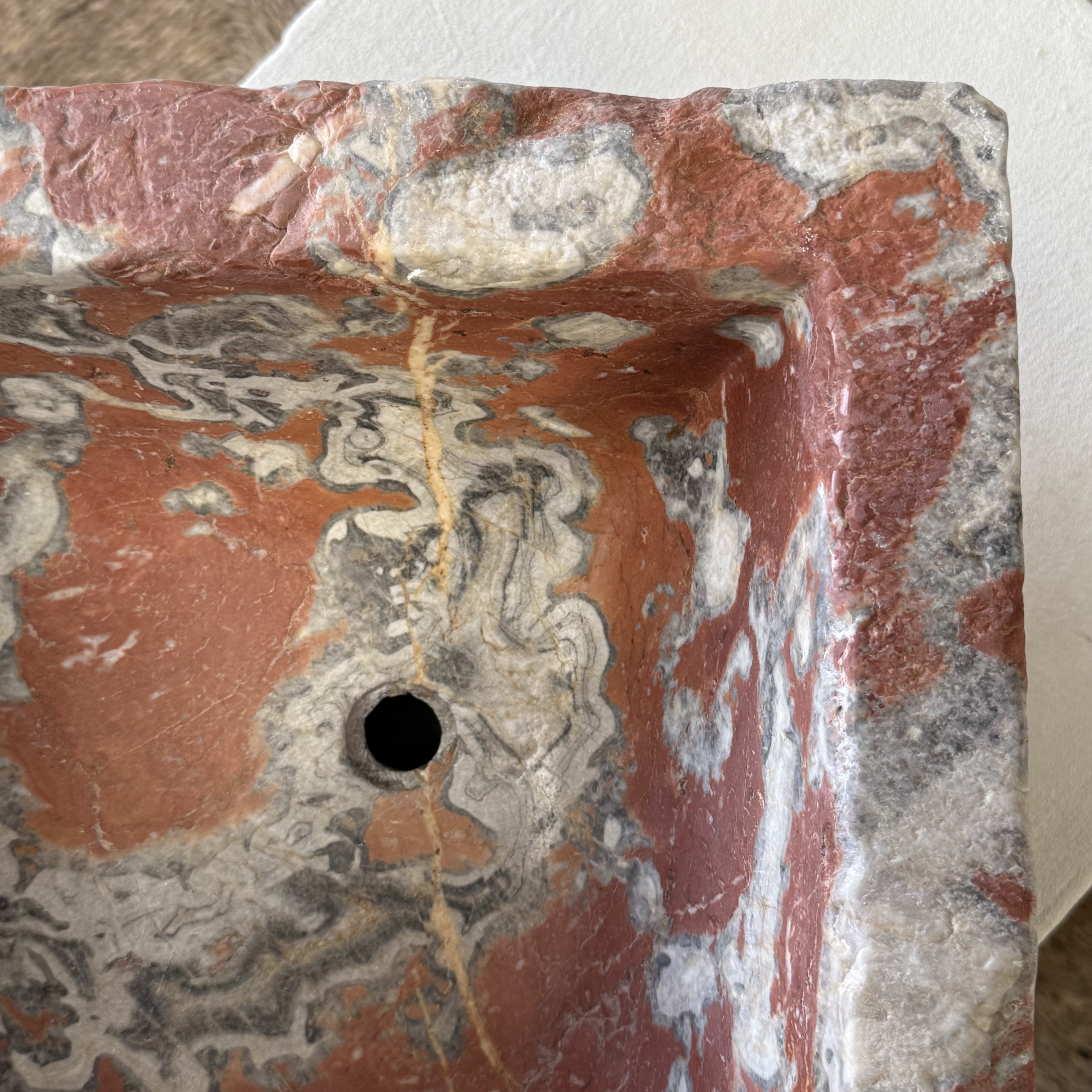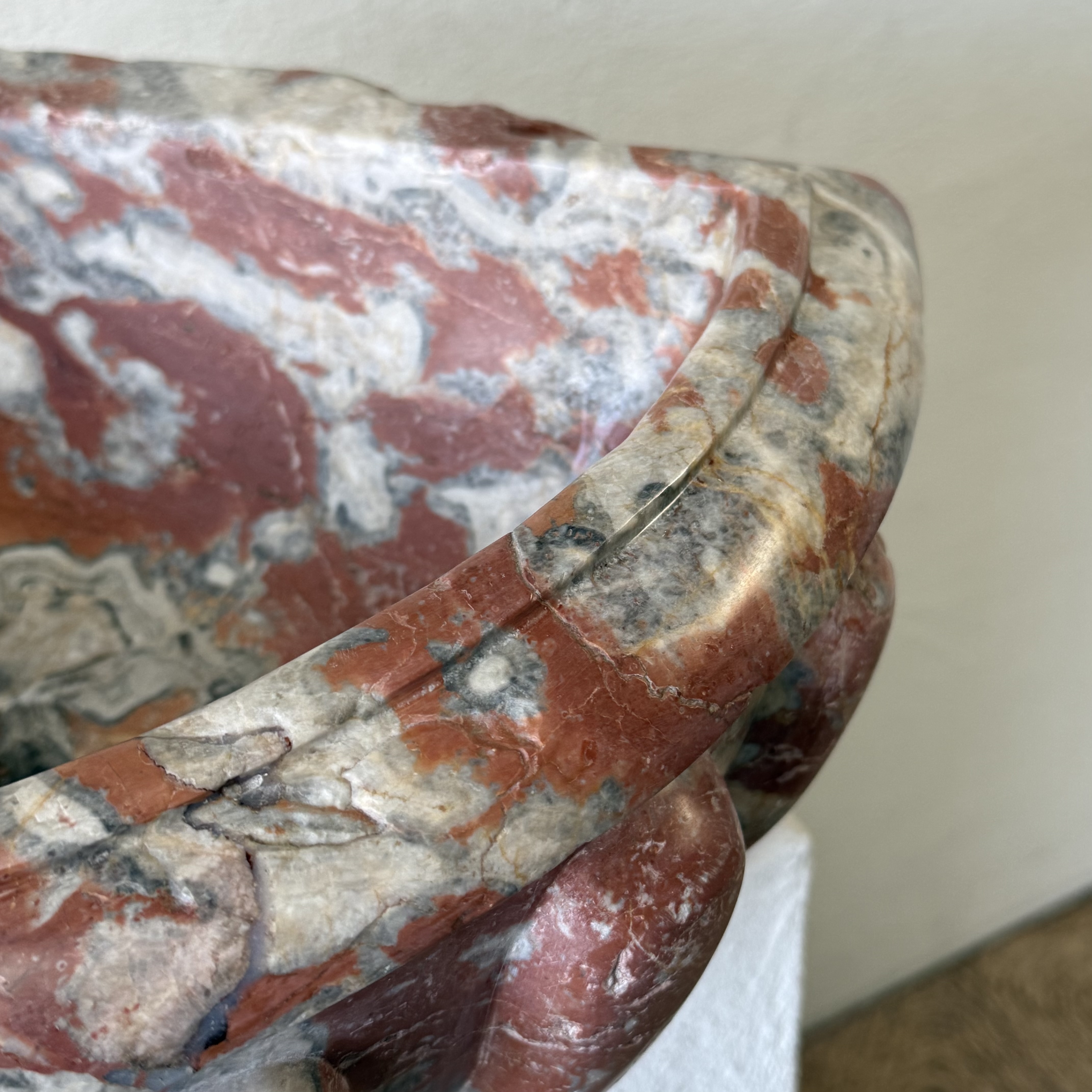 Rare late 17th / early 18th century French quarter-round corner basin, finely carved from richly veined Incarnat turquin marble. The basin features a deep, well-proportioned bowl and a boldly sculpted exterior with pronounced gadroons, showcasing the depth and movement of the marble.