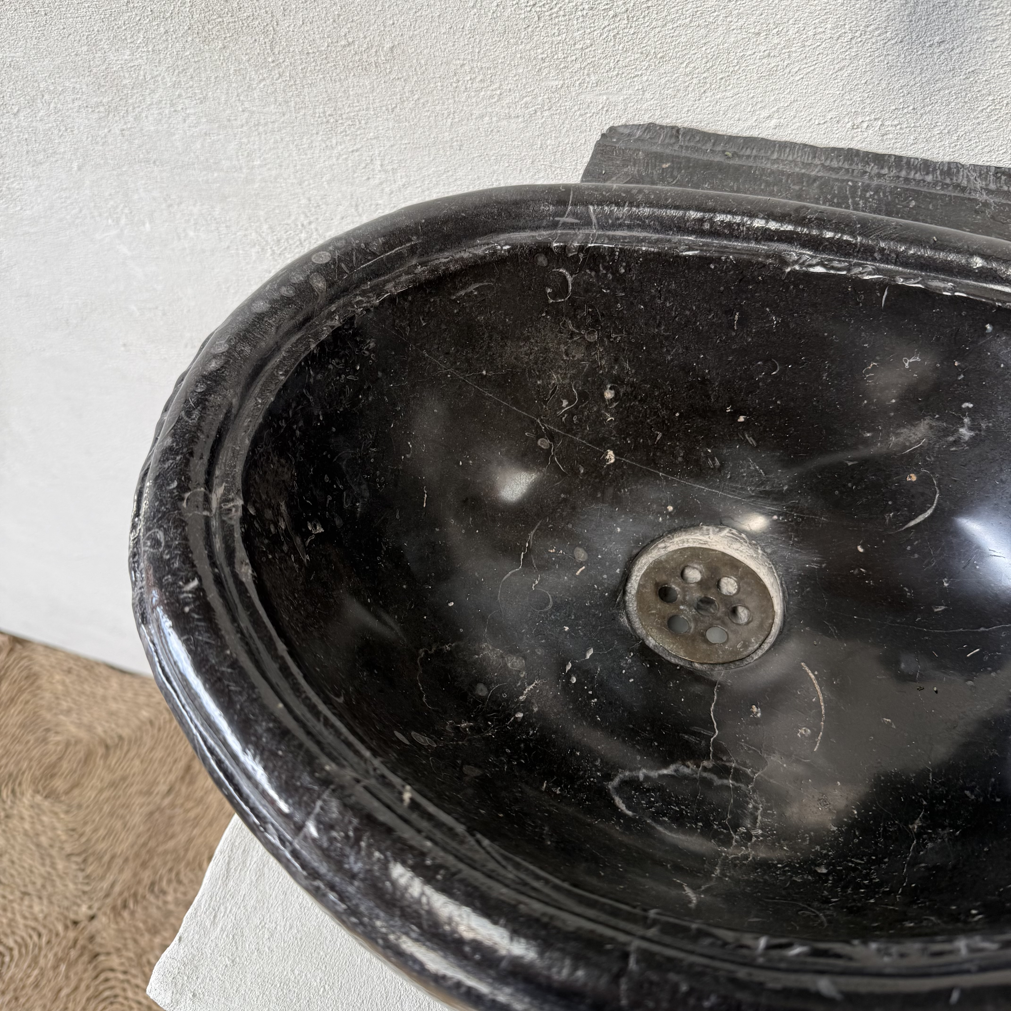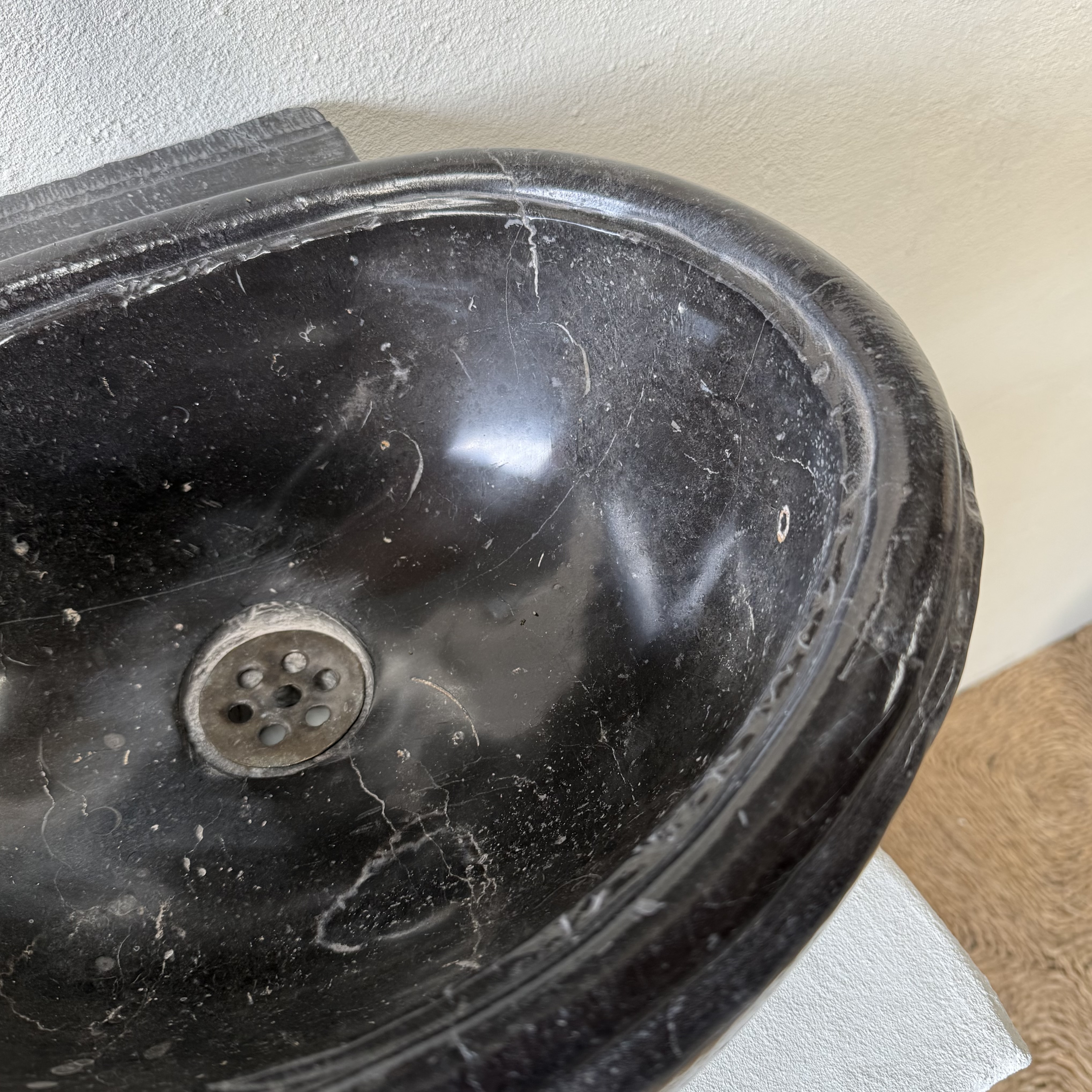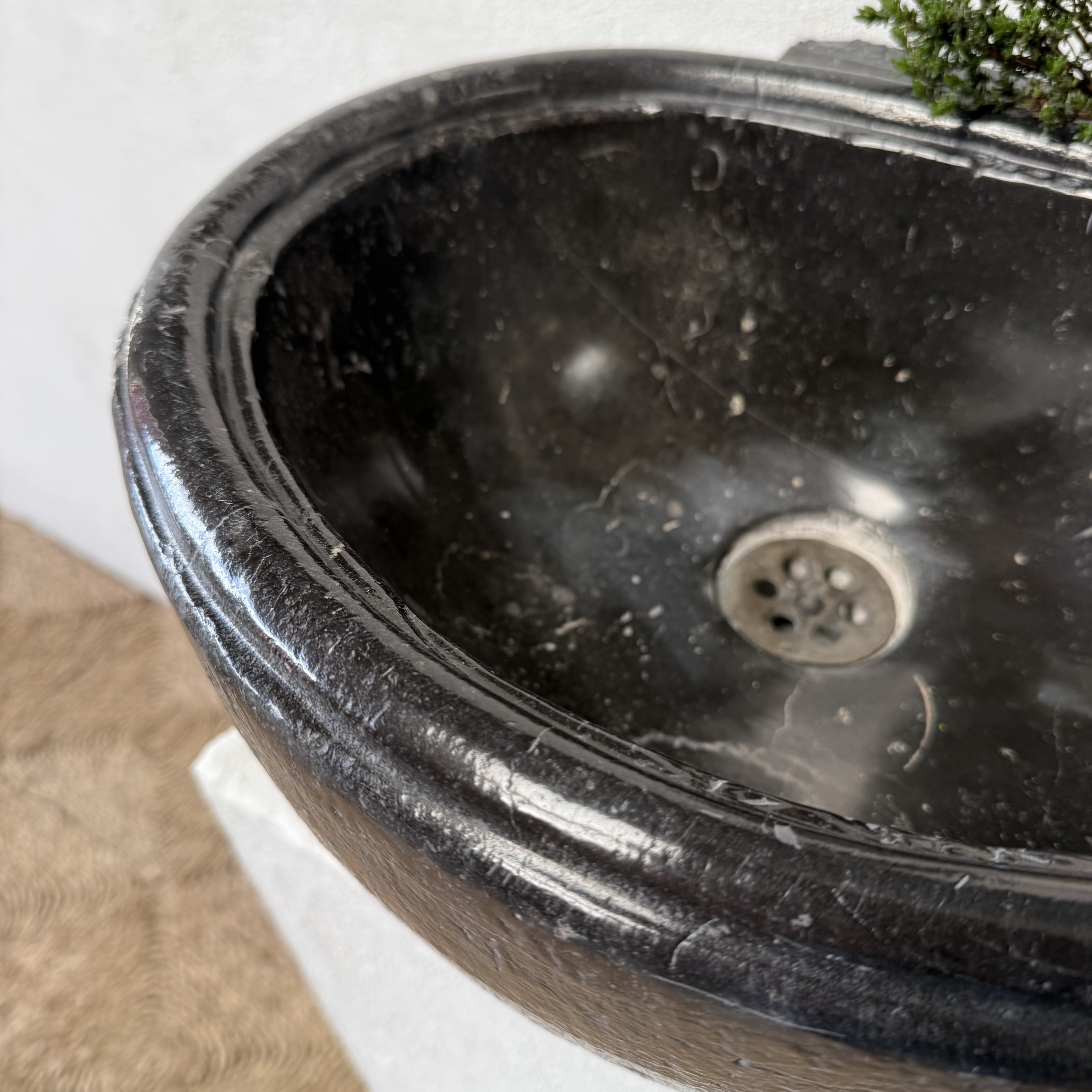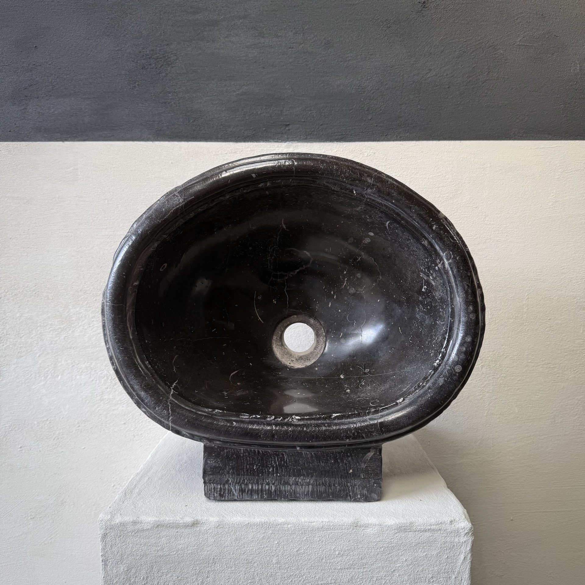 An early 18th century black marble basin of elegant oval form with a deep, bowl-shaped body. The surface is finely hand-chiseled and displays a rich, naturally worn patina.