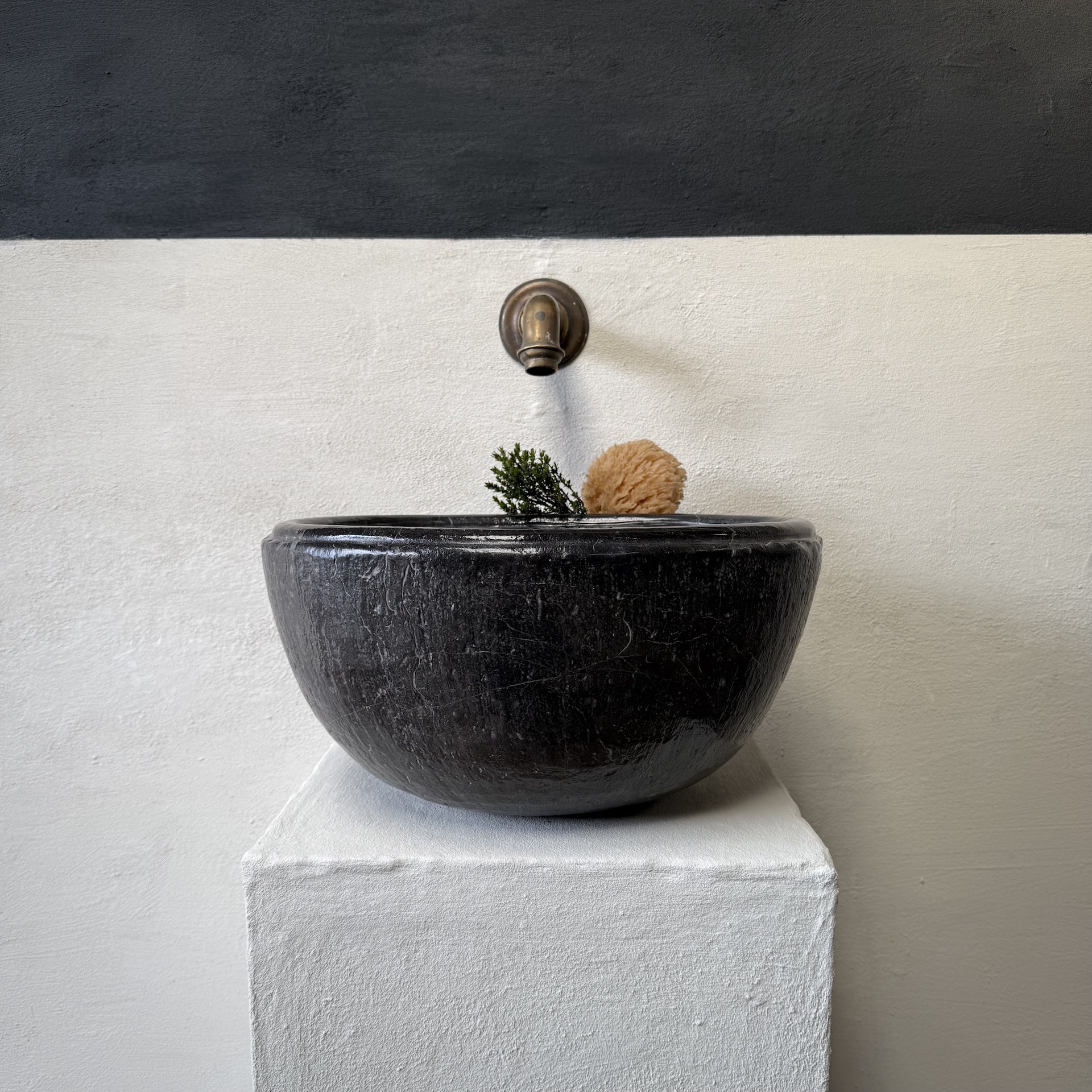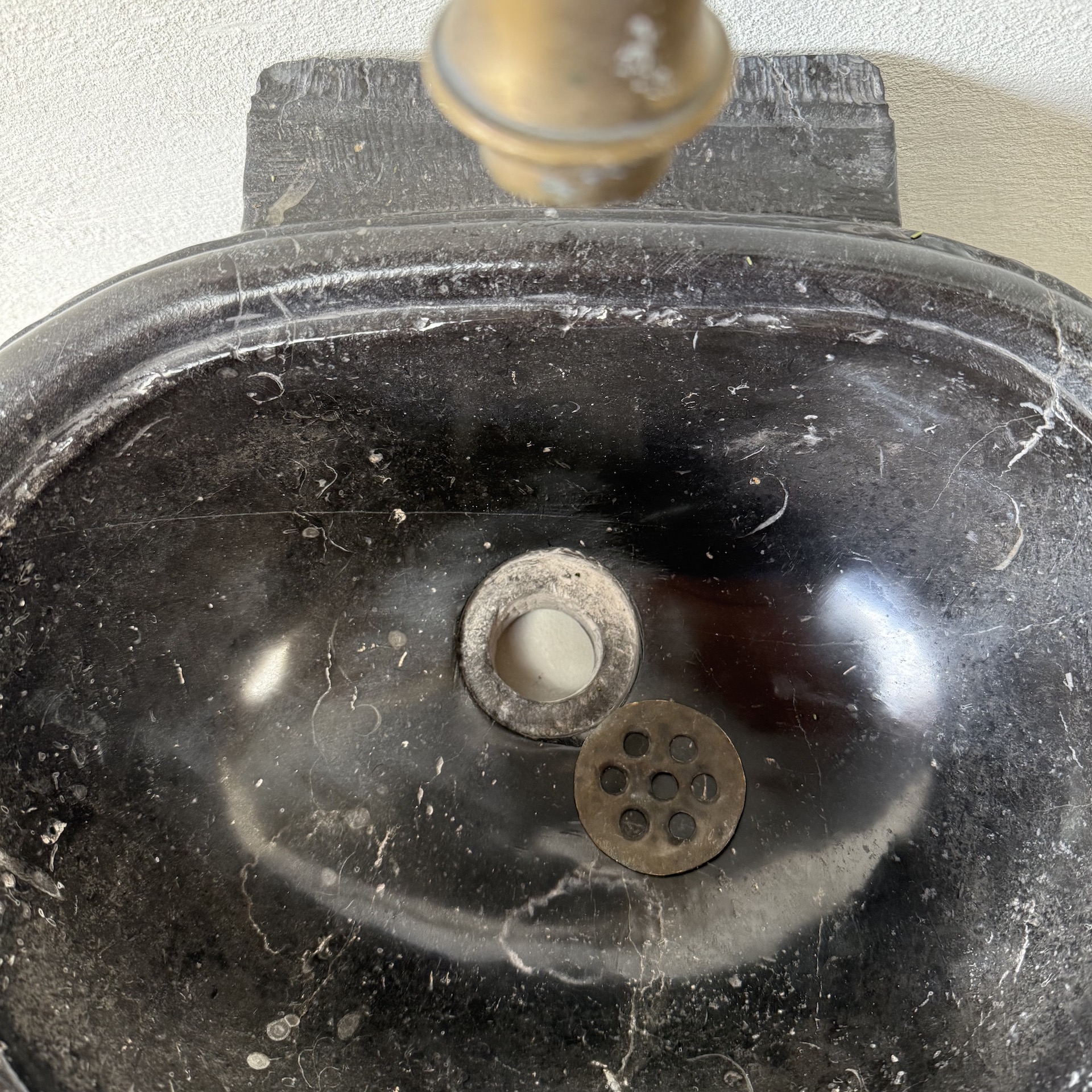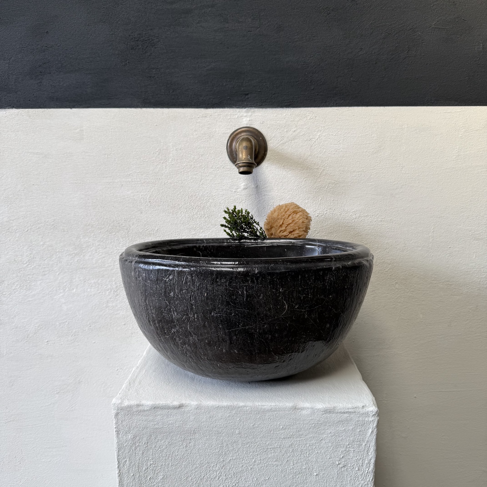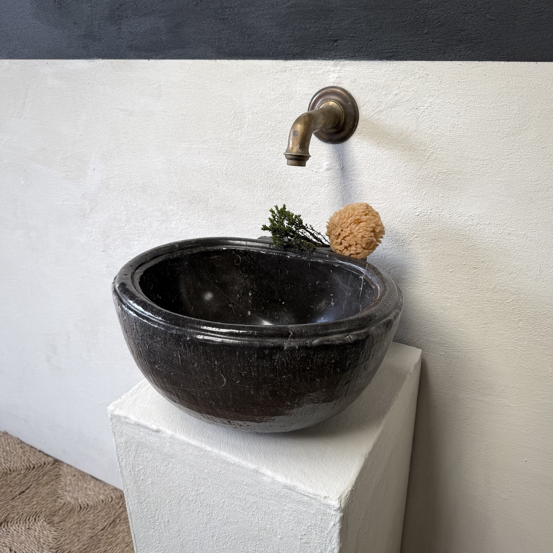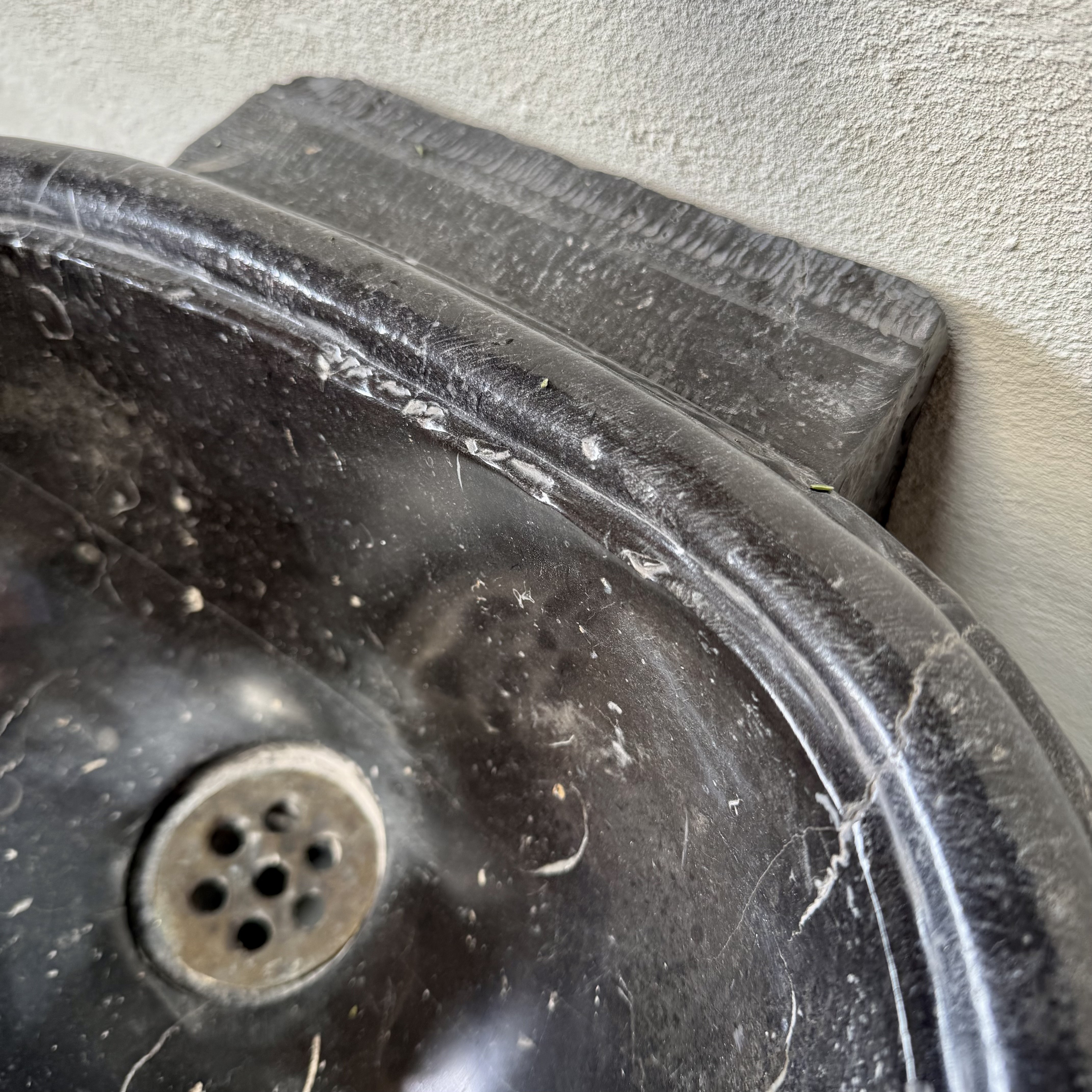 An early 18th century black marble basin of elegant oval form with a deep, bowl-shaped body. The surface is finely hand-chiseled and displays a rich, naturally worn patina.