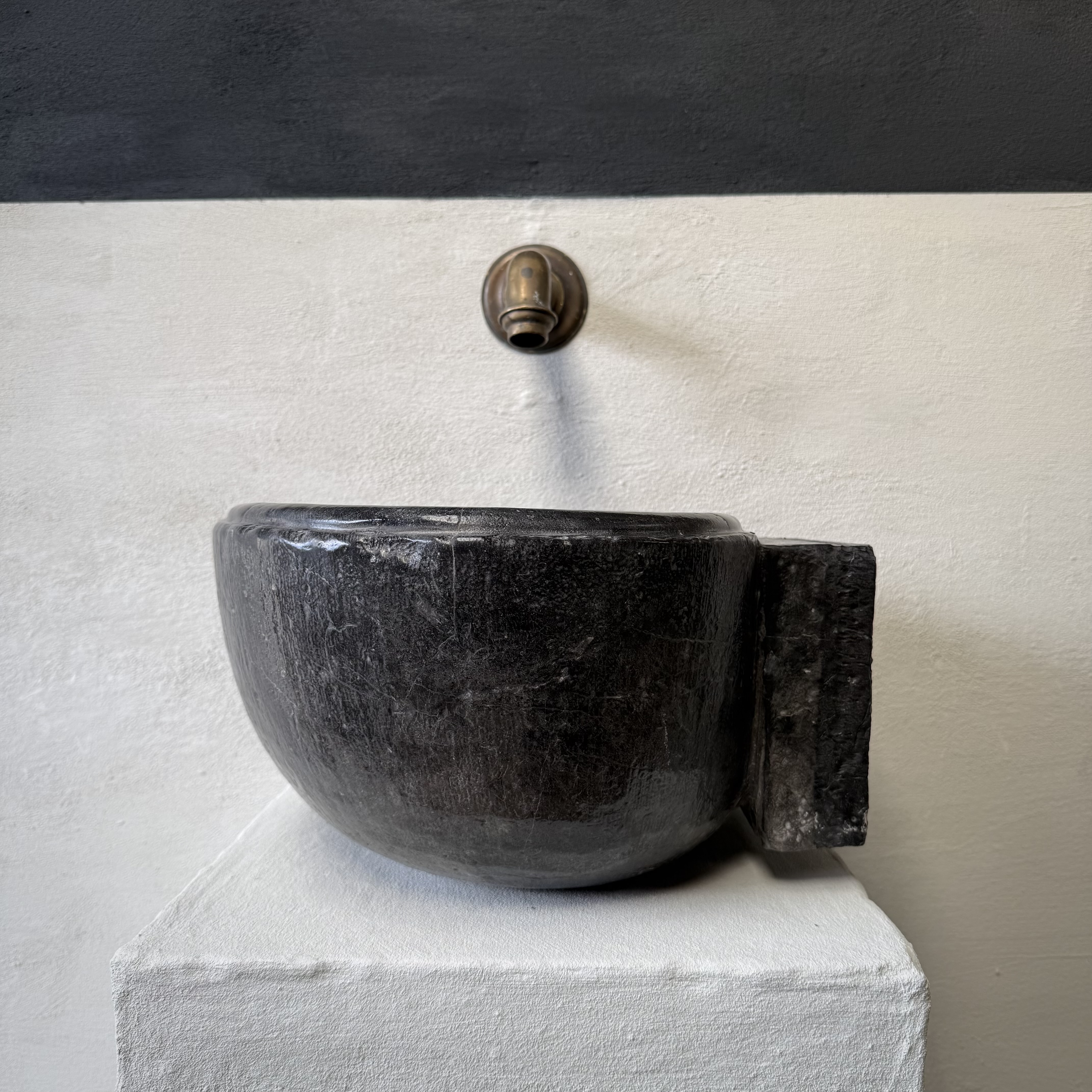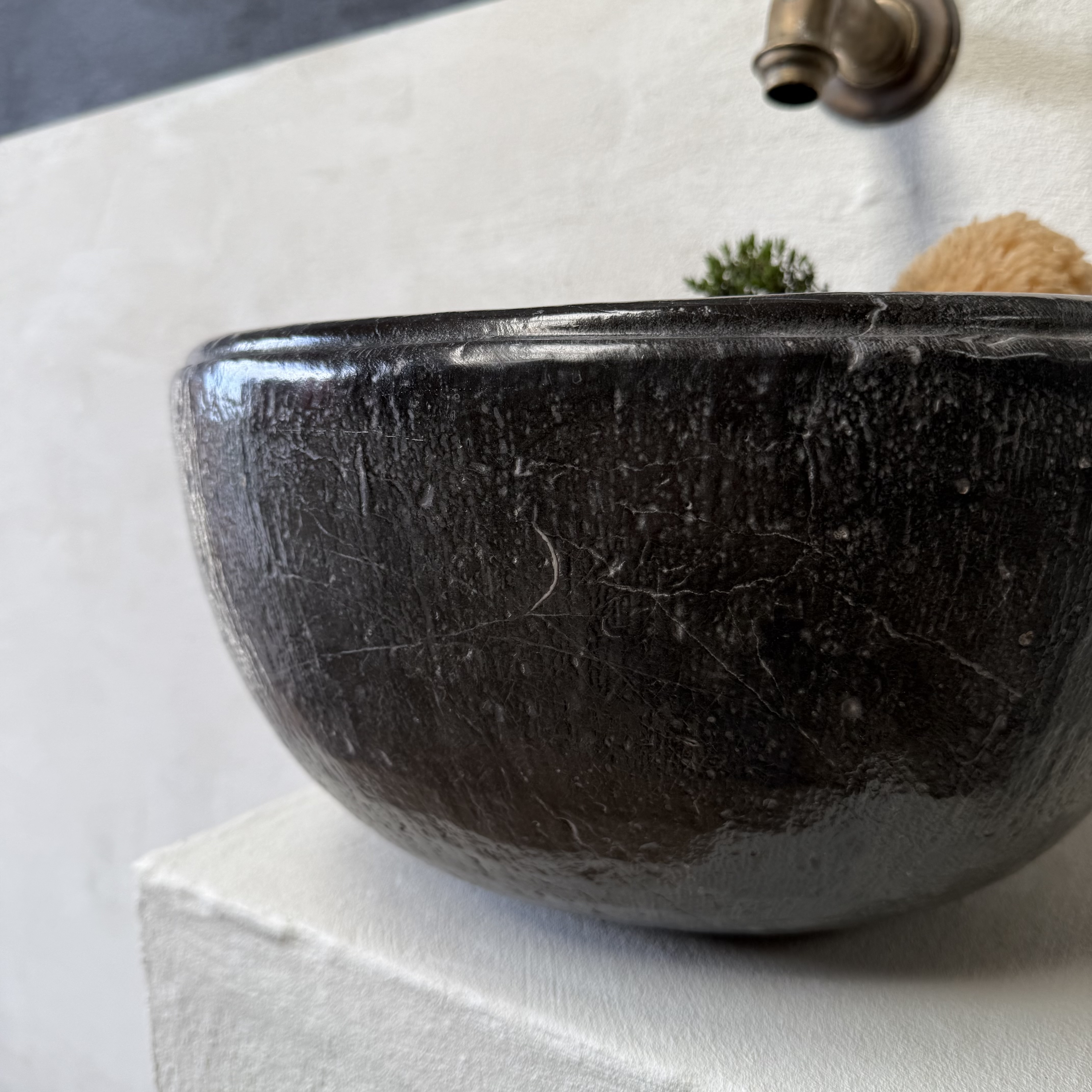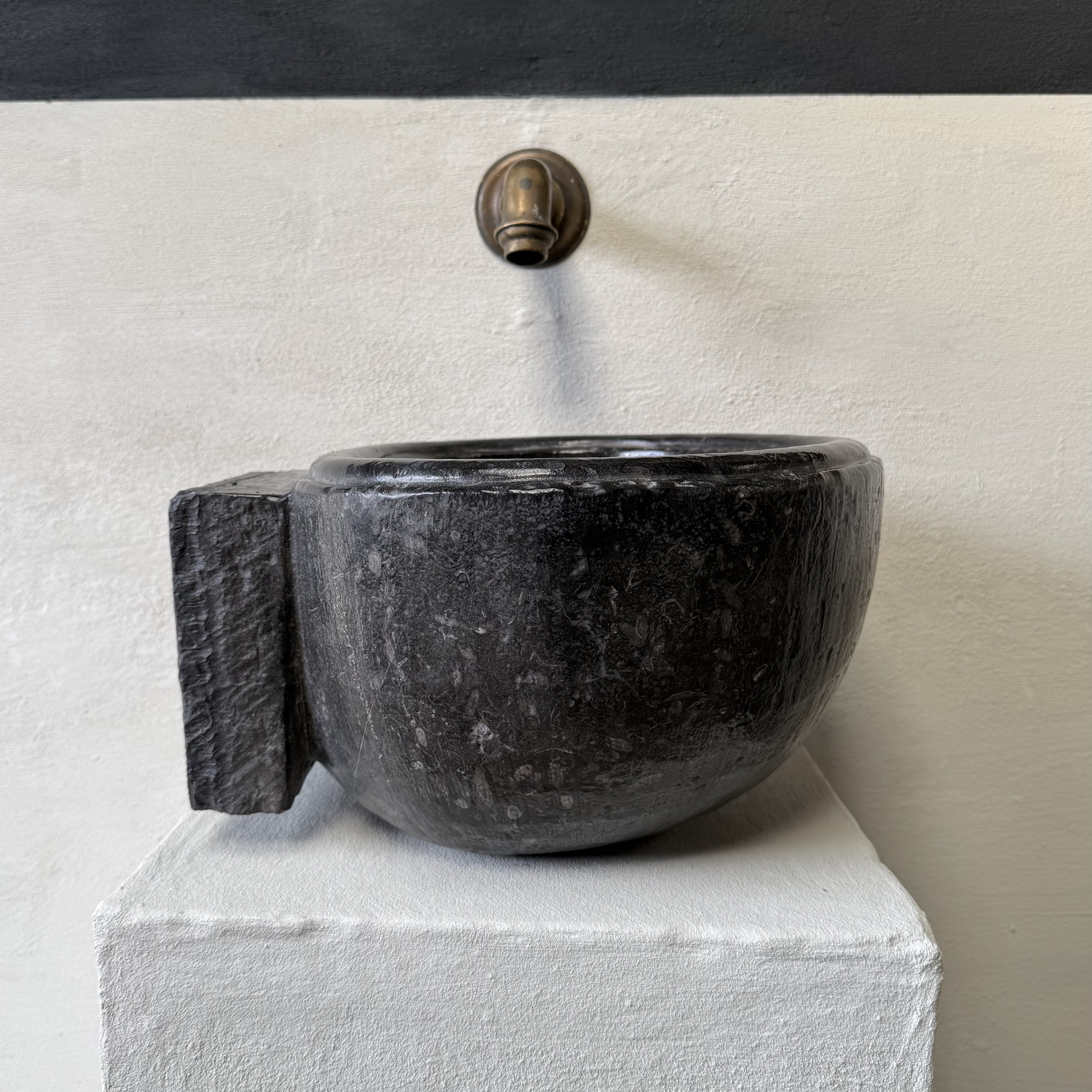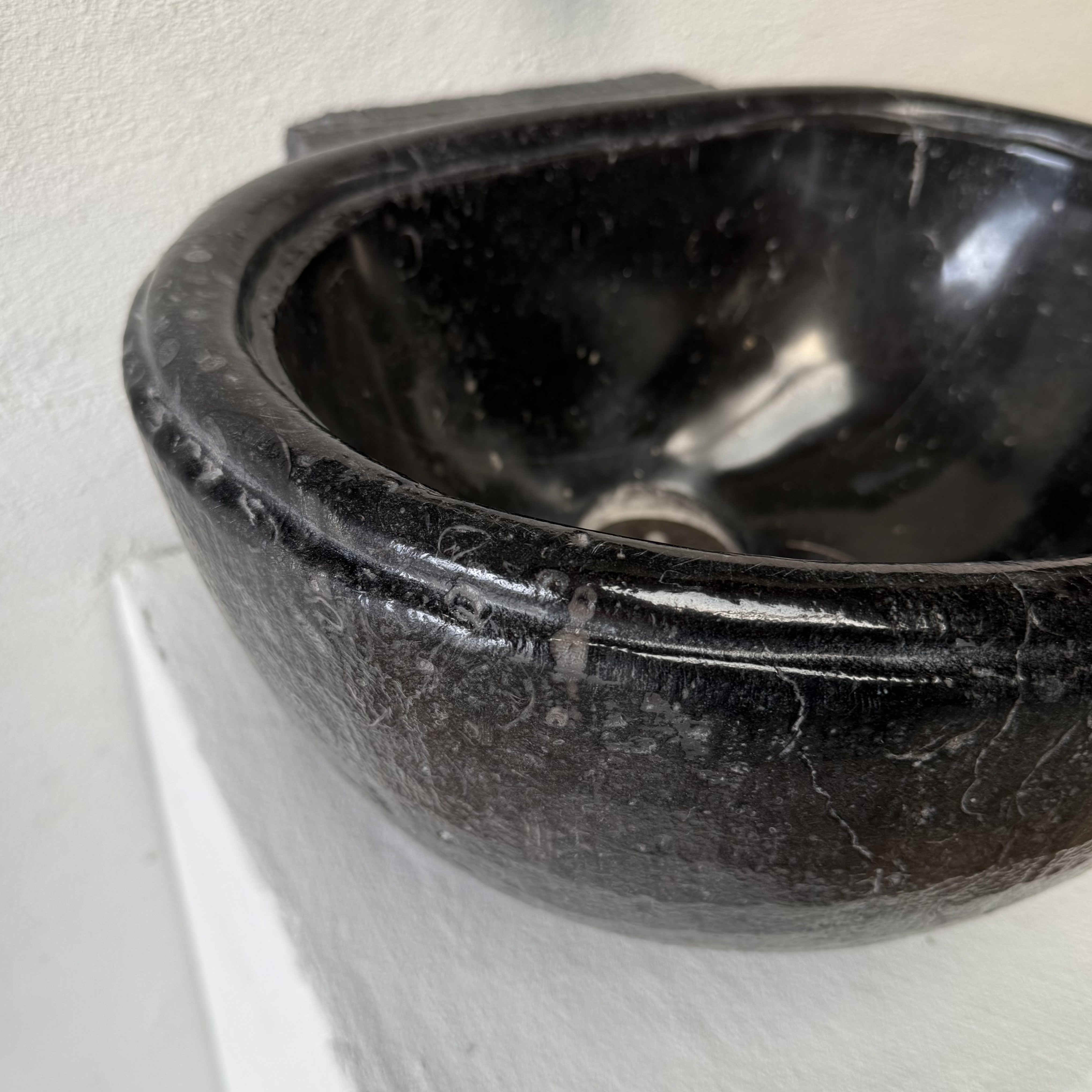 An early 18th century black marble basin of elegant oval form with a deep, bowl-shaped body. The surface is finely hand-chiseled and displays a rich, naturally worn patina.