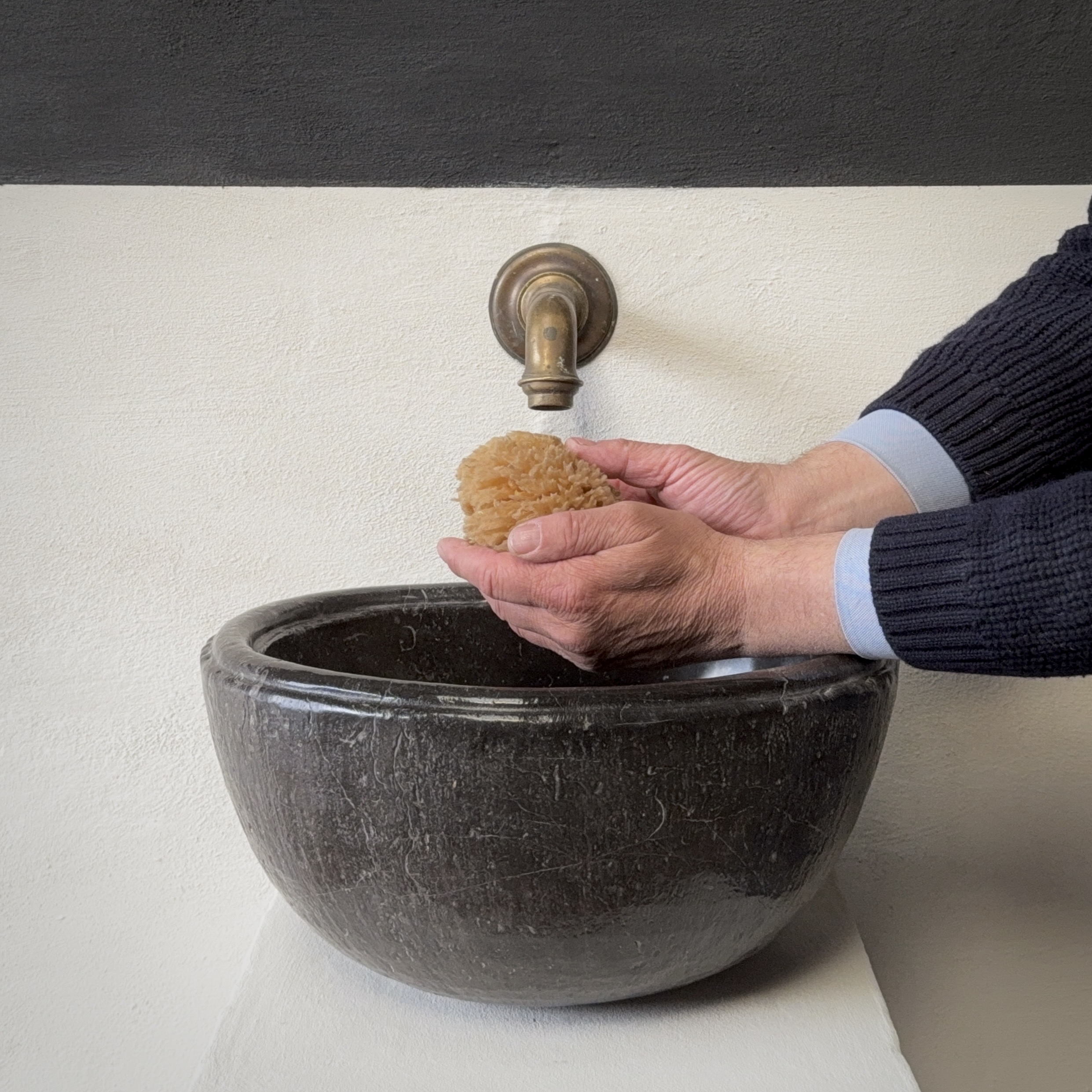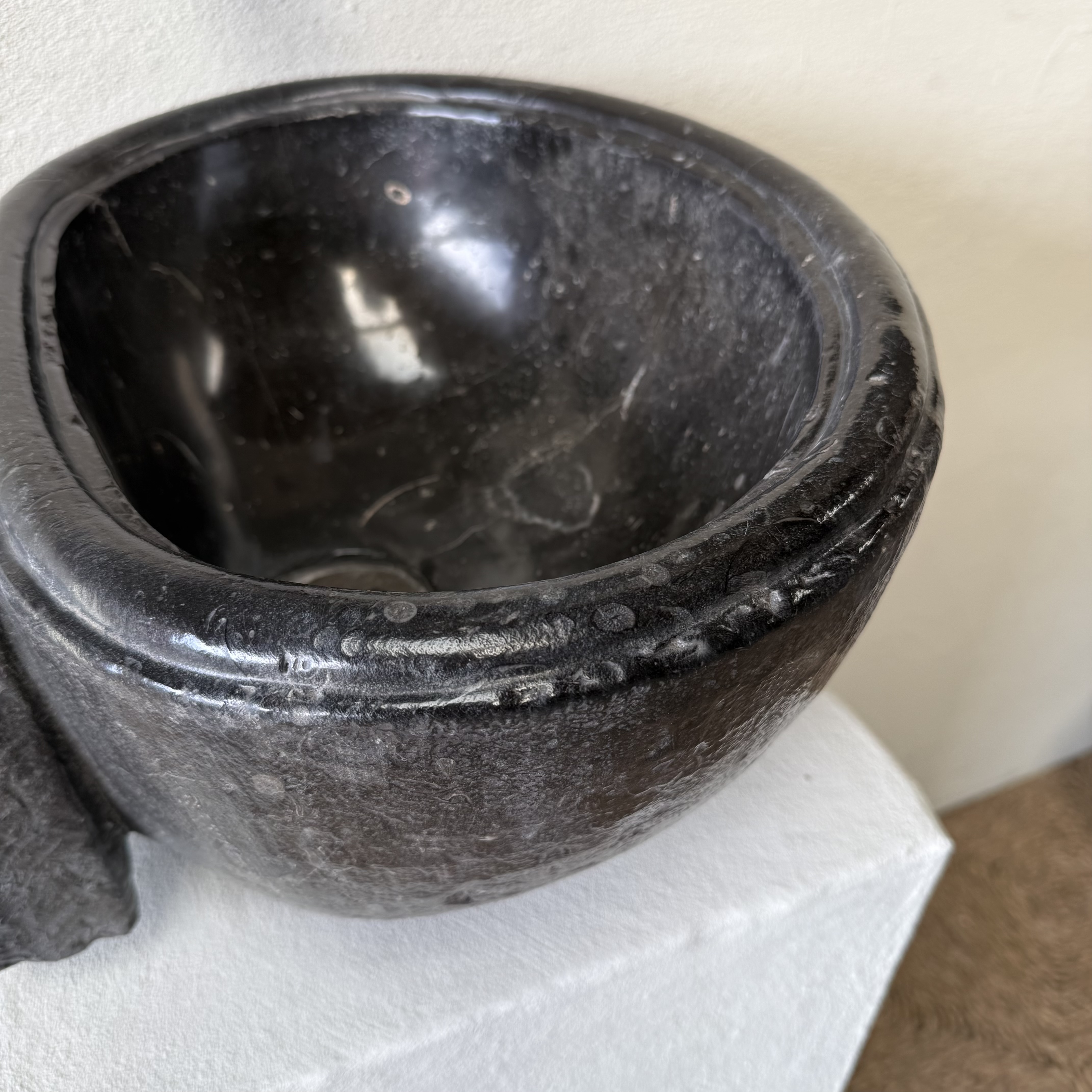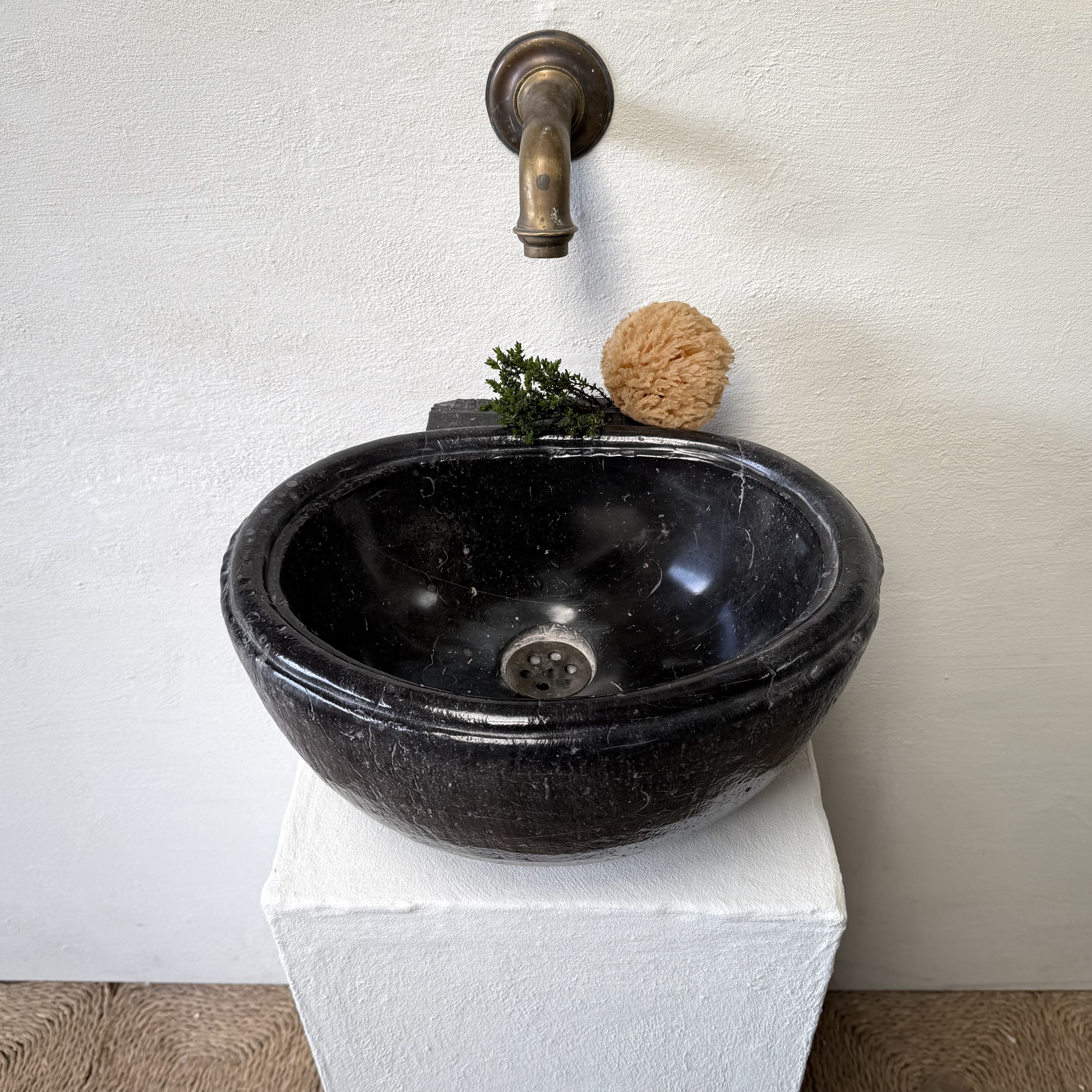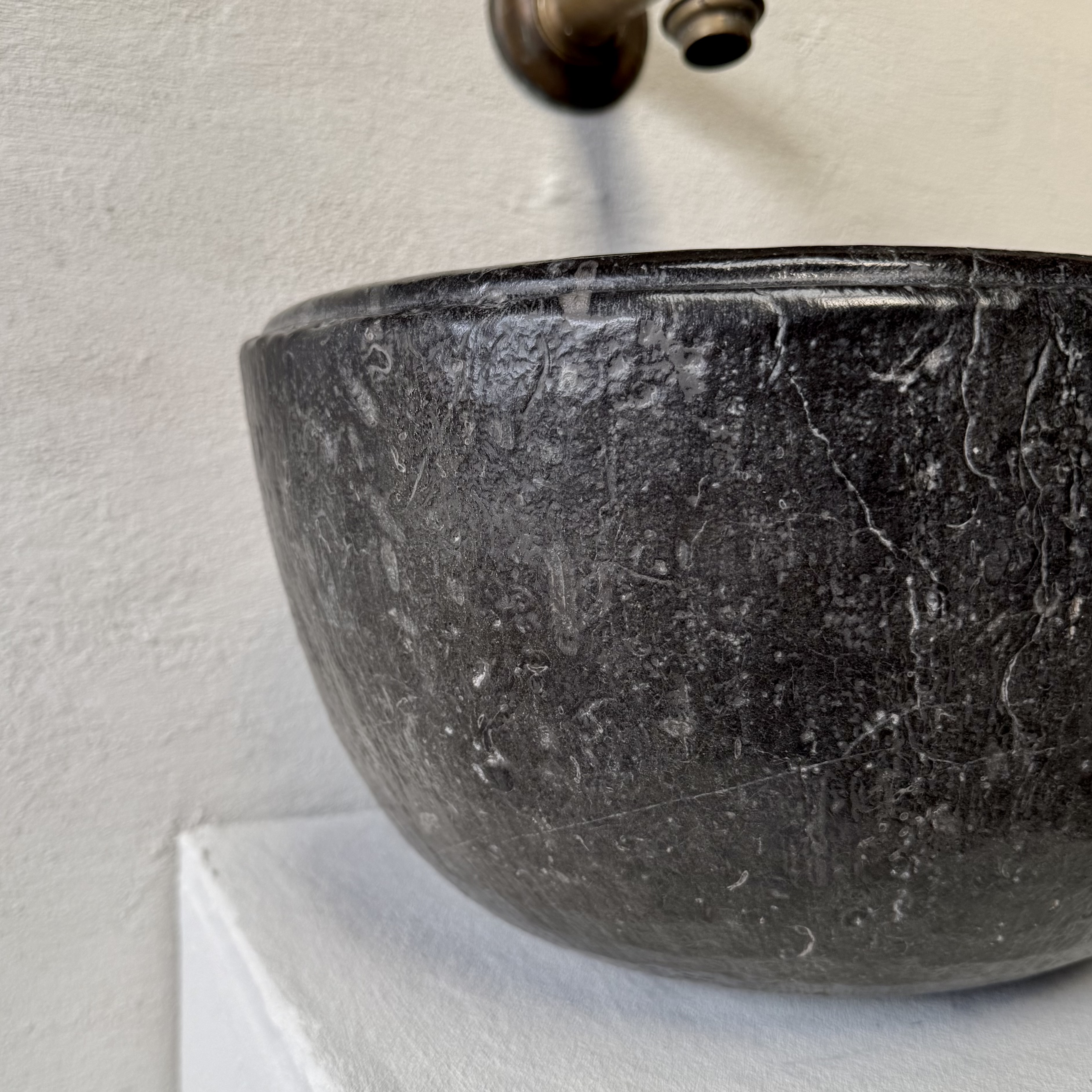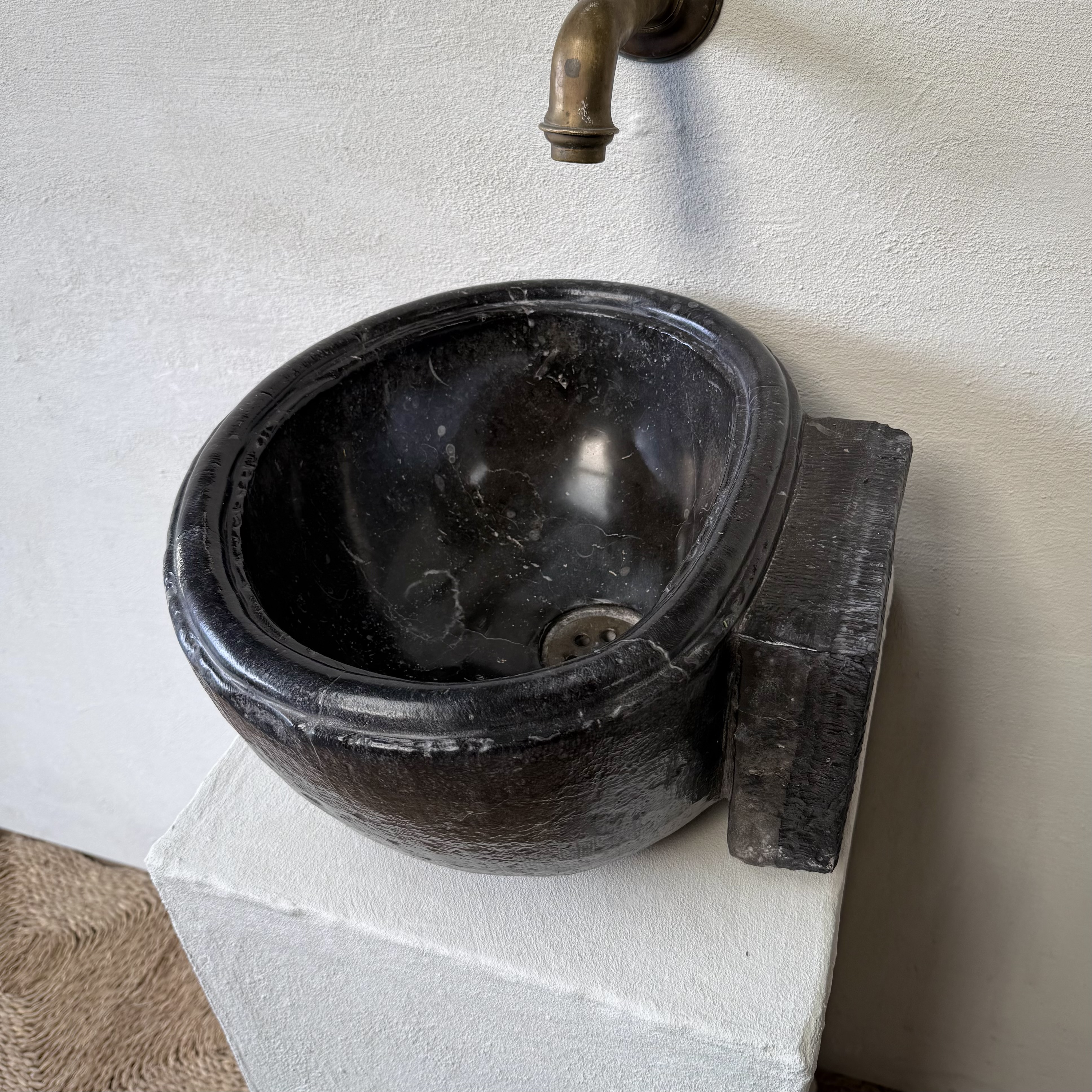 An early 18th century black marble basin of elegant oval form with a deep, bowl-shaped body. The surface is finely hand-chiseled and displays a rich, naturally worn patina.