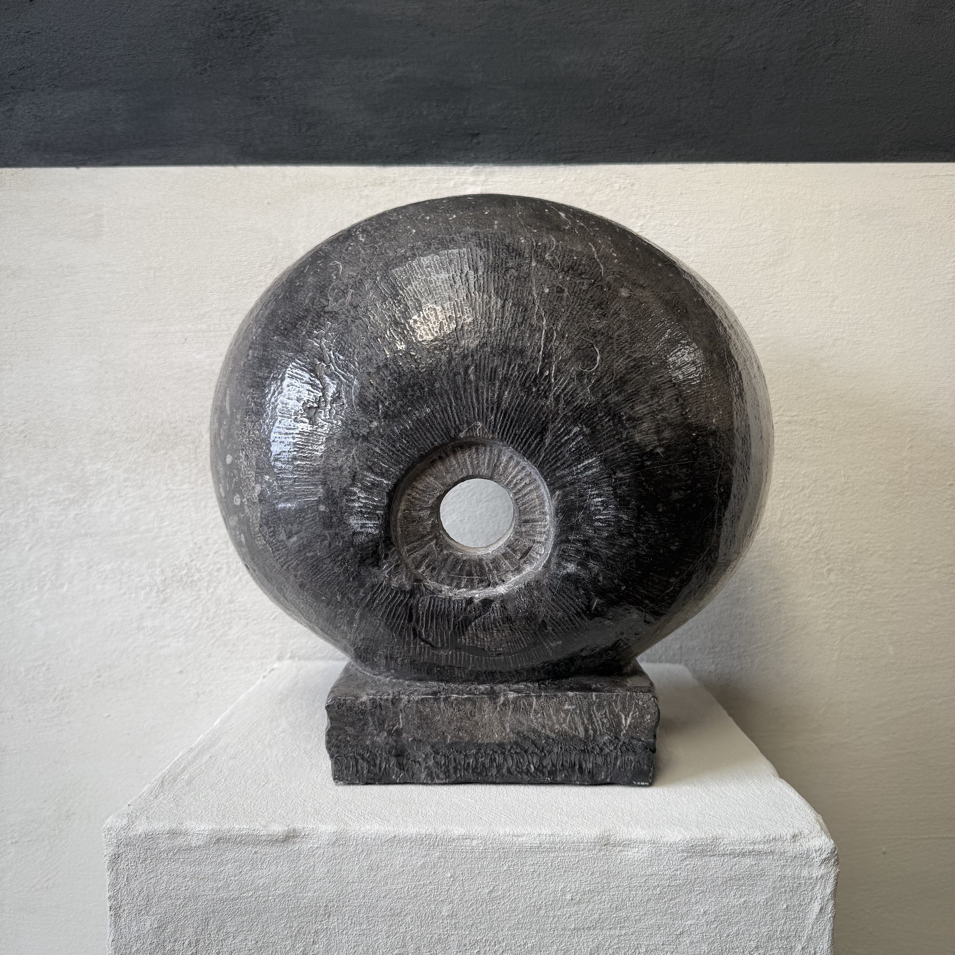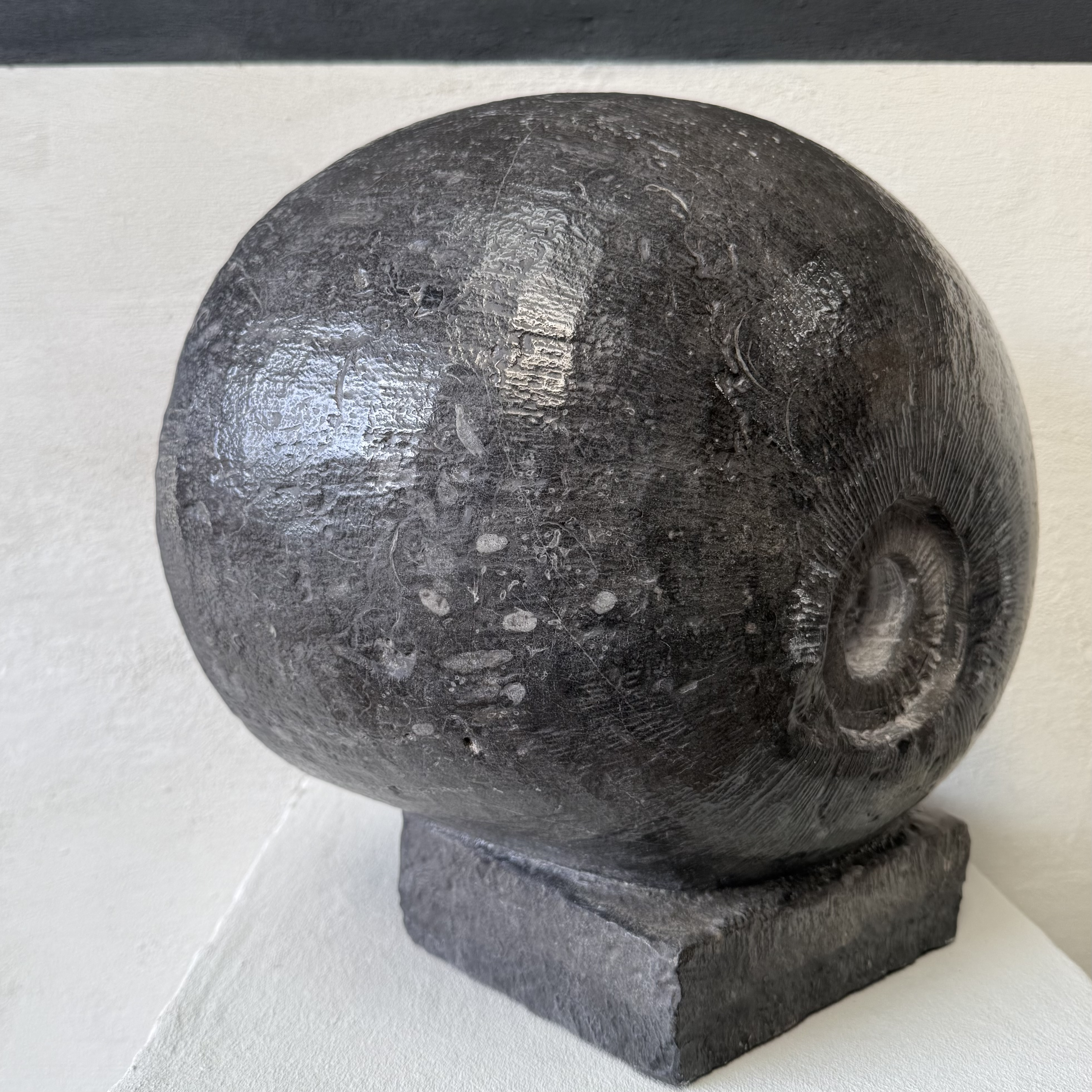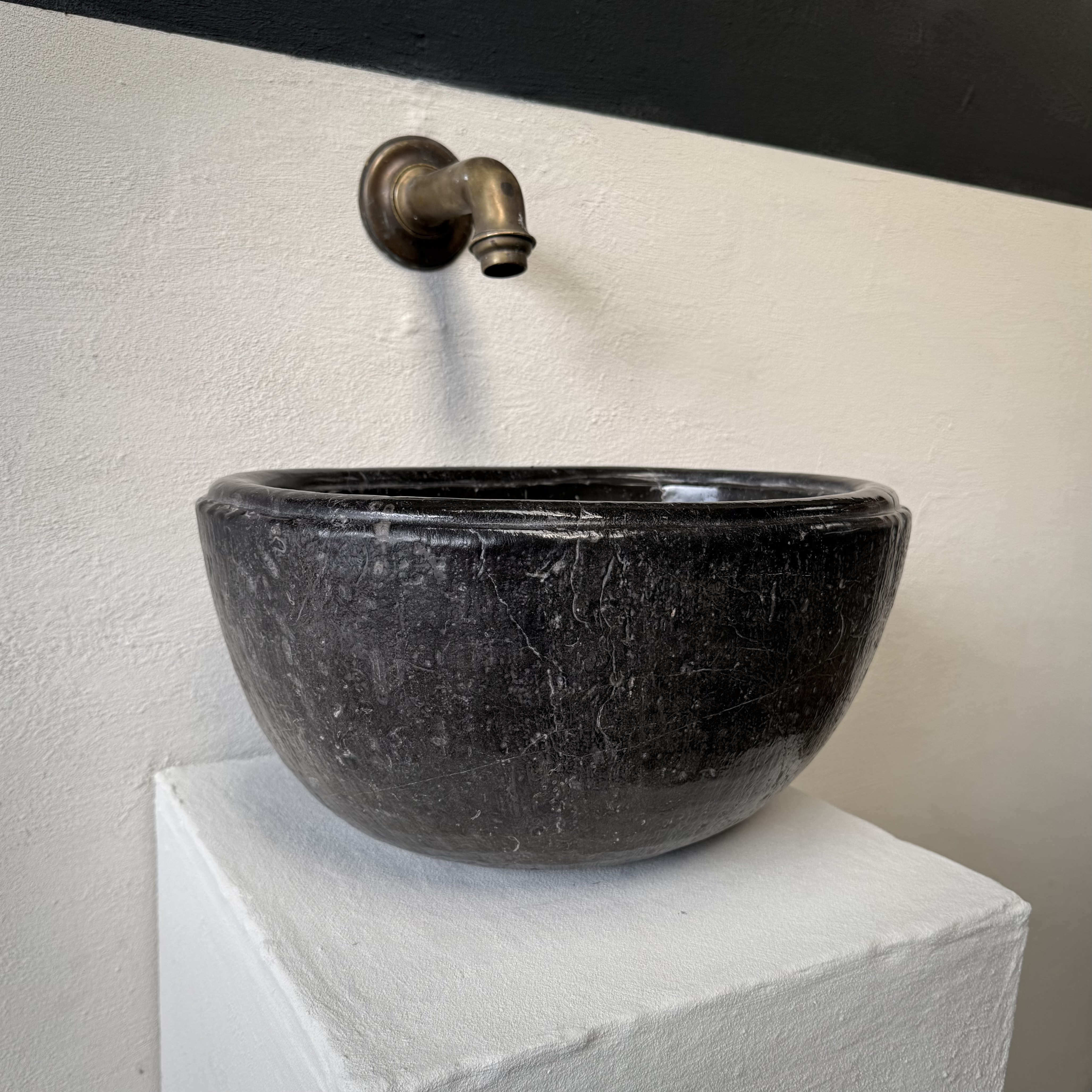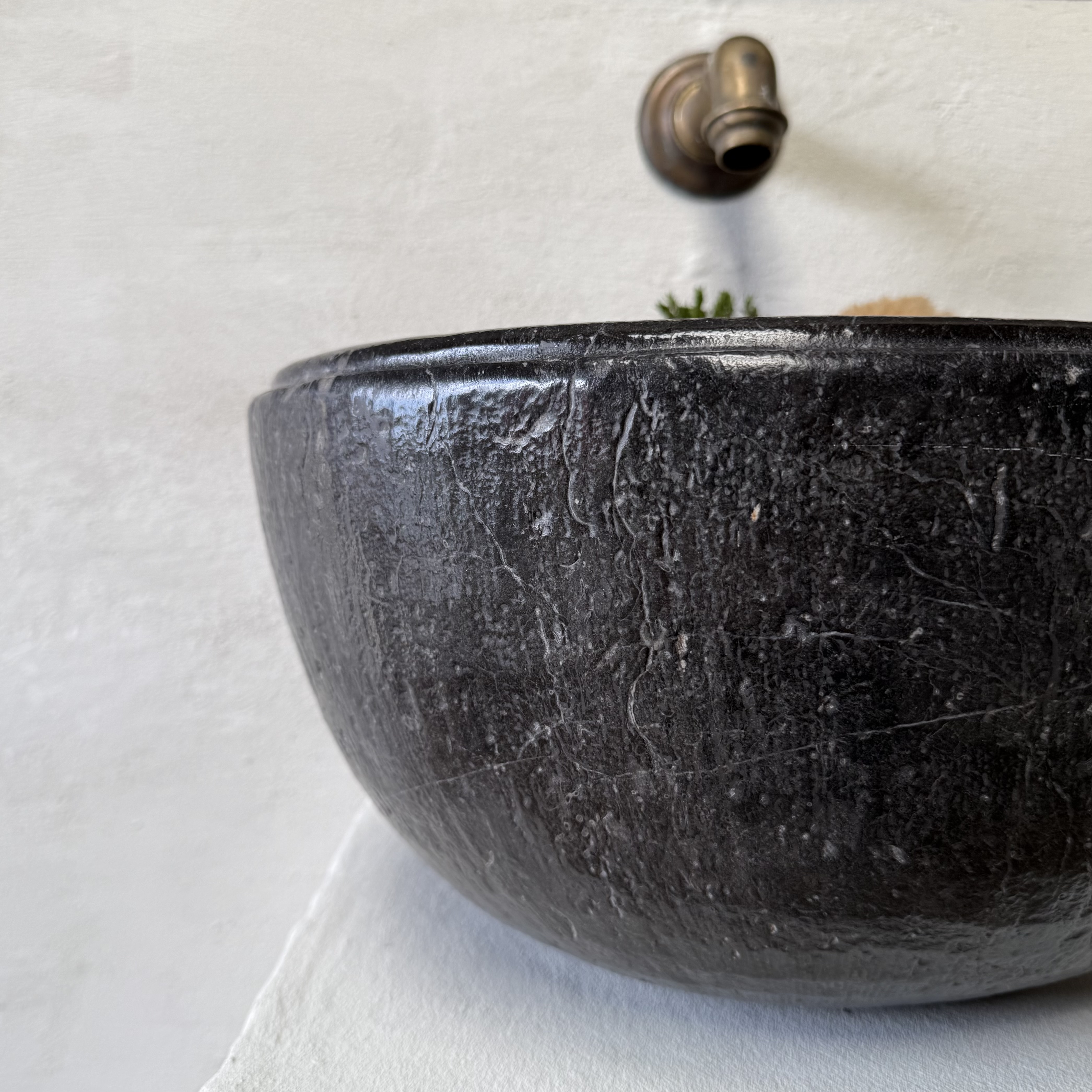An early 18th century black marble basin of elegant oval form with a deep, bowl-shaped body. The surface is finely hand-chiseled and displays a rich, naturally worn patina.